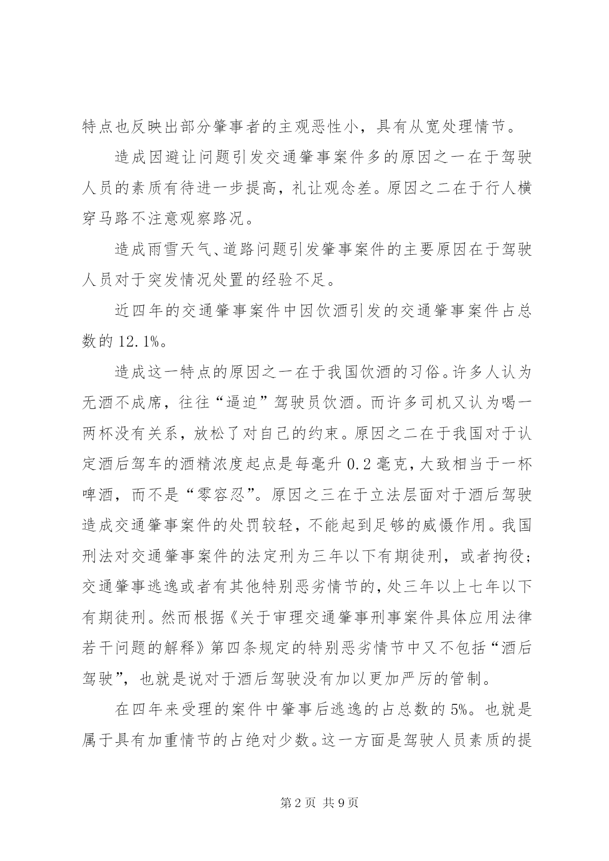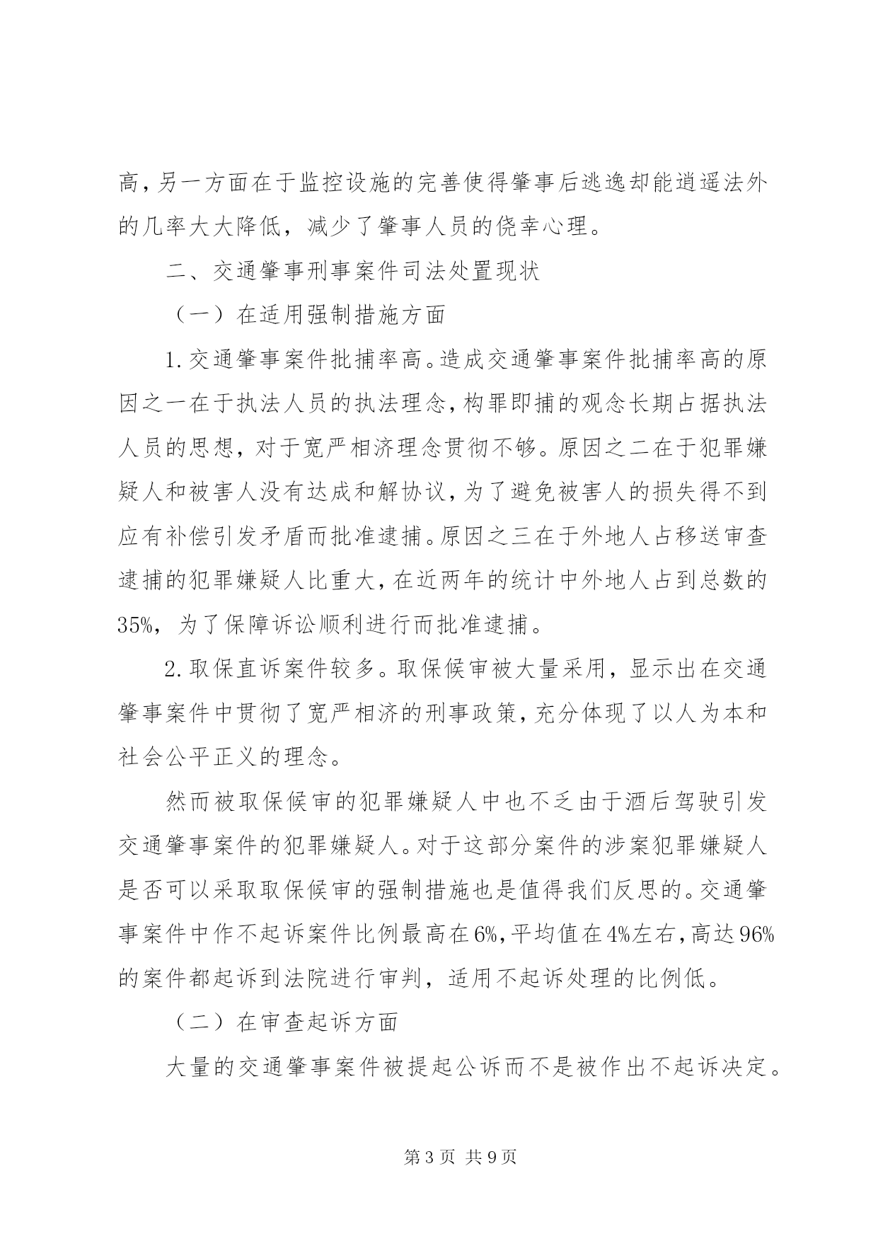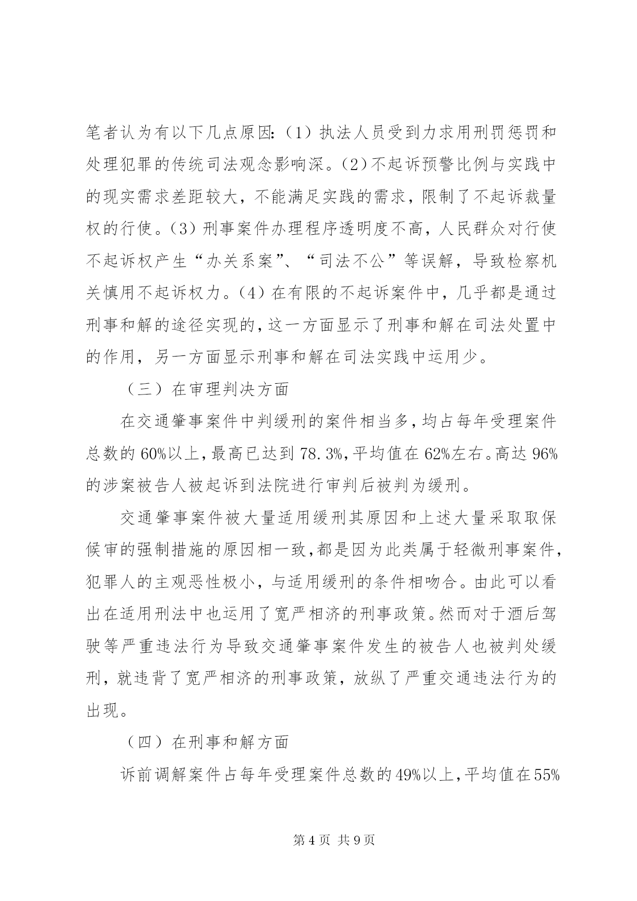 第PAGE\*Arabic\*MERGEFORMAT9页共NUMPAGES\*MERGEFORMAT9页刑事案件司法鉴定交通肇事刑事案件的司法处置一、交通肇事案件发案特点及原因我院四年来受理案件中,交通肇事案件已经成为我县常态多发刑事案件。交通肇事案件均占当年受理案件的10%以上,平均值为13%左右。交通肇事案件中的犯罪主体91%都为农民身份,非农民身份的人数平均仅占每年受理案件总数的9%。造成这一特点的原因之一在于我县的地理位置处于XX省的远郊县,农业人口占全部居住人口的绝大多数。原因之二在于农民所具备的驾驶经验不足、欠缺相应的车辆管护能力,当使用价格较低,配置较差的车辆行驶的时候,事前又没有进行检查,疏忽车辆本身安全问题,造成事故在所难免。原因之三在于驾驶车辆本身安全性能差。近四年的统计数据显示,由于农用车辆本身问题引发交通肇事案件占比例大,约占10%。农用车引发交通肇事案件主要是由于农用车本身安全性能差。农用车顾名思义是用来农用的,然而很多人因为农用车价格便宜,使用农用车进行道路营运,导致事故发生。近四年的交通肇事案件中因驾驶车辆避让行人及驾驶车辆避让问题引发的交通事故占绝大多数,占到总数的65%。因雨雪天气及道路坑洼等原因引发的交通肇事案件占总数的5%。这一特点也反映出部分肇事者的主观恶性小,具有从宽处理情节。造成因避让问题引发交通肇事案件多的原因之一在于驾驶人员的素质有待进一步提高,礼让观念差。原因之二在于行人横穿马路不注意观察路况。造成雨雪天气、道路问题引发肇事案件的主要原因在于驾驶人员对于突发情况处置的经验不足。近四年的交通肇事案件中因饮酒引发的交通肇事案件占总数的12.1%。造成这一特点的原因之一在于我国饮酒的习俗。许多人认为无酒不成席,往往“逼迫”驾驶员饮酒。而许多司机又认为喝一两杯没有关系,放松了对自己的约束。原因之二在于我国对于认定酒后驾车的酒精浓度起点是每毫升0.2毫克,大致相当于一杯啤酒,而不是“零容忍”。原因之三在于立法层面对于酒后驾驶造成交通肇事案件的处罚较轻,不能起到足够的威慑作用。我国刑法对交通肇事案件的法定刑为三年以下有期徒刑,或者拘役;交通肇事逃逸或者有其他特别恶劣情节的,处三年以上七年以下有期徒刑。然而根据《关于审理交通肇事刑事案件具体应用法律若干问题的解释》第四条规定的特别恶劣情节中又不包括“酒后驾驶”,也就是说对于酒后驾驶没有加以更加严厉的管制。在四年来受理的案件中肇事后逃逸的占总数的5%。也就是属于具有加重情节的占绝对少数。这一方面是驾驶人员素质的提高,另一方面在于监控设施的完善使得肇事后逃逸却能逍遥法外的几率大大降低,减少了肇事人员的侥幸心理。二、交通肇事刑事案件司法处置现状(一)在适用强制措施方面1.交通肇事案件批捕率高。造成交通肇事案件批捕率高的原因之一在于执法人员的执法理念,构罪即捕的观念长期占据执法人员的思想,对于宽严相济理念贯彻不够。原因之二在于犯罪嫌疑人和被害人没有达成和解协议,为了避免被害人的损失得不到应有补偿引发矛盾而批准逮捕。原因之三在于外地人占移送审查逮捕的犯罪嫌疑人比重大,在近两年的统计中外地人占到总数的35%,为了保障诉讼顺利进行而批准逮捕。2.取保直诉案件较多。取保候审被大量采用,显示出在交通肇事案件中贯彻了宽严相济的刑事政策,充分体现了以人为本和社会公平正义的理念。然而被取保候审的犯罪嫌疑人中也不乏由于酒后驾驶引发交通肇事案件的犯罪嫌疑人。对于这部分案件的涉案犯罪嫌疑人是否可以采取取保候审的强制措施也是值得我们反思的。交通肇事案件中作不起诉案件比例最高在6%,平均值在4%左右,高达96%的案件都起诉到法院进行审判,适用不起诉处理的比例低。(二)在审查起诉方面大量的交通肇事案件被提起公诉而不是被作出不起诉决定。笔者认为有以下几点原因:(1)执法人员受到力求用刑罚惩罚和处理犯罪的传统司法观念影响深。(2)不起诉预警比例与实践中的现实需求差距较大,不能满足实践的需求,限制了不起诉裁量权的行使。(3)刑事案件办理程序透明度不高,人民群众对行使不起诉权产生“办关系案”、“司法不公”等误解,导致检察机关慎用不起诉权力。(4)在有限的不起诉案件中,几乎都是通过刑事和解的途径实现的,这一方面显示了刑事和解在司法处置中的作用,另一方面显示刑事和解在司法实践中运用少。(三)在审理判决方面在交通肇事案件中判缓刑的案件相当多,均占每年受理案件总数的60%以上,最高已达到78.3%,平均值在62%左右。高达96%的涉案被告人被起诉到法院进行审判后被判为缓刑。交通肇事案件被大量适用缓刑其原因和上述大量采取取保候审的强制措施的原因相一致,都是因为此类属于轻微刑事案件,犯罪人的主观恶性极小,与适用缓刑的条件相吻合。由此可以看出在适用刑法中也运用了宽严相济的刑