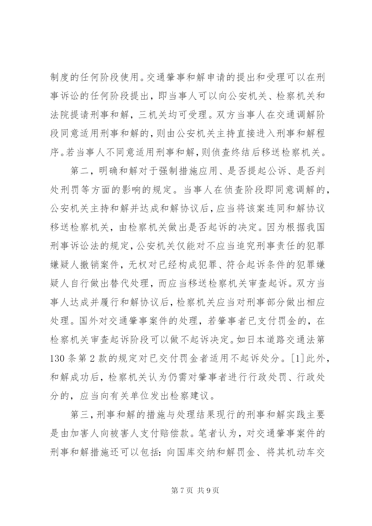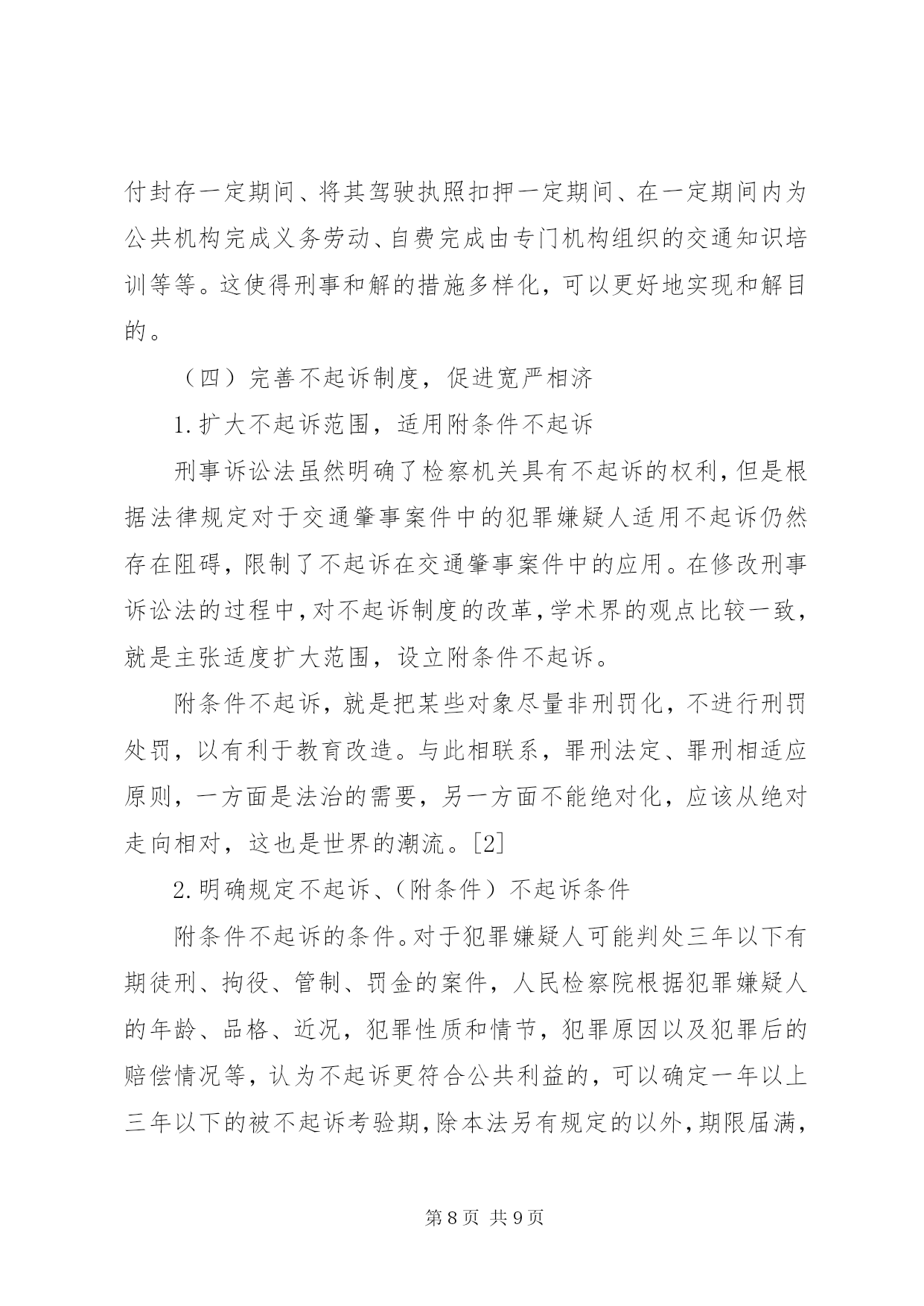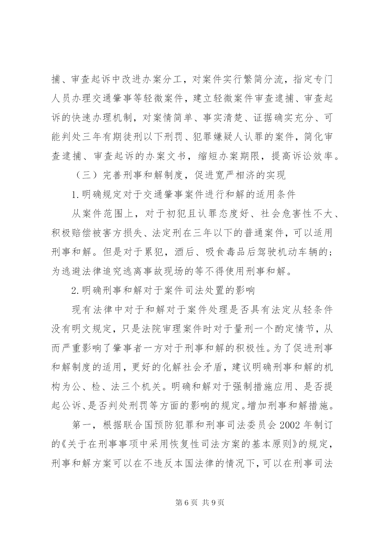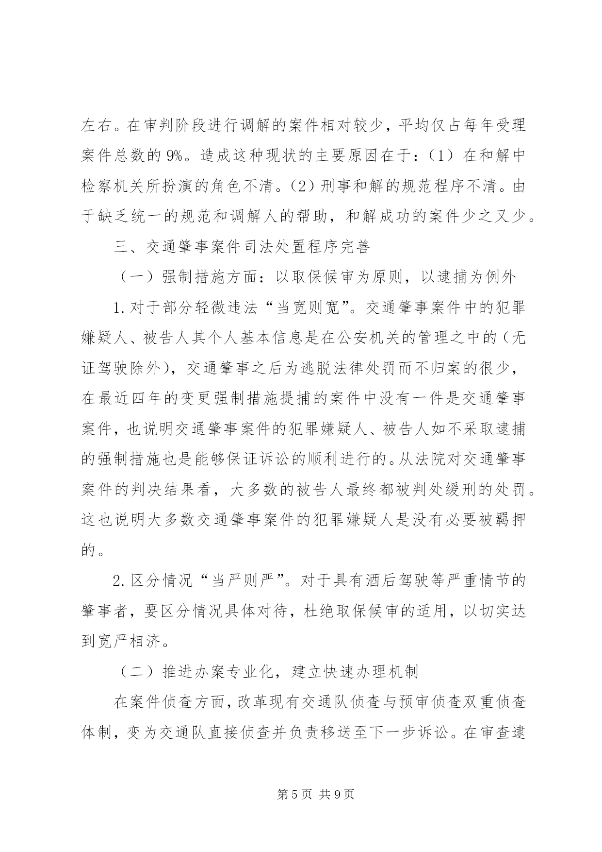 第PAGE\*Arabic\*MERGEFORMAT9页共NUMPAGES\*MERGEFORMAT9页刑事案件司法鉴定交通肇事刑事案件的司法处置一、交通肇事案件发案特点及原因我院四年来受理案件中,交通肇事案件已经成为我县常态多发刑事案件。交通肇事案件均占当年受理案件的10%以上,平均值为13%左右。交通肇事案件中的犯罪主体91%都为农民身份,非农民身份的人数平均仅占每年受理案件总数的9%。造成这一特点的原因之一在于我县的地理位置处于XX省的远郊县,农业人口占全部居住人口的绝大多数。原因之二在于农民所具备的驾驶经验不足、欠缺相应的车辆管护能力,当使用价格较低,配置较差的车辆行驶的时候,事前又没有进行检查,疏忽车辆本身安全问题,造成事故在所难免。原因之三在于驾驶车辆本身安全性能差。近四年的统计数据显示,由于农用车辆本身问题引发交通肇事案件占比例大,约占10%。农用车引发交通肇事案件主要是由于农用车本身安全性能差。农用车顾名思义是用来农用的,然而很多人因为农用车价格便宜,使用农用车进行道路营运,导致事故发生。近四年的交通肇事案件中因驾驶车辆避让行人及驾驶车辆避让问题引发的交通事故占绝大多数,占到总数的65%。因雨雪天气及道路坑洼等原因引发的交通肇事案件占总数的5%。这一特点也反映出部分肇事者的主观恶性小,具有从宽处理情节。造成因避让问题引发交通肇事案件多的原因之一在于驾驶人员的素质有待进一步提高,礼让观念差。原因之二在于行人横穿马路不注意观察路况。造成雨雪天气、道路问题引发肇事案件的主要原因在于驾驶人员对于突发情况处置的经验不足。近四年的交通肇事案件中因饮酒引发的交通肇事案件占总数的12.1%。造成这一特点的原因之一在于我国饮酒的习俗。许多人认为无酒不成席,往往“逼迫”驾驶员饮酒。而许多司机又认为喝一两杯没有关系,放松了对自己的约束。原因之二在于我国对于认定酒后驾车的酒精浓度起点是每毫升0.2毫克,大致相当于一杯啤酒,而不是“零容忍”。原因之三在于立法层面对于酒后驾驶造成交通肇事案件的处罚较轻,不能起到足够的威慑作用。我国刑法对交通肇事案件的法定刑为三年以下有期徒刑,或者拘役;交通肇事逃逸或者有其他特别恶劣情节的,处三年以上七年以下有期徒刑。然而根据《关于审理交通肇事刑事案件具体应用法律若干问题的解释》第四条规定的特别恶劣情节中又不包括“酒后驾驶”,也就是说对于酒后驾驶没有加以更加严厉的管制。在四年来受理的案件中肇事后逃逸的占总数的5%。也就是属于具有加重情节的占绝对少数。这一方面是驾驶人员素质的提高,另一方面在于监控设施的完善使得肇事后逃逸却能逍遥法外的几率大大降低,减少了肇事人员的侥幸心理。二、交通肇事刑事案件司法处置现状(一)在适用强制措施方面1.交通肇事案件批捕率高。造成交通肇事案件批捕率高的原因之一在于执法人员的执法理念,构罪即捕的观念长期占据执法人员的思想,对于宽严相济理念贯彻不够。原因之二在于犯罪嫌疑人和被害人没有达成和解协议,为了避免被害人的损失得不到应有补偿引发矛盾而批准逮捕。原因之三在于外地人占移送审查逮捕的犯罪嫌疑人比重大,在近两年的统计中外地人占到总数的35%,为了保障诉讼顺利进行而批准逮捕。2.取保直诉案件较多。取保候审被大量采用,显示出在交通肇事案件中贯彻了宽严相济的刑事政策,充分体现了以人为本和社会公平正义的理念。然而被取保候审的犯罪嫌疑人中也不乏由于酒后驾驶引发交通肇事案件的犯罪嫌疑人。对于这部分案件的涉案犯罪嫌疑人是否可以采取取保候审的强制措施也是值得我们反思的。交通肇事案件中作不起诉案件比例最高在6%,平均值在4%左右,高达96%的案件都起诉到法院进行审判,适用不起诉处理的比例低。(二)在审查起诉方面大量的交通肇事案件被提起公诉而不是被作出不起诉决定。笔者认为有以下几点原因:(1)执法人员受到力求用刑罚惩罚和处理犯罪的传统司法观念影响深。(2)不起诉预警比例与实践中的现实需求差距较大,不能满足实践的需求,限制了不起诉裁量权的行使。(3)刑事案件办理程序透明度不高,人民群众对行使不起诉权产生“办关系案”、“司法不公”等误解,导致检察机关慎用不起诉权力。(4)在有限的不起诉案件中,几乎都是通过刑事和解的途径实现的,这一方面显示了刑事和解在司法处置中的作用,另一方面显示刑事和解在司法实践中运用少。(三)在审理判决方面在交通肇事案件中判缓刑的案件相当多,均占每年受理案件总数的60%以上,最高已达到78.3%,平均值在62%左右。高达96%的涉案被告人被起诉到法院进行审判后被判为缓刑。交通肇事案件被大量适用缓刑其原因和上述大量采取取保候审的强制措施的原因相一致,都是因为此类属于轻微刑事案件,犯罪人的主观恶性极小,与适用缓刑的条件相吻合。由此可以看出在适用刑法中也运用了宽严相济的刑