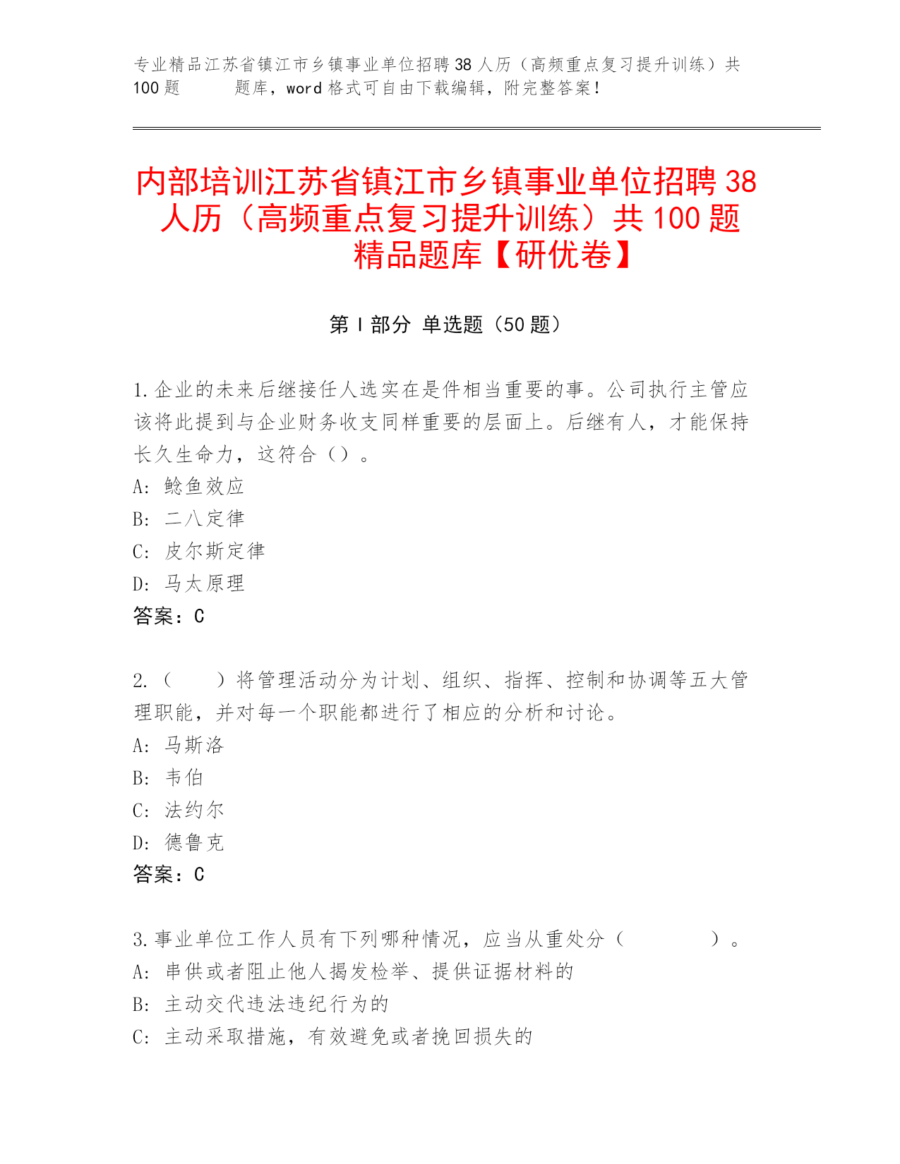 优选江苏省镇江市乡镇事业单位招聘38人历(高频重点复习提升训练)共100题 附参考答案(研优卷)