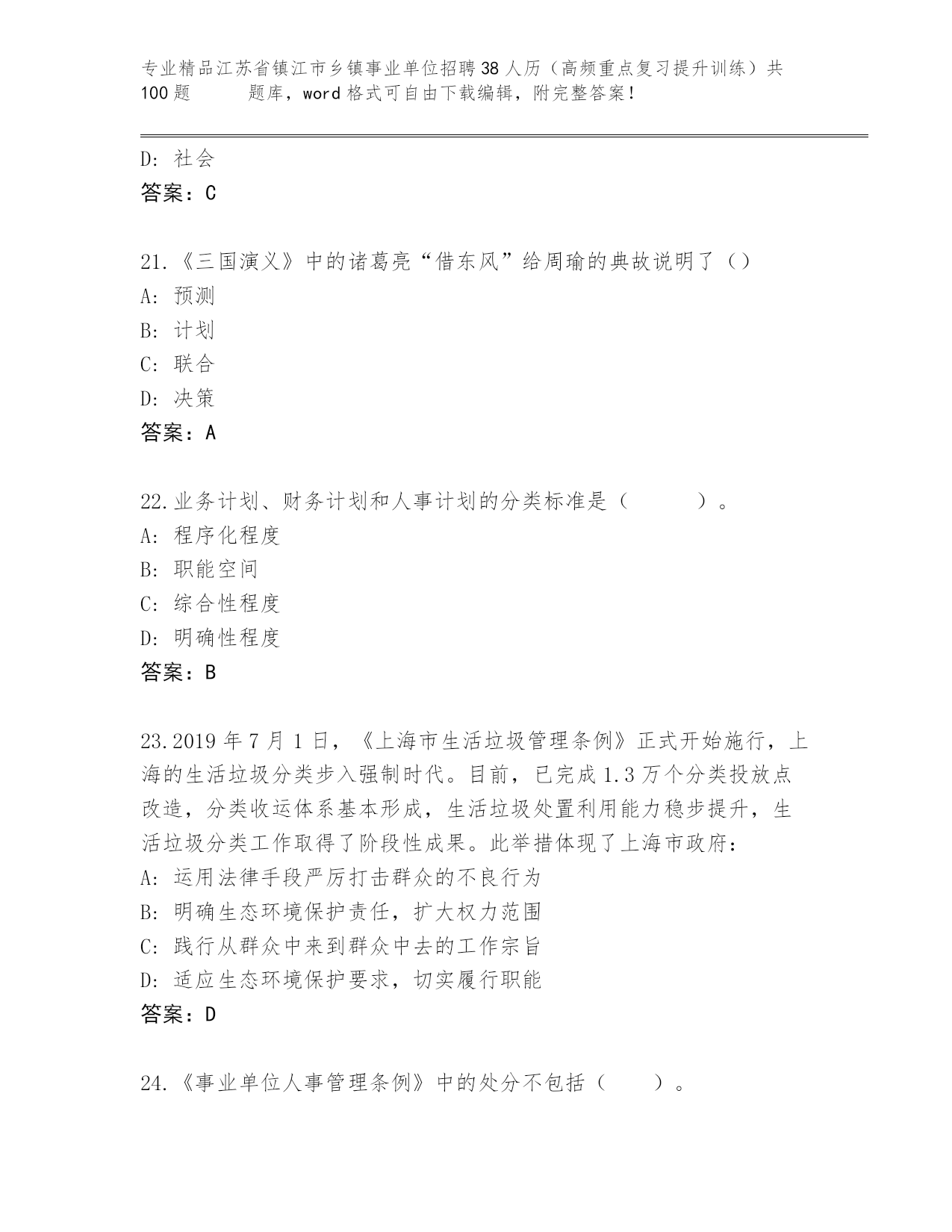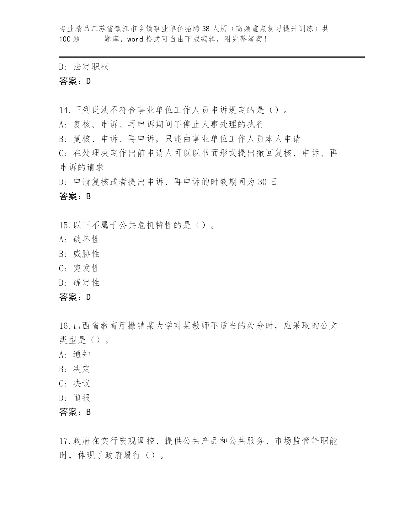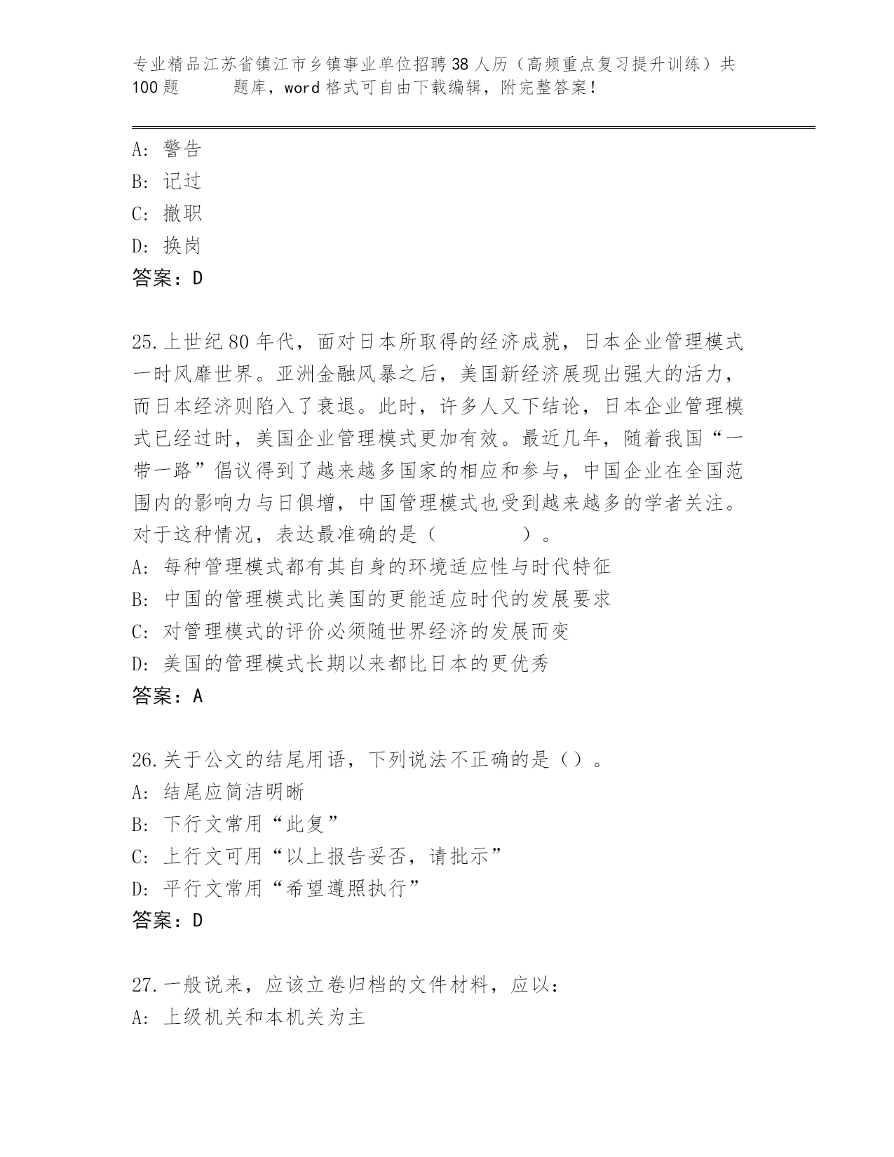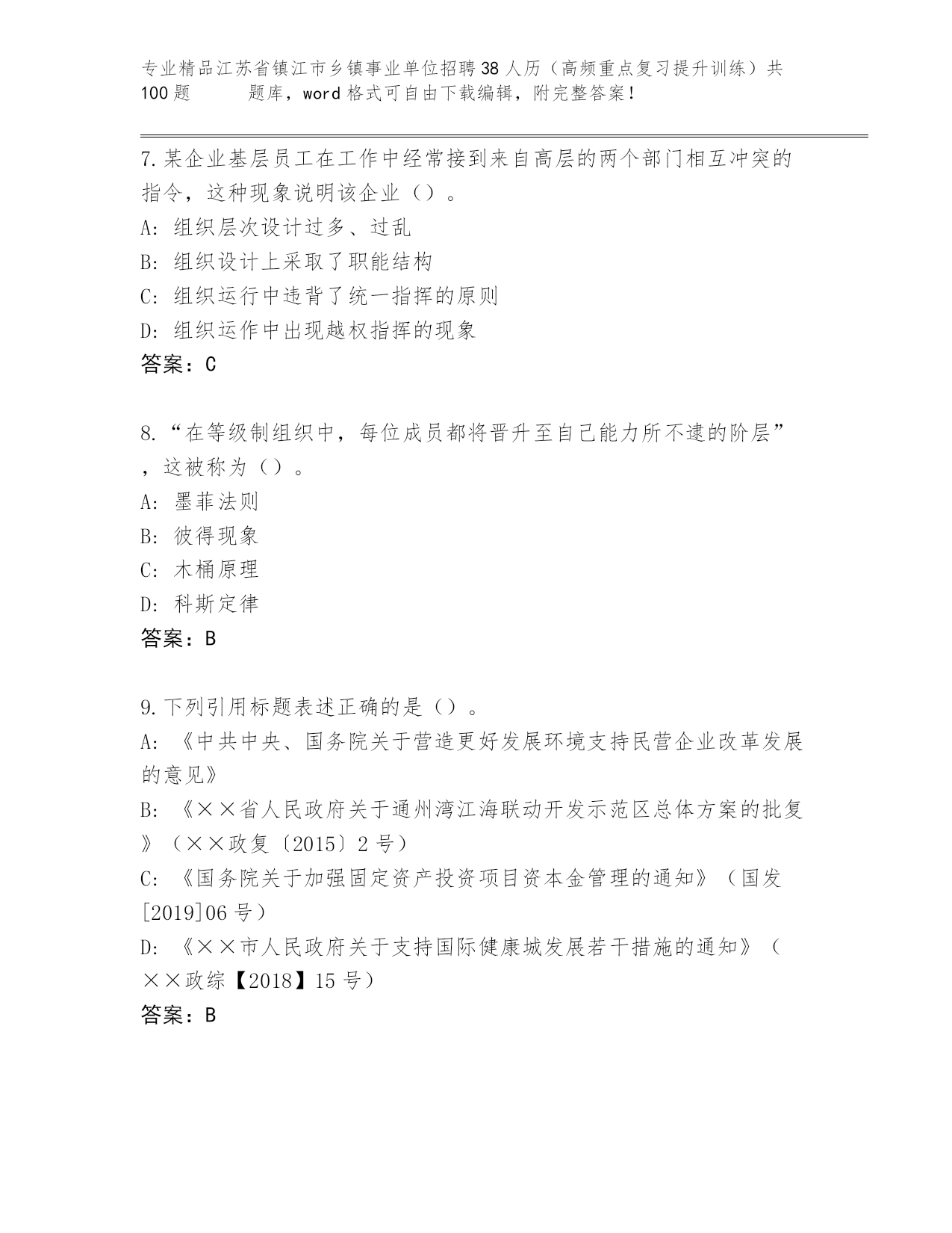 精品江苏省镇江市乡镇事业单位招聘38人历(高频重点复习提升训练)共100题 真题精品加答案