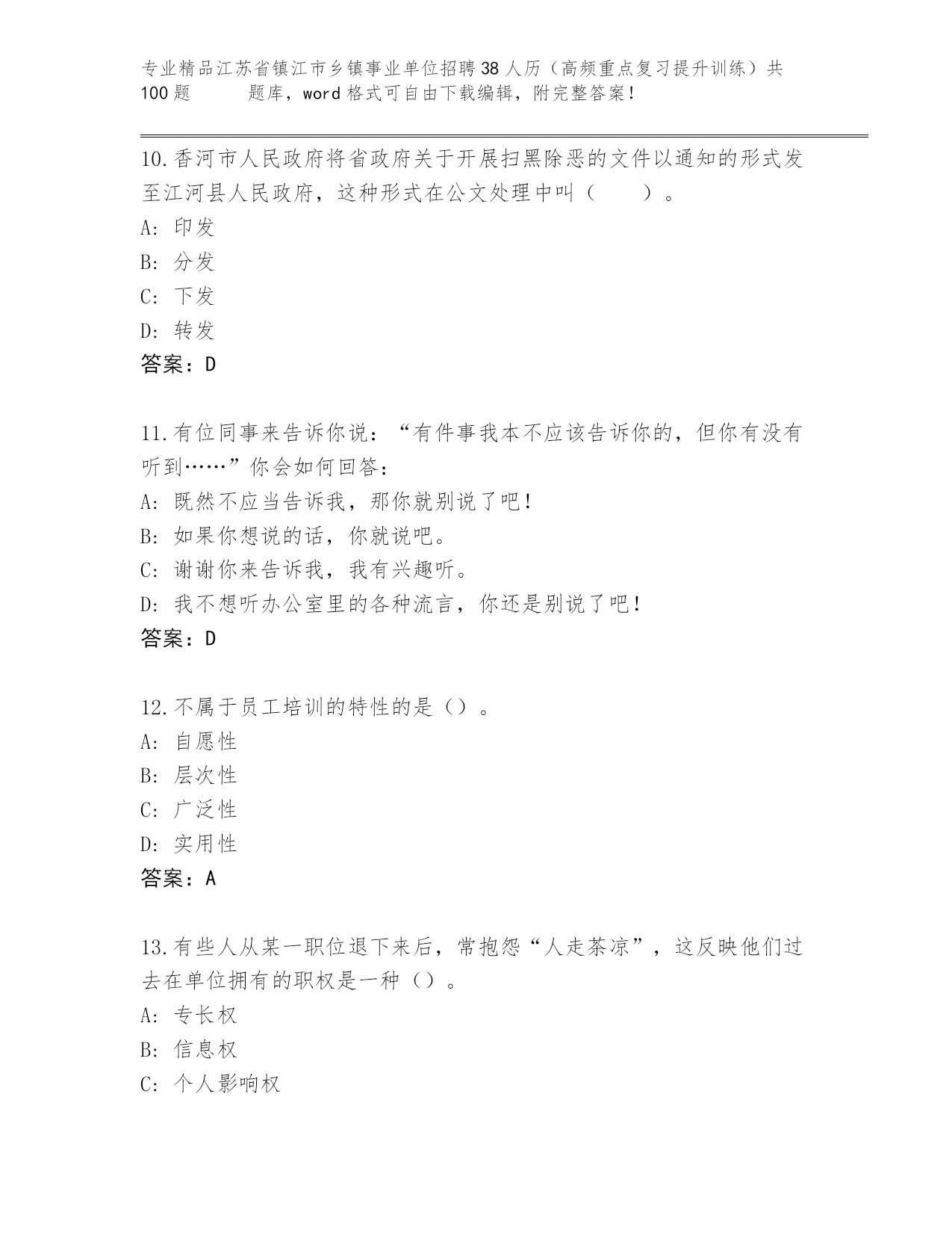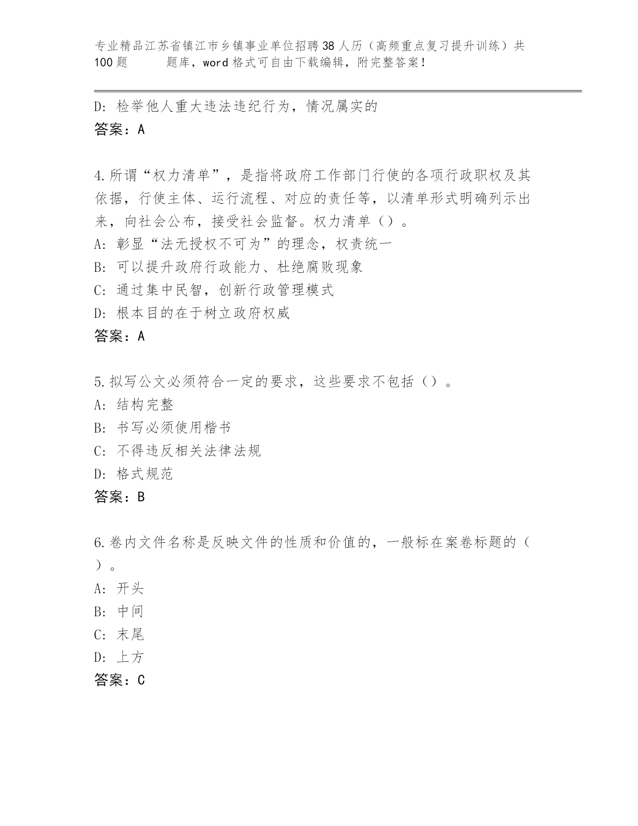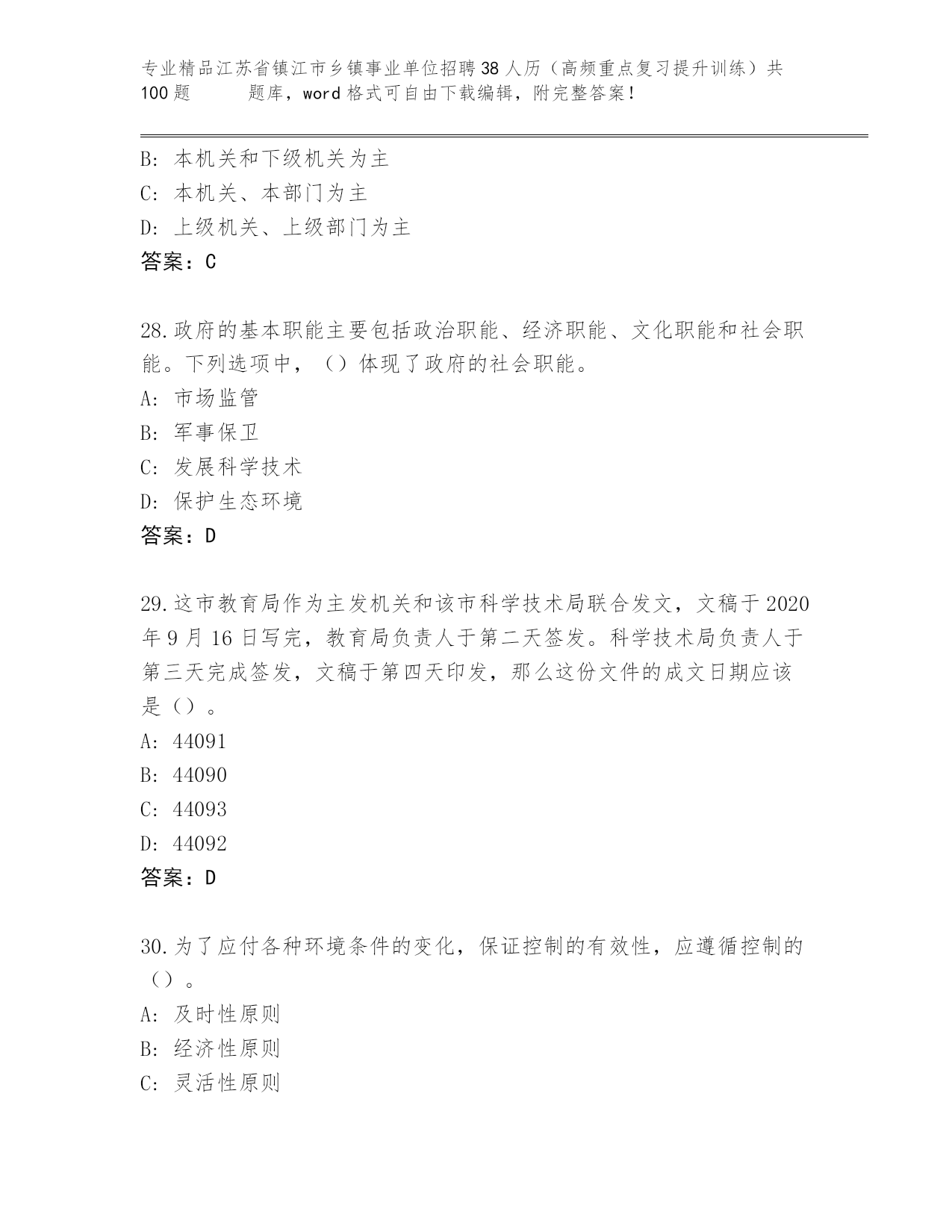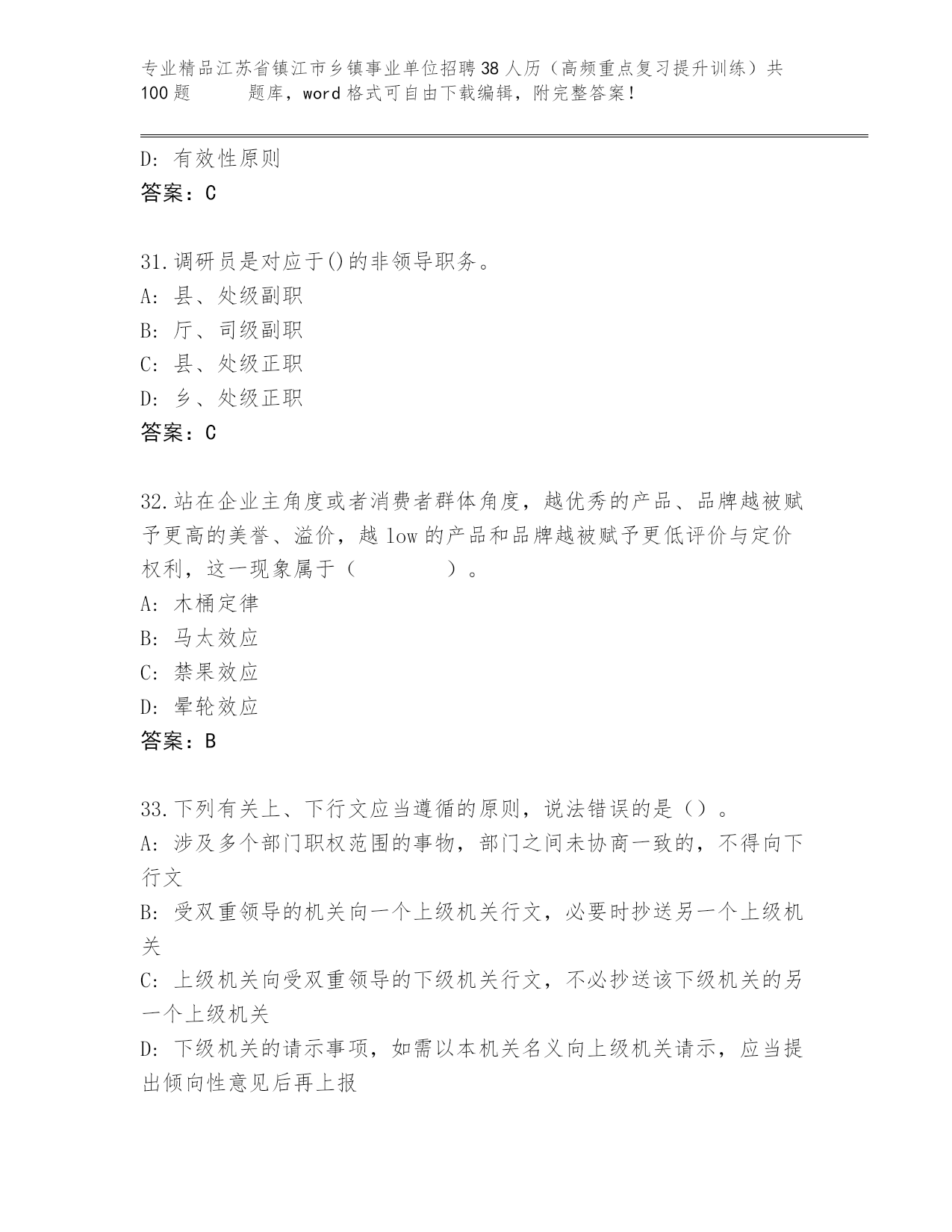 精品江苏省镇江市乡镇事业单位招聘38人历(高频重点复习提升训练)共100题 真题精品加答案