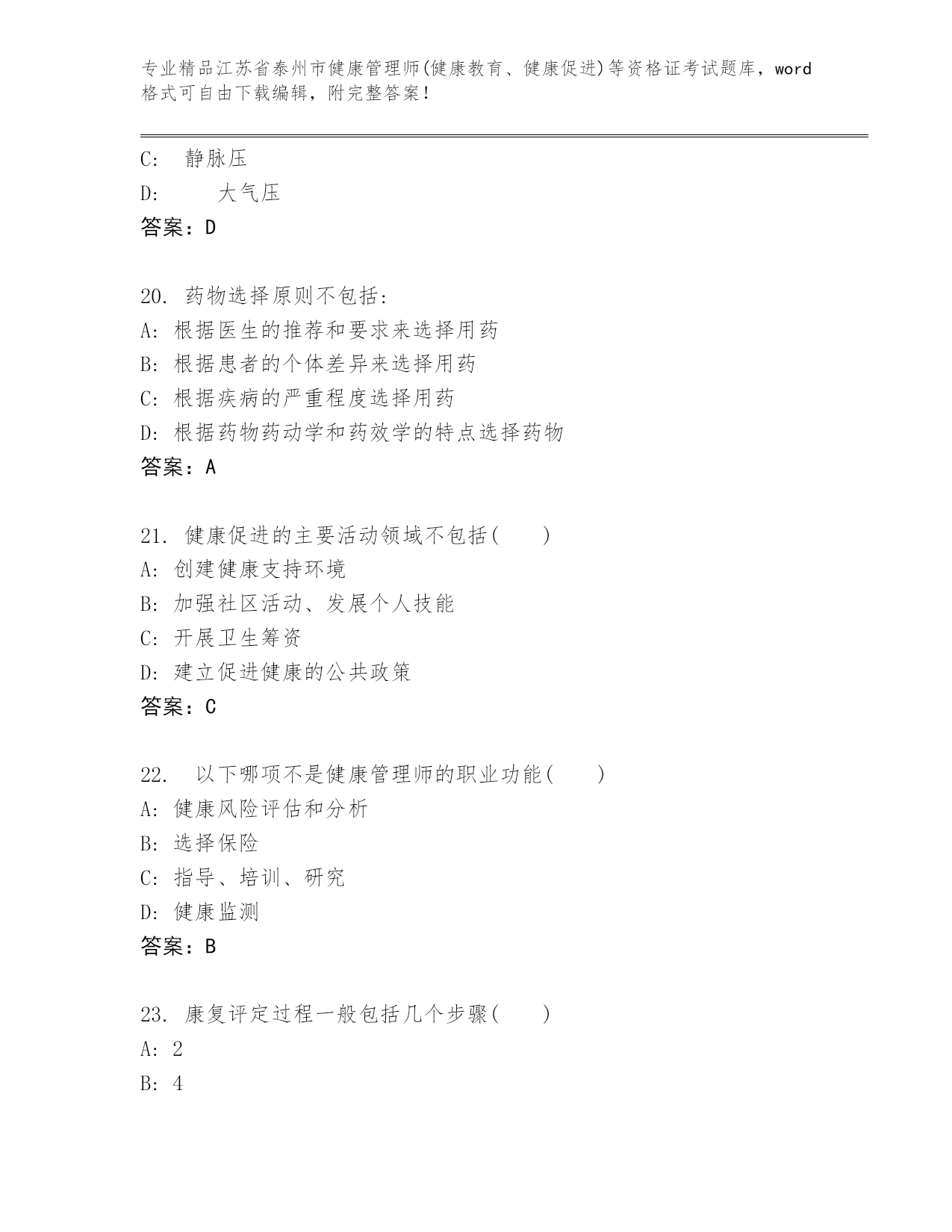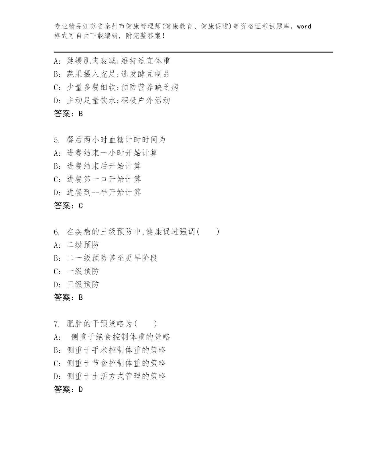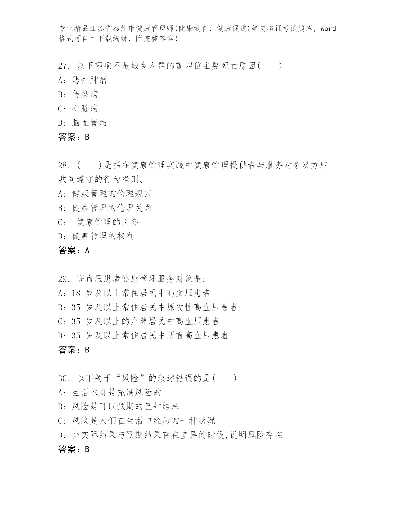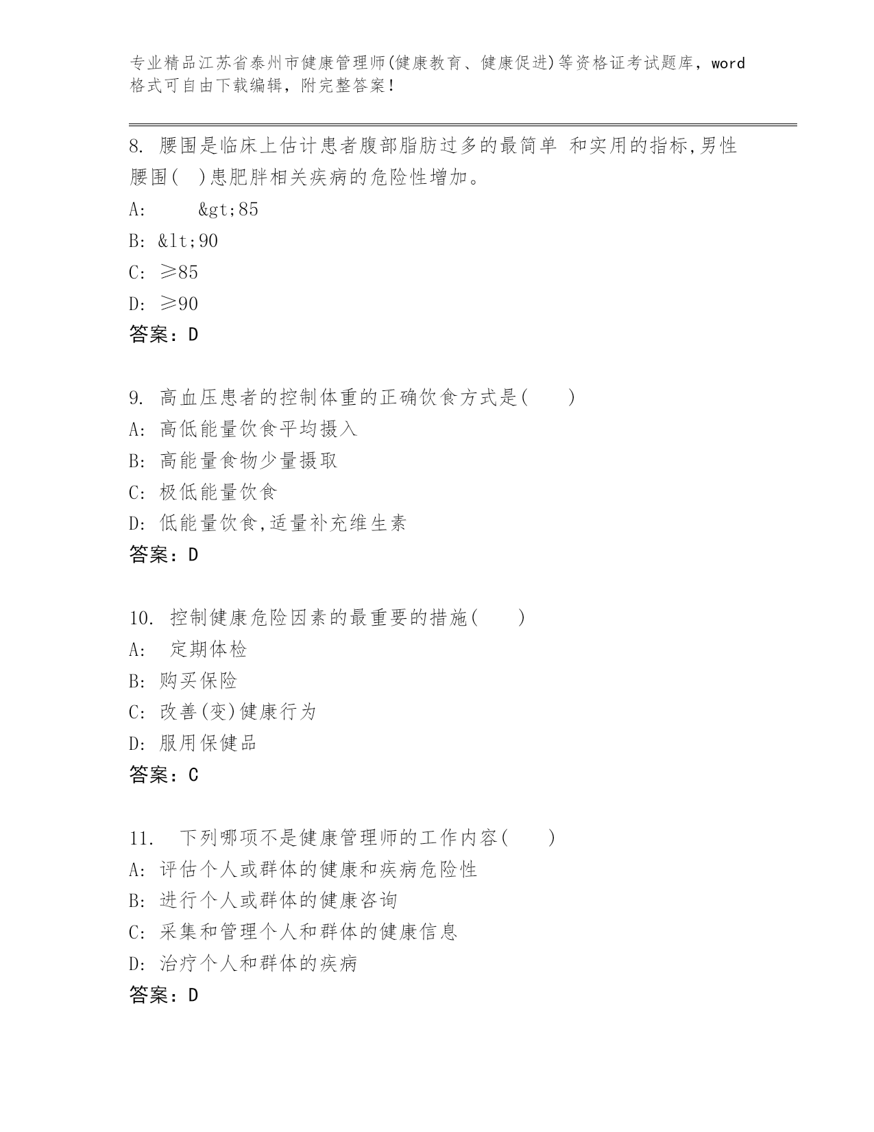 江苏省泰州市健康管理师(健康教育、健康促进)等资格证考试优选题库及精品答案.docx