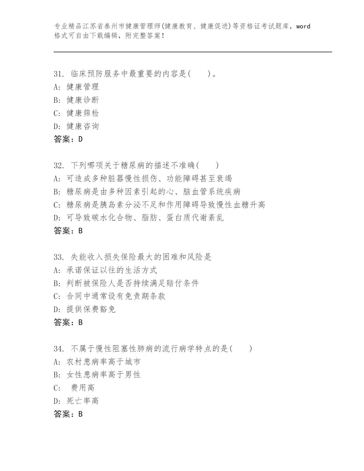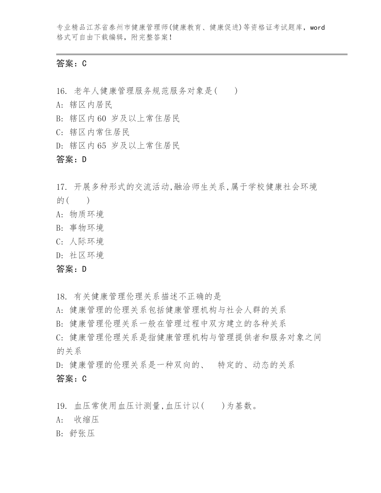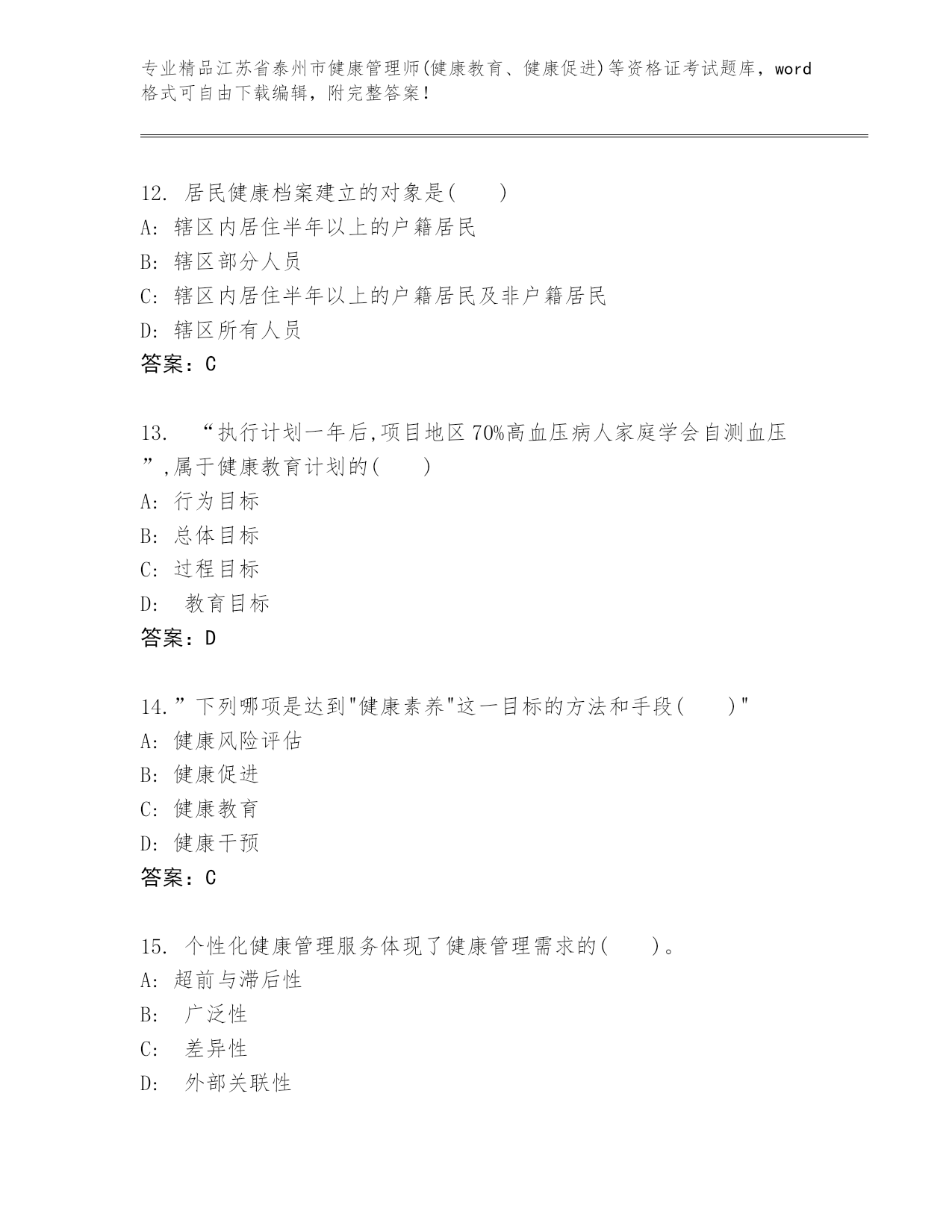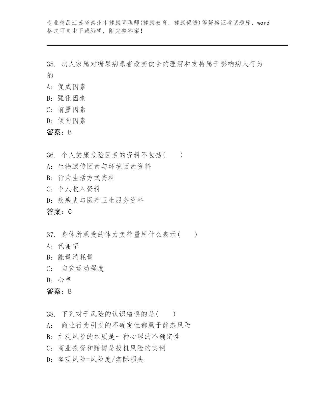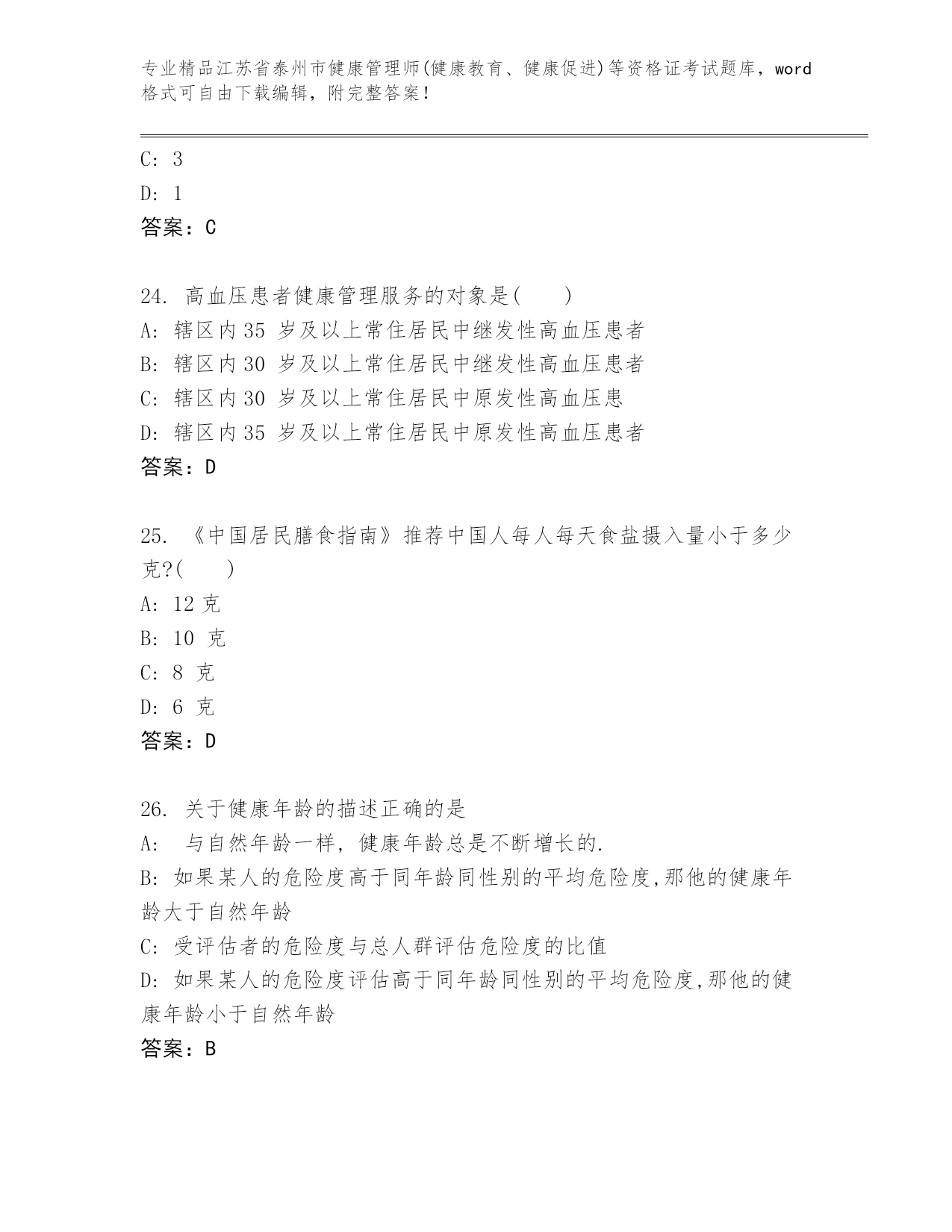 江苏省泰州市健康管理师(健康教育、健康促进)等资格证考试优选题库及精品答案.docx