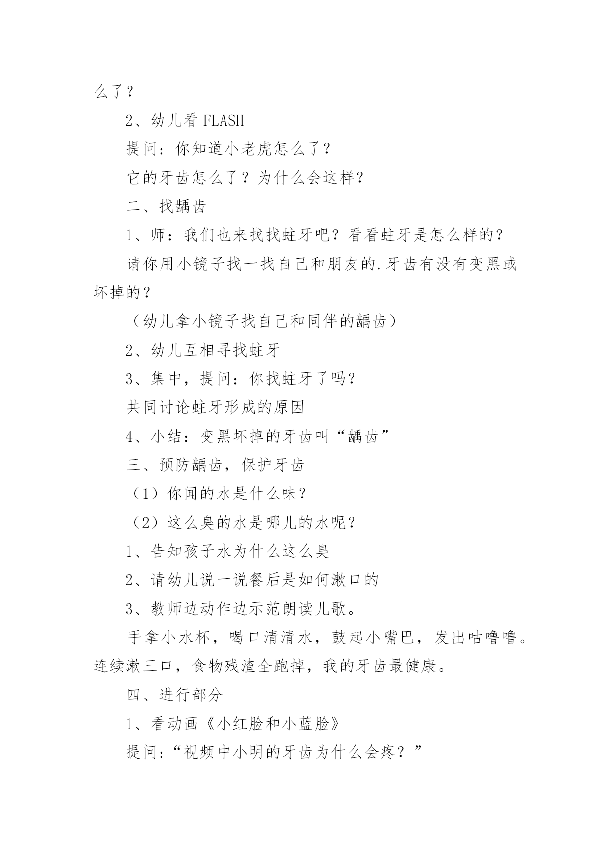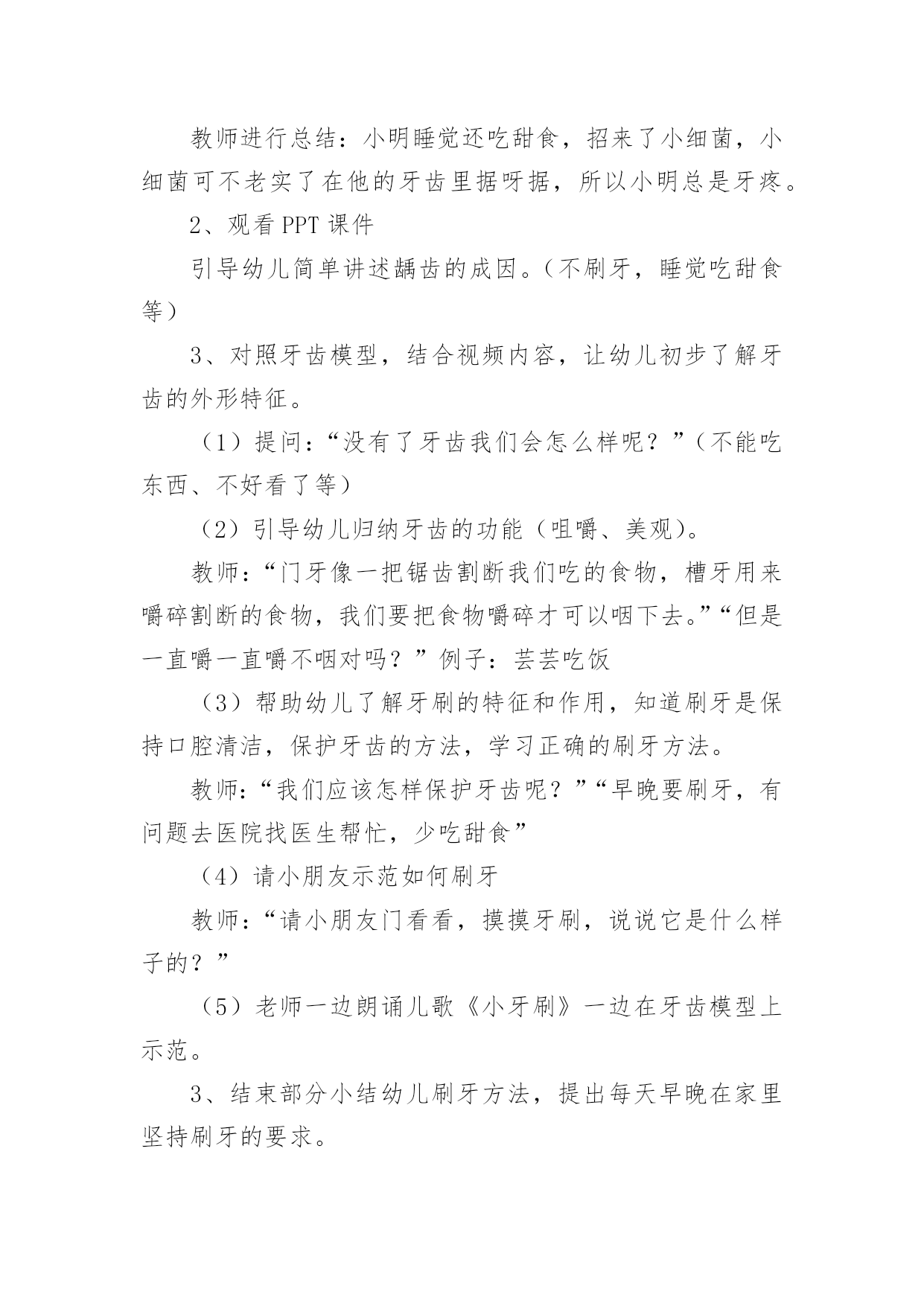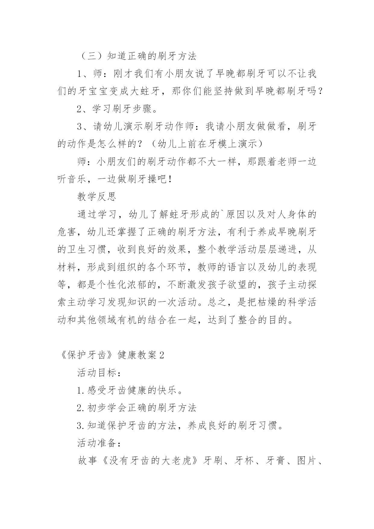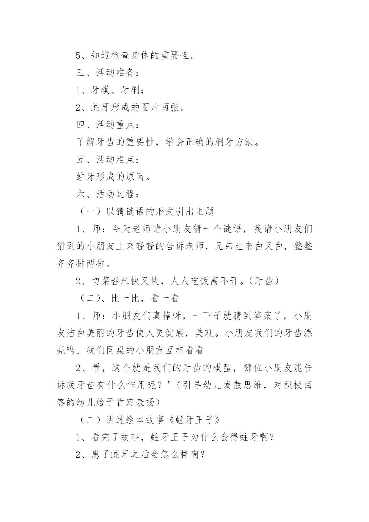 《保护牙齿》健康教案《保护牙齿》健康教案15篇(必备)作为一名为他人授业解惑的教育工作者,时常要开展教案准备工作,编写教案有利于我们准确把握教材的重点与难点,进而选择恰当的教学方法。我们应该怎么写教案呢?以下是小编为大家整理的《保护牙齿》健康教案,欢迎阅读与收藏。《保护牙齿》健康教案1一、设计意图:在日常活动中,我发现幼儿对牙齿的了解并不深入,有坚持早晚刷牙习惯的幼儿并不多,蛀牙问题在幼儿中也严重存在,根据本班幼儿的认知特点和兴趣,我设想通过具体的牙齿模型、幼儿日常的生活经验,使幼儿在活动中整理和提升自己的经验,并寻找保护牙齿的方法。二、活动目标:1、了解牙齿的重要性。2、通过活动使幼儿了解蛀牙形成的原因。3、了解换牙的常识,学会保护恒牙,养成坚持每天刷牙的习惯。4、引导孩子乐于接受治疗。鼓励、培养小朋友不怕打针的勇敢精神。5、知道检查身体的重要性。三、活动准备:1、牙模、牙刷;2、蛀牙形成的图片两张。四、活动重点:了解牙齿的重要性,学会正确的刷牙方法。五、活动难点:蛀牙形成的原因。六、活动过程:(一)以猜谜语的形式引出主题1、师:今天老师请小朋友猜一个谜语,我请小朋友们猜到的小朋友上来轻轻的告诉老师,兄弟生来白又白,整整齐齐排两排。2、切菜舂米快又快,人人吃饭离不开。(牙齿)(二)、比一比,看一看1、师:小朋友们真棒呀,一下子就猜到答案了,小朋友洁白美丽的牙齿使人更健康,美观。小朋友我们的牙齿漂亮吗。我们同桌的小朋友互相看看2、看,这个就是我们的牙齿的模型,哪位小朋友能告诉我牙齿有什么作用呢?"(引导幼儿发散思维,对积极回答的幼儿给予肯定表扬)(二)讲述绘本故事《蛀牙王子》1、看完了故事,蛀牙王子为什么会得蛀牙啊?2、患了蛀牙之后会怎么样啊?(三)知道正确的刷牙方法1、师:刚才我们有小朋友说了早晚都刷牙可以不让我们的牙宝宝变成大蛀牙,那你们能坚持做到早晚都刷牙吗?2、学习刷牙步骤。3、请幼儿演示刷牙动作师:我请小朋友做做看,刷牙的动作是怎么样的?(幼儿上前在牙模上演示)师:小朋友们的刷牙动作都不大一样,那跟着老师一边听音乐,一边做刷牙操吧!教学反思通过学习,幼儿了解蛀牙形成的`原因以及对人身体的危害,幼儿还掌握了正确的刷牙方法,有利于养成早晚刷牙的卫生习惯,收到良好的效果,整个教学活动层层递进,从材料,形成到组织的各个环节,教师的语言以及幼儿的表现等,都是个性化浓郁的,不断激发孩子欲望的,孩子主动探索主动学习发现知识的一次活动。总之,是把枯燥的科学活动和其他领域有机的结合在一起,达到了整合的目的。《保护牙齿》健康教案2活动目标:1.感受牙齿健康的快乐。2.初步学会正确的刷牙方法3.知道保护牙齿的方法,养成良好的刷牙习惯。活动准备:故事《没有牙齿的大老虎》牙刷、牙杯、牙膏、图片、视频、音频活动过程:一、故事《没有牙齿的.大老虎》导入活动主题小朋友,你们知道森林的百兽之王是谁吗?凶猛的大老虎最近呀一点儿都不凶猛,为什么呢?狐狸想出了什么办法,大老虎的牙齿怎么了?二、教师引导幼儿讨论保护牙齿的方法,预防龋齿1.出示图片,让幼儿了解不保护牙齿的后果?2.请小朋友用镜子找找自己有没有龋齿,老师和幼儿一起讨论为什么会出现这种情况?3.出示图片让幼儿判断哪些行为是保护牙齿?哪些不是,而且会造成龋齿。4.讨论如何保护牙齿,教师小结,并出示正确保护牙齿的图片。三、教师引导幼儿掌握正确的刷牙方法,养成良好的卫生习惯1.教师出示图片通过图片引导幼儿正确的刷牙步骤。2.教师播放视频,通过儿歌学习正确的刷牙方法。3.幼儿用准备好的牙具,跟着视频学刷牙,体验刷牙的快乐。四、音乐游戏《洗刷刷》1.通过音乐游戏增强幼儿对保护牙齿的认识,养成良好的刷牙习惯。2.通过形象的角色扮演来表现音乐游戏的情节,让幼儿在轻松快乐的环境中喜欢刷牙,乐于保护自己的牙齿。五、活动延伸教师在班级开展“牙牙选美大会”活动,每天选出“最美牙齿小明星”。《保护牙齿》健康教案3设计意图:在日常活动中,我发现幼儿对牙齿的了解并不深入,有坚持早晚刷牙习惯的幼儿并不多,蛀牙问题在幼儿中也严重存在,根据本班幼儿的认知特点和兴趣,我设想通过具体的牙齿模型、幼儿日常的生活经验,使幼儿在活动中整理和提升自己的经验,并寻找保护牙齿的`方法。活动目标:1、了解牙齿的重要性。2、通过活动使幼儿了解蛀牙形成的原因。3、了解换牙的常识,学会保护恒牙,养成坚持每天刷牙的习惯。活动准备:1、牙模、牙刷;2、蛀牙形成的图片两张;3、事先浸泡在醋里的蛋壳和未浸泡过的蛋壳;活动重难点:重点:了解牙齿的重要性,学会正确的刷牙方法。难点:蛀牙形成的原因。活动过程:(一)以猜谜语的形式引出主题1、T:今天老师请小朋友猜一个谜语,我请小朋友们猜到的小朋友上来轻轻的告诉老师,健康卫士穿白衣,上下两排真整齐,口中饭菜它磨碎,早