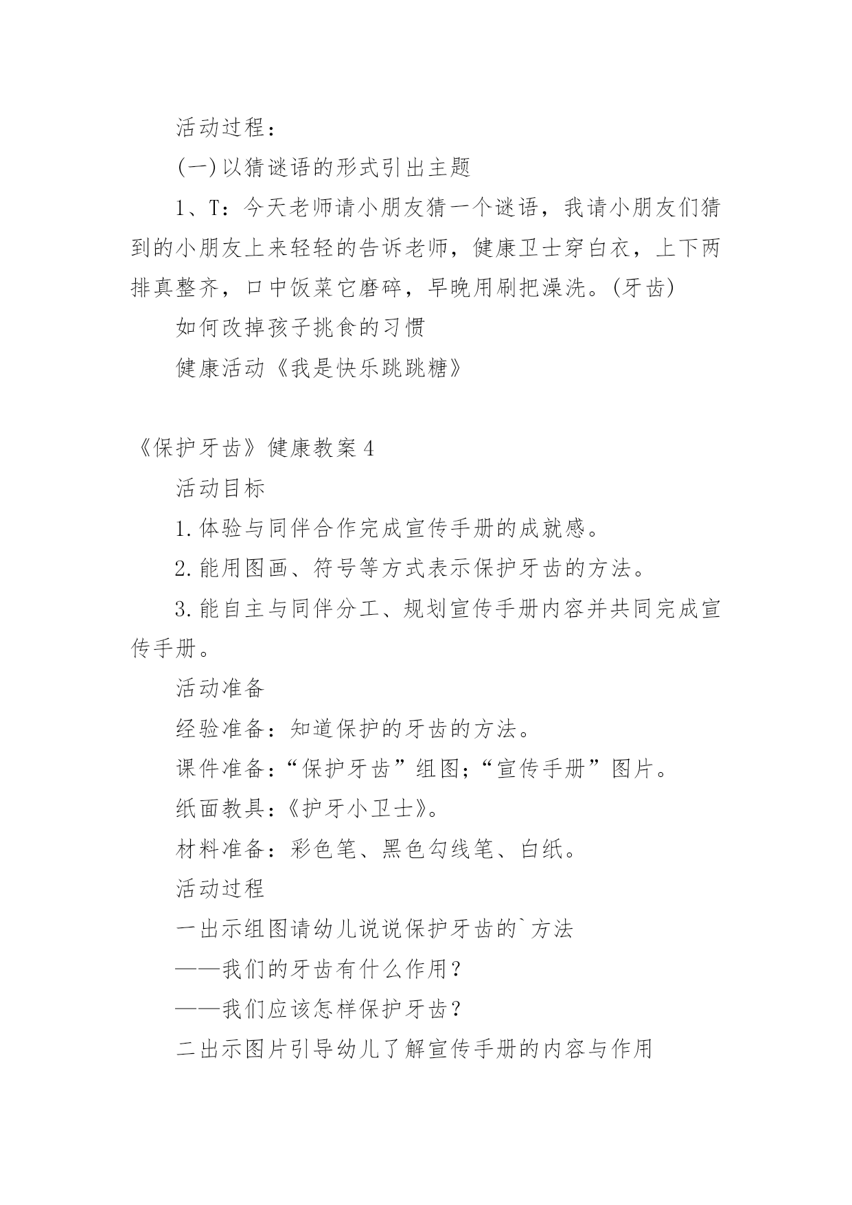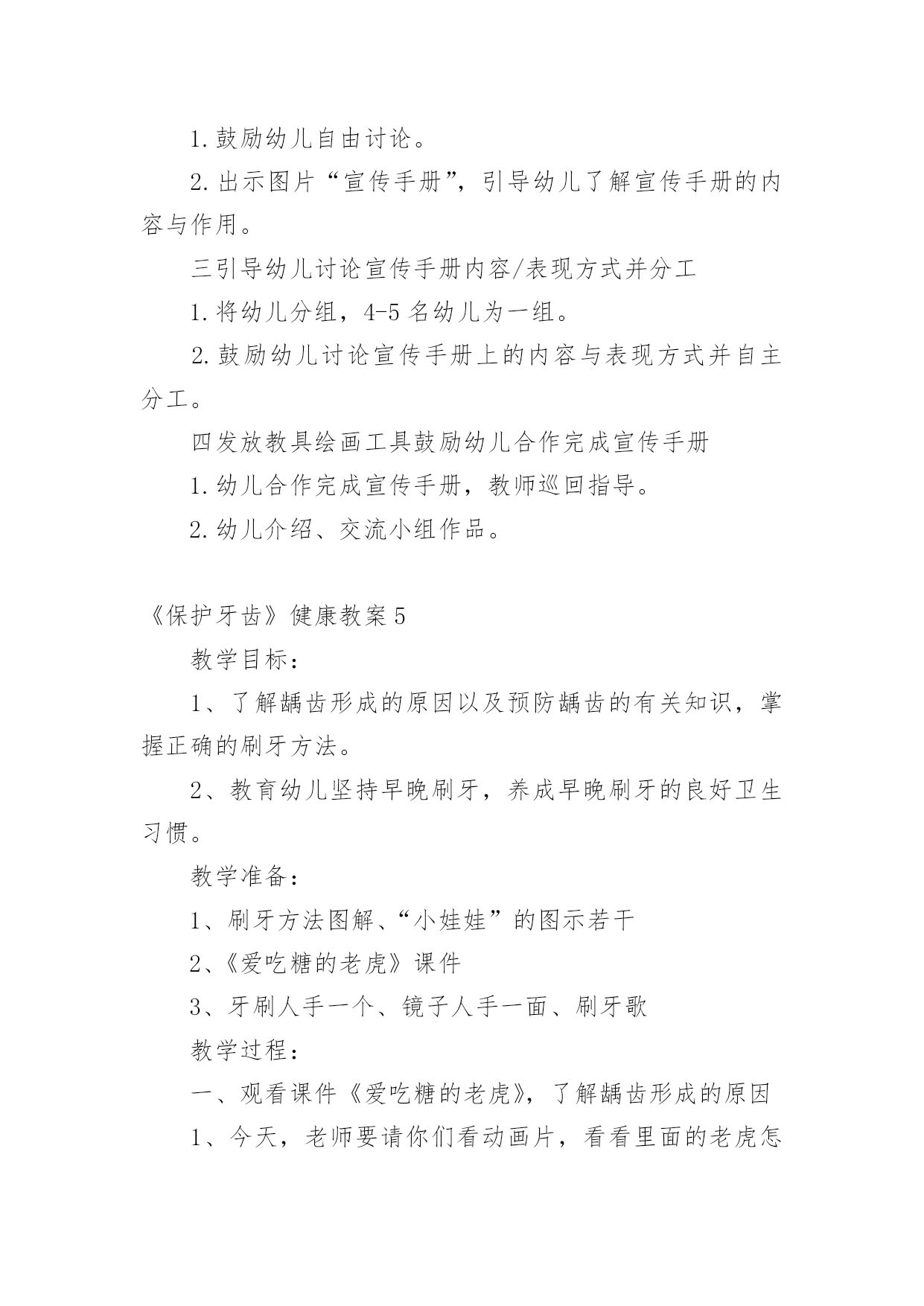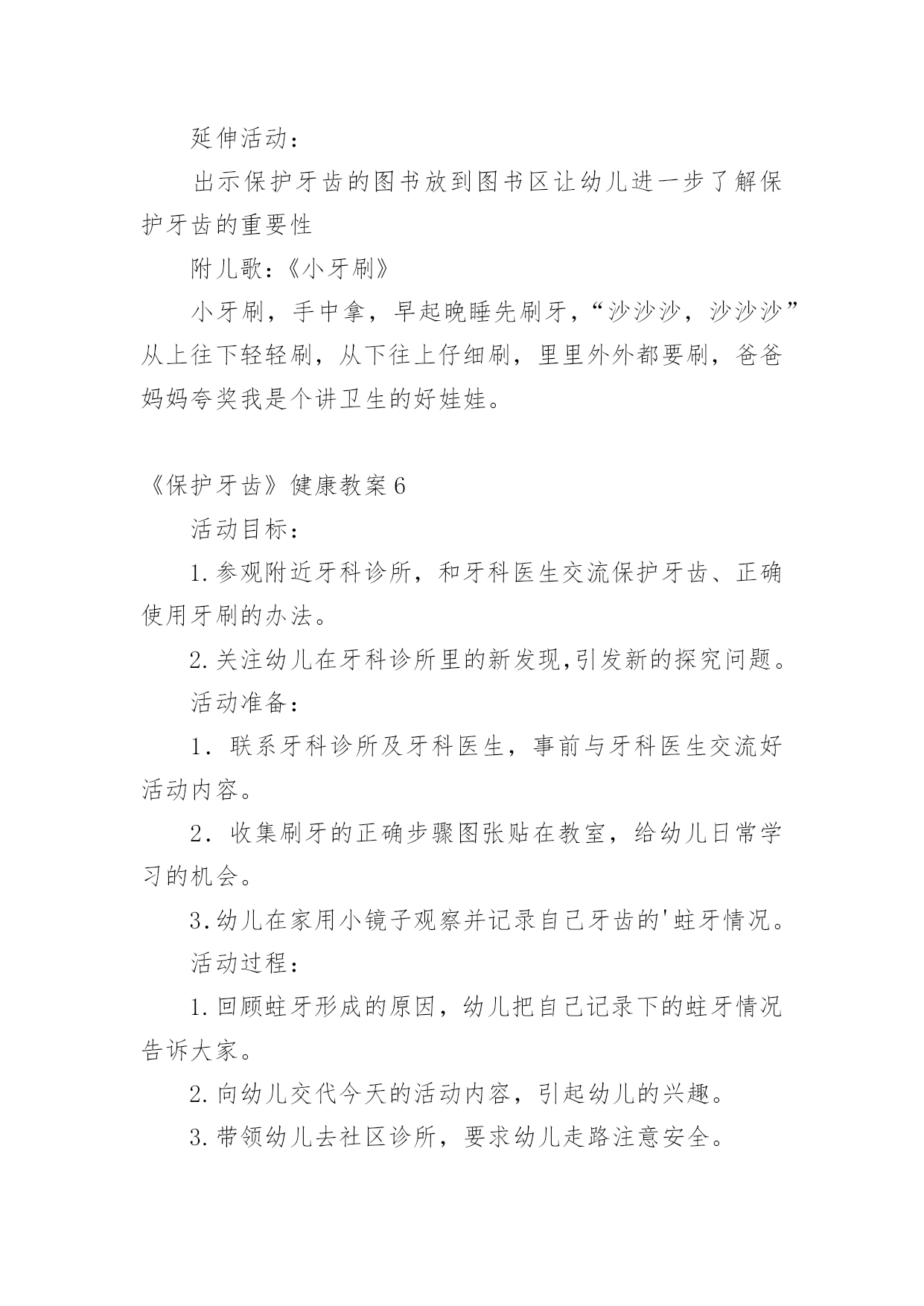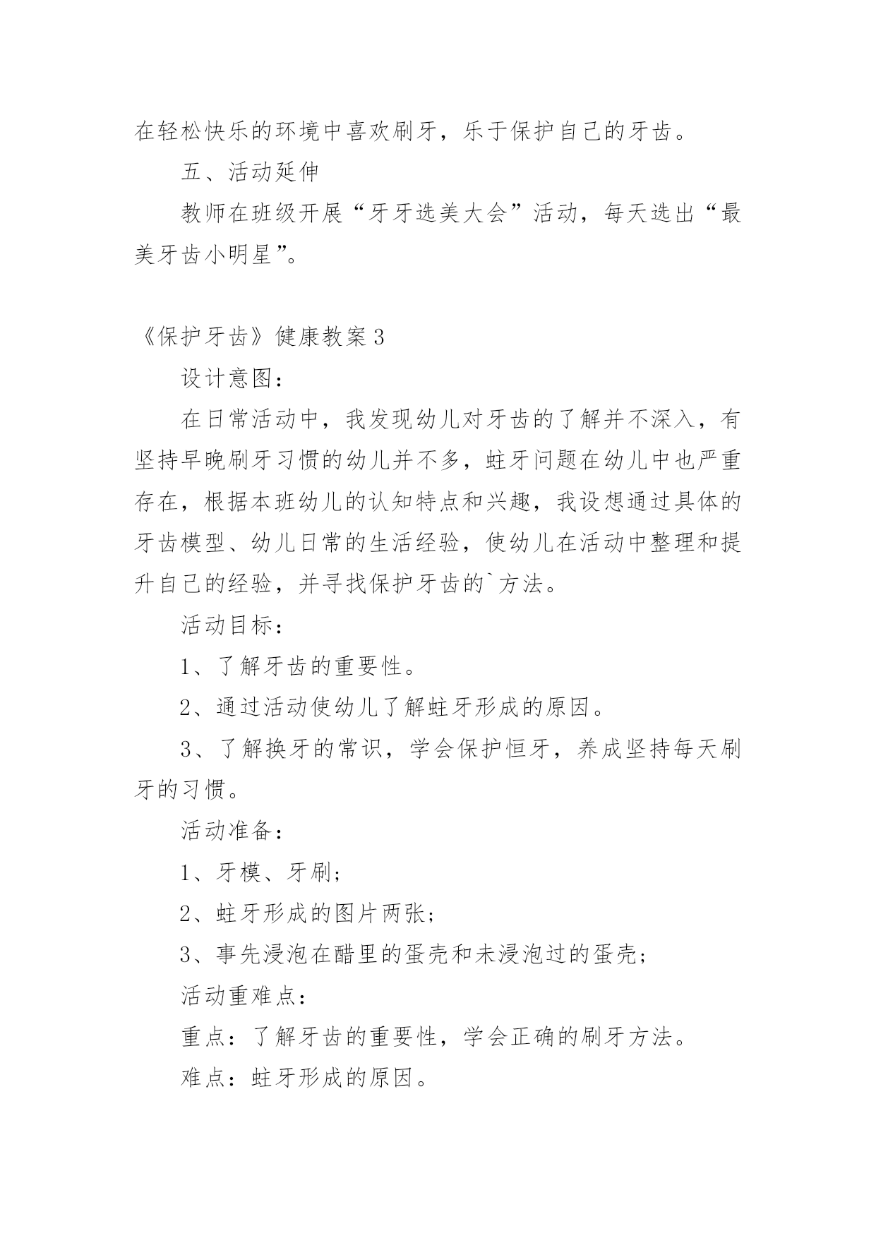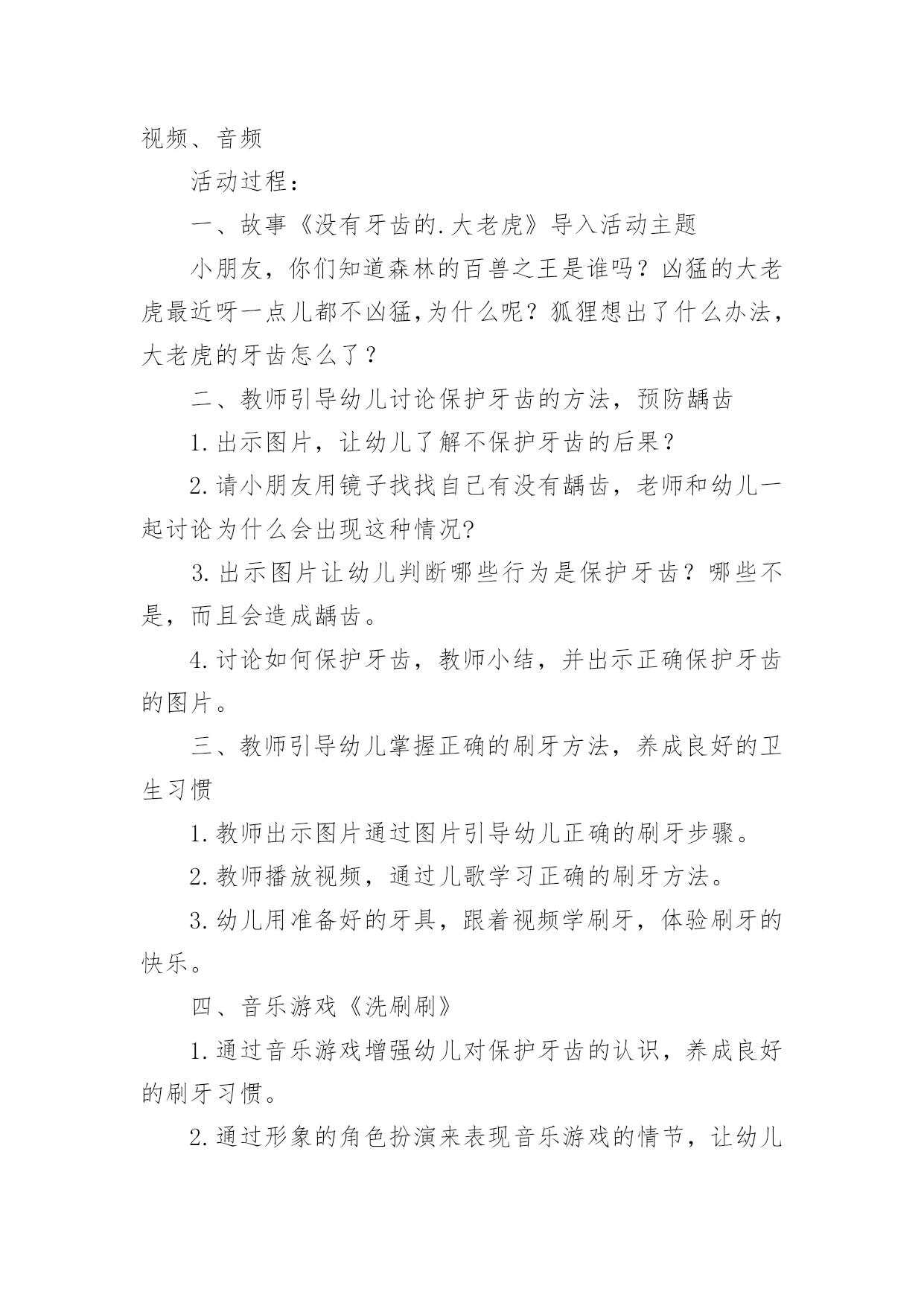 《保护牙齿》健康教案《保护牙齿》健康教案15篇(必备)作为一名为他人授业解惑的教育工作者,时常要开展教案准备工作,编写教案有利于我们准确把握教材的重点与难点,进而选择恰当的教学方法。我们应该怎么写教案呢?以下是小编为大家整理的《保护牙齿》健康教案,欢迎阅读与收藏。《保护牙齿》健康教案1一、设计意图:在日常活动中,我发现幼儿对牙齿的了解并不深入,有坚持早晚刷牙习惯的幼儿并不多,蛀牙问题在幼儿中也严重存在,根据本班幼儿的认知特点和兴趣,我设想通过具体的牙齿模型、幼儿日常的生活经验,使幼儿在活动中整理和提升自己的经验,并寻找保护牙齿的方法。二、活动目标:1、了解牙齿的重要性。2、通过活动使幼儿了解蛀牙形成的原因。3、了解换牙的常识,学会保护恒牙,养成坚持每天刷牙的习惯。4、引导孩子乐于接受治疗。鼓励、培养小朋友不怕打针的勇敢精神。5、知道检查身体的重要性。三、活动准备:1、牙模、牙刷;2、蛀牙形成的图片两张。四、活动重点:了解牙齿的重要性,学会正确的刷牙方法。五、活动难点:蛀牙形成的原因。六、活动过程:(一)以猜谜语的形式引出主题1、师:今天老师请小朋友猜一个谜语,我请小朋友们猜到的小朋友上来轻轻的告诉老师,兄弟生来白又白,整整齐齐排两排。2、切菜舂米快又快,人人吃饭离不开。(牙齿)(二)、比一比,看一看1、师:小朋友们真棒呀,一下子就猜到答案了,小朋友洁白美丽的牙齿使人更健康,美观。小朋友我们的牙齿漂亮吗。我们同桌的小朋友互相看看2、看,这个就是我们的牙齿的模型,哪位小朋友能告诉我牙齿有什么作用呢?"(引导幼儿发散思维,对积极回答的幼儿给予肯定表扬)(二)讲述绘本故事《蛀牙王子》1、看完了故事,蛀牙王子为什么会得蛀牙啊?2、患了蛀牙之后会怎么样啊?(三)知道正确的刷牙方法1、师:刚才我们有小朋友说了早晚都刷牙可以不让我们的牙宝宝变成大蛀牙,那你们能坚持做到早晚都刷牙吗?2、学习刷牙步骤。3、请幼儿演示刷牙动作师:我请小朋友做做看,刷牙的动作是怎么样的?(幼儿上前在牙模上演示)师:小朋友们的刷牙动作都不大一样,那跟着老师一边听音乐,一边做刷牙操吧!教学反思通过学习,幼儿了解蛀牙形成的`原因以及对人身体的危害,幼儿还掌握了正确的刷牙方法,有利于养成早晚刷牙的卫生习惯,收到良好的效果,整个教学活动层层递进,从材料,形成到组织的各个环节,教师的语言以及幼儿的表现等,都是个性化浓郁的,不断激发孩子欲望的,孩子主动探索主动学习发现知识的一次活动。总之,是把枯燥的科学活动和其他领域有机的结合在一起,达到了整合的目的。《保护牙齿》健康教案2活动目标:1.感受牙齿健康的快乐。2.初步学会正确的刷牙方法3.知道保护牙齿的方法,养成良好的刷牙习惯。活动准备:故事《没有牙齿的大老虎》牙刷、牙杯、牙膏、图片、视频、音频活动过程:一、故事《没有牙齿的.大老虎》导入活动主题小朋友,你们知道森林的百兽之王是谁吗?凶猛的大老虎最近呀一点儿都不凶猛,为什么呢?狐狸想出了什么办法,大老虎的牙齿怎么了?二、教师引导幼儿讨论保护牙齿的方法,预防龋齿1.出示图片,让幼儿了解不保护牙齿的后果?2.请小朋友用镜子找找自己有没有龋齿,老师和幼儿一起讨论为什么会出现这种情况?3.出示图片让幼儿判断哪些行为是保护牙齿?哪些不是,而且会造成龋齿。4.讨论如何保护牙齿,教师小结,并出示正确保护牙齿的图片。三、教师引导幼儿掌握正确的刷牙方法,养成良好的卫生习惯1.教师出示图片通过图片引导幼儿正确的刷牙步骤。2.教师播放视频,通过儿歌学习正确的刷牙方法。3.幼儿用准备好的牙具,跟着视频学刷牙,体验刷牙的快乐。四、音乐游戏《洗刷刷》1.通过音乐游戏增强幼儿对保护牙齿的认识,养成良好的刷牙习惯。2.通过形象的角色扮演来表现音乐游戏的情节,让幼儿在轻松快乐的环境中喜欢刷牙,乐于保护自己的牙齿。五、活动延伸教师在班级开展“牙牙选美大会”活动,每天选出“最美牙齿小明星”。《保护牙齿》健康教案3设计意图:在日常活动中,我发现幼儿对牙齿的了解并不深入,有坚持早晚刷牙习惯的幼儿并不多,蛀牙问题在幼儿中也严重存在,根据本班幼儿的认知特点和兴趣,我设想通过具体的牙齿模型、幼儿日常的生活经验,使幼儿在活动中整理和提升自己的经验,并寻找保护牙齿的`方法。活动目标:1、了解牙齿的重要性。2、通过活动使幼儿了解蛀牙形成的原因。3、了解换牙的常识,学会保护恒牙,养成坚持每天刷牙的习惯。活动准备:1、牙模、牙刷;2、蛀牙形成的图片两张;3、事先浸泡在醋里的蛋壳和未浸泡过的蛋壳;活动重难点:重点:了解牙齿的重要性,学会正确的刷牙方法。难点:蛀牙形成的原因。活动过程:(一)以猜谜语的形式引出主题1、T:今天老师请小朋友猜一个谜语,我请小朋友们猜到的小朋友上来轻轻的告诉老师,健康卫士穿白衣,上下两排真整齐,口中饭菜它磨碎,早