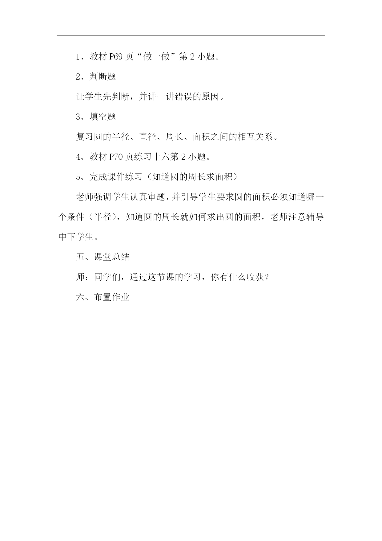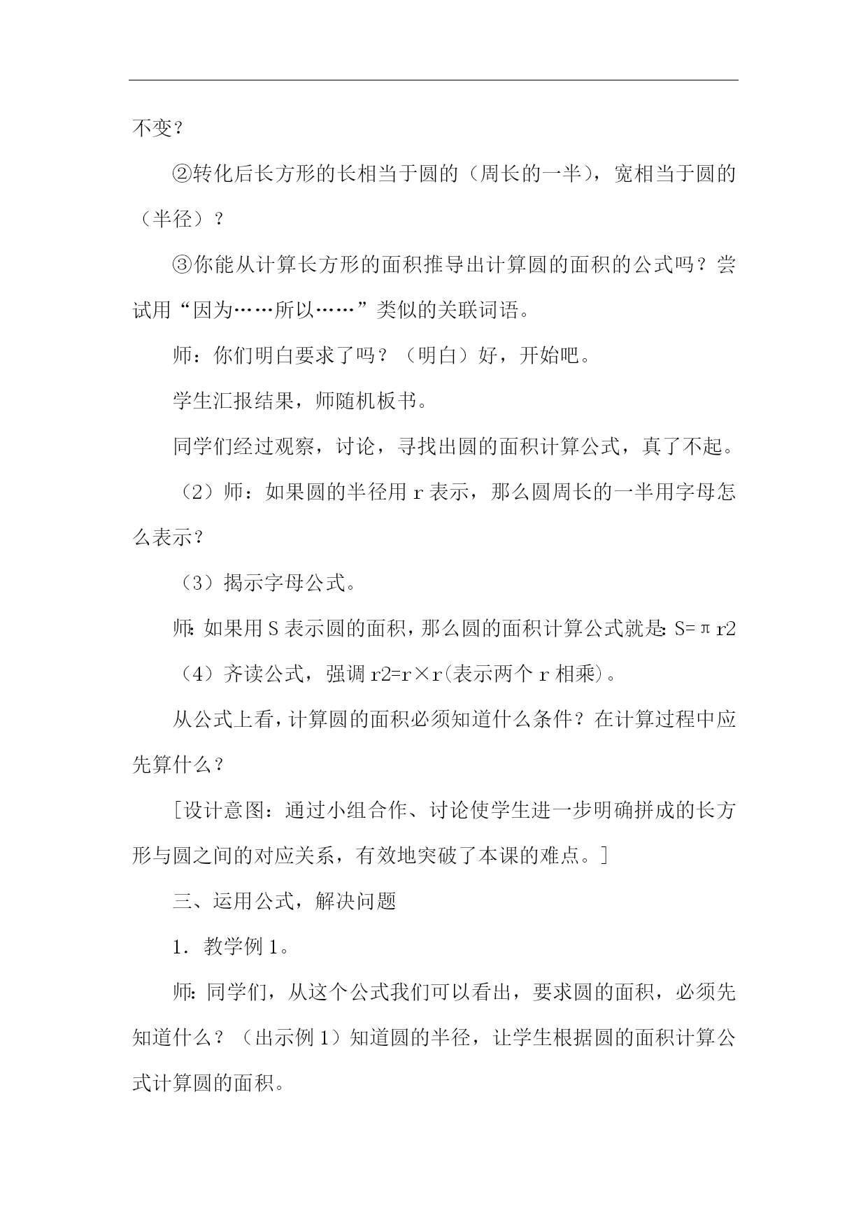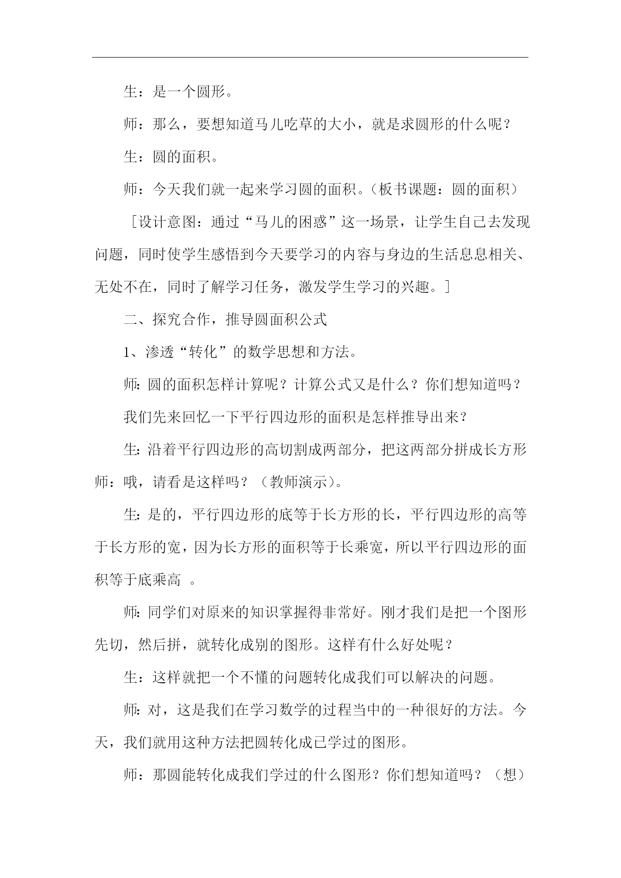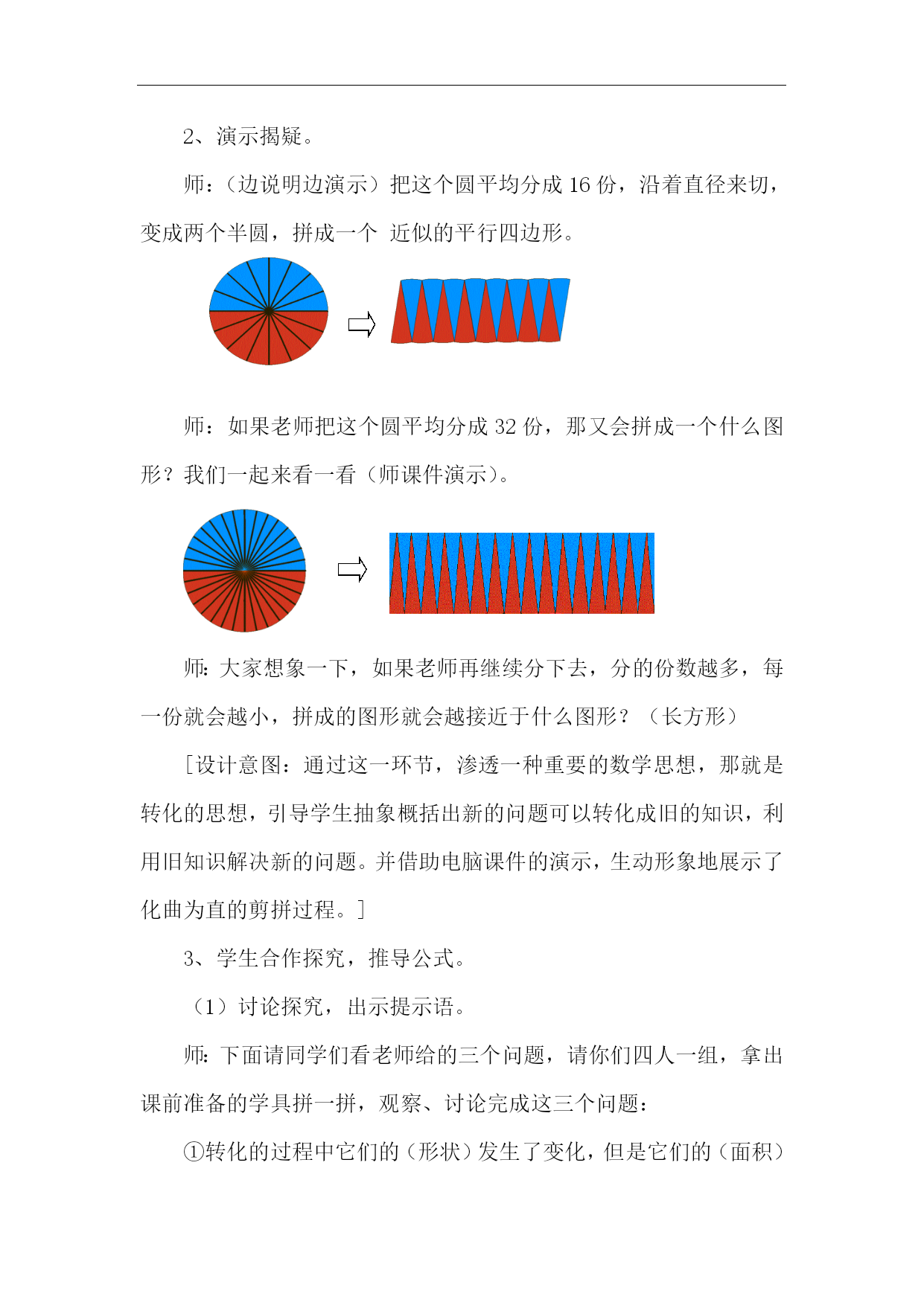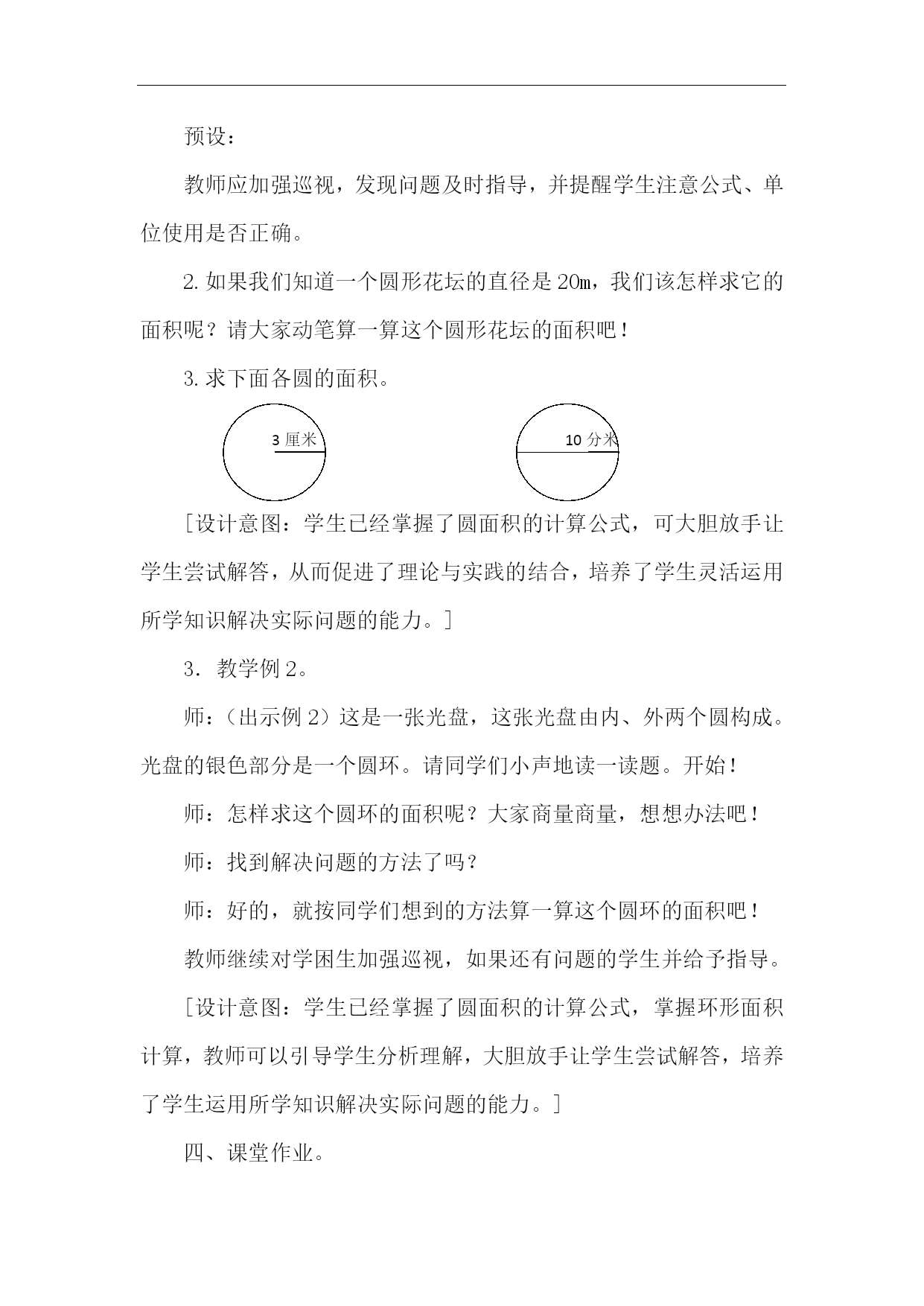 《圆的面积》教学设计【教学内容】义务教育课程标准实验教科书第十一册P69~71例1、例2。【教学目标】1、认知目标使学生理解圆面积的含义;掌握圆的面积公式,并能运用所学知识解决生活中的简单问题。2、过程与方法目标经历圆的面积公式的推导过程,体验实验操作,逻辑推理的学习方法。3、情感目标引导学生进一步体会“转化”的数学思想,初步了解极限思想;体验发现新知识的快乐,增强学生的合作交流意识和能力,培养学生学习数学的兴趣。【教学重点】:掌握圆的面积的计算公式,能够正确地计算圆的面积。【教学难点】:理解圆的面积计算公式的推导。【教学准备】:相应课件;圆的面积演示教具【教学过程】一、情境导入出示场景——《马儿的困惑》师:同学们,你们知道马儿吃草的大小是一个什么图形呀?生:是一个圆形。师:那么,要想知道马儿吃草的大小,就是求圆形的什么呢?生:圆的面积。师:今天我们就一起来学习圆的面积。(板书课题:圆的面积)[设计意图:通过“马儿的困惑”这一场景,让学生自己去发现问题,同时使学生感悟到今天要学习的内容与身边的生活息息相关、无处不在,同时了解学习任务,激发学生学习的兴趣。]二、探究合作,推导圆面积公式1、渗透“转化”的数学思想和方法。师:圆的面积怎样计算呢?计算公式又是什么?你们想知道吗?我们先来回忆一下平行四边形的面积是怎样推导出来?生:沿着平行四边形的高切割成两部分,把这两部分拼成长方形师:哦,请看是这样吗?(教师演示)。生:是的,平行四边形的底等于长方形的长,平行四边形的高等于长方形的宽,因为长方形的面积等于长乘宽,所以平行四边形的面积等于底乘高。师:同学们对原来的知识掌握得非常好。刚才我们是把一个图形先切,然后拼,就转化成别的图形。这样有什么好处呢?生:这样就把一个不懂的问题转化成我们可以解决的问题。师:对,这是我们在学习数学的过程当中的一种很好的方法。今天,我们就用这种方法把圆转化成已学过的图形。师:那圆能转化成我们学过的什么图形?你们想知道吗?(想)2、演示揭疑。师:(边说明边演示)把这个圆平均分成16份,沿着直径来切,变成两个半圆,拼成一个近似的平行四边形。师:如果老师把这个圆平均分成32份,那又会拼成一个什么图形?我们一起来看一看(师课件演示)。师:大家想象一下,如果老师再继续分下去,分的份数越多,每一份就会越小,拼成的图形就会越接近于什么图形?(长方形)[设计意图:通过这一环节,渗透一种重要的数学思想,那就是转化的思想,引导学生抽象概括出新的问题可以转化成旧的知识,利用旧知识解决新的问题。并借助电脑课件的演示,生动形象地展示了化曲为直的剪拼过程。]3、学生合作探究,推导公式。(1)讨论探究,出示提示语。师:下面请同学们看老师给的三个问题,请你们四人一组,拿出课前准备的学具拼一拼,观察、讨论完成这三个问题:①转化的过程中它们的(形状)发生了变化,但是它们的(面积)不变?②转化后长方形的长相当于圆的(周长的一半),宽相当于圆的(半径)?③你能从计算长方形的面积推导出计算圆的面积的公式吗?尝试用“因为……所以……”类似的关联词语。师:你们明白要求了吗?(明白)好,开始吧。学生汇报结果,师随机板书。同学们经过观察,讨论,寻找出圆的面积计算公式,真了不起。(2)师:如果圆的半径用r表示,那么圆周长的一半用字母怎么表示?(3)揭示字母公式。师:如果用S表示圆的面积,那么圆的面积计算公式就是:S=πr2(4)齐读公式,强调r2=r×r(表示两个r相乘)。从公式上看,计算圆的面积必须知道什么条件?在计算过程中应先算什么?[设计意图:通过小组合作、讨论使学生进一步明确拼成的长方形与圆之间的对应关系,有效地突破了本课的难点。]三、运用公式,解决问题1.教学例1。师:同学们,从这个公式我们可以看出,要求圆的面积,必须先知道什么?(出示例1)知道圆的半径,让学生根据圆的面积计算公式计算圆的面积。预设:教师应加强巡视,发现问题及时指导,并提醒学生注意公式、单位使用是否正确。2.如果我们知道一个圆形花坛的直径是20m,我们该怎样求它的面积呢?请大家动笔算一算这个圆形花坛的面积吧!3厘米10分米3.求下面各圆的面积。[设计意图:学生已经掌握了圆面积的计算公式,可大胆放手让学生尝试解答,从而促进了理论与实践的结合,培养了学生灵活运用所学知识解决实际问题的能力。]3.教学例2。师:(出示例2)这是一张光盘,这张光盘由内、外两个圆构成。光盘的银色部分是一个圆环。请同学们小声地读一读题。开始!师:怎样求这个圆环的面积呢?大家商量商量,想想办法吧!师:找到解决问题的方法了吗?师:好的,就按同学们想到的方法算
