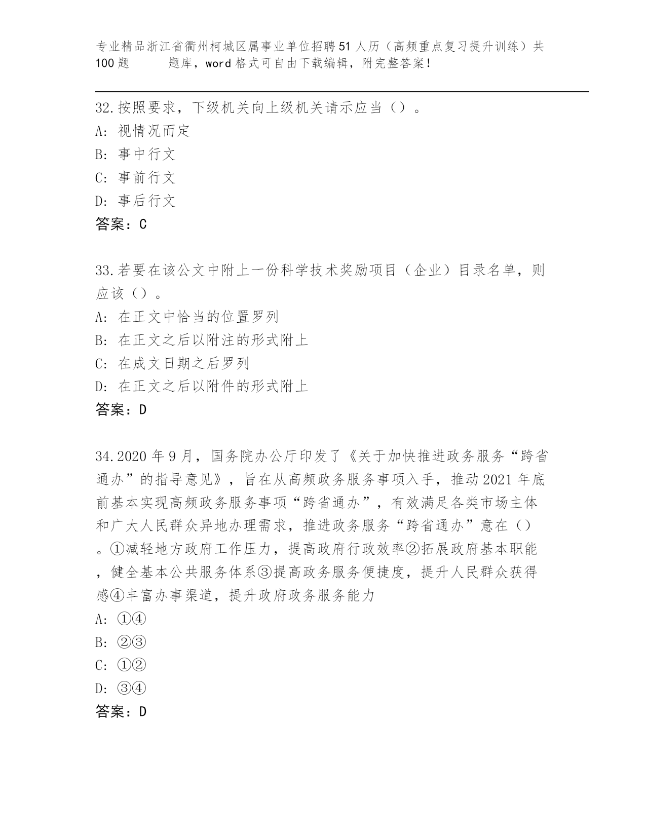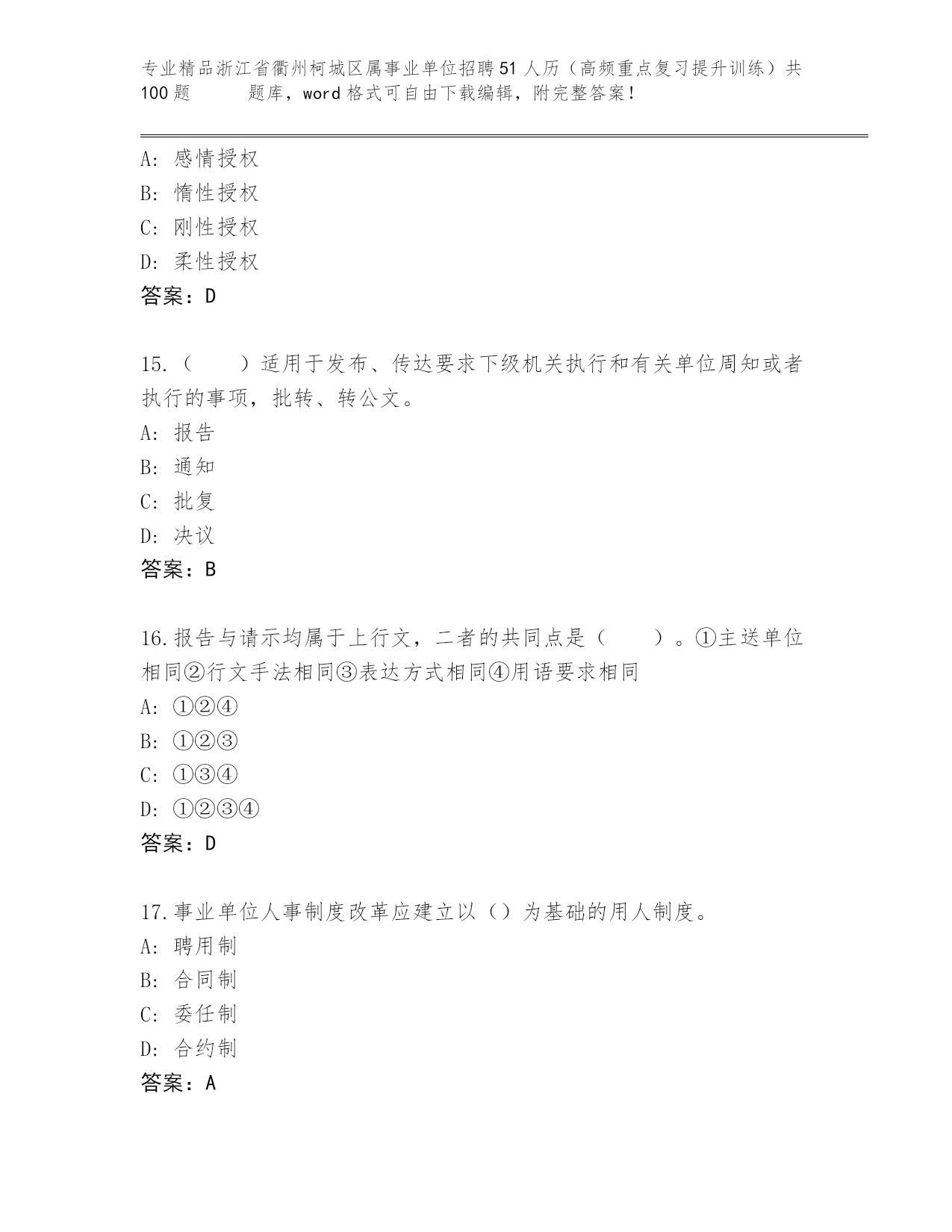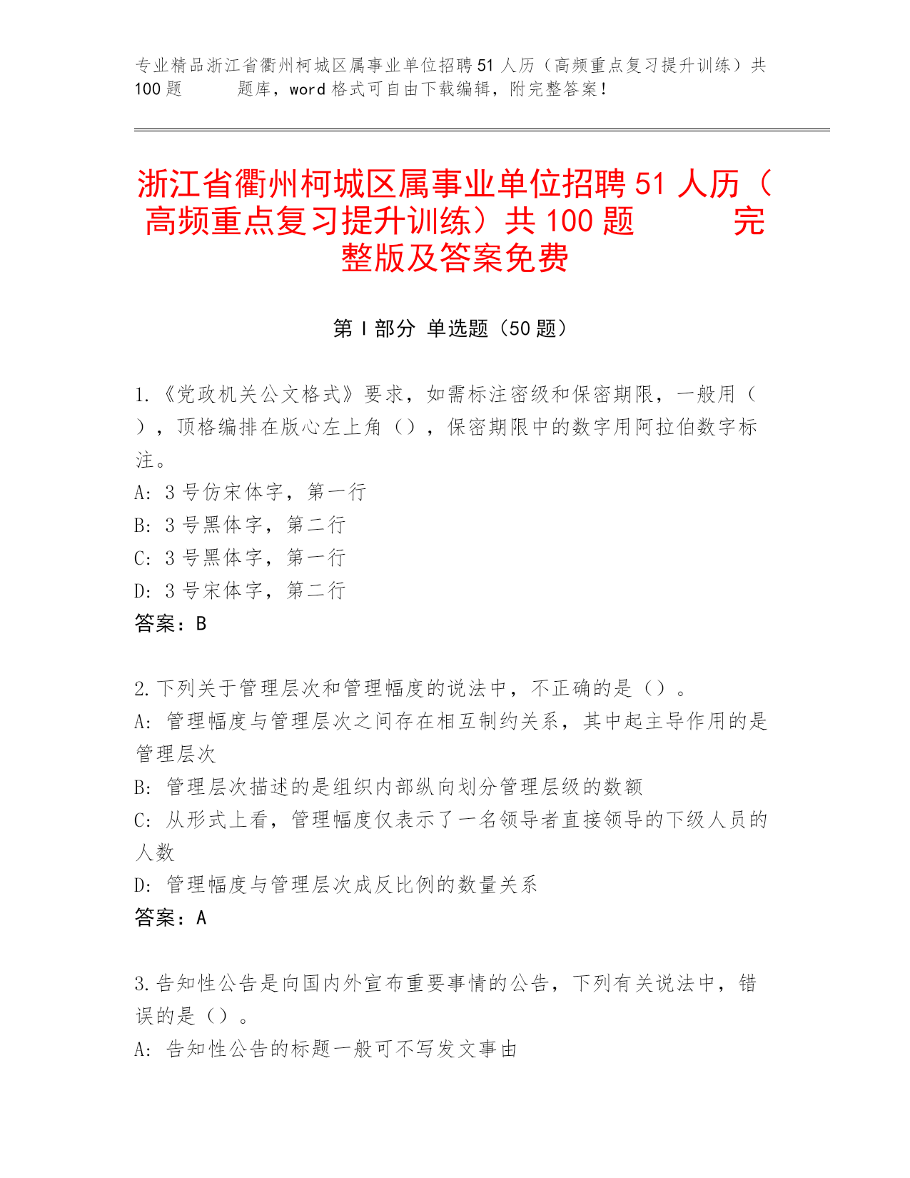 浙江省衢州柯城区属事业单位招聘51人历(高频重点复习提升训练)共100题 完整版及答案免费