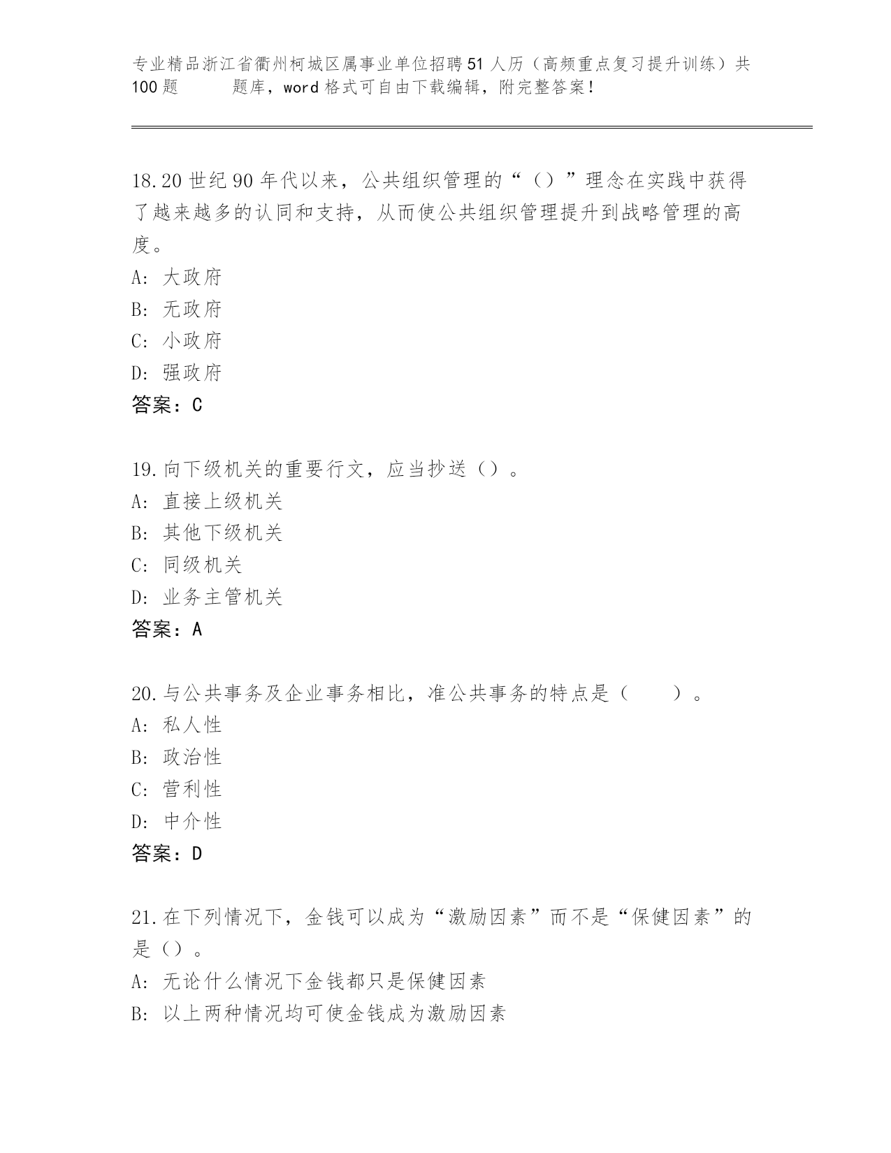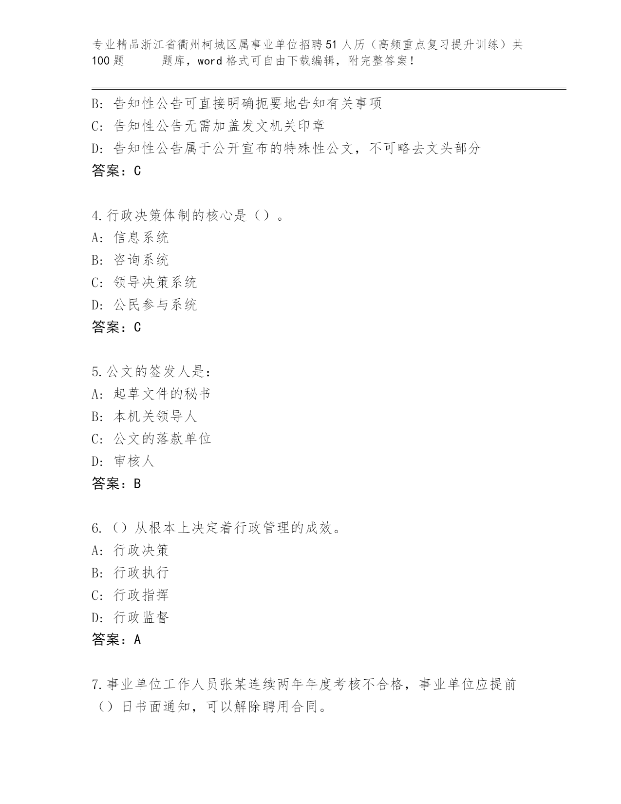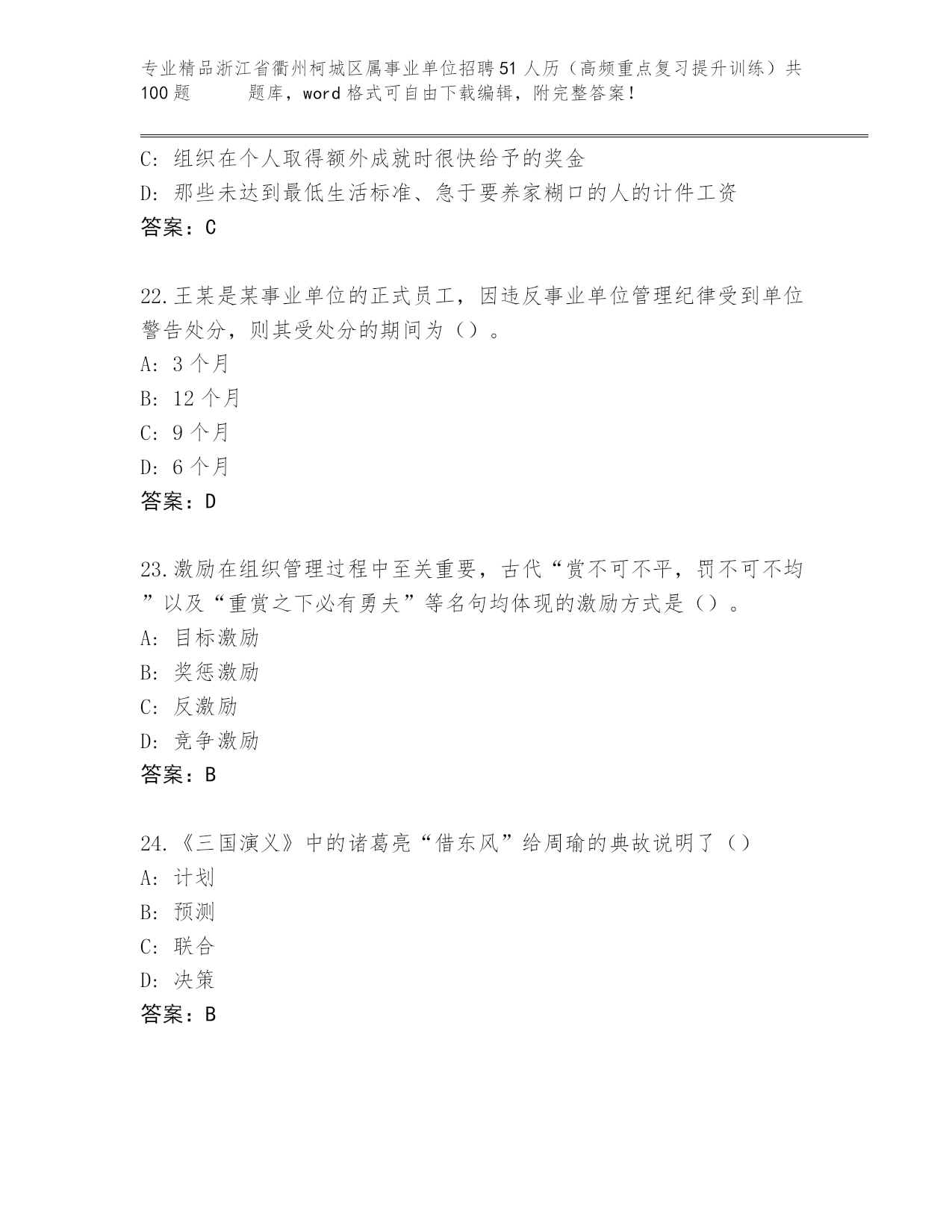 精编浙江省衢州柯城区属事业单位招聘51人历(高频重点复习提升训练)共100题 真题题库及答案免费下载
