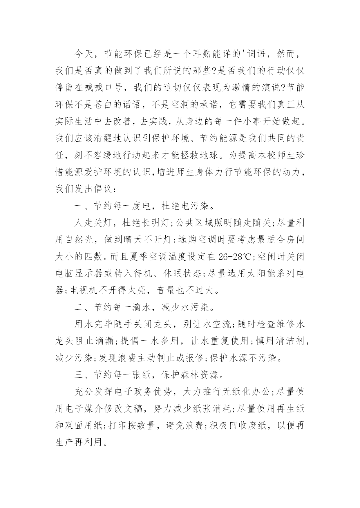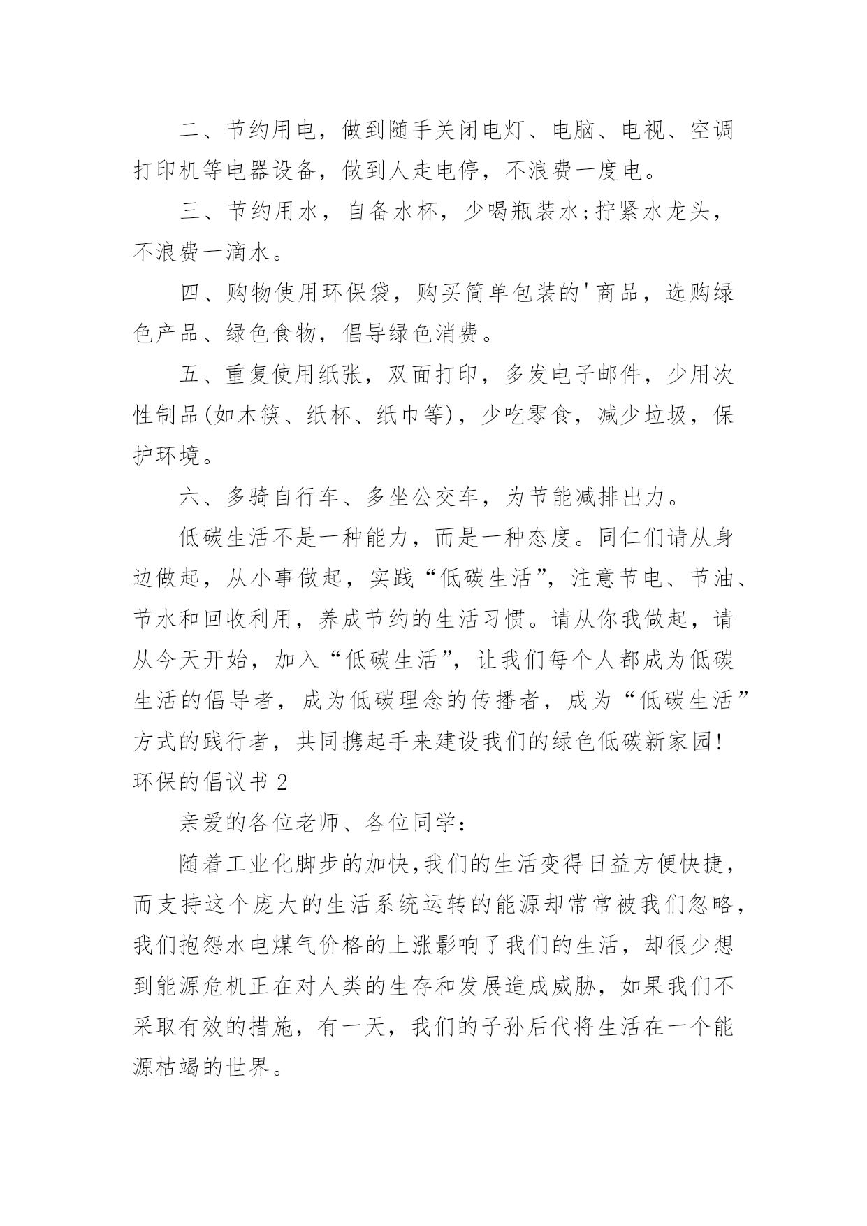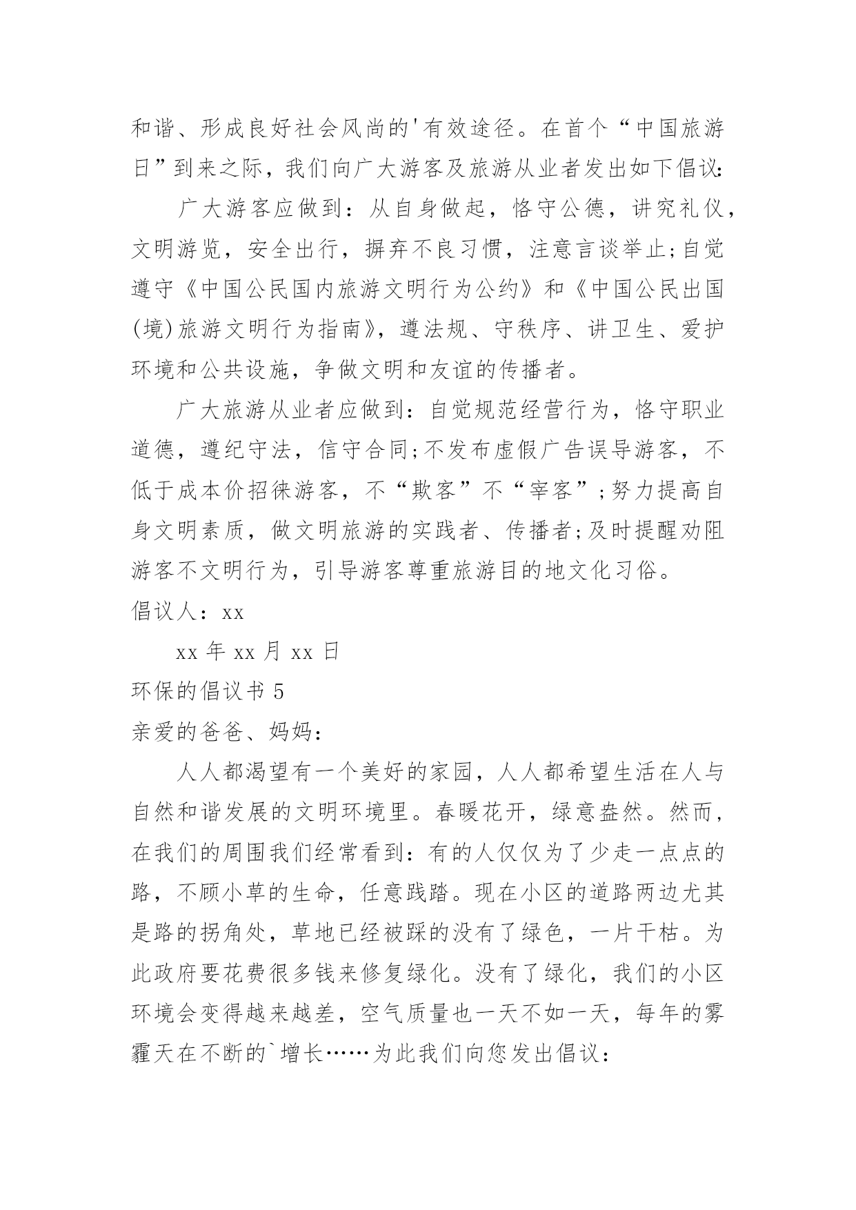 环保的倡议书环保的倡议书(集合15篇)在学习、工作生活中,在很多情况下我们需要用到倡议书,倡议书是由某一组织或社团拟定、就某事向社会提出建议或提议社会成员共同去做某事的书面文章。你所见过的倡议书是什么样的呢?下面是小编精心整理的环保的倡议书,欢迎大家借鉴与参考,希望对大家有所帮助。环保的倡议书1同仁们:近年来,全球气候变幻无常、水士流失严重、温室效应明显、耕地沙化蔓延、生存环境日益恶化,严重威胁着全人类的健康与生命。因此,遏制气候变暖,是全人类共同的使命。为了你、为了我、为了他,也为了我们这个赖以生存的地球大家庭,更是为了明天的美好生活,作为当代公民,我们应该积极行动起来,身体力行,共同遏制全球气候变暖。为此,公司向全体干部职工发出“低碳生活,从你我做起”的倡议,号召全体干部职工要做到:一、在日常工作和生活中,我们每个人都应该主动增强危机意识、节约意识与环保意识,真正了解节能环保对国家及个人的意义。二、节约用电,做到随手关闭电灯、电脑、电视、空调打印机等电器设备,做到人走电停,不浪费一度电。三、节约用水,自备水杯,少喝瓶装水;拧紧水龙头,不浪费一滴水。四、购物使用环保袋,购买简单包装的'商品,选购绿色产品、绿色食物,倡导绿色消费。五、重复使用纸张,双面打印,多发电子邮件,少用次性制品(如木筷、纸杯、纸巾等),少吃零食,减少垃圾,保护环境。六、多骑自行车、多坐公交车,为节能减排出力。低碳生活不是一种能力,而是一种态度。同仁们请从身边做起,从小事做起,实践“低碳生活”,注意节电、节油、节水和回收利用,养成节约的生活习惯。请从你我做起,请从今天开始,加入“低碳生活”,让我们每个人都成为低碳生活的倡导者,成为低碳理念的传播者,成为“低碳生活”方式的践行者,共同携起手来建设我们的绿色低碳新家园!环保的倡议书2亲爱的各位老师、各位同学:随着工业化脚步的加快,我们的生活变得日益方便快捷,而支持这个庞大的生活系统运转的能源却常常被我们忽略,我们抱怨水电煤气价格的上涨影响了我们的生活,却很少想到能源危机正在对人类的生存和发展造成威胁,如果我们不采取有效的措施,有一天,我们的子孙后代将生活在一个能源枯竭的世界。今天,节能环保已经是一个耳熟能详的'词语,然而,我们是否真的做到了我们所说的那些?是否我们的行动仅仅停留在喊喊口号,我们的迫切仅仅表现为激情的演说?节能环保不是苍白的话语,不是空洞的承诺,它需要我们真正从实际生活中去改善,去实践,从身边的每一件小事开始做起。我们应该清醒地认识到保护环境、节约能源是我们共同的责任,刻不容缓地行动起来才能拯救地球。为提高本校师生珍惜能源爱护环境的认识,增进师生身体力行节能环保的动力,我们发出倡议:一、节约每一度电,杜绝电污染。人走关灯,杜绝长明灯;公共区域照明随走随关;尽量利用自然光,做到晴天不开灯;选购空调时要考虑最适合房间大小的匹数。而且夏季空调温度设定在26-28℃;空闲时关闭电脑显示器或转入待机、休眠状态;尽量选用太阳能系列电器;电视机不开得太亮,音量也不过大。二、节约每一滴水,减少水污染。用水完毕随手关闭龙头,别让水空流;随时检查维修水龙头阻止滴漏;提倡一水多用,让水重复使用;慎用清洁剂,减少污染;发现浪费主动制止或报修;保护水源不污染。三、节约每一张纸,保护森林资源。充分发挥电子政务优势,大力推行无纸化办公;尽量使用电子媒介修改文稿,努力减少纸张消耗;尽量使用再生纸和双面用纸;打印按数量,避免浪费;积极回收废纸,以便再生产再利用。四、节约每一粒粮食,珍惜粮食资源。饭不在多,够吃就好,菜不在全,营养匀衡就好;避免餐餐剩饭剩菜;杜绝奢侈饮食,培养勤俭节约好习惯。五、节约每一升油,少污染少浪费。严格公务车辆管理,严禁公车私用;提倡工作人员办理非紧急公务活动时,选乘公交车;掌握好车辆的保养和节油驾驶技巧,长时间停车等待时要熄火,不使用汽车空调在车内休息,降低车辆使用成本和资源耗费。六、节约每一分办公经费,开源节流。严格办公用品配备标准,尽量选择能耗小、环保、质优、价廉的办公设备;办公用品、电脑耗材等力求循环使用;修废利旧,延长用品的使用寿命和周期;办公用品不私用。七、自备生活必需品,少用一次性制品。用充电电池代替普通电池;用手绢代替纸巾;用瓷杯、玻璃杯代替纸杯;用布袋代替塑料袋;用自动铅笔代替木杆铅笔;外出用餐自备餐具;出差带上洗涑用具;外出游玩时,更要身带各种物品,减少一次性用品的污染及浪费。八、关注细节,从生活点滴做起。减少噪音污染,尽量减低说话或电器播放时的音量;不吸烟、随意焚烧垃圾,正确处理废弃物,保持洁净环境;塑料瓶、废纸等收集起来卖给收废站,减少垃圾排放;爱护花草树木,保护绿色校园。亲爱的老师和同学们,建设资源节约型社会是全体公民的共同责任,我们渴望干净的地球,渴望绿色、健康、洁净的生活空间