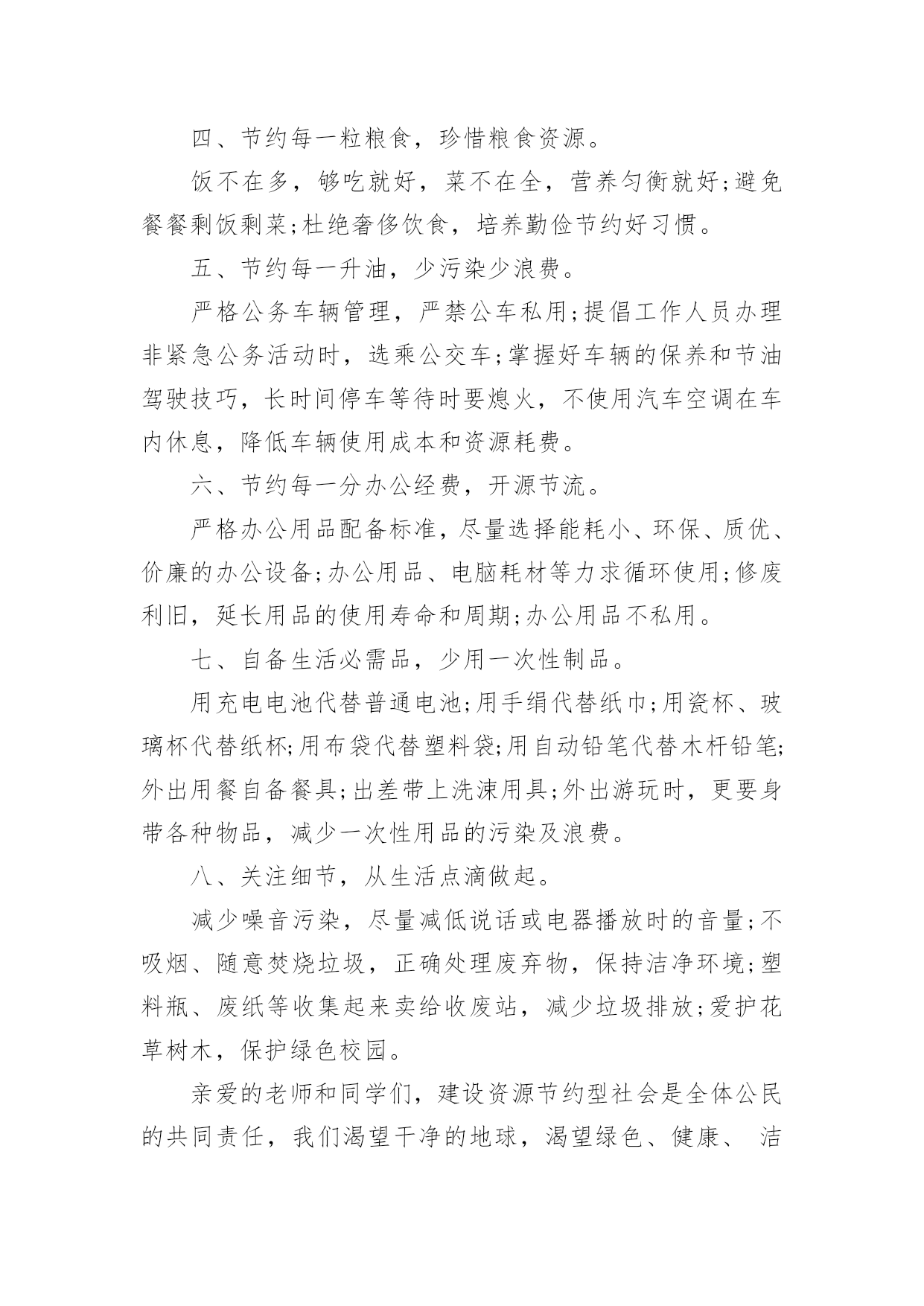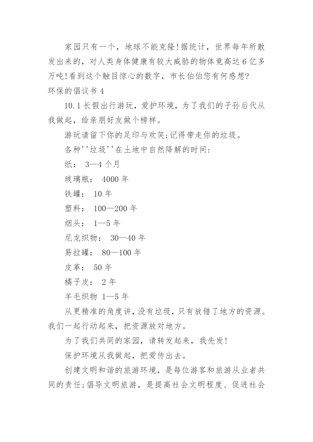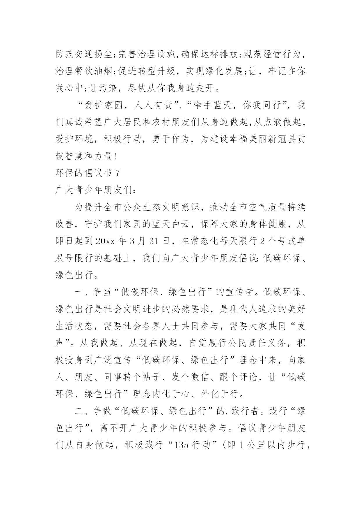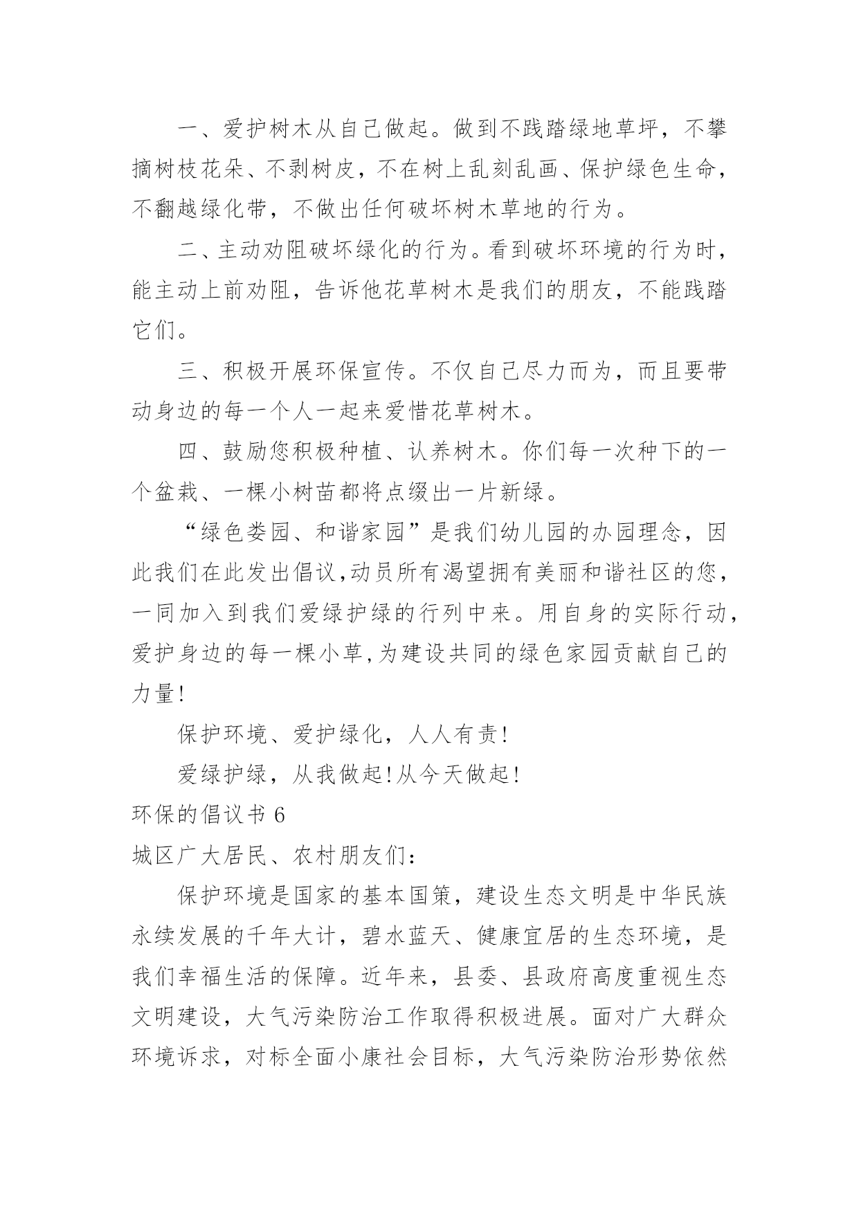 环保的倡议书环保的倡议书(集合15篇)在学习、工作生活中,在很多情况下我们需要用到倡议书,倡议书是由某一组织或社团拟定、就某事向社会提出建议或提议社会成员共同去做某事的书面文章。你所见过的倡议书是什么样的呢?下面是小编精心整理的环保的倡议书,欢迎大家借鉴与参考,希望对大家有所帮助。环保的倡议书1同仁们:近年来,全球气候变幻无常、水士流失严重、温室效应明显、耕地沙化蔓延、生存环境日益恶化,严重威胁着全人类的健康与生命。因此,遏制气候变暖,是全人类共同的使命。为了你、为了我、为了他,也为了我们这个赖以生存的地球大家庭,更是为了明天的美好生活,作为当代公民,我们应该积极行动起来,身体力行,共同遏制全球气候变暖。为此,公司向全体干部职工发出“低碳生活,从你我做起”的倡议,号召全体干部职工要做到:一、在日常工作和生活中,我们每个人都应该主动增强危机意识、节约意识与环保意识,真正了解节能环保对国家及个人的意义。二、节约用电,做到随手关闭电灯、电脑、电视、空调打印机等电器设备,做到人走电停,不浪费一度电。三、节约用水,自备水杯,少喝瓶装水;拧紧水龙头,不浪费一滴水。四、购物使用环保袋,购买简单包装的'商品,选购绿色产品、绿色食物,倡导绿色消费。五、重复使用纸张,双面打印,多发电子邮件,少用次性制品(如木筷、纸杯、纸巾等),少吃零食,减少垃圾,保护环境。六、多骑自行车、多坐公交车,为节能减排出力。低碳生活不是一种能力,而是一种态度。同仁们请从身边做起,从小事做起,实践“低碳生活”,注意节电、节油、节水和回收利用,养成节约的生活习惯。请从你我做起,请从今天开始,加入“低碳生活”,让我们每个人都成为低碳生活的倡导者,成为低碳理念的传播者,成为“低碳生活”方式的践行者,共同携起手来建设我们的绿色低碳新家园!环保的倡议书2亲爱的各位老师、各位同学:随着工业化脚步的加快,我们的生活变得日益方便快捷,而支持这个庞大的生活系统运转的能源却常常被我们忽略,我们抱怨水电煤气价格的上涨影响了我们的生活,却很少想到能源危机正在对人类的生存和发展造成威胁,如果我们不采取有效的措施,有一天,我们的子孙后代将生活在一个能源枯竭的世界。今天,节能环保已经是一个耳熟能详的'词语,然而,我们是否真的做到了我们所说的那些?是否我们的行动仅仅停留在喊喊口号,我们的迫切仅仅表现为激情的演说?节能环保不是苍白的话语,不是空洞的承诺,它需要我们真正从实际生活中去改善,去实践,从身边的每一件小事开始做起。我们应该清醒地认识到保护环境、节约能源是我们共同的责任,刻不容缓地行动起来才能拯救地球。为提高本校师生珍惜能源爱护环境的认识,增进师生身体力行节能环保的动力,我们发出倡议:一、节约每一度电,杜绝电污染。人走关灯,杜绝长明灯;公共区域照明随走随关;尽量利用自然光,做到晴天不开灯;选购空调时要考虑最适合房间大小的匹数。而且夏季空调温度设定在26-28℃;空闲时关闭电脑显示器或转入待机、休眠状态;尽量选用太阳能系列电器;电视机不开得太亮,音量也不过大。二、节约每一滴水,减少水污染。用水完毕随手关闭龙头,别让水空流;随时检查维修水龙头阻止滴漏;提倡一水多用,让水重复使用;慎用清洁剂,减少污染;发现浪费主动制止或报修;保护水源不污染。三、节约每一张纸,保护森林资源。充分发挥电子政务优势,大力推行无纸化办公;尽量使用电子媒介修改文稿,努力减少纸张消耗;尽量使用再生纸和双面用纸;打印按数量,避免浪费;积极回收废纸,以便再生产再利用。四、节约每一粒粮食,珍惜粮食资源。饭不在多,够吃就好,菜不在全,营养匀衡就好;避免餐餐剩饭剩菜;杜绝奢侈饮食,培养勤俭节约好习惯。五、节约每一升油,少污染少浪费。严格公务车辆管理,严禁公车私用;提倡工作人员办理非紧急公务活动时,选乘公交车;掌握好车辆的保养和节油驾驶技巧,长时间停车等待时要熄火,不使用汽车空调在车内休息,降低车辆使用成本和资源耗费。六、节约每一分办公经费,开源节流。严格办公用品配备标准,尽量选择能耗小、环保、质优、价廉的办公设备;办公用品、电脑耗材等力求循环使用;修废利旧,延长用品的使用寿命和周期;办公用品不私用。七、自备生活必需品,少用一次性制品。用充电电池代替普通电池;用手绢代替纸巾;用瓷杯、玻璃杯代替纸杯;用布袋代替塑料袋;用自动铅笔代替木杆铅笔;外出用餐自备餐具;出差带上洗涑用具;外出游玩时,更要身带各种物品,减少一次性用品的污染及浪费。八、关注细节,从生活点滴做起。减少噪音污染,尽量减低说话或电器播放时的音量;不吸烟、随意焚烧垃圾,正确处理废弃物,保持洁净环境;塑料瓶、废纸等收集起来卖给收废站,减少垃圾排放;爱护花草树木,保护绿色校园。亲爱的老师和同学们,建设资源节约型社会是全体公民的共同责任,我们渴望干净的地球,渴望绿色、健康、洁净的生活空间