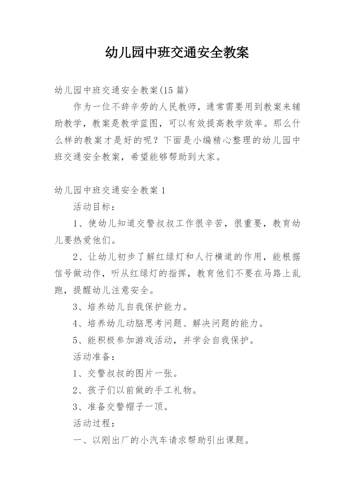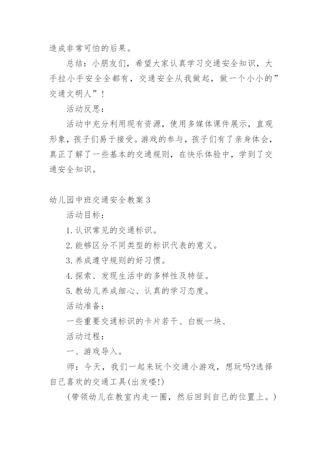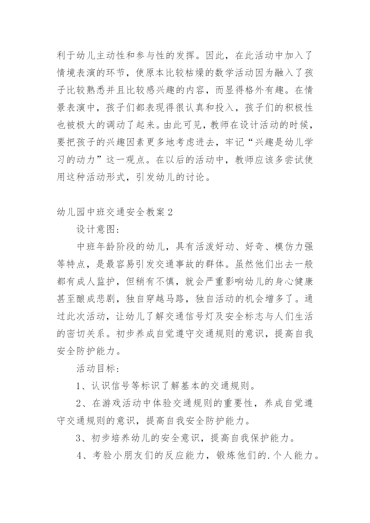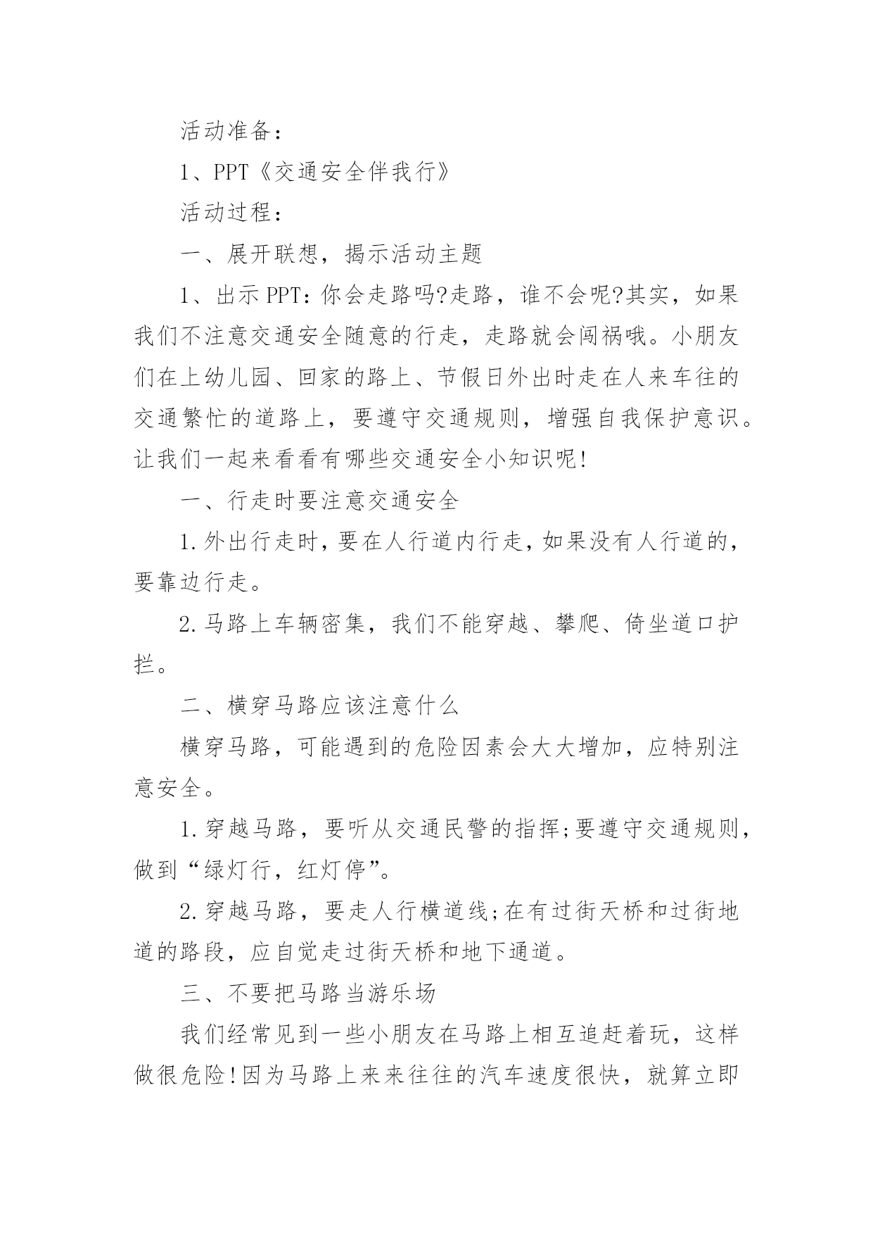 幼儿园中班交通安全教案幼儿园中班交通安全教案(15篇)作为一位不辞辛劳的人民教师,通常需要用到教案来辅助教学,教案是教学蓝图,可以有效提高教学效率。那么什么样的教案才是好的呢?下面是小编精心整理的幼儿园中班交通安全教案,希望能够帮助到大家。幼儿园中班交通安全教案1活动目标:1、使幼儿知道交警叔叔工作很辛苦,很重要,教育幼儿要热爱他们。2、让幼儿初步了解红绿灯和人行横道的作用,能根据信号做动作,听从红绿灯的指挥,教育他们不要在马路上乱跑,提醒幼儿注意安全。3、培养幼儿自我保护能力。4、培养幼儿动脑思考问题、解决问题的能力。5、能积极参加游戏活动,并学会自我保护。活动准备:1、交警叔叔的图片一张。2、孩子们以前做的手工礼物。3、准备交警帽子一顶。活动过程:一、以刚出厂的小汽车请求帮助引出课题。老师:有辆小汽车刚从汽车制造厂里出来,对一切都感到很奇怪,它看到马路上这么热闹,开心得“滴滴”直叫,正走着呢,他看见马路中间站着一个人(出示交警叔叔图片)1、这是谁?2、他在干什么?3、他会对小汽车说什么?二、坚守岗位的交警叔叔。(出示幻灯片)出示交警冒雨雪执勤以及扶盲人过马路的图片,让幼儿感受交警工作的辛苦,激发对交警叔叔的热爱。提问:1、交警叔叔都作了哪些事情?2、你们喜欢他吗?3、请每位幼儿跟交警叔叔说一句甜甜的话。三、给交警叔叔送礼物让幼儿自选一种礼物,然后跟老师出去一起把礼物送给交警叔叔,把幼儿带出场地。(在此期间要提醒幼儿出去送礼物的时候要注意安全,过马路要走人行横道)。活动反思:孩子们对交通安全有一定的认知,能较客观的认定其他人行为的对与错。在活动中,幼儿的语言表达能力有了很大的进步,尤其是对于自己比较了解的事情,语言的条理性很强。由此可见,生活经验的积累对幼儿的思维、语言发展起着很重要的作用。但通常这样的活动,多数幼儿是围绕老师的指导来达成安全知识的学习的,缺乏一定的'趣味性,不利于幼儿主动性和参与性的发挥。因此,在此活动中加入了情境表演的环节,使原本比较枯燥的数学活动因为融入了孩子比较熟悉并且比较感兴趣的内容,而显得格外有趣。在情景表演中,孩子们都表现得很认真和投入,孩子们的积极性也被极大的调动了起来。由此可见,教师在设计活动的时候,要把孩子的兴趣因素更多地考虑进去,牢记“兴趣是幼儿学习的动力”这一观点。在以后的活动中,教师应该多尝试使用这种活动形式,引发幼儿的讨论。幼儿园中班交通安全教案2设计意图:中班年龄阶段的幼儿,具有活泼好动、好奇、模仿力强等特点,是最容易引发交通事故的群体。虽然他们出去一般都有成人监护,但稍有不慎,就会严重影响幼儿的身心健康甚至酿成悲剧,独自穿越马路,独自活动的机会增多了。通过此次活动,让幼儿了解交通信号灯及安全标志与人们生活的密切关系。初步养成自觉遵守交通规则的意识,提高自我安全防护能力。活动目标:1、认识信号等标识了解基本的交通规则。2、在游戏活动中体验交通规则的重要性,养成自觉遵守交通规则的意识,提高自我安全防护能力。3、初步培养幼儿的安全意识,提高自我保护能力。4、考验小朋友们的反应能力,锻炼他们的.个人能力。活动准备:1、PPT《交通安全伴我行》活动过程:一、展开联想,揭示活动主题1、出示PPT:你会走路吗?走路,谁不会呢?其实,如果我们不注意交通安全随意的行走,走路就会闯祸哦。小朋友们在上幼儿园、回家的路上、节假日外出时走在人来车往的交通繁忙的道路上,要遵守交通规则,增强自我保护意识。让我们一起来看看有哪些交通安全小知识呢!一、行走时要注意交通安全1.外出行走时,要在人行道内行走,如果没有人行道的,要靠边行走。2.马路上车辆密集,我们不能穿越、攀爬、倚坐道口护拦。二、横穿马路应该注意什么横穿马路,可能遇到的危险因素会大大增加,应特别注意安全。1.穿越马路,要听从交通民警的指挥;要遵守交通规则,做到“绿灯行,红灯停”。2.穿越马路,要走人行横道线;在有过街天桥和过街地道的路段,应自觉走过街天桥和地下通道。三、不要把马路当游乐场我们经常见到一些小朋友在马路上相互追赶着玩,这样做很危险!因为马路上来来往往的汽车速度很快,就算立即停车,由于惯性也会继续向前冲很远,很可能撞到马路上正在奔跑、玩耍的小朋友们。提示:小朋友们千万不要在马路上追逐、踢球、滑旱冰,横冲直撞!四、乘车怎样注意交通安全1.乘坐公共汽车:排队上车,先下后上,做懂事的小孩;在车子里,不要把头手伸出窗外,这样容易被别的车刮伤;不要坐在开动的车上看书;没有座位时,要拉好身边的扶手;不得向车内外乱扔东西;不要在开动的车厢里乱跑,容易摔跤;车里不要吃东西,尤其是冰棒和串烧。2.乘坐出租车:不要冲到马路当中去拦车,在路边招手司机叔叔也能看见;下车时要从右边下车,注意后面的车辆和行人;下车前看看坐椅上有没有东西,不要把东西忘在出租车上了;