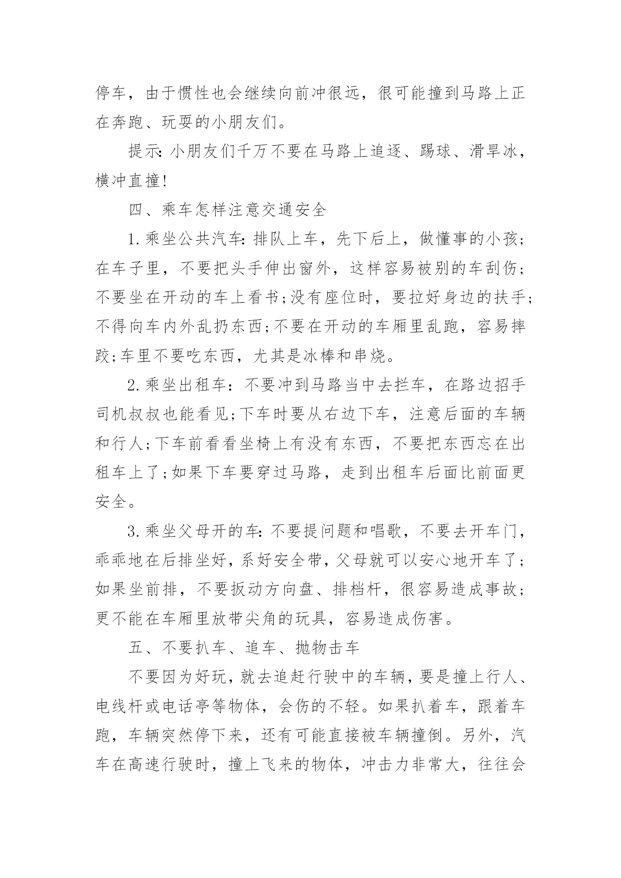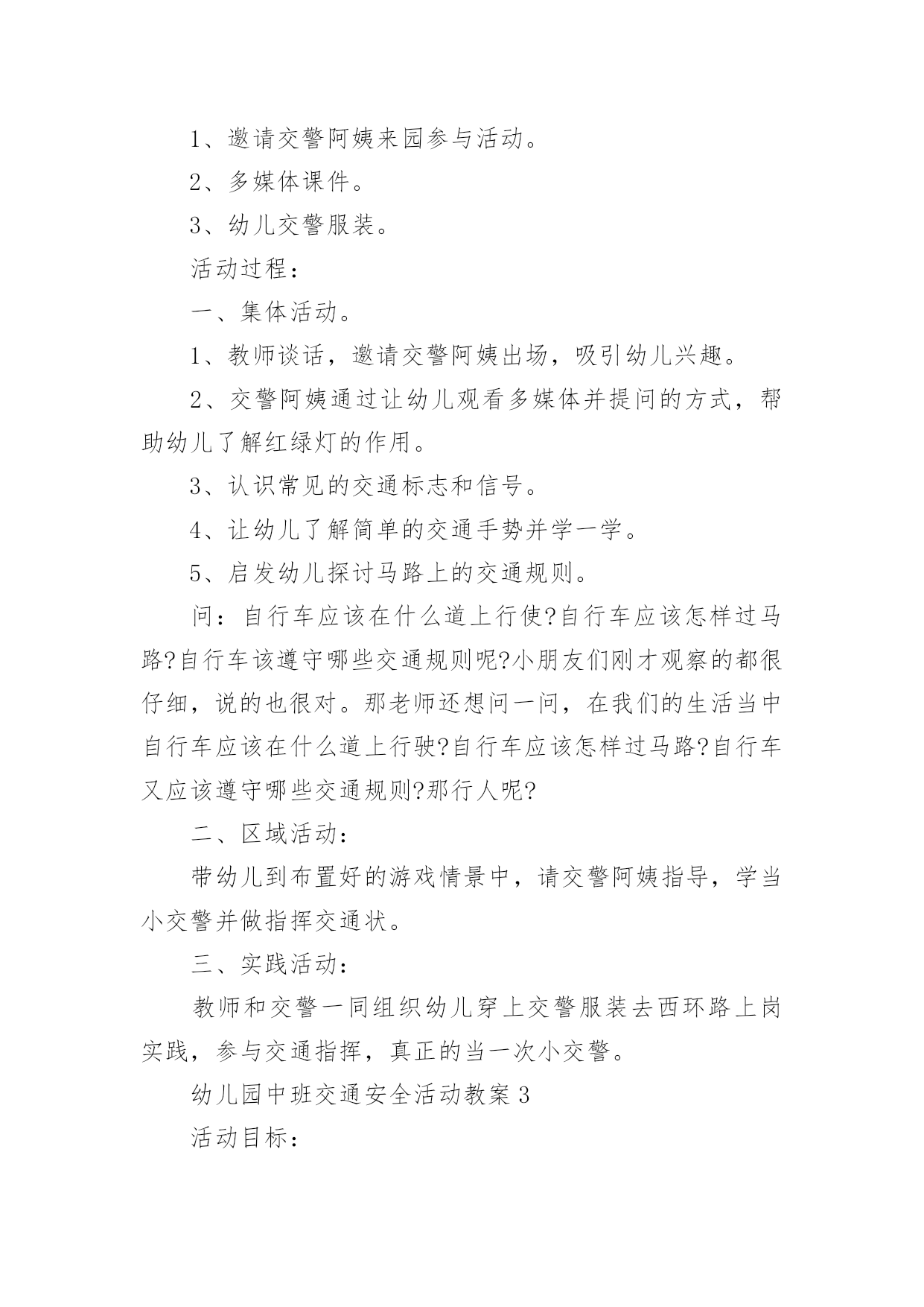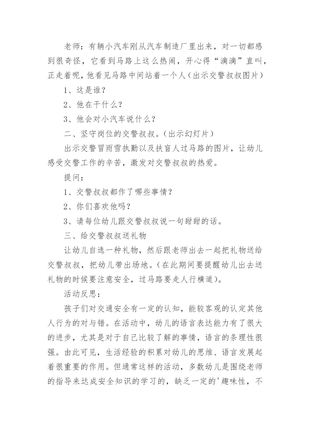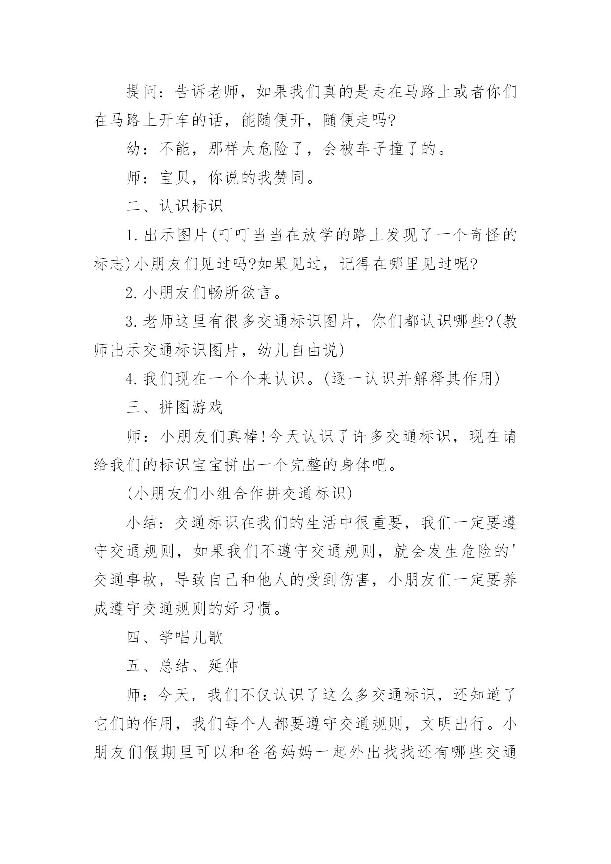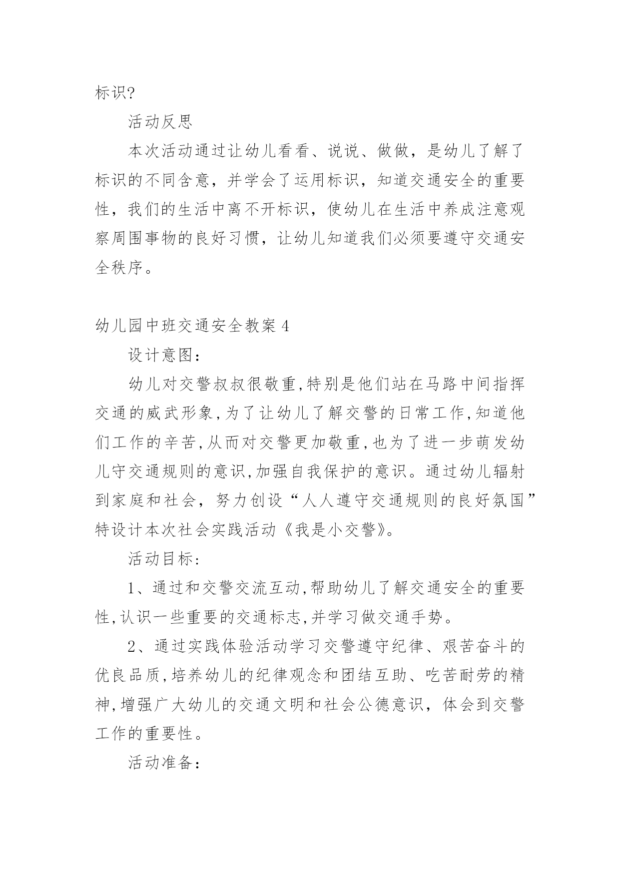 幼儿园中班交通安全教案幼儿园中班交通安全教案(15篇)作为一位不辞辛劳的人民教师,通常需要用到教案来辅助教学,教案是教学蓝图,可以有效提高教学效率。那么什么样的教案才是好的呢?下面是小编精心整理的幼儿园中班交通安全教案,希望能够帮助到大家。幼儿园中班交通安全教案1活动目标:1、使幼儿知道交警叔叔工作很辛苦,很重要,教育幼儿要热爱他们。2、让幼儿初步了解红绿灯和人行横道的作用,能根据信号做动作,听从红绿灯的指挥,教育他们不要在马路上乱跑,提醒幼儿注意安全。3、培养幼儿自我保护能力。4、培养幼儿动脑思考问题、解决问题的能力。5、能积极参加游戏活动,并学会自我保护。活动准备:1、交警叔叔的图片一张。2、孩子们以前做的手工礼物。3、准备交警帽子一顶。活动过程:一、以刚出厂的小汽车请求帮助引出课题。老师:有辆小汽车刚从汽车制造厂里出来,对一切都感到很奇怪,它看到马路上这么热闹,开心得“滴滴”直叫,正走着呢,他看见马路中间站着一个人(出示交警叔叔图片)1、这是谁?2、他在干什么?3、他会对小汽车说什么?二、坚守岗位的交警叔叔。(出示幻灯片)出示交警冒雨雪执勤以及扶盲人过马路的图片,让幼儿感受交警工作的辛苦,激发对交警叔叔的热爱。提问:1、交警叔叔都作了哪些事情?2、你们喜欢他吗?3、请每位幼儿跟交警叔叔说一句甜甜的话。三、给交警叔叔送礼物让幼儿自选一种礼物,然后跟老师出去一起把礼物送给交警叔叔,把幼儿带出场地。(在此期间要提醒幼儿出去送礼物的时候要注意安全,过马路要走人行横道)。活动反思:孩子们对交通安全有一定的认知,能较客观的认定其他人行为的对与错。在活动中,幼儿的语言表达能力有了很大的进步,尤其是对于自己比较了解的事情,语言的条理性很强。由此可见,生活经验的积累对幼儿的思维、语言发展起着很重要的作用。但通常这样的活动,多数幼儿是围绕老师的指导来达成安全知识的学习的,缺乏一定的'趣味性,不利于幼儿主动性和参与性的发挥。因此,在此活动中加入了情境表演的环节,使原本比较枯燥的数学活动因为融入了孩子比较熟悉并且比较感兴趣的内容,而显得格外有趣。在情景表演中,孩子们都表现得很认真和投入,孩子们的积极性也被极大的调动了起来。由此可见,教师在设计活动的时候,要把孩子的兴趣因素更多地考虑进去,牢记“兴趣是幼儿学习的动力”这一观点。在以后的活动中,教师应该多尝试使用这种活动形式,引发幼儿的讨论。幼儿园中班交通安全教案2设计意图:中班年龄阶段的幼儿,具有活泼好动、好奇、模仿力强等特点,是最容易引发交通事故的群体。虽然他们出去一般都有成人监护,但稍有不慎,就会严重影响幼儿的身心健康甚至酿成悲剧,独自穿越马路,独自活动的机会增多了。通过此次活动,让幼儿了解交通信号灯及安全标志与人们生活的密切关系。初步养成自觉遵守交通规则的意识,提高自我安全防护能力。活动目标:1、认识信号等标识了解基本的交通规则。2、在游戏活动中体验交通规则的重要性,养成自觉遵守交通规则的意识,提高自我安全防护能力。3、初步培养幼儿的安全意识,提高自我保护能力。4、考验小朋友们的反应能力,锻炼他们的.个人能力。活动准备:1、PPT《交通安全伴我行》活动过程:一、展开联想,揭示活动主题1、出示PPT:你会走路吗?走路,谁不会呢?其实,如果我们不注意交通安全随意的行走,走路就会闯祸哦。小朋友们在上幼儿园、回家的路上、节假日外出时走在人来车往的交通繁忙的道路上,要遵守交通规则,增强自我保护意识。让我们一起来看看有哪些交通安全小知识呢!一、行走时要注意交通安全1.外出行走时,要在人行道内行走,如果没有人行道的,要靠边行走。2.马路上车辆密集,我们不能穿越、攀爬、倚坐道口护拦。二、横穿马路应该注意什么横穿马路,可能遇到的危险因素会大大增加,应特别注意安全。1.穿越马路,要听从交通民警的指挥;要遵守交通规则,做到“绿灯行,红灯停”。2.穿越马路,要走人行横道线;在有过街天桥和过街地道的路段,应自觉走过街天桥和地下通道。三、不要把马路当游乐场我们经常见到一些小朋友在马路上相互追赶着玩,这样做很危险!因为马路上来来往往的汽车速度很快,就算立即停车,由于惯性也会继续向前冲很远,很可能撞到马路上正在奔跑、玩耍的小朋友们。提示:小朋友们千万不要在马路上追逐、踢球、滑旱冰,横冲直撞!四、乘车怎样注意交通安全1.乘坐公共汽车:排队上车,先下后上,做懂事的小孩;在车子里,不要把头手伸出窗外,这样容易被别的车刮伤;不要坐在开动的车上看书;没有座位时,要拉好身边的扶手;不得向车内外乱扔东西;不要在开动的车厢里乱跑,容易摔跤;车里不要吃东西,尤其是冰棒和串烧。2.乘坐出租车:不要冲到马路当中去拦车,在路边招手司机叔叔也能看见;下车时要从右边下车,注意后面的车辆和行人;下车前看看坐椅上有没有东西,不要把东西忘在出租车上了;