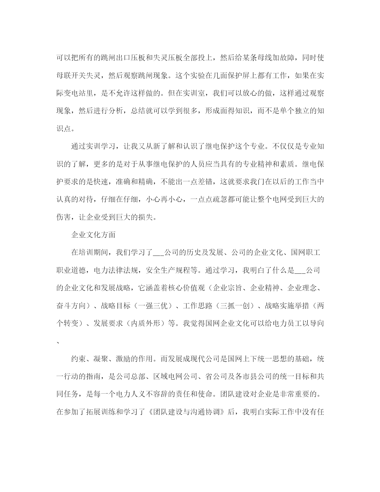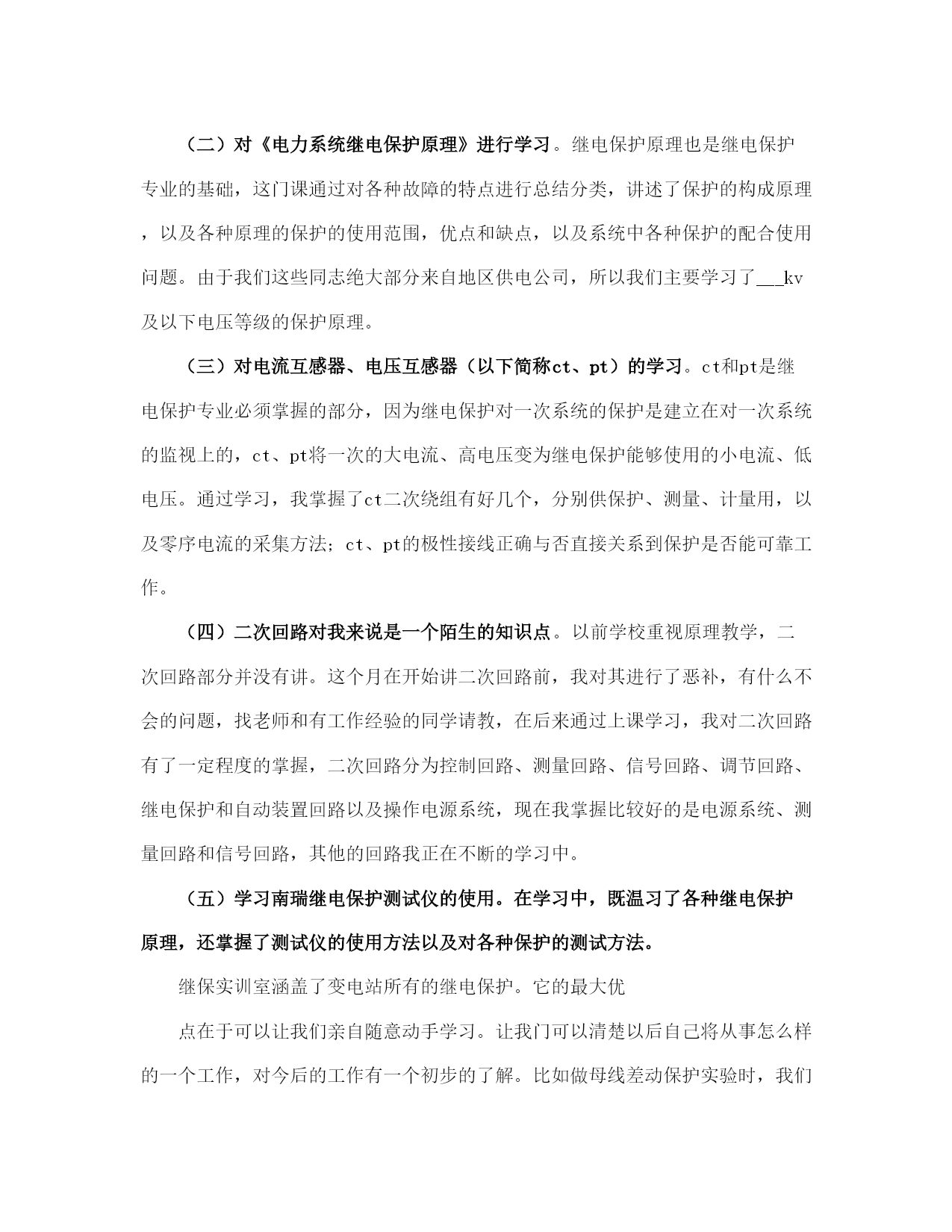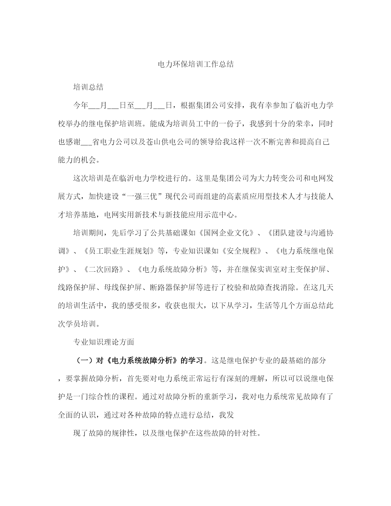 电力环保培训工作总结(完整版)文档资料可直接使用,可编辑,欢迎下载电力环保培训工作总结培训总结今年___月___日至___月___日,根据集团公司安排,我有幸参加了临沂电力学校举办的继电保护培训班。能成为培训员工中的一份子,我感到十分的荣幸,同时也感谢___省电力公司以及苍山供电公司的领导给我这样一次不断完善和提高自己能力的机会。这次培训是在临沂电力学校进行的。这里是集团公司为大力转变公司和电网发展方式,加快建设“一强三优”现代公司而组建的高素质应用型技术人才与技能人才培养基地,电网实用新技术与新技能应用示范中心。培训期间,先后学习了公共基础课如《国网企业文化》、《团队建设与沟通协调》、《员工职业生涯规划》等,专业知识课如《安全规程》、《电力系统继电保护》、《二次回路》、《电力系统故障分析》等,并在继保实训室对主变保护屏、线路保护屏、母线保护屏、断路器保护屏等进行了校验和故障查找消除。在这几天的培训生活中,我的感受很多,收获也很大,以下从学习,生活等几个方面总结此次学员培训。专业知识理论方面(一)对《电力系统故障分析》的学习。这是继电保护专业的最基础的部分,要掌握故障分析,首先要对电力系统正常运行有深刻的理解,所以可以说继电保护是一门综合性的课程。通过对故障分析的重新学习,我对电力系统常见故障有了全面的认识,通过对各种故障的特点进行总结,我发现了故障的规律性,以及继电保护在这些故障的针对性。(二)对《电力系统继电保护原理》进行学习。继电保护原理也是继电保护专业的基础,这门课通过对各种故障的特点进行总结分类,讲述了保护的构成原理,以及各种原理的保护的使用范围,优点和缺点,以及系统中各种保护的配合使用问题。由于我们这些同志绝大部分来自地区供电公司,所以我们主要学习了___kv及以下电压等级的保护原理。(三)对电流互感器、电压互感器(以下简称ct、pt)的学习。ct和pt是继电保护专业必须掌握的部分,因为继电保护对一次系统的保护是建立在对一次系统的监视上的,ct、pt将一次的大电流、高电压变为继电保护能够使用的小电流、低电压。通过学习,我掌握了ct二次绕组有好几个,分别供保护、测量、计量用,以及零序电流的采集方法;ct、pt的极性接线正确与否直接关系到保护是否能可靠工作。(四)二次回路对我来说是一个陌生的知识点。以前学校重视原理教学,二次回路部分并没有讲。这个月在开始讲二次回路前,我对其进行了恶补,有什么不会的问题,找老师和有工作经验的同学请教,在后来通过上课学习,我对二次回路有了一定程度的掌握,二次回路分为控制回路、测量回路、信号回路、调节回路、继电保护和自动装置回路以及操作电源系统,现在我掌握比较好的是电源系统、测量回路和信号回路,其他的回路我正在不断的学习中。(五)学习南瑞继电保护测试仪的使用。在学习中,既温习了各种继电保护原理,还掌握了测试仪的使用方法以及对各种保护的测试方法。继保实训室涵盖了变电站所有的继电保护。它的最大优点在于可以让我们亲自随意动手学习。让我门可以清楚以后自己将从事怎么样的一个工作,对今后的工作有一个初步的了解。比如做母线差动保护实验时,我们可以把所有的跳闸出口压板和失灵压板全部投上,然后给某条母线加故障,同时使母联开关失灵,然后观察跳闸现象。这个实验在几面保护屏上都有工作,如果在实际变电站里,是不允许这样做的。但在实训室,我们可以放心的做,这样通过观察现象,然后进行分析,总结就可以学到很多,形成面得知识,而不是单个独立的知识点。通过实训学习,让我又从新了解和认识了继电保护这个专业。不仅仅是专业知识的了解,更多的是对于从事继电保护的人员应当具有的专业精神和素质。继电保护要求的是快速,准确和精确,不能出一点差错,这就要求我门在以后的工作当中认真的对待,仔细在仔细,小心再小心,一点点疏忽都可能让整个电网受到巨大的伤害,让企业受到巨大的损失。企业文化方面在培训期间,我们学习了___公司的历史及发展、公司的企业文化、国网职工职业道德,电力法律法规,安全生产规程等。通过学习,我明白了什么是___公司的企业文化和发展战略,它涵盖着核心价值观(企业宗旨、企业精神、企业理念、奋斗方向)、战略目标(一强三优)、工作思路(三抓一创)、战略实施举措(两个转变)、发展要求(内质外形)等。我觉得国网企业文化可以给电力员工以导向、约束、凝聚、激励的作用。而发展成现代公司是国网上下统一思想的基础,统一行动的指南,是公司总部、区域电网公司、省公司及各市县公司的统一目标和共同任务,是每一个电力人义不容辞的责任和使命。团队建设对企业是非常重要的。在参加了拓展训练和学习了《团队建设与沟通协调》后,我明白实际工作中没有任何一项工作是个人能够独立完成的,大家要通过良好的沟通协调配合,激发工作的积极性,提高工作
