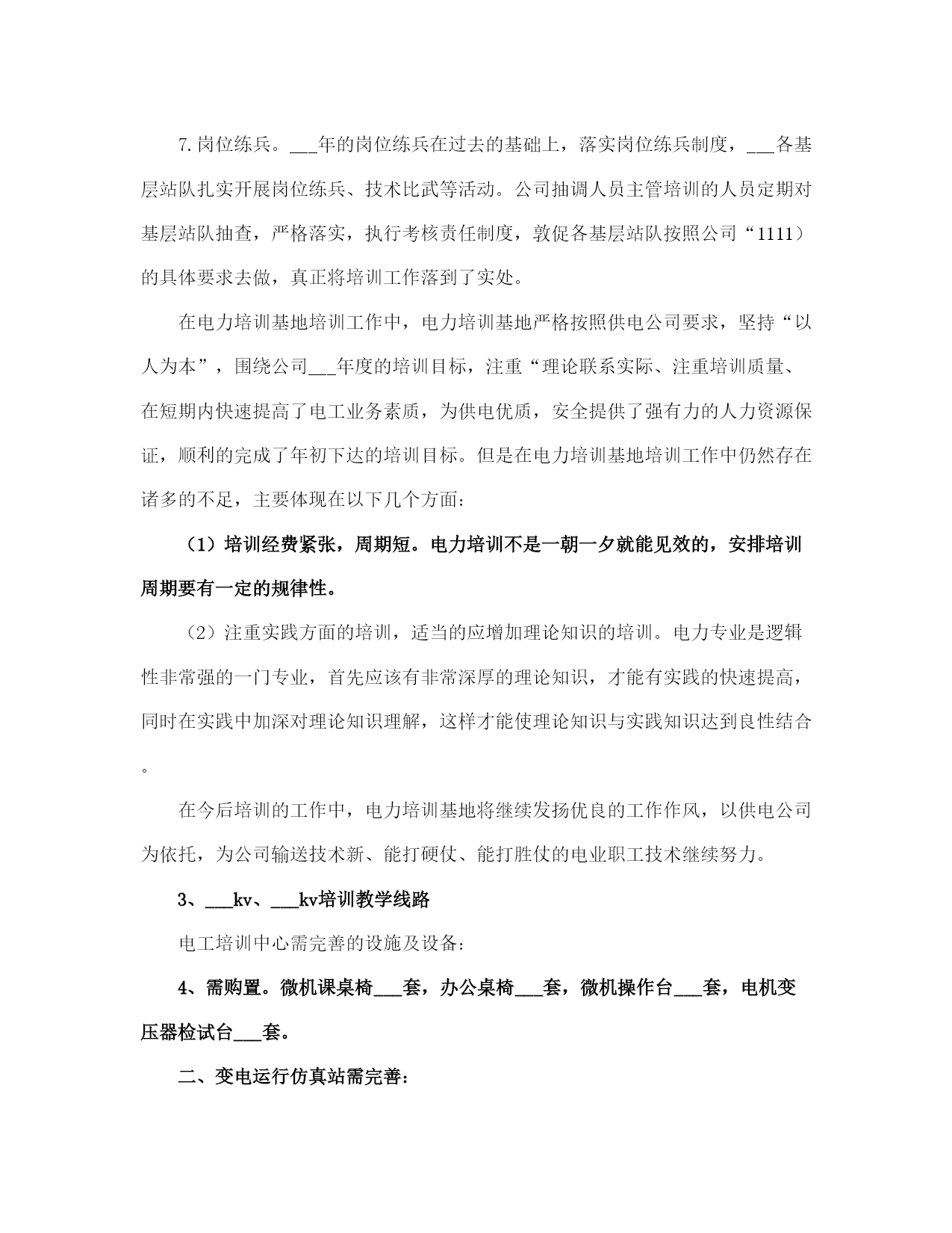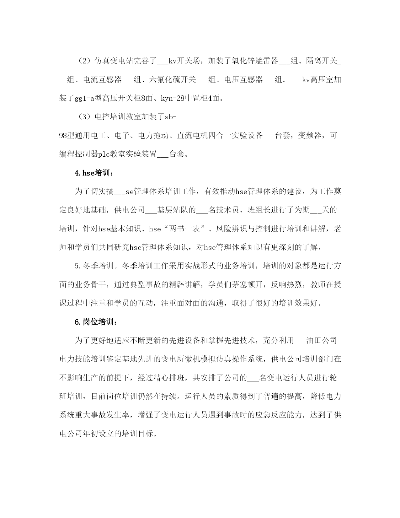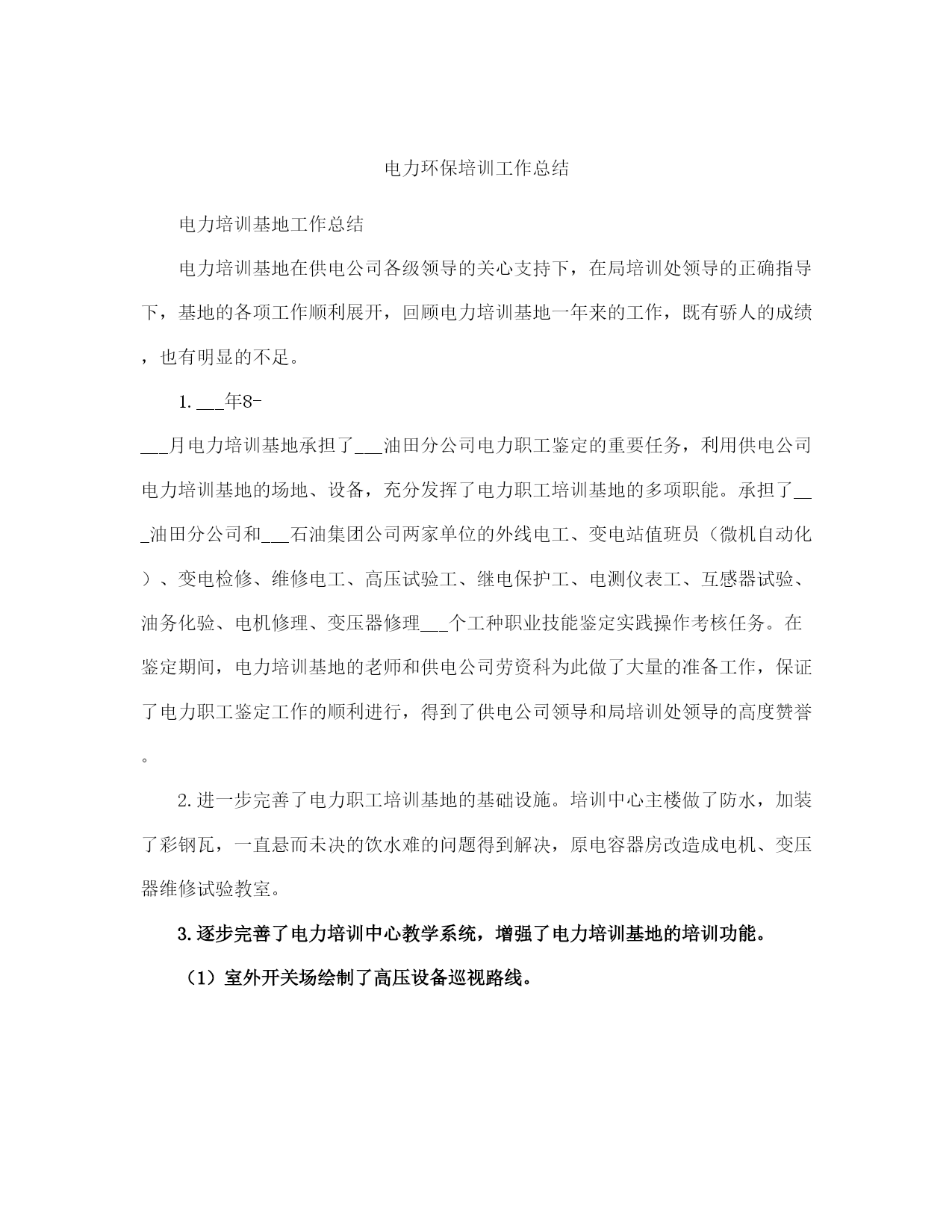 电力环保培训工作总结(完整版)文档资料可直接使用,可编辑,欢迎下载电力环保培训工作总结培训总结今年___月___日至___月___日,根据集团公司安排,我有幸参加了临沂电力学校举办的继电保护培训班。能成为培训员工中的一份子,我感到十分的荣幸,同时也感谢___省电力公司以及苍山供电公司的领导给我这样一次不断完善和提高自己能力的机会。这次培训是在临沂电力学校进行的。这里是集团公司为大力转变公司和电网发展方式,加快建设“一强三优”现代公司而组建的高素质应用型技术人才与技能人才培养基地,电网实用新技术与新技能应用示范中心。培训期间,先后学习了公共基础课如《国网企业文化》、《团队建设与沟通协调》、《员工职业生涯规划》等,专业知识课如《安全规程》、《电力系统继电保护》、《二次回路》、《电力系统故障分析》等,并在继保实训室对主变保护屏、线路保护屏、母线保护屏、断路器保护屏等进行了校验和故障查找消除。在这几天的培训生活中,我的感受很多,收获也很大,以下从学习,生活等几个方面总结此次学员培训。专业知识理论方面(一)对《电力系统故障分析》的学习。这是继电保护专业的最基础的部分,要掌握故障分析,首先要对电力系统正常运行有深刻的理解,所以可以说继电保护是一门综合性的课程。通过对故障分析的重新学习,我对电力系统常见故障有了全面的认识,通过对各种故障的特点进行总结,我发现了故障的规律性,以及继电保护在这些故障的针对性。(二)对《电力系统继电保护原理》进行学习。继电保护原理也是继电保护专业的基础,这门课通过对各种故障的特点进行总结分类,讲述了保护的构成原理,以及各种原理的保护的使用范围,优点和缺点,以及系统中各种保护的配合使用问题。由于我们这些同志绝大部分来自地区供电公司,所以我们主要学习了___kv及以下电压等级的保护原理。(三)对电流互感器、电压互感器(以下简称ct、pt)的学习。ct和pt是继电保护专业必须掌握的部分,因为继电保护对一次系统的保护是建立在对一次系统的监视上的,ct、pt将一次的大电流、高电压变为继电保护能够使用的小电流、低电压。通过学习,我掌握了ct二次绕组有好几个,分别供保护、测量、计量用,以及零序电流的采集方法;ct、pt的极性接线正确与否直接关系到保护是否能可靠工作。(四)二次回路对我来说是一个陌生的知识点。以前学校重视原理教学,二次回路部分并没有讲。这个月在开始讲二次回路前,我对其进行了恶补,有什么不会的问题,找老师和有工作经验的同学请教,在后来通过上课学习,我对二次回路有了一定程度的掌握,二次回路分为控制回路、测量回路、信号回路、调节回路、继电保护和自动装置回路以及操作电源系统,现在我掌握比较好的是电源系统、测量回路和信号回路,其他的回路我正在不断的学习中。(五)学习南瑞继电保护测试仪的使用。在学习中,既温习了各种继电保护原理,还掌握了测试仪的使用方法以及对各种保护的测试方法。继保实训室涵盖了变电站所有的继电保护。它的最大优点在于可以让我们亲自随意动手学习。让我门可以清楚以后自己将从事怎么样的一个工作,对今后的工作有一个初步的了解。比如做母线差动保护实验时,我们可以把所有的跳闸出口压板和失灵压板全部投上,然后给某条母线加故障,同时使母联开关失灵,然后观察跳闸现象。这个实验在几面保护屏上都有工作,如果在实际变电站里,是不允许这样做的。但在实训室,我们可以放心的做,这样通过观察现象,然后进行分析,总结就可以学到很多,形成面得知识,而不是单个独立的知识点。通过实训学习,让我又从新了解和认识了继电保护这个专业。不仅仅是专业知识的了解,更多的是对于从事继电保护的人员应当具有的专业精神和素质。继电保护要求的是快速,准确和精确,不能出一点差错,这就要求我门在以后的工作当中认真的对待,仔细在仔细,小心再小心,一点点疏忽都可能让整个电网受到巨大的伤害,让企业受到巨大的损失。企业文化方面在培训期间,我们学习了___公司的历史及发展、公司的企业文化、国网职工职业道德,电力法律法规,安全生产规程等。通过学习,我明白了什么是___公司的企业文化和发展战略,它涵盖着核心价值观(企业宗旨、企业精神、企业理念、奋斗方向)、战略目标(一强三优)、工作思路(三抓一创)、战略实施举措(两个转变)、发展要求(内质外形)等。我觉得国网企业文化可以给电力员工以导向、约束、凝聚、激励的作用。而发展成现代公司是国网上下统一思想的基础,统一行动的指南,是公司总部、区域电网公司、省公司及各市县公司的统一目标和共同任务,是每一个电力人义不容辞的责任和使命。团队建设对企业是非常重要的。在参加了拓展训练和学习了《团队建设与沟通协调》后,我明白实际工作中没有任何一项工作是个人能够独立完成的,大家要通过良好的沟通协调配合,激发工作的积极性,提高工作