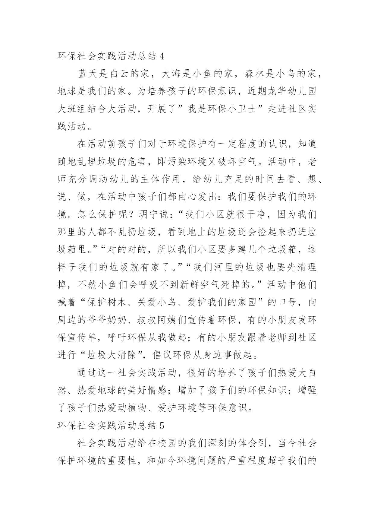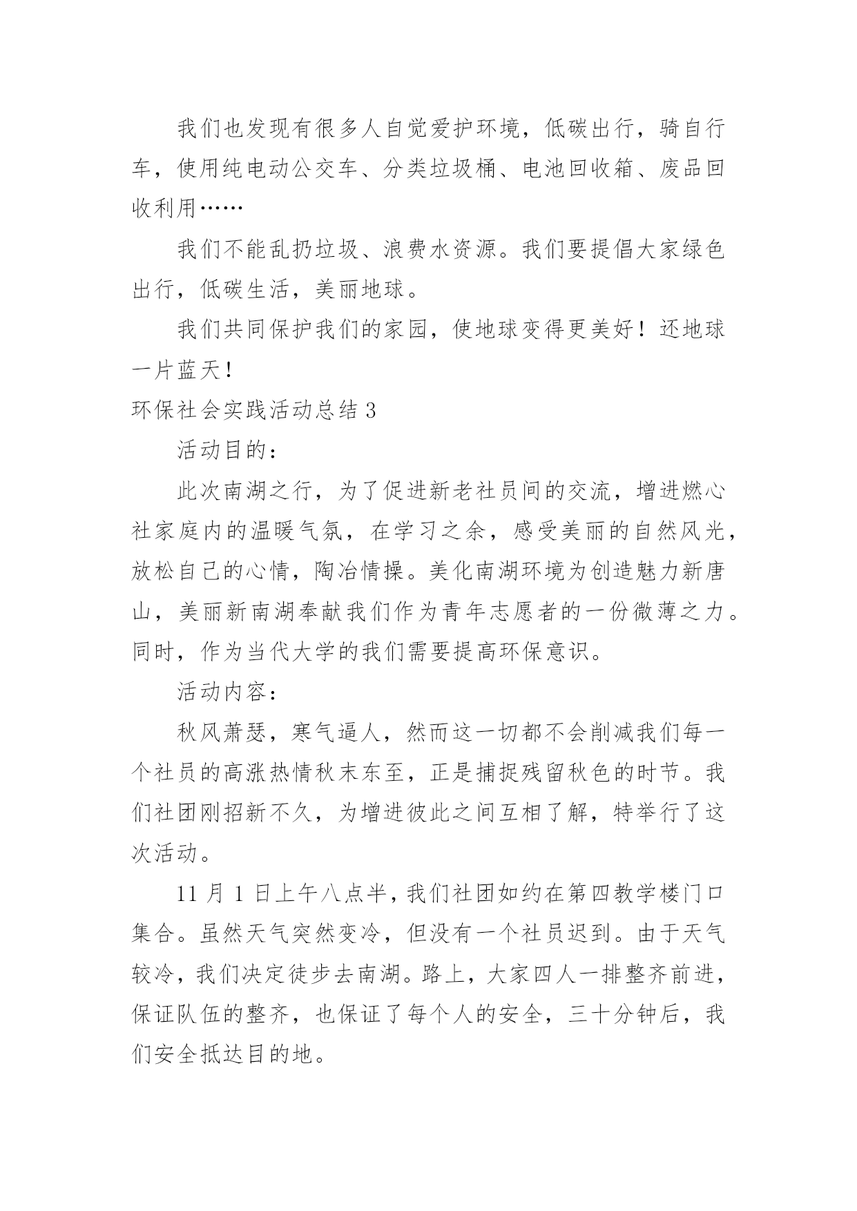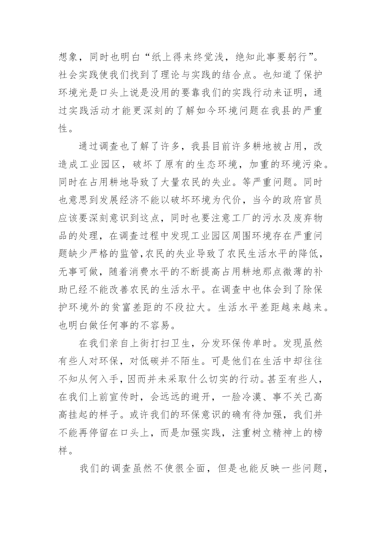 环保社会实践活动总结环保社会实践活动总结总结就是把一个时段的学习、工作或其完成情况进行一次全面系统的总结,它是增长才干的一种好办法,快快来写一份总结吧。总结怎么写才是正确的呢?下面是小编整理的环保社会实践活动总结,欢迎阅读,希望大家能够喜欢。环保社会实践活动总结1为了进一步贯彻落实生态德育实施纲要,深入开展创建全国绿色学校的活动,12月16日、23日两天时间,我校部分学生利用休息时间深入社区、工厂企业、政府机关、农村田间进行绿色环保宣传调查活动。参加此次活动的是学校“绿色环保志愿者”成员。全体志愿者分成十六个小分队,第一至第六小分队分赴董兴花园、刘家新村、等,他们到小区分发自己制作的环保宣传传单,出环保专题黑板报,打扫卫生,清除乱张贴,给居民提供家居和社区环保的小窍门,他们的行动得到了社区居民的积极配合和交口称赞。第七至九小分队到杨庙村、官庄村、薛家村进行环保活动,村里领导专门接待了他们,向他们介绍村里的排污治污以及新农村建设的情况,队员们还在村里发放环保传单、到村民家中宣传环保知识,他们的环保活动得到村领导和村民的充分肯定。第十至十二小分队到石材批发市场、生物电厂、木材加工厂等九家企业,他们对企业的生产、环保状况作了详细的了解,并提出了一些合理的建议,企业老总对中学学生热心环保宣传、积极参加环境保护的活动非常欣赏。第十三小分队到镇环保局了解董集镇环保的现状;第十四至十六小分队来到了马路小摊前,向经营者宣传卫生、环保知识,许多经营者听了很感动,表示一定要讲卫生、保护环境,使嘉善更美。这次绿色环保宣传调查活动,不仅开拓了学生的视野,增强了学生的才干,提升学生的社会实践能力,也增强了社会各界的环保意识。有理由相信本次活动将为嘉善的绿色环保事业起到积极的推进作用。环保社会实践活动总结2前几天我看到妈妈手机里的对比照片,北京的楼被淹没在黄尘中。这个星期六下午,我和方淇乐、张奕安相约一起去发现生活中的环保现象,进行环保实践活动。我们沿着爱榕路观察,发现乱扔垃圾的情况特别严重。花丛中、树下……都可以看到垃圾的影子。满地的垃圾就像给华丽的衣裳沾上了污渍。人们常说“水是生命之源”,可浪费水的情况也不少见。四海公园旁边,有一个水龙头未关上,坏掉的水管在不停地喷出水,不停流淌的水就像地球在不停地流着眼泪。人们喜欢用一次性的东西,如:泡沫饭盒、一次性筷子……这非常不环保,因为要砍伐树木。一株生长二十年的大树,仅能制成六千至八千双筷子,我国每年生产一次性筷子一千万箱,那要破坏多少森林呀!我们也发现有很多人自觉爱护环境,低碳出行,骑自行车,使用纯电动公交车、分类垃圾桶、电池回收箱、废品回收利用……我们不能乱扔垃圾、浪费水资源。我们要提倡大家绿色出行,低碳生活,美丽地球。我们共同保护我们的家园,使地球变得更美好!还地球一片蓝天!环保社会实践活动总结3活动目的:此次南湖之行,为了促进新老社员间的交流,增进燃心社家庭内的温暖气氛,在学习之余,感受美丽的自然风光,放松自己的心情,陶冶情操。美化南湖环境为创造魅力新唐山,美丽新南湖奉献我们作为青年志愿者的一份微薄之力。同时,作为当代大学的我们需要提高环保意识。活动内容:秋风萧瑟,寒气逼人,然而这一切都不会削减我们每一个社员的高涨热情秋末东至,正是捕捉残留秋色的时节。我们社团刚招新不久,为增进彼此之间互相了解,特举行了这次活动。11月1日上午八点半,我们社团如约在第四教学楼门口集合。虽然天气突然变冷,但没有一个社员迟到。由于天气较冷,我们决定徒步去南湖。路上,大家四人一排整齐前进,保证队伍的整齐,也保证了每个人的安全,三十分钟后,我们安全抵达目的地。大家迅速分好组。每组四个垃圾袋,开始绕南湖缓缓而行,沿途环保。我们在做环保的同时,有说有笑,不时的关心一下社友或被社友关心。虽然天公不作美,非常冷,温暖一直洋溢在大家之间。尤其是学姐们特别关心新社员,把手套分给大家带,很快大家打破了年级和专业的界限,热情的谈论着,彼此之间熟悉了,并从谈话中,了解了各自家乡的风土人情,各自的专业课,交流了大学生活的感受……天气的骤冷,不久天空飘起了雪花,尽管有些雪花,丝毫没有让南湖降价,反而增添了几分诗意。20xx年的第一场雪,也带动了大家的更高兴致。这一天也是我们新加入社员张晓星的生日,我们集体为她唱起了生日歌。转眼到了十一点,我们在大南湖拍照留念,单人的,多人的,各专业的,各小组的。还有我们的全家福。在暮秋的南湖,留下了我们环保的足迹,也留下了我们美好的回忆,也带回了深深的友谊,暖暖的关心。此次美化南湖的行动,让我们享受到了自然无私的馈赠和唐山的魅力。不禁感叹:世上最美的东西却是免费的。清新的空气,灿烂的风光……爱是相互的,我们感激自然的恩宠。如此,我们要珍惜自然的赐予,呵护美好的环境。同样,人与人之间的关怀也是相互的。对身边的每