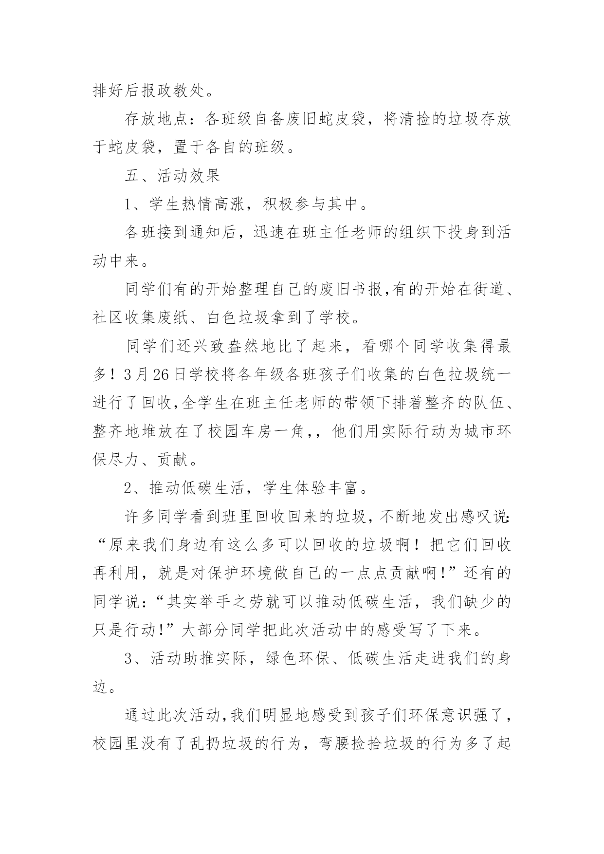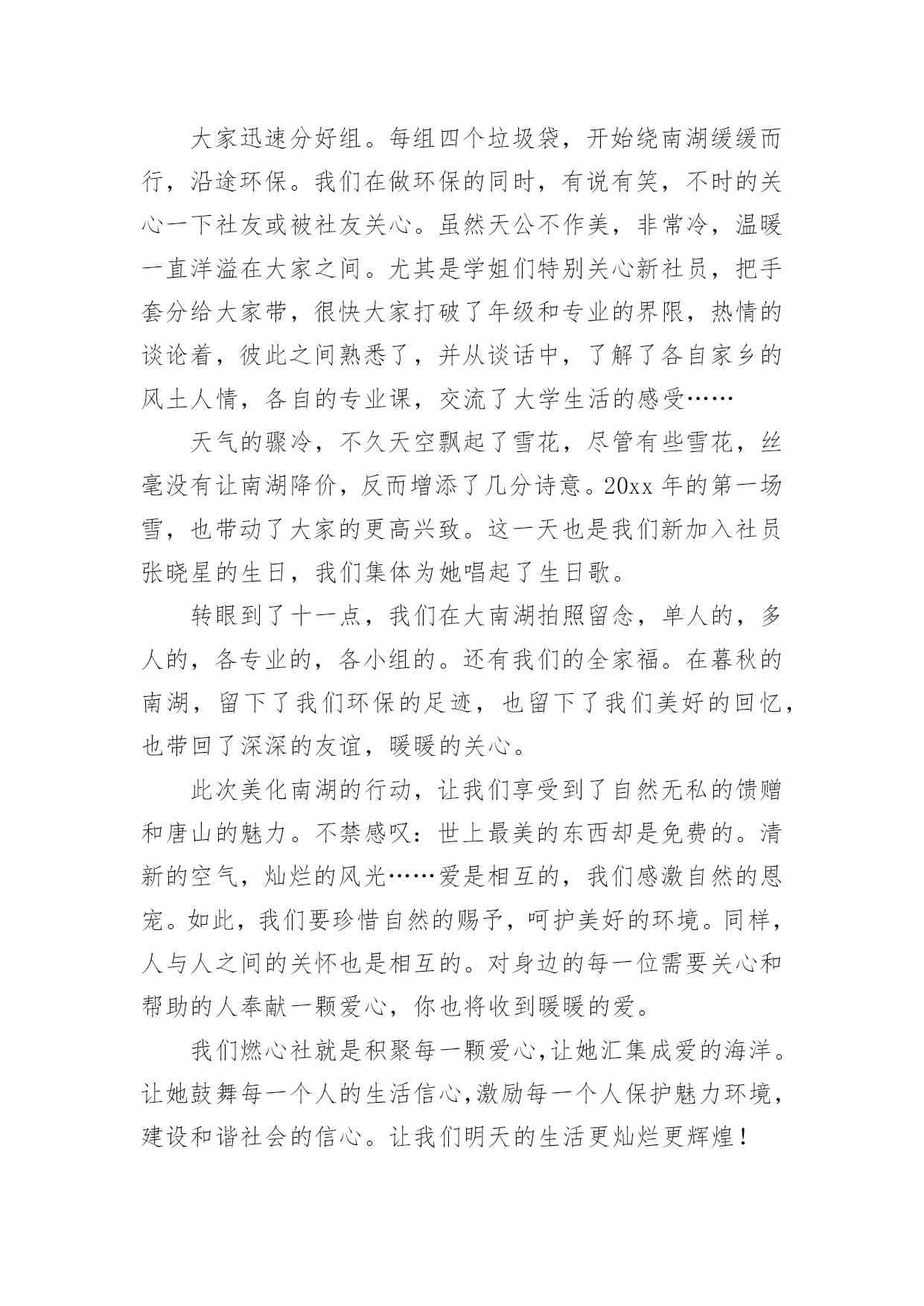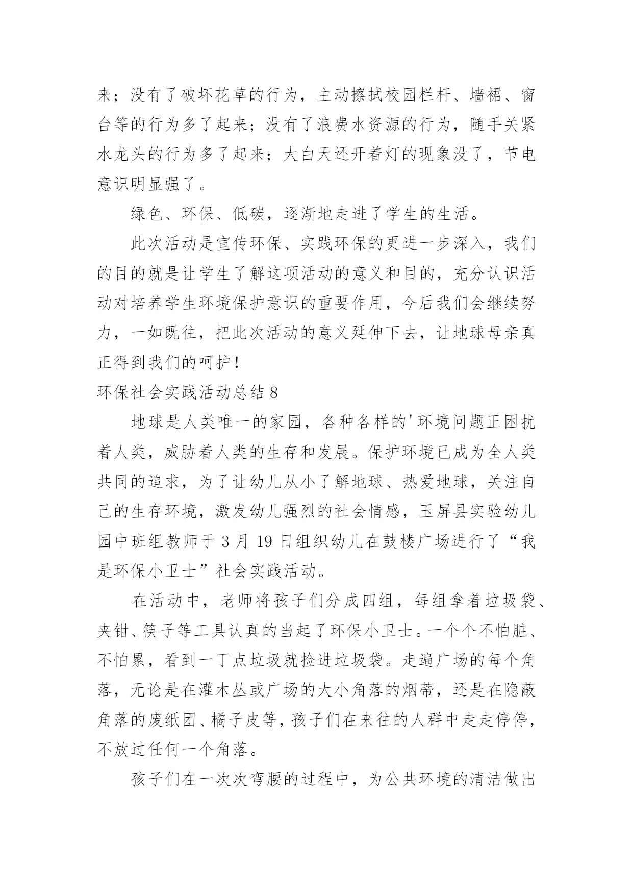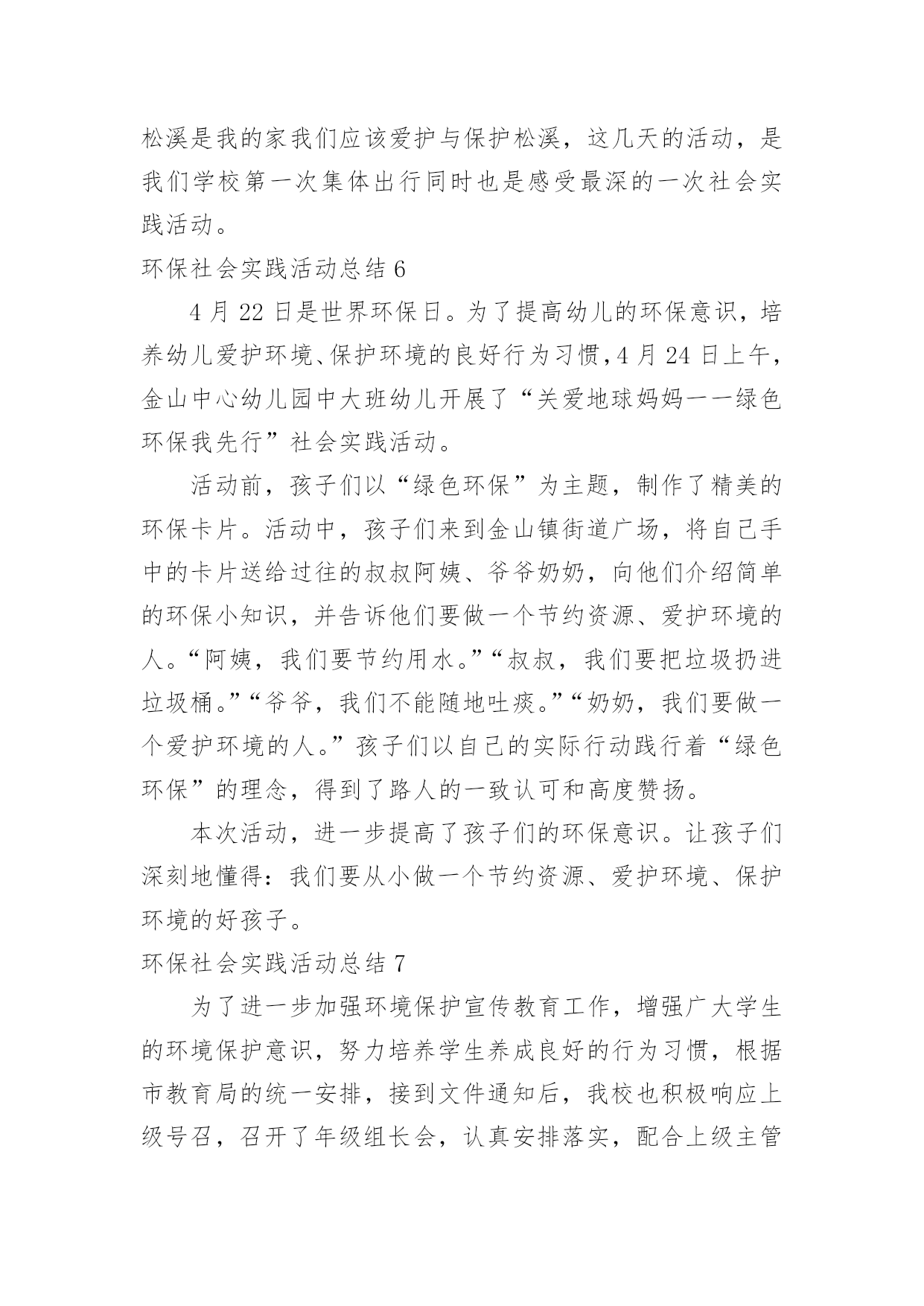 环保社会实践活动总结环保社会实践活动总结总结就是把一个时段的学习、工作或其完成情况进行一次全面系统的总结,它是增长才干的一种好办法,快快来写一份总结吧。总结怎么写才是正确的呢?下面是小编整理的环保社会实践活动总结,欢迎阅读,希望大家能够喜欢。环保社会实践活动总结1为了进一步贯彻落实生态德育实施纲要,深入开展创建全国绿色学校的活动,12月16日、23日两天时间,我校部分学生利用休息时间深入社区、工厂企业、政府机关、农村田间进行绿色环保宣传调查活动。参加此次活动的是学校“绿色环保志愿者”成员。全体志愿者分成十六个小分队,第一至第六小分队分赴董兴花园、刘家新村、等,他们到小区分发自己制作的环保宣传传单,出环保专题黑板报,打扫卫生,清除乱张贴,给居民提供家居和社区环保的小窍门,他们的行动得到了社区居民的积极配合和交口称赞。第七至九小分队到杨庙村、官庄村、薛家村进行环保活动,村里领导专门接待了他们,向他们介绍村里的排污治污以及新农村建设的情况,队员们还在村里发放环保传单、到村民家中宣传环保知识,他们的环保活动得到村领导和村民的充分肯定。第十至十二小分队到石材批发市场、生物电厂、木材加工厂等九家企业,他们对企业的生产、环保状况作了详细的了解,并提出了一些合理的建议,企业老总对中学学生热心环保宣传、积极参加环境保护的活动非常欣赏。第十三小分队到镇环保局了解董集镇环保的现状;第十四至十六小分队来到了马路小摊前,向经营者宣传卫生、环保知识,许多经营者听了很感动,表示一定要讲卫生、保护环境,使嘉善更美。这次绿色环保宣传调查活动,不仅开拓了学生的视野,增强了学生的才干,提升学生的社会实践能力,也增强了社会各界的环保意识。有理由相信本次活动将为嘉善的绿色环保事业起到积极的推进作用。环保社会实践活动总结2前几天我看到妈妈手机里的对比照片,北京的楼被淹没在黄尘中。这个星期六下午,我和方淇乐、张奕安相约一起去发现生活中的环保现象,进行环保实践活动。我们沿着爱榕路观察,发现乱扔垃圾的情况特别严重。花丛中、树下……都可以看到垃圾的影子。满地的垃圾就像给华丽的衣裳沾上了污渍。人们常说“水是生命之源”,可浪费水的情况也不少见。四海公园旁边,有一个水龙头未关上,坏掉的水管在不停地喷出水,不停流淌的水就像地球在不停地流着眼泪。人们喜欢用一次性的东西,如:泡沫饭盒、一次性筷子……这非常不环保,因为要砍伐树木。一株生长二十年的大树,仅能制成六千至八千双筷子,我国每年生产一次性筷子一千万箱,那要破坏多少森林呀!我们也发现有很多人自觉爱护环境,低碳出行,骑自行车,使用纯电动公交车、分类垃圾桶、电池回收箱、废品回收利用……我们不能乱扔垃圾、浪费水资源。我们要提倡大家绿色出行,低碳生活,美丽地球。我们共同保护我们的家园,使地球变得更美好!还地球一片蓝天!环保社会实践活动总结3活动目的:此次南湖之行,为了促进新老社员间的交流,增进燃心社家庭内的温暖气氛,在学习之余,感受美丽的自然风光,放松自己的心情,陶冶情操。美化南湖环境为创造魅力新唐山,美丽新南湖奉献我们作为青年志愿者的一份微薄之力。同时,作为当代大学的我们需要提高环保意识。活动内容:秋风萧瑟,寒气逼人,然而这一切都不会削减我们每一个社员的高涨热情秋末东至,正是捕捉残留秋色的时节。我们社团刚招新不久,为增进彼此之间互相了解,特举行了这次活动。11月1日上午八点半,我们社团如约在第四教学楼门口集合。虽然天气突然变冷,但没有一个社员迟到。由于天气较冷,我们决定徒步去南湖。路上,大家四人一排整齐前进,保证队伍的整齐,也保证了每个人的安全,三十分钟后,我们安全抵达目的地。大家迅速分好组。每组四个垃圾袋,开始绕南湖缓缓而行,沿途环保。我们在做环保的同时,有说有笑,不时的关心一下社友或被社友关心。虽然天公不作美,非常冷,温暖一直洋溢在大家之间。尤其是学姐们特别关心新社员,把手套分给大家带,很快大家打破了年级和专业的界限,热情的谈论着,彼此之间熟悉了,并从谈话中,了解了各自家乡的风土人情,各自的专业课,交流了大学生活的感受……天气的骤冷,不久天空飘起了雪花,尽管有些雪花,丝毫没有让南湖降价,反而增添了几分诗意。20xx年的第一场雪,也带动了大家的更高兴致。这一天也是我们新加入社员张晓星的生日,我们集体为她唱起了生日歌。转眼到了十一点,我们在大南湖拍照留念,单人的,多人的,各专业的,各小组的。还有我们的全家福。在暮秋的南湖,留下了我们环保的足迹,也留下了我们美好的回忆,也带回了深深的友谊,暖暖的关心。此次美化南湖的行动,让我们享受到了自然无私的馈赠和唐山的魅力。不禁感叹:世上最美的东西却是免费的。清新的空气,灿烂的风光……爱是相互的,我们感激自然的恩宠。如此,我们要珍惜自然的赐予,呵护美好的环境。同样,人与人之间的关怀也是相互的。对身边的每