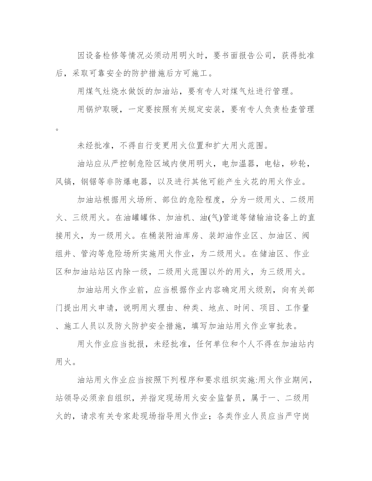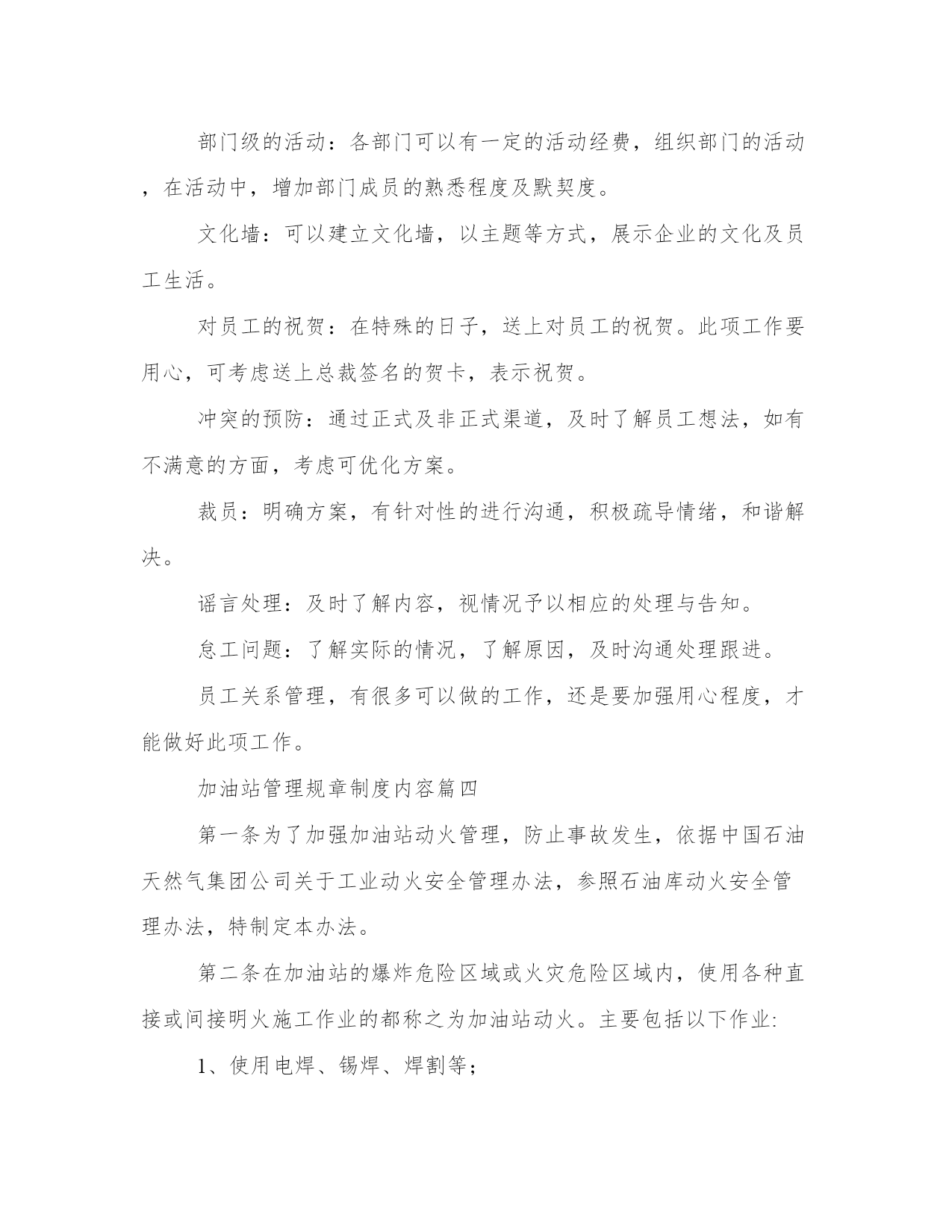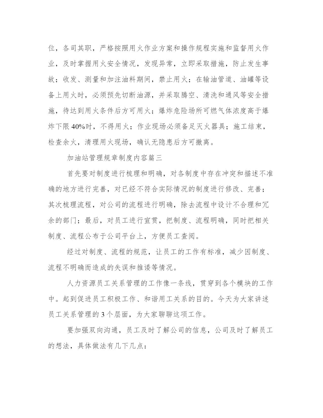 最新加油站管理规章制度内容(七篇)无论是身处学校还是步入社会,大家都尝试过写作吧,借助写作也可以提高我们的语言组织能力。范文书写有哪些要求呢?我们怎样才能写好一篇范文呢?接下来小编就给大家介绍一下优秀的范文该怎么写,我们一起来看一看吧。加油站管理规章制度内容篇一2、各种设备要建立完整的技术档案和维修管理制度。3、本站职工要认真遵守安全操作规程和岗位责任制。4、加油站站长除日常例行检查外,每月要对加油站进行一次全面检查。对检查出来的问题制定整改措施,能解决的要迅速解决,困难要如实向上级书面报告。5、用户进站加油严禁携带一切危险品入站。6、高强闪电、雷击和雷击频繁时,停止加油。7、严禁任何一级电压的架空线路跨越加油站上空。8、加油站内不得随意拉接临时电线,接班加油员检查加油设备技术状况,发生危及加油站安全的情况时,应立即停止。9、加油机发生故障和加油发生跑、冒、洒油料时,必须清理完现场后,加油车辆方能离去。加油站管理规章制度内容篇二上岗人员不准随携带火柴、打火机、香烟等物品。因设备检修等情况必须动用明火时,要书面报告公司,获得批准后,采取可靠安全的防护措施后方可施工。用煤气灶烧水做饭的加油站,要有专人对煤气灶进行管理。用锅炉取暖,一定要按照有关规定安装,要有专人负责检查管理。未经批准,不得自行变更用火位置和扩大用火范围。油站应从严控制危险区域内使用明火,电加温器,电钻,砂轮,风镐,钢锯等非防爆电器,以及进行其他可能产生火花的用火作业。加油站根据用火场所、部位的危险程度,分为一级用火、二级用火、三级用火。在油罐罐体、加油机、油(气)管道等储输油设备上的直接用火,为一级用火。在桶装附油库房、装卸油作业区、加油区、阀组井、管沟等危险场所实施用火作业,为二级用火。在储油区、作业区和加油站站区内除一级,二级用火范围以外的用火,为三级用火。加油站用火作业前,应当根据作业内容确定用火级别,向有关部门提出用火申请,说明用火理由、种类、地点、时间、项目、工作量、施工人员以及防火防护安全措施,填写加油站用火作业审批表。用火作业应当批报,未经批准,任何单位和个人不得在加油站内用火。油站用火作业应当按照下列程序和要求组织实施:用火作业期间,站领导必须亲自组织,并指定现场用火安全监督员,属于一、二级用火的,请求有关专家赴现场指导用火作业;各类作业人员应当严守岗位,各司其职,严格按照用火作业方案和操作规程实施和监督用火作业,及时掌握用火安全情况,发现异常,立即采取措施,防止发生事故;收发、测量和加注油料期间,禁止用火;在输油管道、油罐等设备上用火时,必须预先切断油源,并采取腾空、清洗和通风等安全措施,待达到用火条件后方可用火;爆炸危险场所可燃气体浓度高于爆炸下限40%时,不得用火;作业现场必须备足灭火器具;施工结束,检查余火,清理用火现场,确认无隐患后方可撤离。加油站管理规章制度内容篇三首先要对制度进行梳理和明确,对各制度中存在冲突和描述不准确的地方进行完善,对已经不符合实际情况的制度进行修改、完善;其次梳理流程,对公司的流程进行明确,除去流程中设计不合理和冗余的部门;最后,对员工进行宣贯,把制度、流程明确,同时把相关制度、流程公布于公司平台上,方便员工查阅。经过对制度、流程的规范,让员工的工作有标准,减少因制度、流程不明确而造成的失误和推诿等情况。人力资源员工关系管理的工作像一条线,贯穿到各个模块的工作中。起到促进员工积极工作、和谐用工关系的目的。今天为大家讲述员工关系管理的3个层面,为大家聊聊这项工作。要加强双向沟通,员工及时了解公司的信息,公司及时了解员工的想法,具体做法有几下几点:建立公开信箱:可以由员工及时将问题与建议发送至此公开信箱,公开信箱可由专人负责管理,及时了解员工的问题与建议,对有必要的问题,及时进行解决;加强重点时间段的沟通:入职当天:沟通企业基本情况、开启入职引导;入职2周:沟通入职适应情况;入职3个月:了解实际工作情况、团队融入情况;入职2年:沟通发展情况;绩效沟通:针对绩效情况进行沟通和辅导;离职:沟通离职原因等;岗位变动:沟通新岗位适应情况并提供帮助。建立非正式的沟通渠道并进行持续完善:建立以hr和部门管理人员为主的非正式沟通渠道,及时了解员工信息,并提供相应的支持和帮助。提供专业沟通:给予对员工职业生涯发展、心理咨询方面的专业沟通。心理咨询沟通可以与心理咨询机构进行合作,优化员工心理健康状态。满意度调研:可以进行满意度调研,在调研的过程中,发现可以改进的问题,并进行改进。增加员工的满意度及组织认同感。组织公司级的活动:组织公司级的活动,调动大家的参与性,在参与活动的过程中,增进沟通了解,增强团队的默契。此活动要有亮点、引爆点,让员工有参与的积极性,可根据在职员工