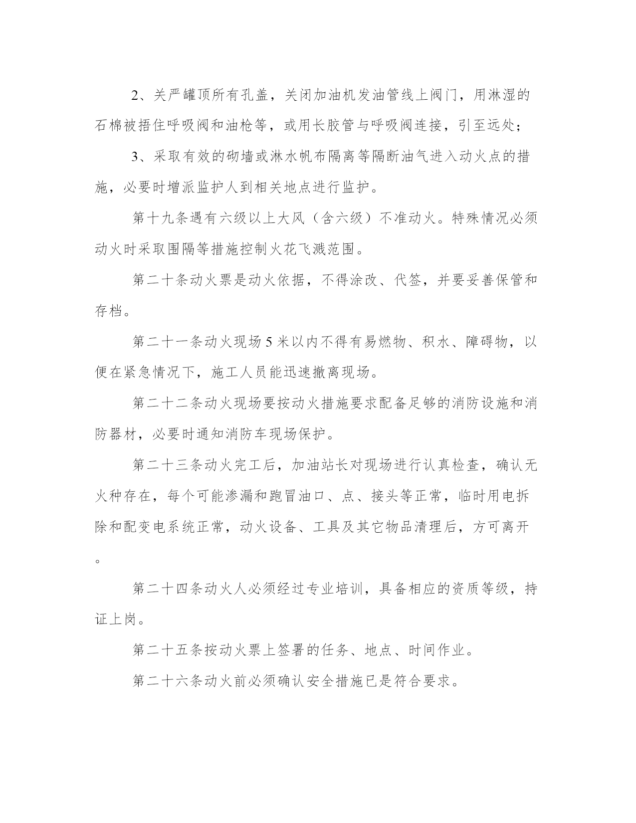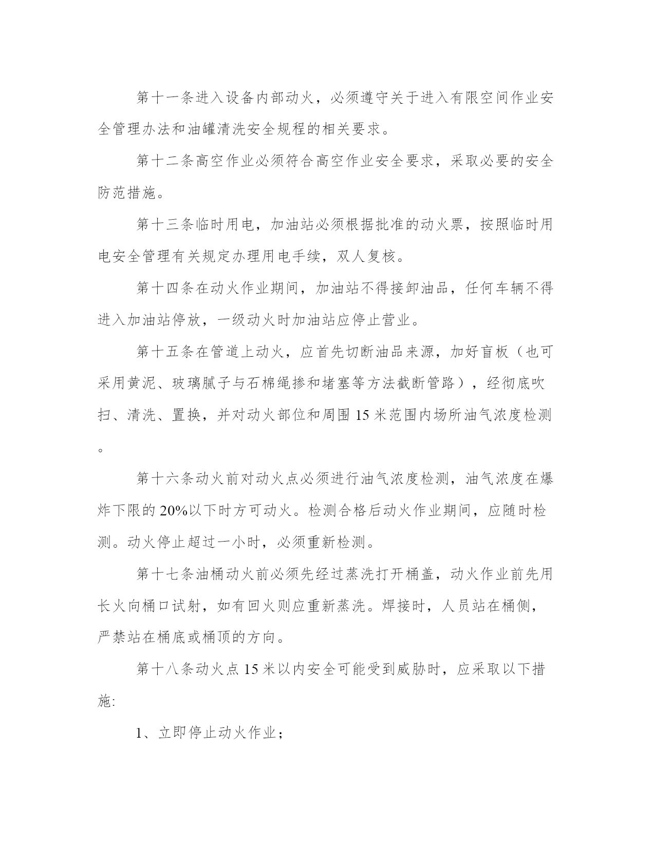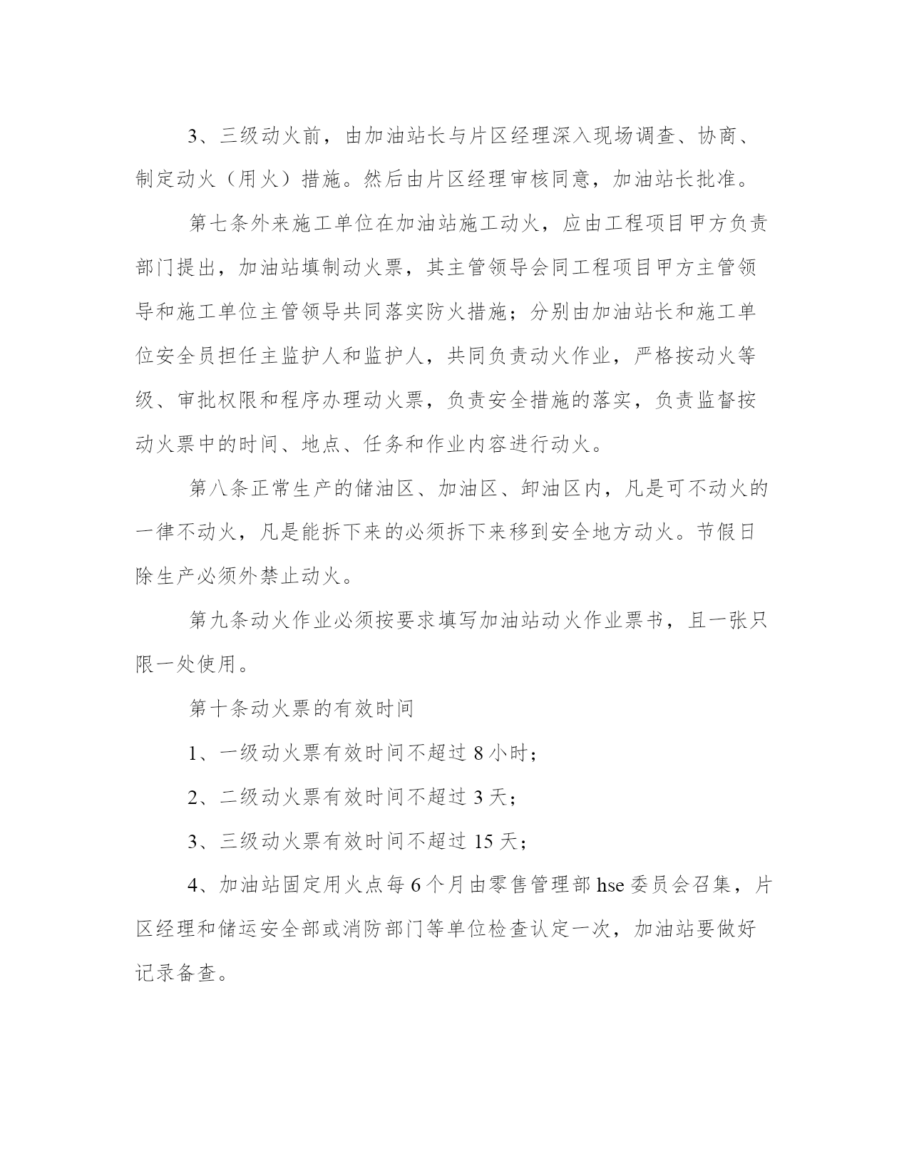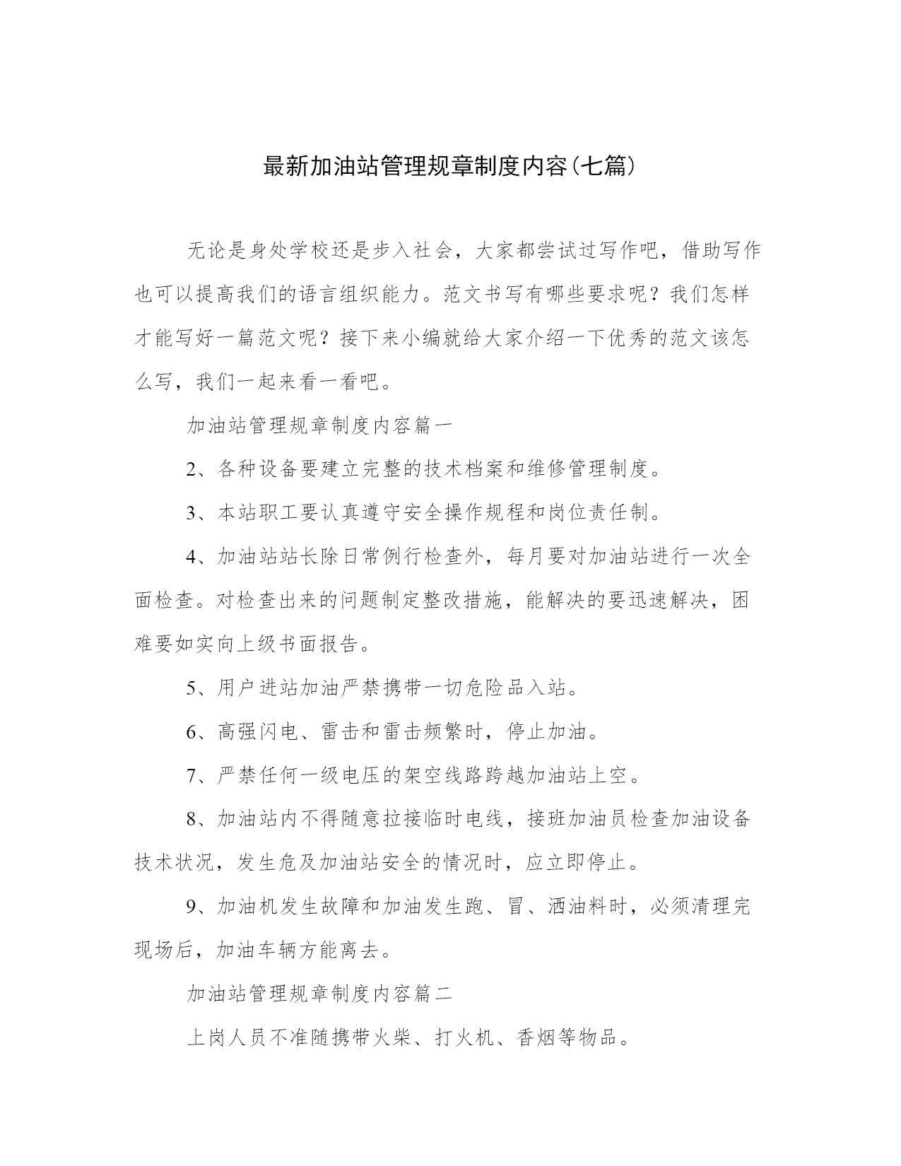 最新加油站管理规章制度内容(七篇)无论是身处学校还是步入社会,大家都尝试过写作吧,借助写作也可以提高我们的语言组织能力。范文书写有哪些要求呢?我们怎样才能写好一篇范文呢?接下来小编就给大家介绍一下优秀的范文该怎么写,我们一起来看一看吧。加油站管理规章制度内容篇一2、各种设备要建立完整的技术档案和维修管理制度。3、本站职工要认真遵守安全操作规程和岗位责任制。4、加油站站长除日常例行检查外,每月要对加油站进行一次全面检查。对检查出来的问题制定整改措施,能解决的要迅速解决,困难要如实向上级书面报告。5、用户进站加油严禁携带一切危险品入站。6、高强闪电、雷击和雷击频繁时,停止加油。7、严禁任何一级电压的架空线路跨越加油站上空。8、加油站内不得随意拉接临时电线,接班加油员检查加油设备技术状况,发生危及加油站安全的情况时,应立即停止。9、加油机发生故障和加油发生跑、冒、洒油料时,必须清理完现场后,加油车辆方能离去。加油站管理规章制度内容篇二上岗人员不准随携带火柴、打火机、香烟等物品。因设备检修等情况必须动用明火时,要书面报告公司,获得批准后,采取可靠安全的防护措施后方可施工。用煤气灶烧水做饭的加油站,要有专人对煤气灶进行管理。用锅炉取暖,一定要按照有关规定安装,要有专人负责检查管理。未经批准,不得自行变更用火位置和扩大用火范围。油站应从严控制危险区域内使用明火,电加温器,电钻,砂轮,风镐,钢锯等非防爆电器,以及进行其他可能产生火花的用火作业。加油站根据用火场所、部位的危险程度,分为一级用火、二级用火、三级用火。在油罐罐体、加油机、油(气)管道等储输油设备上的直接用火,为一级用火。在桶装附油库房、装卸油作业区、加油区、阀组井、管沟等危险场所实施用火作业,为二级用火。在储油区、作业区和加油站站区内除一级,二级用火范围以外的用火,为三级用火。加油站用火作业前,应当根据作业内容确定用火级别,向有关部门提出用火申请,说明用火理由、种类、地点、时间、项目、工作量、施工人员以及防火防护安全措施,填写加油站用火作业审批表。用火作业应当批报,未经批准,任何单位和个人不得在加油站内用火。油站用火作业应当按照下列程序和要求组织实施:用火作业期间,站领导必须亲自组织,并指定现场用火安全监督员,属于一、二级用火的,请求有关专家赴现场指导用火作业;各类作业人员应当严守岗位,各司其职,严格按照用火作业方案和操作规程实施和监督用火作业,及时掌握用火安全情况,发现异常,立即采取措施,防止发生事故;收发、测量和加注油料期间,禁止用火;在输油管道、油罐等设备上用火时,必须预先切断油源,并采取腾空、清洗和通风等安全措施,待达到用火条件后方可用火;爆炸危险场所可燃气体浓度高于爆炸下限40%时,不得用火;作业现场必须备足灭火器具;施工结束,检查余火,清理用火现场,确认无隐患后方可撤离。加油站管理规章制度内容篇三首先要对制度进行梳理和明确,对各制度中存在冲突和描述不准确的地方进行完善,对已经不符合实际情况的制度进行修改、完善;其次梳理流程,对公司的流程进行明确,除去流程中设计不合理和冗余的部门;最后,对员工进行宣贯,把制度、流程明确,同时把相关制度、流程公布于公司平台上,方便员工查阅。经过对制度、流程的规范,让员工的工作有标准,减少因制度、流程不明确而造成的失误和推诿等情况。人力资源员工关系管理的工作像一条线,贯穿到各个模块的工作中。起到促进员工积极工作、和谐用工关系的目的。今天为大家讲述员工关系管理的3个层面,为大家聊聊这项工作。要加强双向沟通,员工及时了解公司的信息,公司及时了解员工的想法,具体做法有几下几点:建立公开信箱:可以由员工及时将问题与建议发送至此公开信箱,公开信箱可由专人负责管理,及时了解员工的问题与建议,对有必要的问题,及时进行解决;加强重点时间段的沟通:入职当天:沟通企业基本情况、开启入职引导;入职2周:沟通入职适应情况;入职3个月:了解实际工作情况、团队融入情况;入职2年:沟通发展情况;绩效沟通:针对绩效情况进行沟通和辅导;离职:沟通离职原因等;岗位变动:沟通新岗位适应情况并提供帮助。建立非正式的沟通渠道并进行持续完善:建立以hr和部门管理人员为主的非正式沟通渠道,及时了解员工信息,并提供相应的支持和帮助。提供专业沟通:给予对员工职业生涯发展、心理咨询方面的专业沟通。心理咨询沟通可以与心理咨询机构进行合作,优化员工心理健康状态。满意度调研:可以进行满意度调研,在调研的过程中,发现可以改进的问题,并进行改进。增加员工的满意度及组织认同感。组织公司级的活动:组织公司级的活动,调动大家的参与性,在参与活动的过程中,增进沟通了解,增强团队的默契。此活动要有亮点、引爆点,让员工有参与的积极性,可根据在职员工
