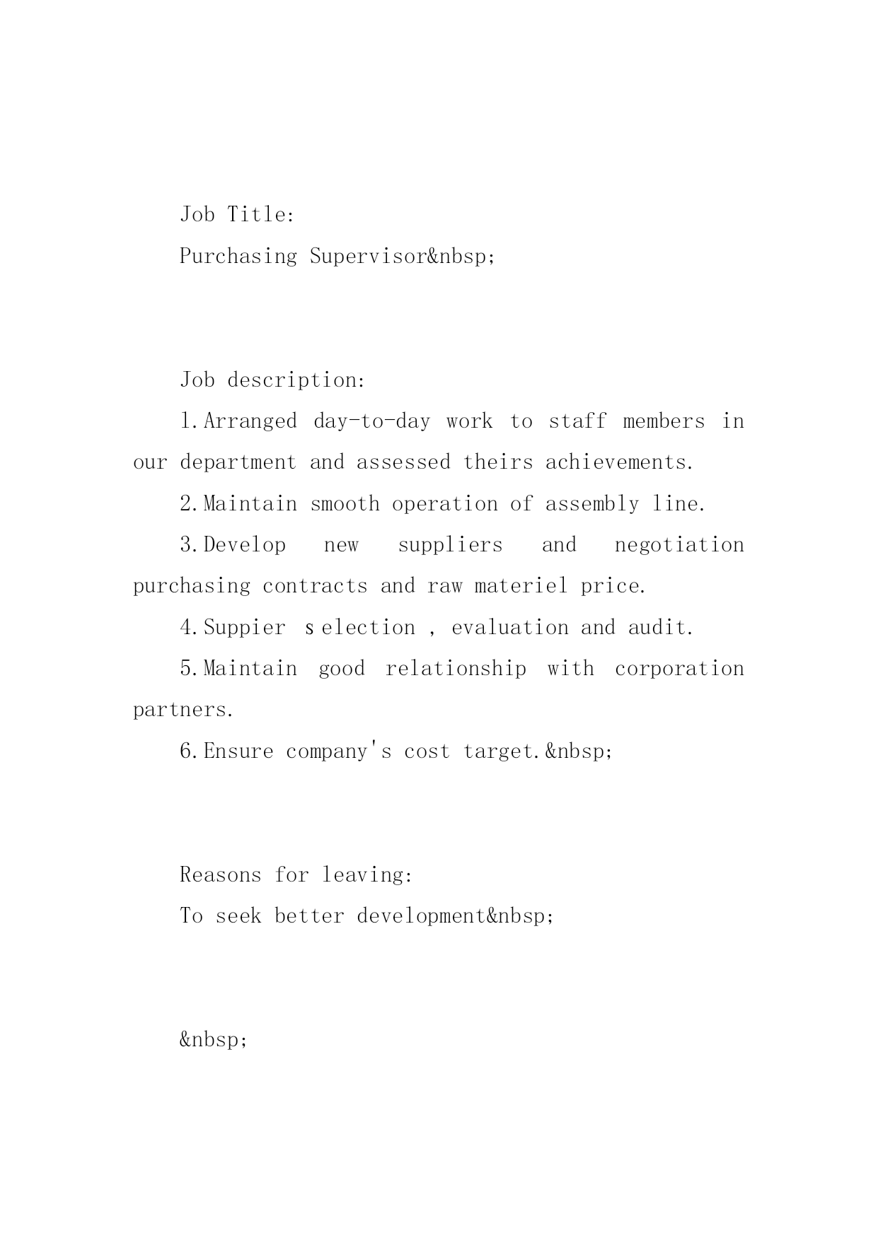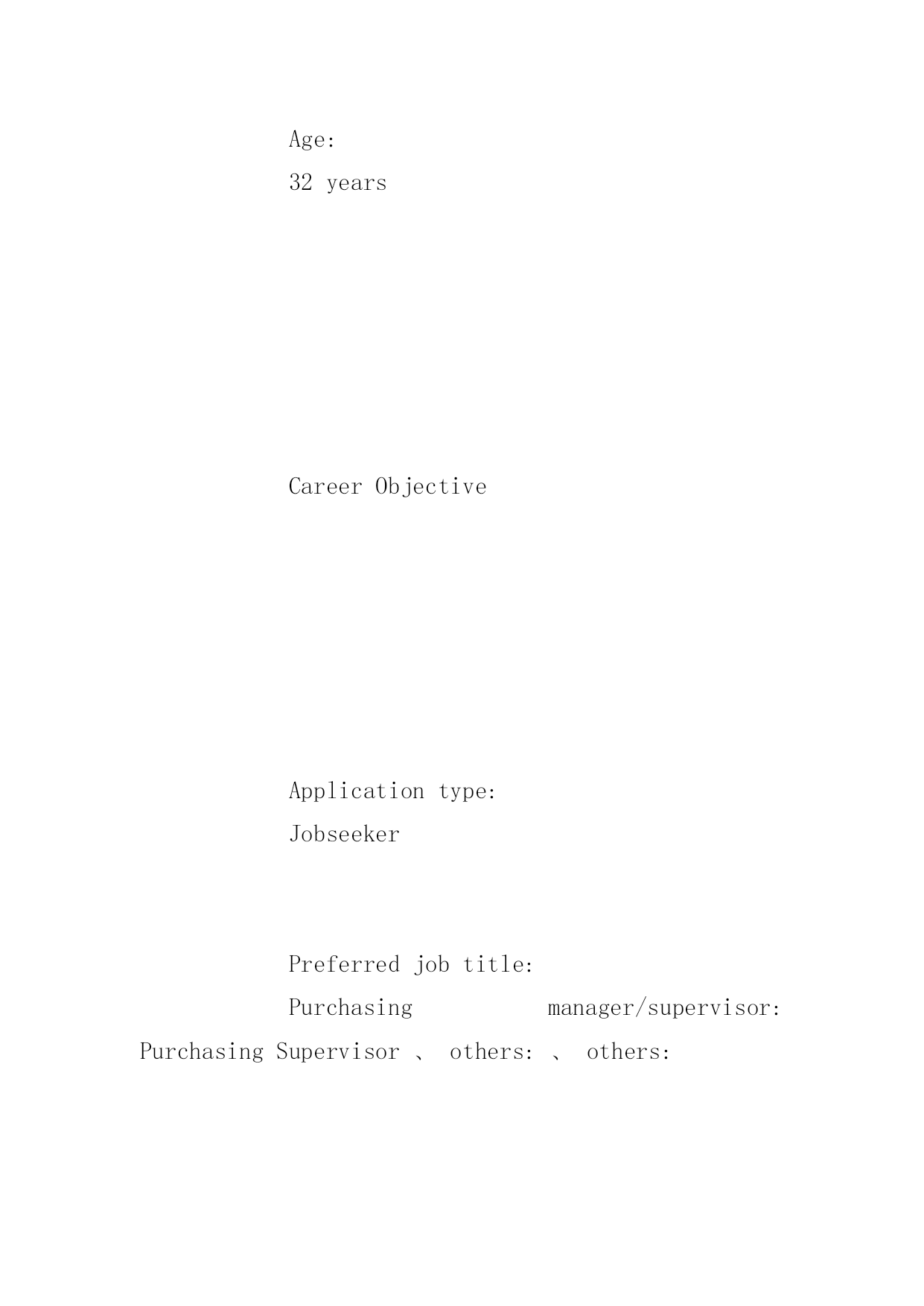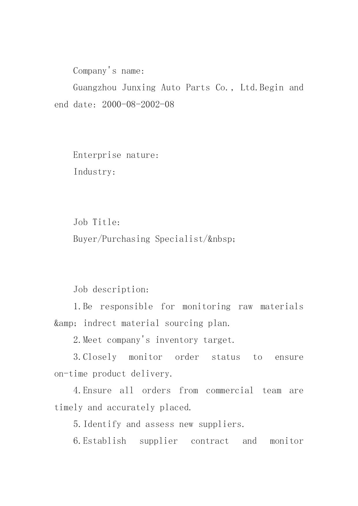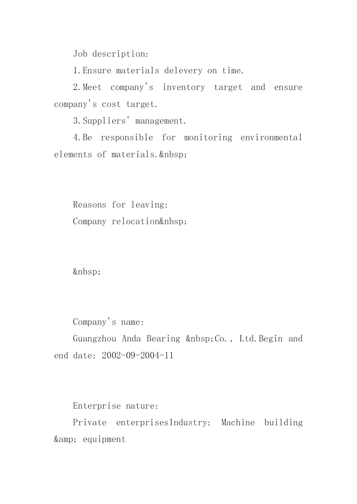 物流英文简历表格物流英文简历表格物流英文简历表格Name: Nationality:China(Mainland)CurrentPlace:GuangzhouHeight/Weight:170cm76kgMaritalStatus:SingleAge:32yearsCareerObjectiveApplicationtype:JobseekerPreferredjobtitle:Purchasingmanager/supervisor:PurchasingSupervisor、others:、others:Workinglife:9Title:NotitleJobtype:FulltimeExpectedStartdate:InthreedaysExpectedsalary:¥5,000--¥8,000Preferredworkingplace:GuangzhouFoshanDongguanWorkexperienceCompany'sname:Guanzhou***ElectricCo.,Ltd.Beginandenddate:2004-12-2010-06Enterprisenature:SolyforeignfundedenterprisesIndustry:Mechnical&elecricalequipment/electricalpower/powerJobTitle:PurchasingSupervisor Jobdescription:1.Ensurematerialsdeleveryontime.2.Meetcompany'sinventorytargetandensurecompany'scosttarget.3.Suppliers'management.4.Beresponsibleformonitoringenvironmentalelementsofmaterials. Reasonsforleaving:Companyrelocation Company'sname:GuangzhouAndaBearing Co.,Ltd.Beginandenddate:2002-09-2004-11Enterprisenature:PrivateenterprisesIndustry:Machinebuilding&equipmentJobTitle:PurchasingSupervisor Jobdescription:l.Arrangedday-to-dayworktostaffmembersinourdepartmentandassessedtheirsachievements.2.Maintainsmoothoperationofassemblyline.3.Developnewsuppliersandnegotiationpurchasingcontractsandrawmaterielprice.4.Suppierselection,evaluationandaudit.5.Maintaingoodrelationshipwithcorporationpartners.6.Ensurecompany'scosttarget. Reasonsforleaving:Toseekbetterdevelopment Company'sname:GuangzhouJunxingAutoPartsCo.,Ltd.Beginandenddate:2000-08-2002-08Enterprisenature:Industry:JobTitle:Buyer/PurchasingSpecialist/ Jobdescription:1.Beresponsibleformonitoringrawmaterials&indrectmaterialsourcingplan.2.Meetcompany'sinventorytarget.3.Closelymonitororderstatustoensureon-timeproductdelivery.4.Ensureallordersfromcommercialteamaretimelyandaccuratelyplaced.5.Identifyandassessnewsuppliers.6.Establishsuppliercontractandmonitorperformanceofcontracts. Reasonsforleaving:Toseekbetterdevelopment EducationalBac