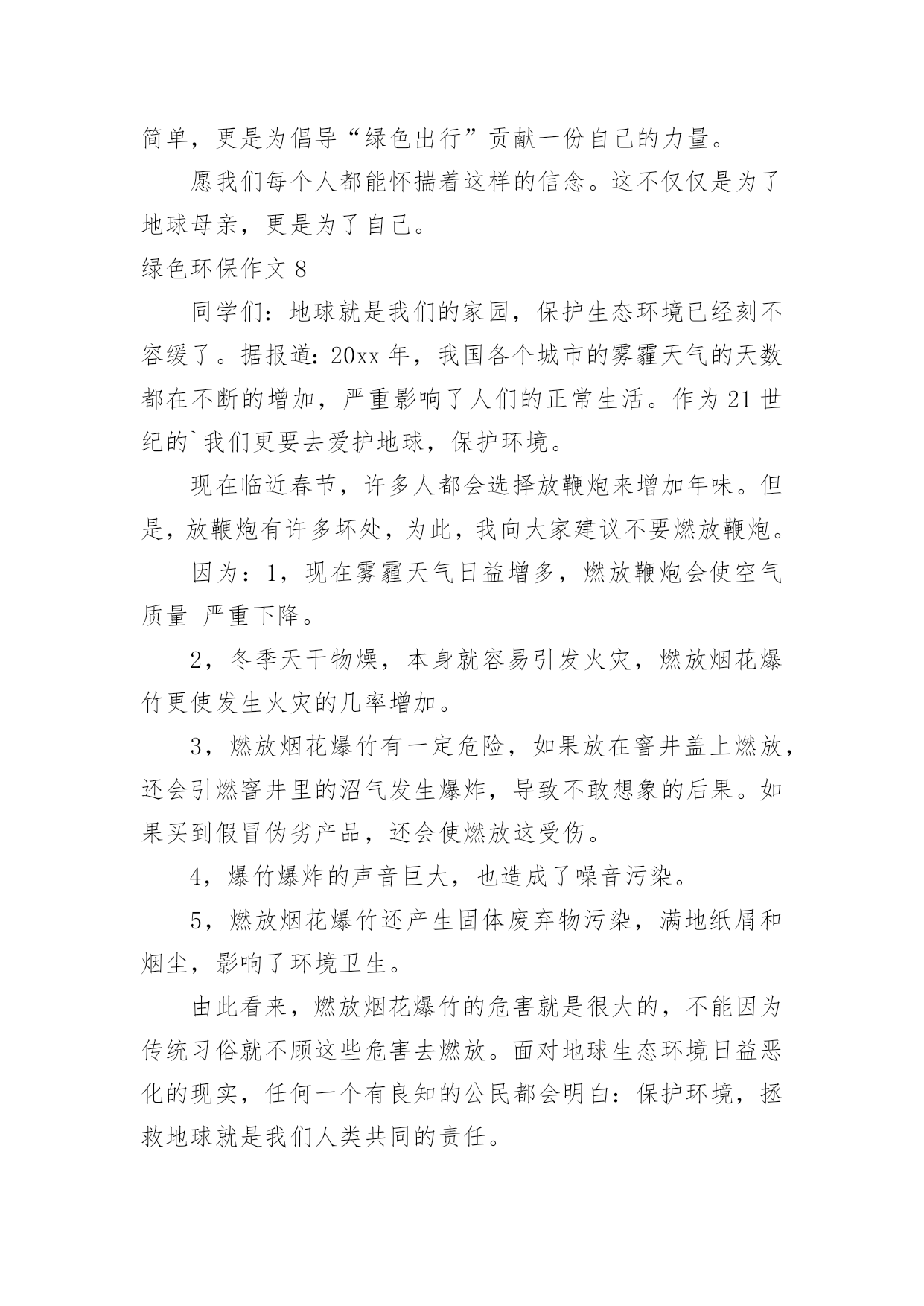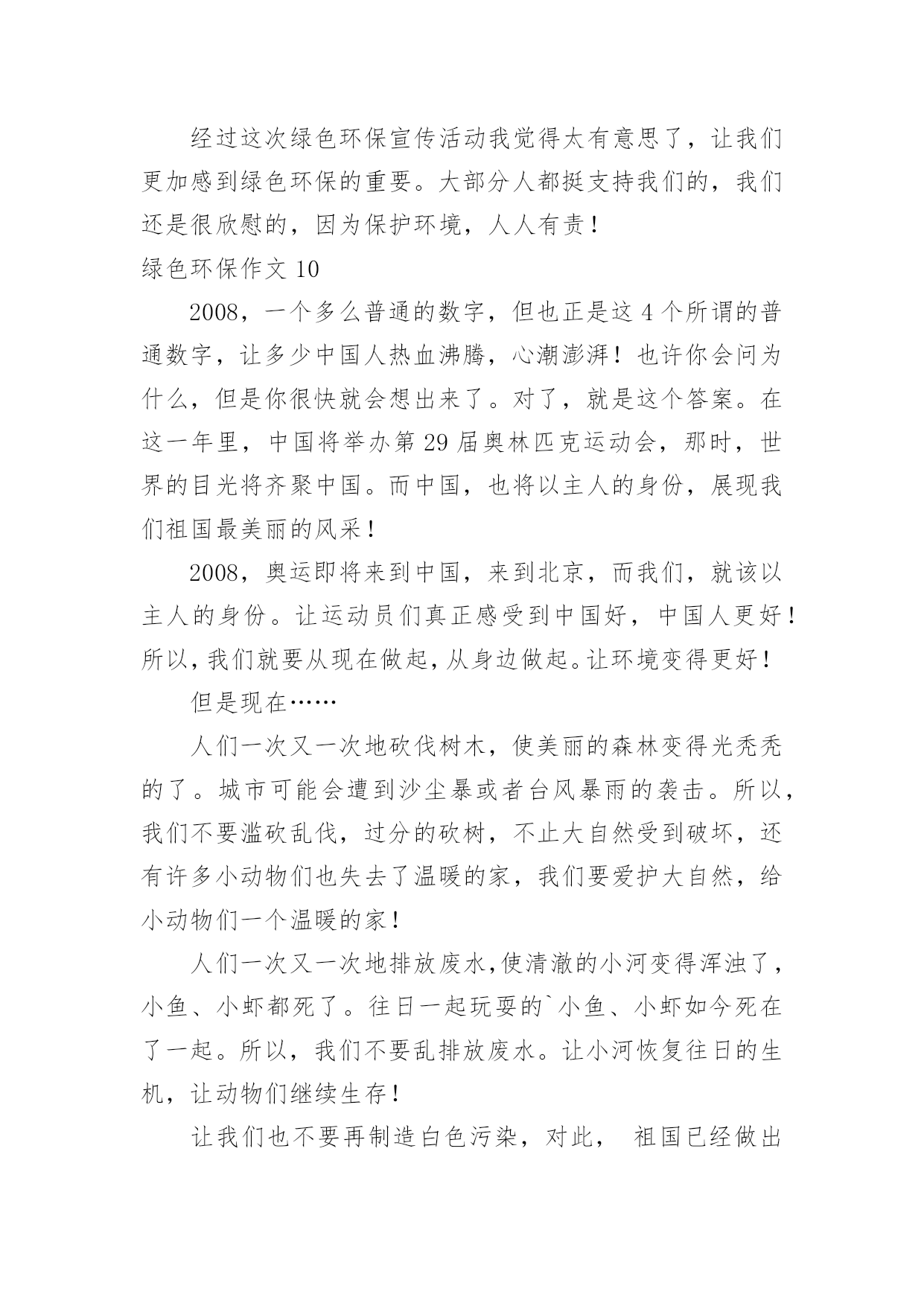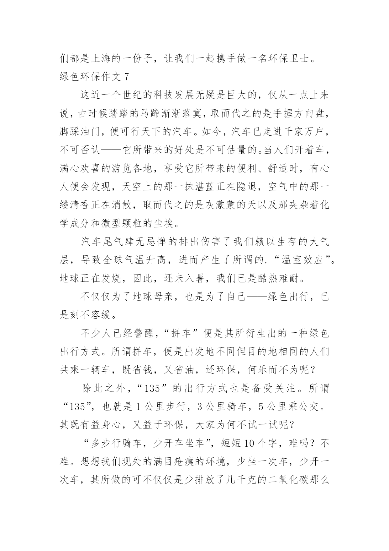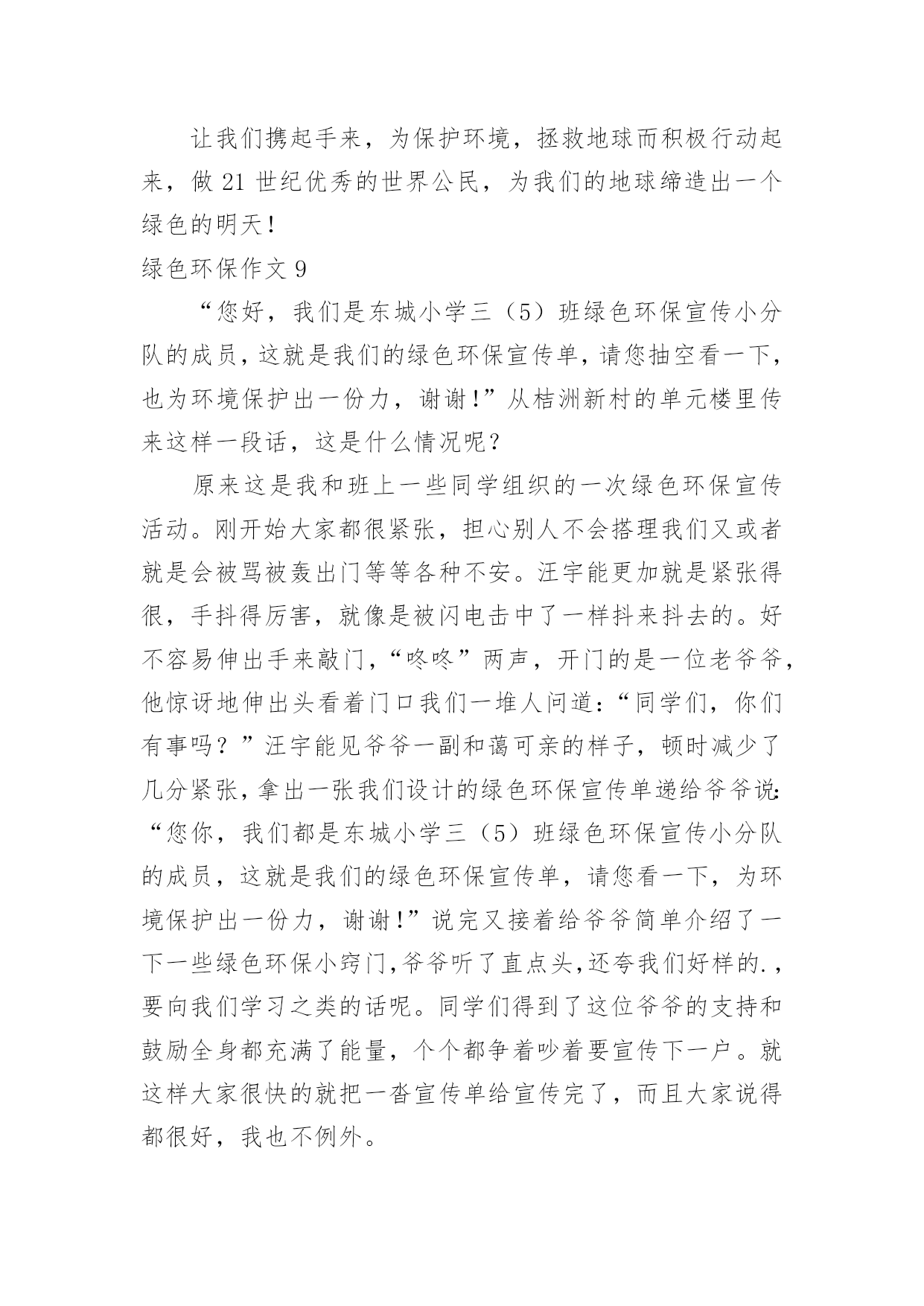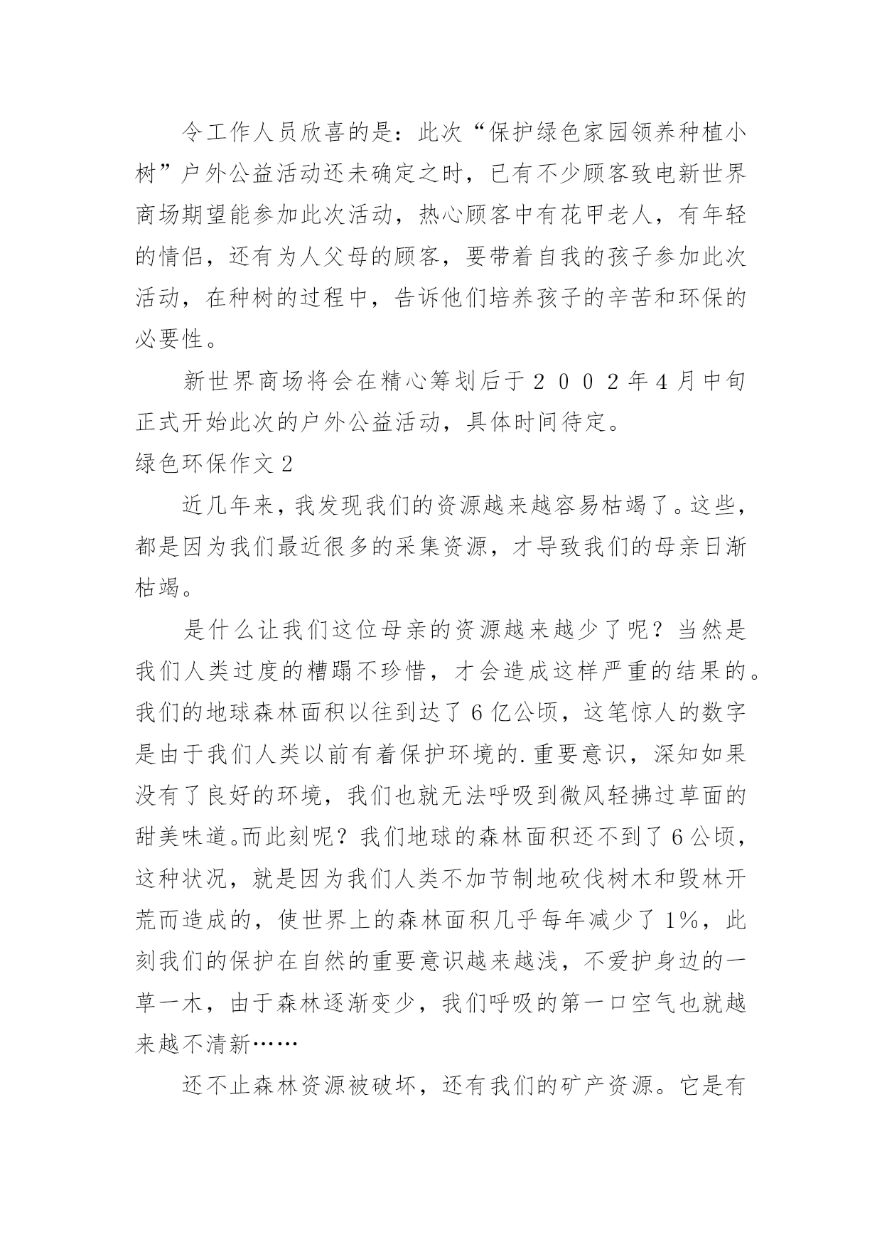绿色环保作文绿色环保作文精选15篇在我们平凡的日常里,大家总免不了要接触或使用作文吧,借助作文可以提高我们的语言组织能力。为了让您在写作文时更加简单方便,以下是小编整理的绿色环保作文,仅供参考,大家一起来看看吧。绿色环保作文1暮春三月,大地回春,北京新世界商场独树一帜为加强环保意识,关注公益事业,率先推出“保护绿色家园”活动。3月1日至31日期间,凡顾客在北京新世界商场当日购物现金累计满188元、在超市购物满68元,即可获赠“鸿运绿色植物”一盆,同时,还能够抽奖形式报名参加“保护绿色家园领养种植小树”户外公益活动,并可带一名亲友同行,共同为北京绿色环保事业做出自我的一份贡献。新世界商场企划部负责人表示《世界资源报告2000-2001》指出,地球上所有的水中仅有约1%可供人类使用,人类用水的增长量是人口增长的两倍,其中93%用于农业。我们已经使用现有地表水的一半,地球上三分之一的人们面临缺水,在今后25年中,这个数目将增加到35亿。为了让大众重视环保、都加入到环保队伍中来,新世界商场精心策划了此次活动,让百姓除了看到打折、返券还能看到京城商家公益的'一面。令工作人员欣喜的是:此次“保护绿色家园领养种植小树”户外公益活动还未确定之时,已有不少顾客致电新世界商场期望能参加此次活动,热心顾客中有花甲老人,有年轻的情侣,还有为人父母的顾客,要带着自我的孩子参加此次活动,在种树的过程中,告诉他们培养孩子的辛苦和环保的必要性。新世界商场将会在精心筹划后于2002年4月中旬正式开始此次的户外公益活动,具体时间待定。绿色环保作文2近几年来,我发现我们的资源越来越容易枯竭了。这些,都是因为我们最近很多的采集资源,才导致我们的母亲日渐枯竭。是什么让我们这位母亲的资源越来越少了呢?当然是我们人类过度的糟蹋不珍惜,才会造成这样严重的结果的。我们的地球森林面积以往到达了6亿公顷,这笔惊人的数字是由于我们人类以前有着保护环境的.重要意识,深知如果没有了良好的环境,我们也就无法呼吸到微风轻拂过草面的甜美味道。而此刻呢?我们地球的森林面积还不到了6公顷,这种状况,就是因为我们人类不加节制地砍伐树木和毁林开荒而造成的,使世界上的森林面积几乎每年减少了1%,此刻我们的保护在自然的重要意识越来越浅,不爱护身边的一草一木,由于森林逐渐变少,我们呼吸的第一口空气也就越来越不清新……还不止森林资源被破坏,还有我们的矿产资源。它是有限的,此刻我们的开采技术不断提高,速度不断加快,使某些矿种发生短缺,甚至面临枯竭。到那时,我们将永远呆在荒凉的大地上。应对这些,能够看出来我们失去的资源真是太多太多了!我们的依靠的资源也太多了!在我们身边,点点滴滴的资源都在减少,如果失去了这一切,我们将如何生活!所以,让我们真心地善待我们的地球母亲,努力去珍惜,去爱惜。哪怕只是多用一个小小的塑料袋,这也是不应当的!让我们行动起来,保卫地球吧!绿色环保作文3近日,我和杨丹一起去看了一部有趣的电影———《喜羊羊与灰太狼开心过蛇年》,电影主要讲的是灰太狼和小羊们为了制造出更高科技的产品,利用了天气家族。使得外面狂风大作,洪水爆发,动物们无家可归,只能逃到孤岛上。最后,大家都真心,保护环境,感动了天气,整个青青草原终于恢复了生机。看完电影,我被深深震撼了,这部电影,不就是在呼吁人类保护环境吗?我曾听说过这样一个故事:从前,人们都住在一个美丽的星球上,他们日出而作,日出而息。可是不久,那儿的人们为了满足自己的需求,开始疯狂的`砍伐树木来建造屋子;打死可爱的动物来给自己添衣服;开起汽车方便自己的生活。这个星球终于愤怒了:火山爆发、山洪暴发,淹没了庄家,淹没了房屋,人们无家可归。现在从各个新闻媒体上,都报道着:全球变暖!嘴上都那么说,可又有谁去踏踏实实做到了环保呢?在这么下去,受害者必定是人类啊!藏羚羊只可能是神话中的动物,鲸也只能在博物馆中看见,还有……这是多么可怕的事情啊!亲爱的人类,哦!不不,是我们自己,注意环保,让我们从身边的点滴做起吧!绿色环保作文4环保,从身边小事做起。作为现实生活中的每一个普通人,虽然不可能都直接从事环保工作,但我们完全可以从小事做起,从我做起。当看到洗手间的水龙头在滴水时,是不是能够举手关上呢?当电池用完后能否分类收藏处理而不是随手扔掉呢?当购物时能否自觉不使用超薄塑料袋呢?一件件小事虽然都很不起眼,但却体现我们究竟具备了多少环保意识。我知道有一位老太太,她每次上街买菜都要自带一个小布袋,每次上餐馆吃饭都要自带一个小钢勺。看起来很平常,但能够像这位老同志那样,长年自觉坚持不使用白色塑料袋,不使用一次性筷子,确实不容易。这不但要有坚定的环保信念,还需要有良好的习惯。我认为首要的就是要在全民族树立资源意识,生存意识。要让大家都认识到,保护环境与资源和我们每个人息息相关,保护环境