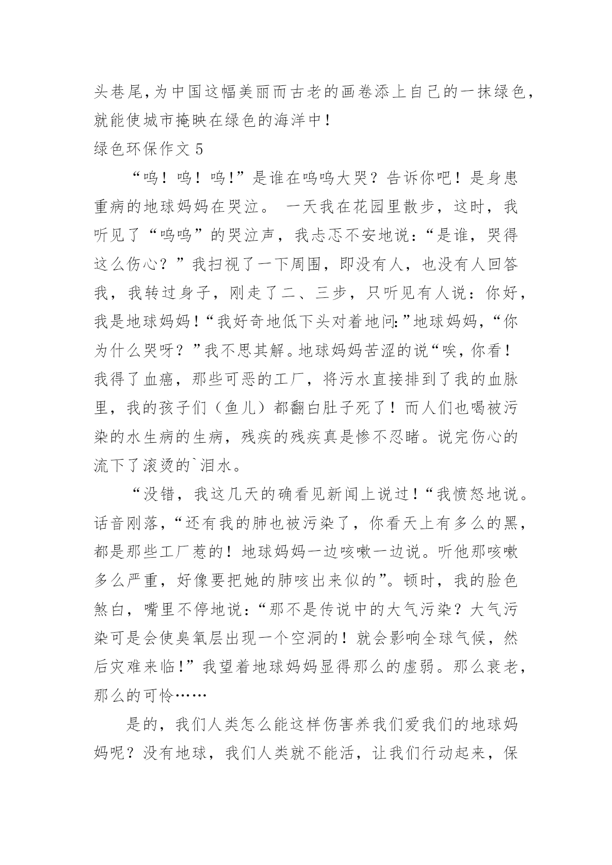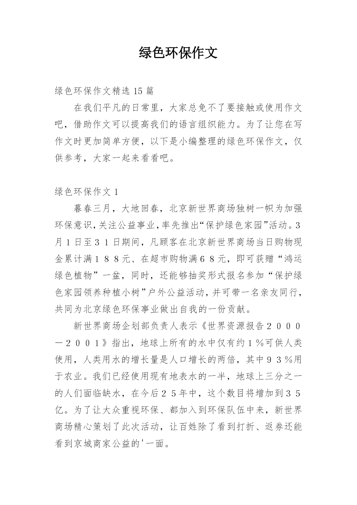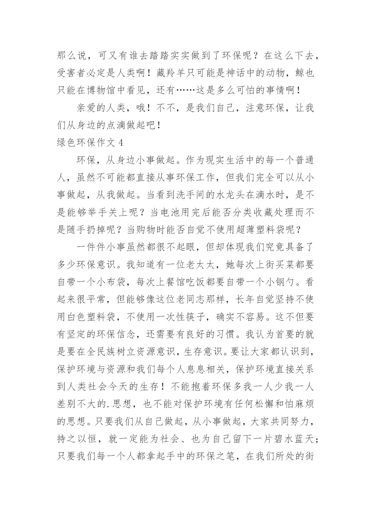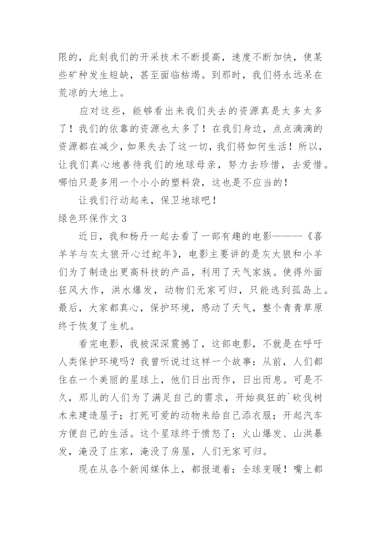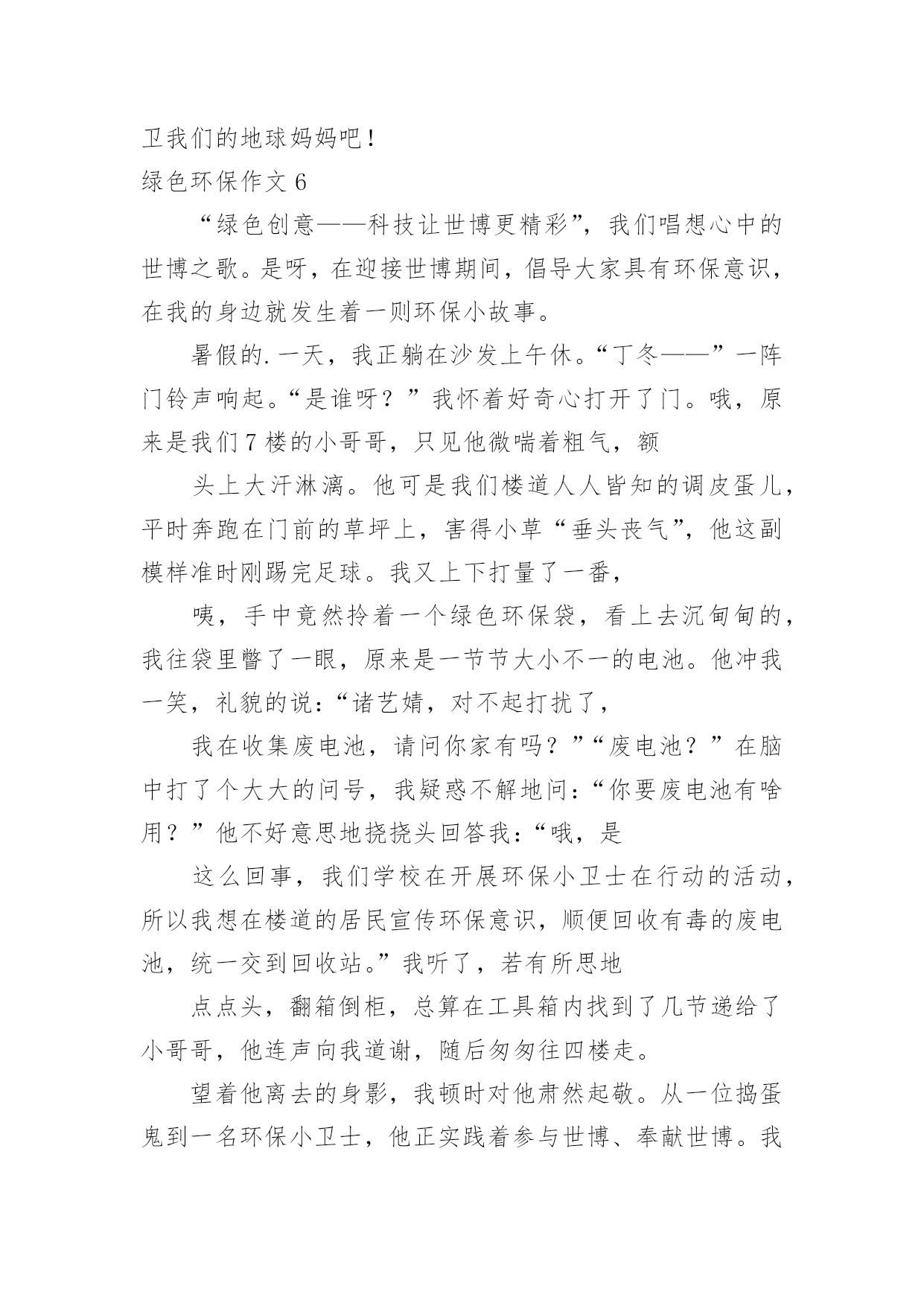 绿色环保作文绿色环保作文精选15篇在我们平凡的日常里,大家总免不了要接触或使用作文吧,借助作文可以提高我们的语言组织能力。为了让您在写作文时更加简单方便,以下是小编整理的绿色环保作文,仅供参考,大家一起来看看吧。绿色环保作文1暮春三月,大地回春,北京新世界商场独树一帜为加强环保意识,关注公益事业,率先推出“保护绿色家园”活动。3月1日至31日期间,凡顾客在北京新世界商场当日购物现金累计满188元、在超市购物满68元,即可获赠“鸿运绿色植物”一盆,同时,还能够抽奖形式报名参加“保护绿色家园领养种植小树”户外公益活动,并可带一名亲友同行,共同为北京绿色环保事业做出自我的一份贡献。新世界商场企划部负责人表示《世界资源报告2000-2001》指出,地球上所有的水中仅有约1%可供人类使用,人类用水的增长量是人口增长的两倍,其中93%用于农业。我们已经使用现有地表水的一半,地球上三分之一的人们面临缺水,在今后25年中,这个数目将增加到35亿。为了让大众重视环保、都加入到环保队伍中来,新世界商场精心策划了此次活动,让百姓除了看到打折、返券还能看到京城商家公益的'一面。令工作人员欣喜的是:此次“保护绿色家园领养种植小树”户外公益活动还未确定之时,已有不少顾客致电新世界商场期望能参加此次活动,热心顾客中有花甲老人,有年轻的情侣,还有为人父母的顾客,要带着自我的孩子参加此次活动,在种树的过程中,告诉他们培养孩子的辛苦和环保的必要性。新世界商场将会在精心筹划后于2002年4月中旬正式开始此次的户外公益活动,具体时间待定。绿色环保作文2近几年来,我发现我们的资源越来越容易枯竭了。这些,都是因为我们最近很多的采集资源,才导致我们的母亲日渐枯竭。是什么让我们这位母亲的资源越来越少了呢?当然是我们人类过度的糟蹋不珍惜,才会造成这样严重的结果的。我们的地球森林面积以往到达了6亿公顷,这笔惊人的数字是由于我们人类以前有着保护环境的.重要意识,深知如果没有了良好的环境,我们也就无法呼吸到微风轻拂过草面的甜美味道。而此刻呢?我们地球的森林面积还不到了6公顷,这种状况,就是因为我们人类不加节制地砍伐树木和毁林开荒而造成的,使世界上的森林面积几乎每年减少了1%,此刻我们的保护在自然的重要意识越来越浅,不爱护身边的一草一木,由于森林逐渐变少,我们呼吸的第一口空气也就越来越不清新……还不止森林资源被破坏,还有我们的矿产资源。它是有限的,此刻我们的开采技术不断提高,速度不断加快,使某些矿种发生短缺,甚至面临枯竭。到那时,我们将永远呆在荒凉的大地上。应对这些,能够看出来我们失去的资源真是太多太多了!我们的依靠的资源也太多了!在我们身边,点点滴滴的资源都在减少,如果失去了这一切,我们将如何生活!所以,让我们真心地善待我们的地球母亲,努力去珍惜,去爱惜。哪怕只是多用一个小小的塑料袋,这也是不应当的!让我们行动起来,保卫地球吧!绿色环保作文3近日,我和杨丹一起去看了一部有趣的电影———《喜羊羊与灰太狼开心过蛇年》,电影主要讲的是灰太狼和小羊们为了制造出更高科技的产品,利用了天气家族。使得外面狂风大作,洪水爆发,动物们无家可归,只能逃到孤岛上。最后,大家都真心,保护环境,感动了天气,整个青青草原终于恢复了生机。看完电影,我被深深震撼了,这部电影,不就是在呼吁人类保护环境吗?我曾听说过这样一个故事:从前,人们都住在一个美丽的星球上,他们日出而作,日出而息。可是不久,那儿的人们为了满足自己的需求,开始疯狂的`砍伐树木来建造屋子;打死可爱的动物来给自己添衣服;开起汽车方便自己的生活。这个星球终于愤怒了:火山爆发、山洪暴发,淹没了庄家,淹没了房屋,人们无家可归。现在从各个新闻媒体上,都报道着:全球变暖!嘴上都那么说,可又有谁去踏踏实实做到了环保呢?在这么下去,受害者必定是人类啊!藏羚羊只可能是神话中的动物,鲸也只能在博物馆中看见,还有……这是多么可怕的事情啊!亲爱的人类,哦!不不,是我们自己,注意环保,让我们从身边的点滴做起吧!绿色环保作文4环保,从身边小事做起。作为现实生活中的每一个普通人,虽然不可能都直接从事环保工作,但我们完全可以从小事做起,从我做起。当看到洗手间的水龙头在滴水时,是不是能够举手关上呢?当电池用完后能否分类收藏处理而不是随手扔掉呢?当购物时能否自觉不使用超薄塑料袋呢?一件件小事虽然都很不起眼,但却体现我们究竟具备了多少环保意识。我知道有一位老太太,她每次上街买菜都要自带一个小布袋,每次上餐馆吃饭都要自带一个小钢勺。看起来很平常,但能够像这位老同志那样,长年自觉坚持不使用白色塑料袋,不使用一次性筷子,确实不容易。这不但要有坚定的环保信念,还需要有良好的习惯。我认为首要的就是要在全民族树立资源意识,生存意识。要让大家都认识到,保护环境与资源和我们每个人息息相关,保护环境