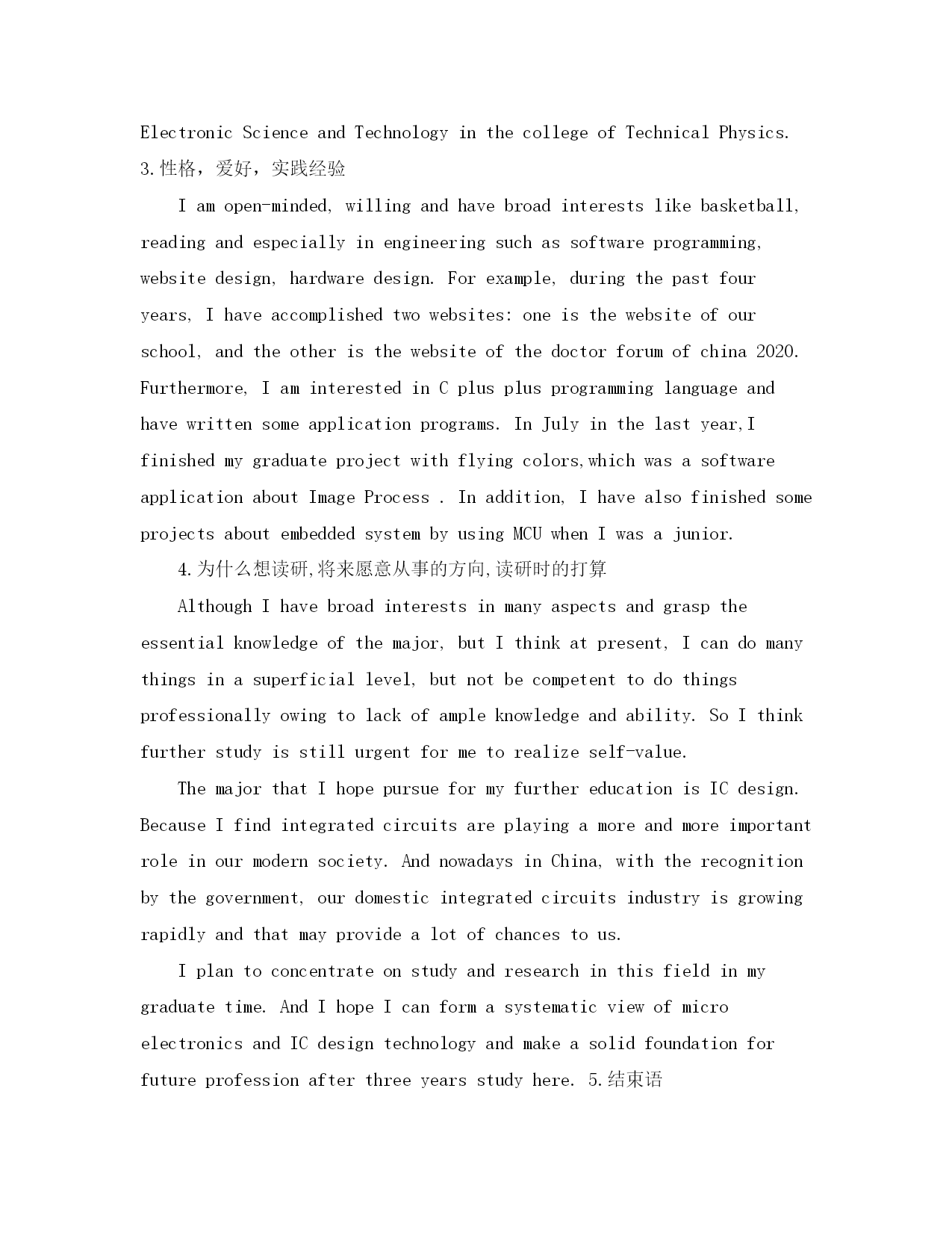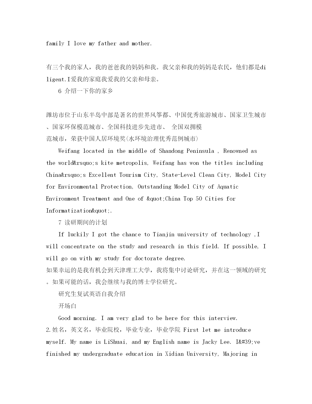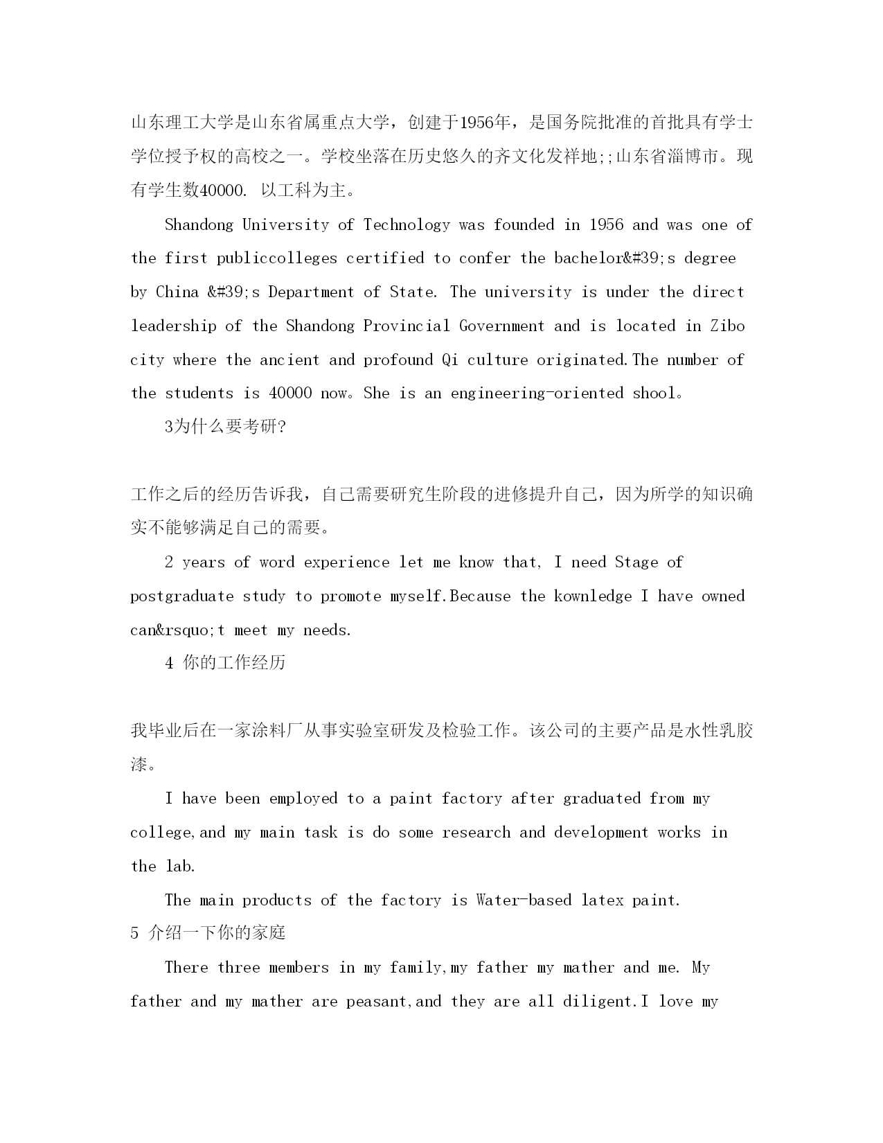 此资料由网络收集而来,如有侵权请告知上传者立即删除。资料共分享,我们负责传递知识。2020研究生复试英语自我介绍范文the2yearsofworkexperienceletmeknowthatIneedtopromotemyselfbytheStageofpostgraduatestudy.BeijingInstituteofTechnologyismyfirstchoice.LikemostoftheShandongpeople,Iamastraightforwardperson.Inmysparetime,Ilikereadingbooksandplayingbasketball.Iamadiligentstudentduringmycollegestudying,andInmycollege,Iactivelyresponsetothecallofthecollege,takepartinallkindsofusefulactivitiesandgetscholarshipsformanytimes.Ialwaysbelievethatonewilleasilylagbehindunlesshekeepsonlearning.Ofcourse,ifIamgivenachanceforadvancedstudiesinthisfamousUniversity,Iwillstaretoefforttomasteragoodcommandofadvancemycapability.早晨好。我很高兴能为这个面试。首先让我介绍一下自己。我的名字是Dongzhanji,我今年二十五岁。我来自山东省淄博市。我毕业于山东工业大学2020年7月。在过去的一年我一直在准备研究生考试,而我一直在研究和开发人的涂料厂工作。和2年工作经验让我知道我需要的方式增进自己的研究生学习阶段。北京理工大学是我的首选。Shandongpeople最喜欢的,我是一个直爽的人。在我的业余时间,我喜欢看书和打篮球。我是一个勤奋的学生在我的大学学习,在我的大学,我积极响应,学校的号召,参加各种有益的活动的一部分,并多次获得奖学金。我始终相信,人会很容易落后,除非他不断学习。当然,如果我有一个在这个著名的大学深造的机会,我会盯着与努力掌握了我的能力好前进的命令。2介绍一下自己的大学山东理工大学是山东省属重点大学,创建于1956年,是国务院批准的首批具有学士学位授予权的高校之一。学校坐落在历史悠久的齐文化发祥地;;山东省淄博市。现有学生数40000.以工科为主。ShandongUniversityofTechnologywasfoundedin1956andwasoneofthefirstpubliccollegescertifiedtoconferthebachelor'sdegreebyChina'sDepartmentofState.TheuniversityisunderthedirectleadershipoftheShandongProvincialGovernmentandislocatedinZibocitywheretheancientandprofoundQicultureoriginated.Thenumberofthestudentsis40000now。Sheisanengineering-orientedshool。3为什么要考研?工作之后的经历告诉我,自己需要研究生阶段的进修提升自己,因为所学的知识确实不能够满足自己的需要。2yearsofwordexperienceletmeknowthat,IneedStageofpostgraduatestudytopromotemyself.BecausethekownledgeIhaveownedcan’tmeetmyneeds.4你的工作经历我毕业后在一家涂料厂从事实验室研发及检验工作。该公司的主要产品是水性乳胶漆。Ihavebeenemployedtoapaintfactoryaftergraduatedfrommycollege,andmymaintaskisdosomeresearchanddevelopmentworksinthelab.ThemainproductsofthefactoryisWater-basedlatexpaint.5介绍一下你的家庭Therethreemembersinmyfamily,myfathermymatherandme.Myfatherandmymatherarepeasant,andtheyarealldiligent.IlovemyfamilyIlovemyfatherandmother.