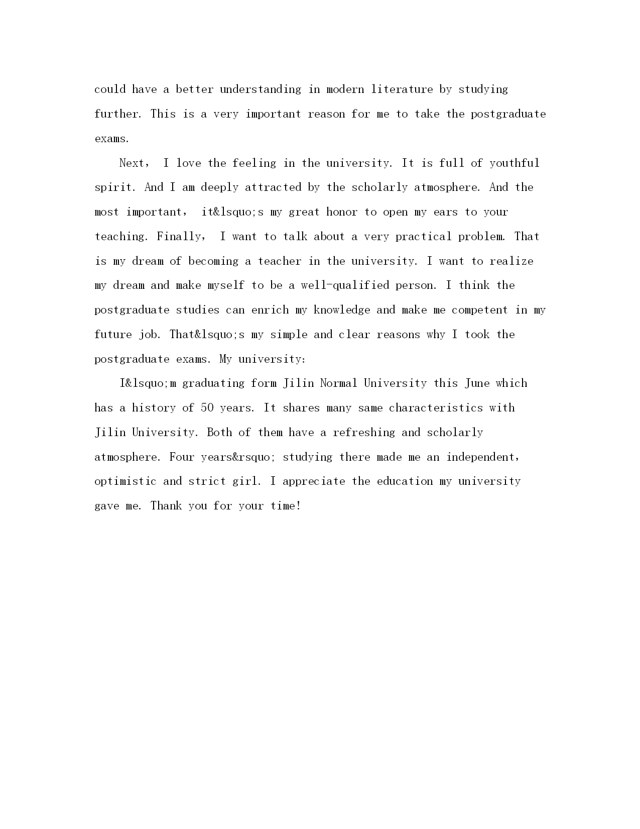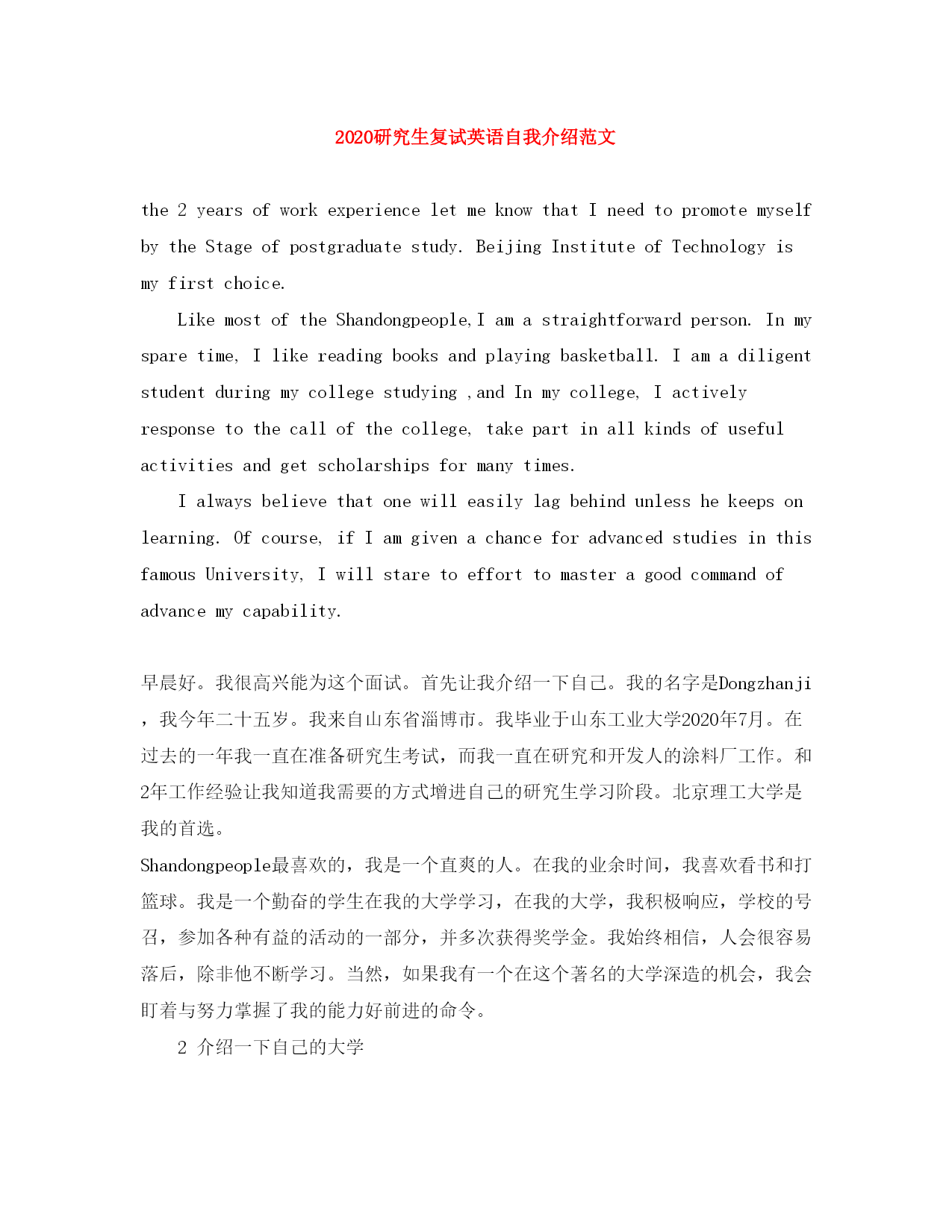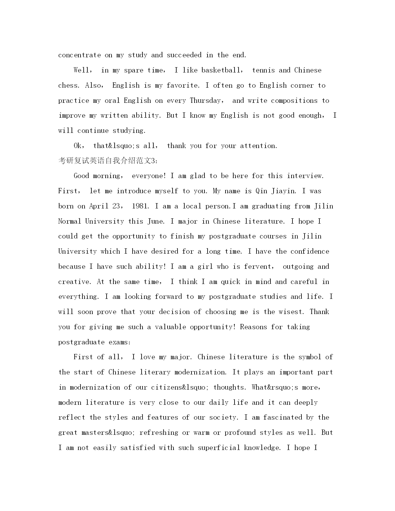 此资料由网络收集而来,如有侵权请告知上传者立即删除。资料共分享,我们负责传递知识。2020研究生复试英语自我介绍范文the2yearsofworkexperienceletmeknowthatIneedtopromotemyselfbytheStageofpostgraduatestudy.BeijingInstituteofTechnologyismyfirstchoice.LikemostoftheShandongpeople,Iamastraightforwardperson.Inmysparetime,Ilikereadingbooksandplayingbasketball.Iamadiligentstudentduringmycollegestudying,andInmycollege,Iactivelyresponsetothecallofthecollege,takepartinallkindsofusefulactivitiesandgetscholarshipsformanytimes.Ialwaysbelievethatonewilleasilylagbehindunlesshekeepsonlearning.Ofcourse,ifIamgivenachanceforadvancedstudiesinthisfamousUniversity,Iwillstaretoefforttomasteragoodcommandofadvancemycapability.早晨好。我很高兴能为这个面试。首先让我介绍一下自己。我的名字是Dongzhanji,我今年二十五岁。我来自山东省淄博市。我毕业于山东工业大学2020年7月。在过去的一年我一直在准备研究生考试,而我一直在研究和开发人的涂料厂工作。和2年工作经验让我知道我需要的方式增进自己的研究生学习阶段。北京理工大学是我的首选。Shandongpeople最喜欢的,我是一个直爽的人。在我的业余时间,我喜欢看书和打篮球。我是一个勤奋的学生在我的大学学习,在我的大学,我积极响应,学校的号召,参加各种有益的活动的一部分,并多次获得奖学金。我始终相信,人会很容易落后,除非他不断学习。当然,如果我有一个在这个著名的大学深造的机会,我会盯着与努力掌握了我的能力好前进的命令。2介绍一下自己的大学山东理工大学是山东省属重点大学,创建于1956年,是国务院批准的首批具有学士学位授予权的高校之一。学校坐落在历史悠久的齐文化发祥地;;山东省淄博市。现有学生数40000.以工科为主。ShandongUniversityofTechnologywasfoundedin1956andwasoneofthefirstpubliccollegescertifiedtoconferthebachelor'sdegreebyChina'sDepartmentofState.TheuniversityisunderthedirectleadershipoftheShandongProvincialGovernmentandislocatedinZibocitywheretheancientandprofoundQicultureoriginated.Thenumberofthestudentsis40000now。Sheisanengineering-orientedshool。3为什么要考研?工作之后的经历告诉我,自己需要研究生阶段的进修提升自己,因为所学的知识确实不能够满足自己的需要。2yearsofwordexperienceletmeknowthat,IneedStageofpostgraduatestudytopromotemyself.BecausethekownledgeIhaveownedcan’tmeetmyneeds.4你的工作经历我毕业后在一家涂料厂从事实验室研发及检验工作。该公司的主要产品是水性乳胶漆。Ihavebeenemployedtoapaintfactoryaftergraduatedfrommycollege,andmymaintaskisdosomeresearchanddevelopmentworksinthelab.ThemainproductsofthefactoryisWater-basedlatexpaint.5介绍一下你的家庭Therethreemembersinmyfamily,myfathermymatherandme.Myfatherandmymatherarepeasant,andtheyarealldiligent.IlovemyfamilyIlovemyfatherandmother.