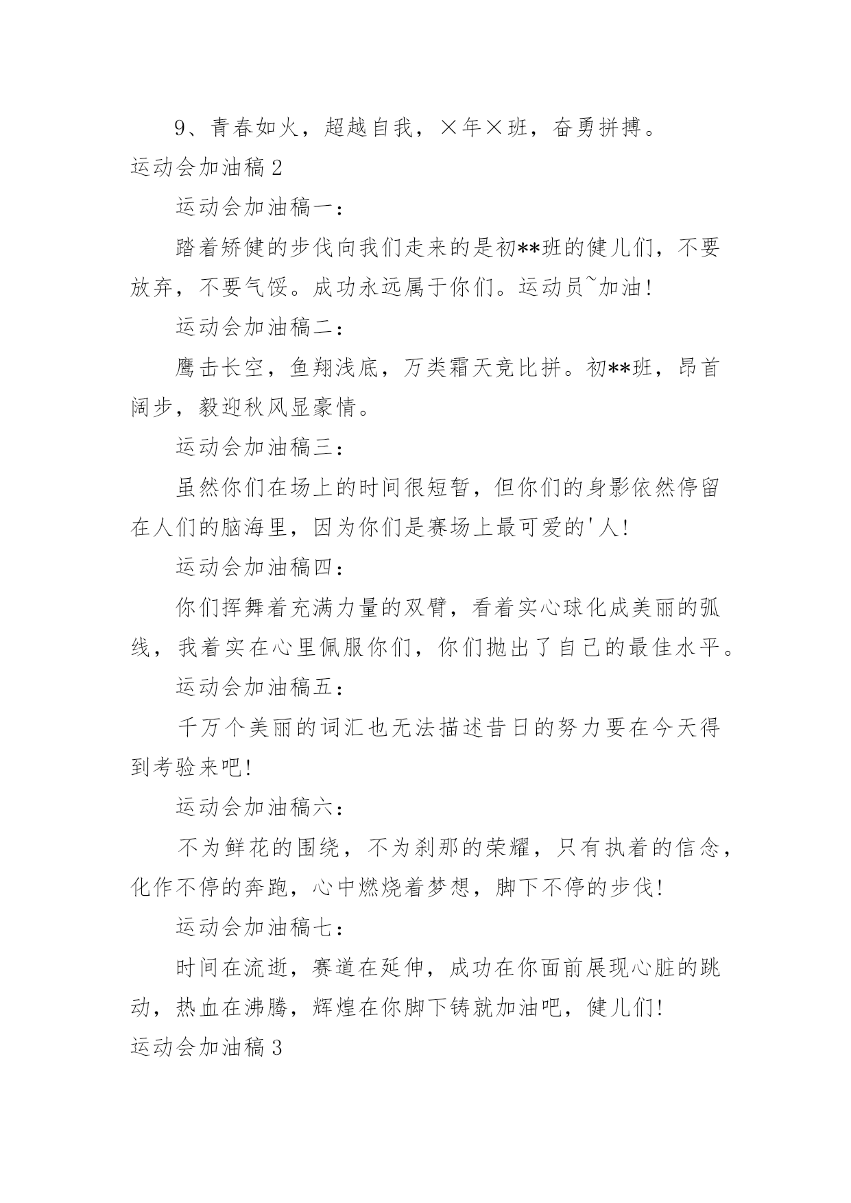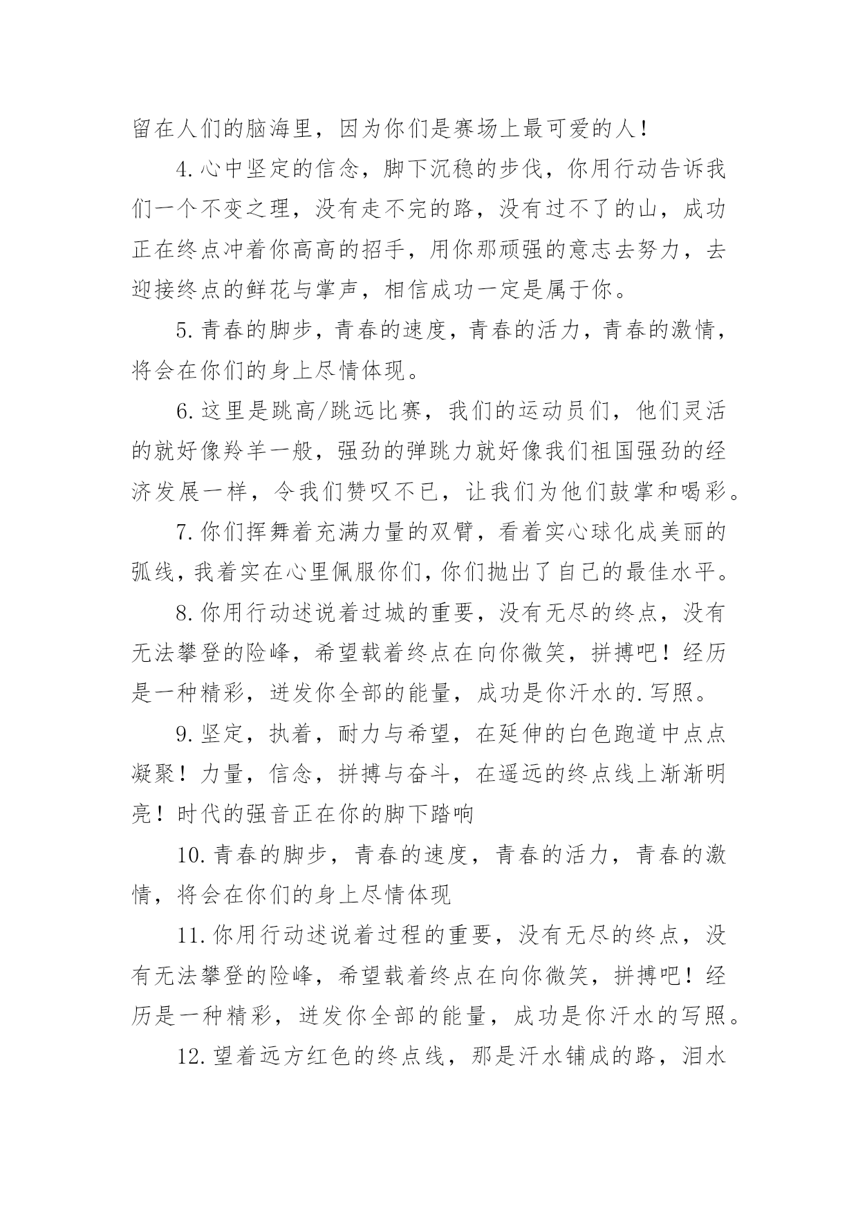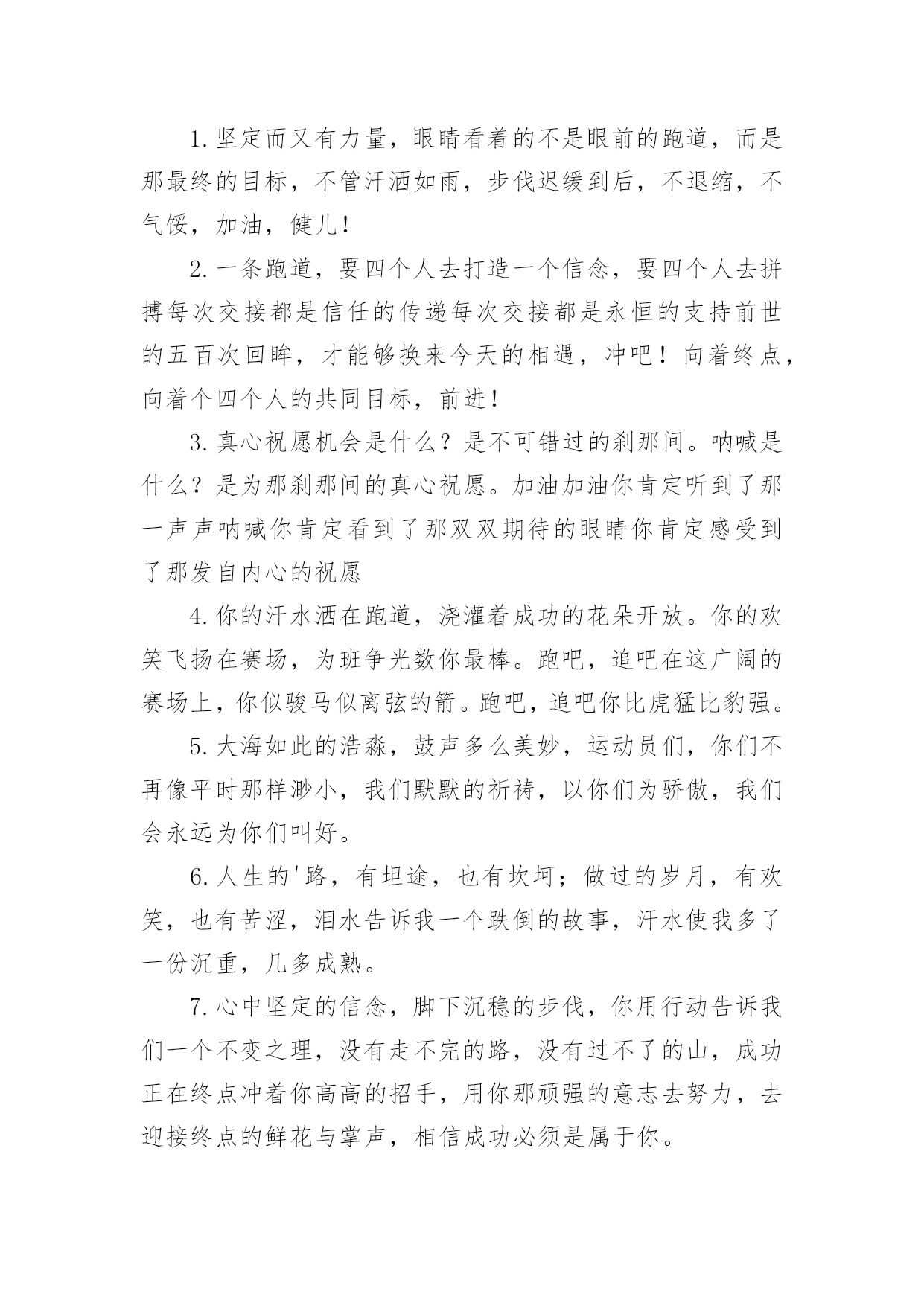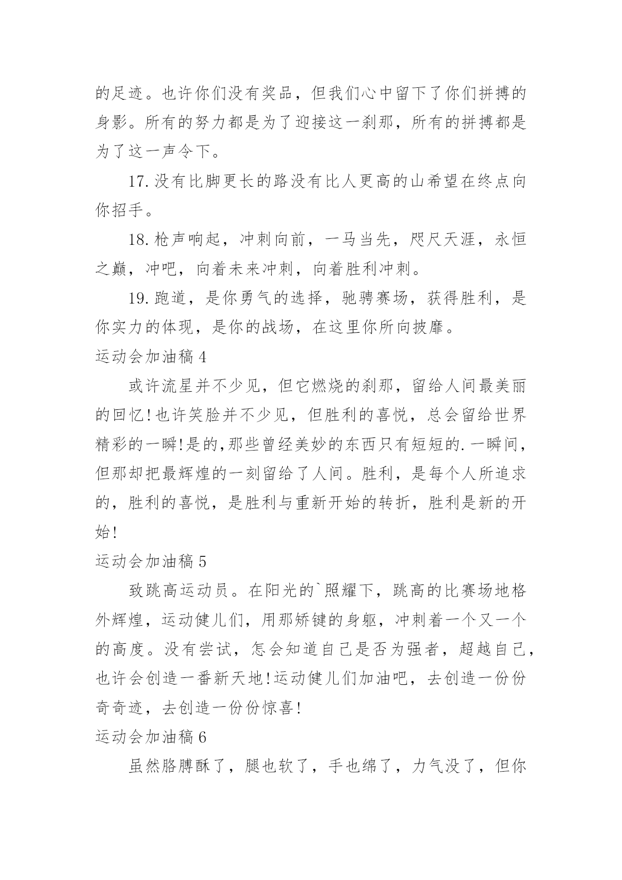 运动会加油稿(合集)运动会加油稿在日新月异的现代社会中,我们都跟加油稿有着直接或间接的联系,借助加油稿可以给对方传达鼓励。相信很多朋友都对写加油稿感到非常苦恼吧,下面是小编为大家收集的运动会加油稿,供大家参考借鉴,希望可以帮助到有需要的朋友。运动会加油稿11、以勇求改,以改求变,以变求进。2、心中坚定的信念,脚下沉稳的步伐,你用行动告诉我们一个不变之理,没有走不完的路,没有过不了的山。3、青春的.脚步,青春的速度,青春的活力,青春的活力,将会在你们的身上尽情体现。4、你的风姿,你的呼吸还有你呼啸而过的飓风,今日注定是属于你的日子,今日你注定将要创造辉煌。5、不为掌声的诠释,不为刻意的征服。6、迎接自我,挑战自我,战胜自我!我们相信你们一定能行,加油吧,运动员!终点就在眼前!7、鸣奏青春旋律,抒写运动乐意!8、立志创新校记录,勇夺奥运第一枚。9、青春如火,超越自我,×年×班,奋勇拼搏。运动会加油稿2运动会加油稿一:踏着矫健的步伐向我们走来的是初**班的健儿们,不要放弃,不要气馁。成功永远属于你们。运动员~加油!运动会加油稿二:鹰击长空,鱼翔浅底,万类霜天竞比拼。初**班,昂首阔步,毅迎秋风显豪情。运动会加油稿三:虽然你们在场上的时间很短暂,但你们的身影依然停留在人们的脑海里,因为你们是赛场上最可爱的'人!运动会加油稿四:你们挥舞着充满力量的双臂,看着实心球化成美丽的弧线,我着实在心里佩服你们,你们抛出了自己的最佳水平。运动会加油稿五:千万个美丽的词汇也无法描述昔日的努力要在今天得到考验来吧!运动会加油稿六:不为鲜花的围绕,不为刹那的荣耀,只有执着的信念,化作不停的奔跑,心中燃烧着梦想,脚下不停的步伐!运动会加油稿七:时间在流逝,赛道在延伸,成功在你面前展现心脏的跳动,热血在沸腾,辉煌在你脚下铸就加油吧,健儿们!运动会加油稿31.坚定而又有力量,眼睛看着的不是眼前的跑道,而是那最终的目标,不管汗洒如雨,步伐迟缓到后,不退缩,不气馁,加油,健儿!2.一条跑道,要四个人去打造一个信念,要四个人去拼搏每次交接都是信任的传递每次交接都是永恒的支持前世的五百次回眸,才能够换来今天的相遇,冲吧!向着终点,向着个四个人的共同目标,前进!3.真心祝愿机会是什么?是不可错过的刹那间。呐喊是什么?是为那刹那间的真心祝愿。加油加油你肯定听到了那一声声呐喊你肯定看到了那双双期待的眼睛你肯定感受到了那发自内心的祝愿4.你的汗水洒在跑道,浇灌着成功的花朵开放。你的欢笑飞扬在赛场,为班争光数你最棒。跑吧,追吧在这广阔的赛场上,你似骏马似离弦的箭。跑吧,追吧你比虎猛比豹强。5.大海如此的浩淼,鼓声多么美妙,运动员们,你们不再像平时那样渺小,我们默默的祈祷,以你们为骄傲,我们会永远为你们叫好。6.人生的'路,有坦途,也有坎坷;做过的岁月,有欢笑,也有苦涩,泪水告诉我一个跌倒的故事,汗水使我多了一份沉重,几多成熟。7.心中坚定的信念,脚下沉稳的步伐,你用行动告诉我们一个不变之理,没有走不完的路,没有过不了的山,成功正在终点冲着你高高的招手,用你那顽强的意志去努力,去迎接终点的鲜花与掌声,相信成功必须是属于你。8.百米战场,枪声炸响,你抬头是勇气是自信,低头是深沉是内敛,只需几秒,那就是永恒。9.100只是一道过场,几秒钟转瞬即逝,但是这背后承载的是多少成败,加油吧,少年。10.你的风姿,你的呼吸还有你呼啸而过的飓风,今天注定是属于你的日子,今天你注定将要创造辉煌。11.你的汗水洒在跑道,浇灌着成功的花朵开放;你的欢笑飞扬在赛场,为班争光数你最棒;跑吧,追吧,在这广阔的赛场上,你似骏马似离铉的箭;跑吧,追吧,你比虎猛比豹强。12.心中坚定的信念,脚下沉稳的步伐,你用行动告诉我们一个不变之理,没有走不完的路,没有过不了的山,成功正在终点冲着你高高的招手,用你那顽强的意志去努力,去迎接终点的鲜花与掌声,相信成功一定是属于你13.三千米,对于我来说是一个遥远的距离。想到的时候,觉得颤栗。然而对于站在起跑线上的每一位女运动员来说,这将是她们将要面临的比赛。14.这是意志的拼搏。这是速度的挑战。胜利在向你们招手/胜利在向你们呼唤15.这是一个新的起点,转过这个弯道,鼓起勇气,迎接你的将是最后的挑战,最终的胜利。16.泰戈尔在诗中说,天空没有翅膀的影子,但我已飞过;艾青对朋友说,也许有人到达不了彼岸,但我们共同拥有大海。也许你们没有显赫的成绩,但运动场上留下了你们的足迹。也许你们没有奖品,但我们心中留下了你们拼搏的身影。所有的努力都是为了迎接这一刹那,所有的拼搏都是为了这一声令下。17.没有比脚更长的路没有比人更高的山希望在终点向你招手。18.枪声响起,冲刺向前,一马当先,咫尺天涯,永恒之巅,冲吧,向着未来冲刺,向着胜利冲刺。19.跑道,是你勇气的选择,驰骋赛场,获得胜利,是