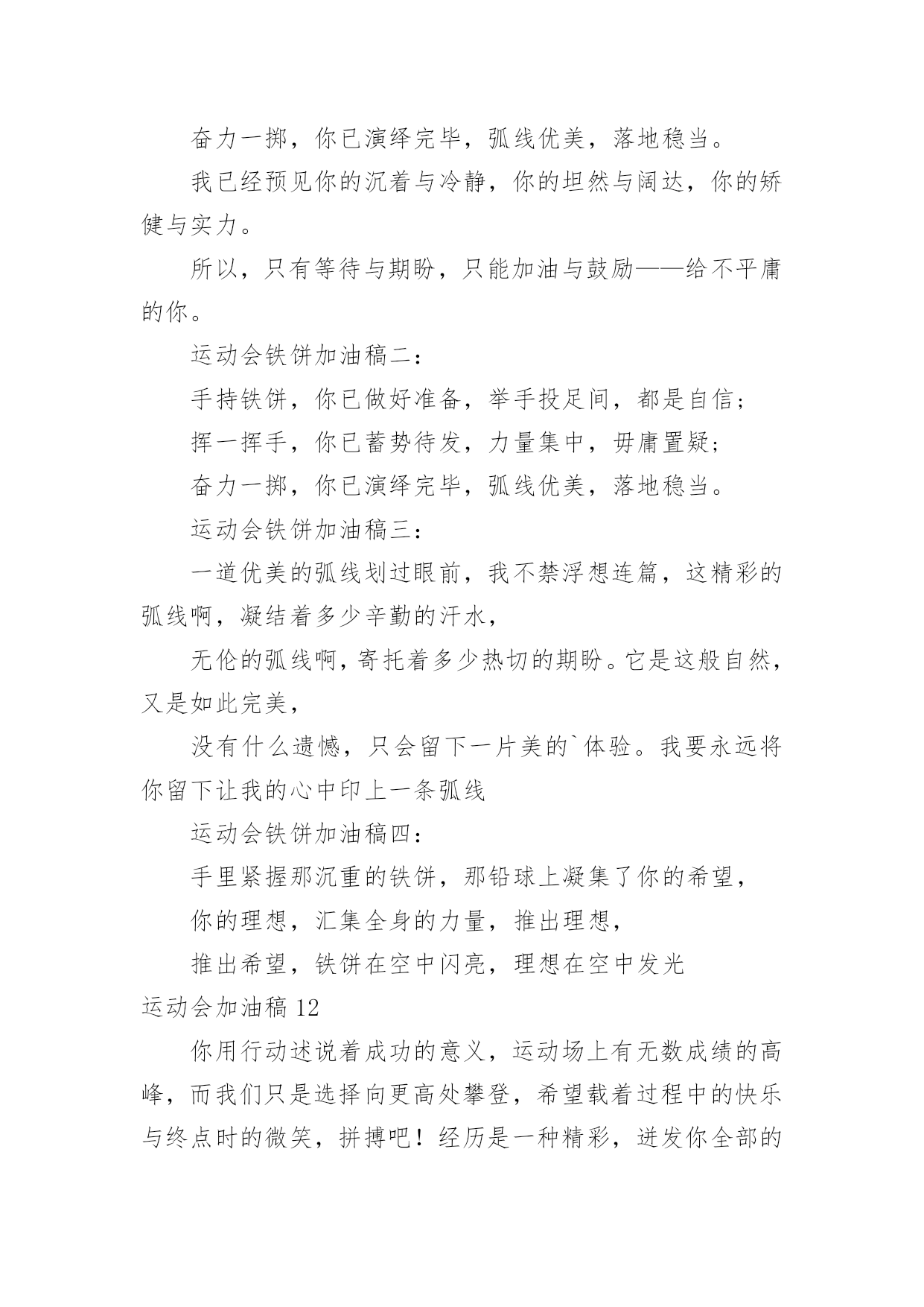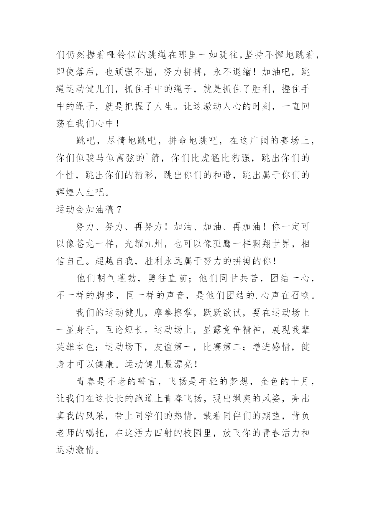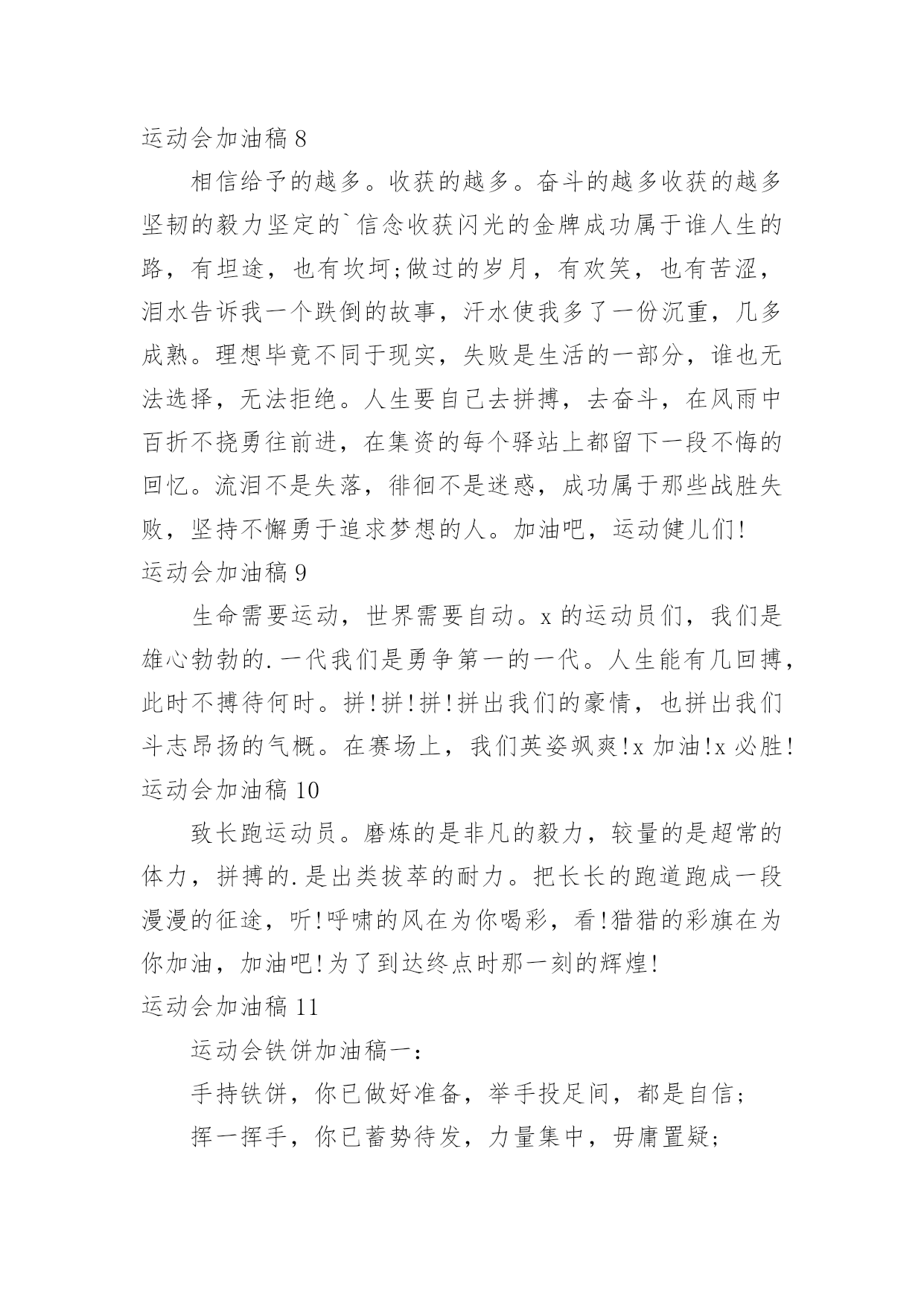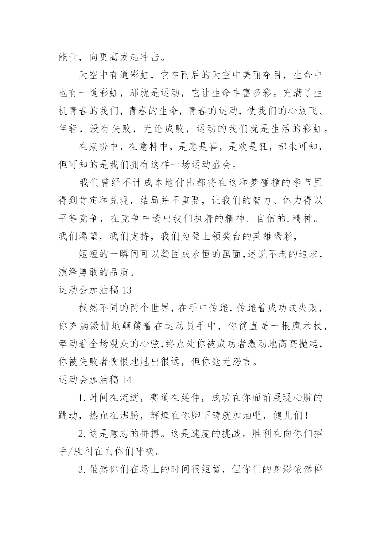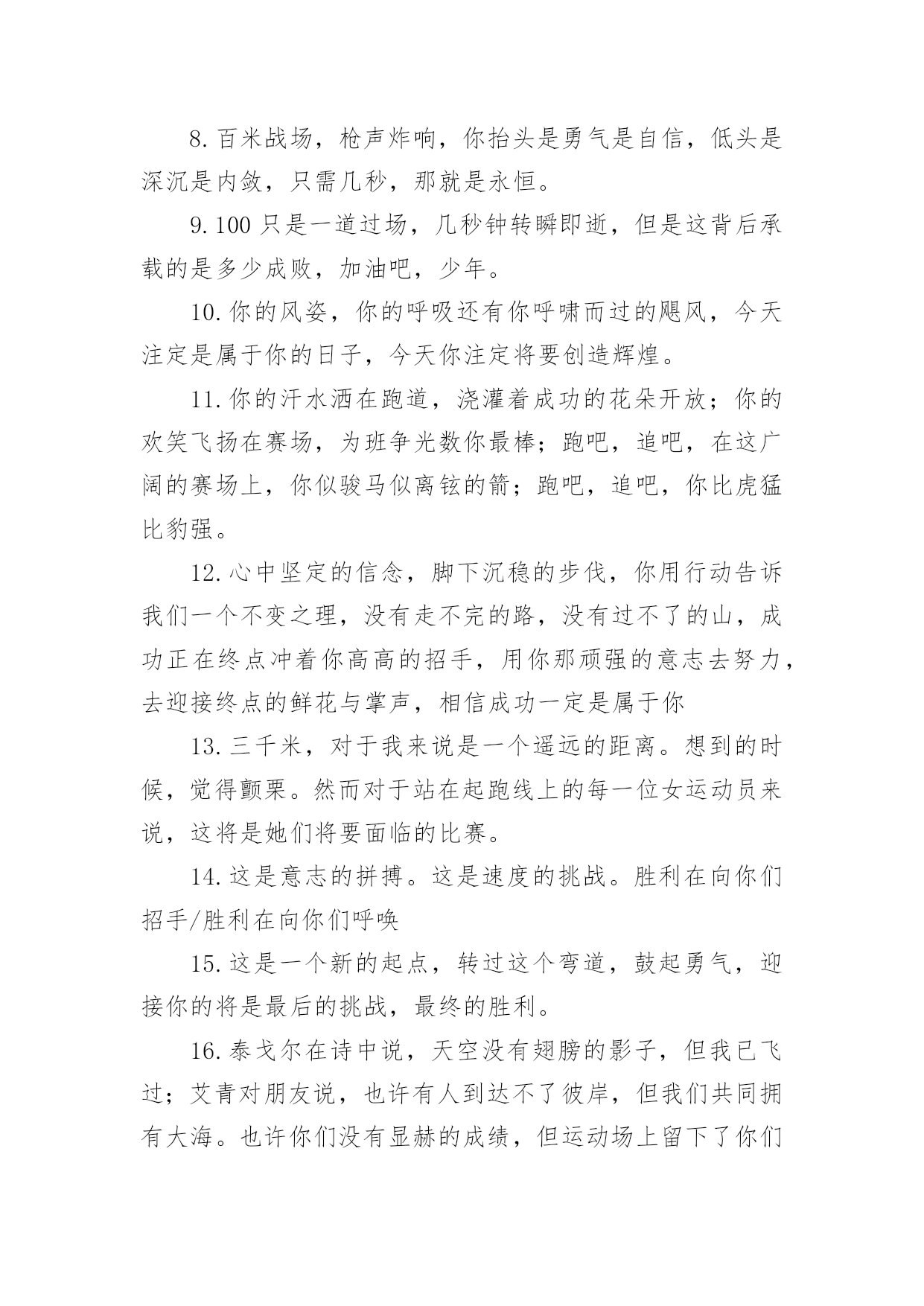 运动会加油稿(合集)运动会加油稿在日新月异的现代社会中,我们都跟加油稿有着直接或间接的联系,借助加油稿可以给对方传达鼓励。相信很多朋友都对写加油稿感到非常苦恼吧,下面是小编为大家收集的运动会加油稿,供大家参考借鉴,希望可以帮助到有需要的朋友。运动会加油稿11、以勇求改,以改求变,以变求进。2、心中坚定的信念,脚下沉稳的步伐,你用行动告诉我们一个不变之理,没有走不完的路,没有过不了的山。3、青春的.脚步,青春的速度,青春的活力,青春的活力,将会在你们的身上尽情体现。4、你的风姿,你的呼吸还有你呼啸而过的飓风,今日注定是属于你的日子,今日你注定将要创造辉煌。5、不为掌声的诠释,不为刻意的征服。6、迎接自我,挑战自我,战胜自我!我们相信你们一定能行,加油吧,运动员!终点就在眼前!7、鸣奏青春旋律,抒写运动乐意!8、立志创新校记录,勇夺奥运第一枚。9、青春如火,超越自我,×年×班,奋勇拼搏。运动会加油稿2运动会加油稿一:踏着矫健的步伐向我们走来的是初**班的健儿们,不要放弃,不要气馁。成功永远属于你们。运动员~加油!运动会加油稿二:鹰击长空,鱼翔浅底,万类霜天竞比拼。初**班,昂首阔步,毅迎秋风显豪情。运动会加油稿三:虽然你们在场上的时间很短暂,但你们的身影依然停留在人们的脑海里,因为你们是赛场上最可爱的'人!运动会加油稿四:你们挥舞着充满力量的双臂,看着实心球化成美丽的弧线,我着实在心里佩服你们,你们抛出了自己的最佳水平。运动会加油稿五:千万个美丽的词汇也无法描述昔日的努力要在今天得到考验来吧!运动会加油稿六:不为鲜花的围绕,不为刹那的荣耀,只有执着的信念,化作不停的奔跑,心中燃烧着梦想,脚下不停的步伐!运动会加油稿七:时间在流逝,赛道在延伸,成功在你面前展现心脏的跳动,热血在沸腾,辉煌在你脚下铸就加油吧,健儿们!运动会加油稿31.坚定而又有力量,眼睛看着的不是眼前的跑道,而是那最终的目标,不管汗洒如雨,步伐迟缓到后,不退缩,不气馁,加油,健儿!2.一条跑道,要四个人去打造一个信念,要四个人去拼搏每次交接都是信任的传递每次交接都是永恒的支持前世的五百次回眸,才能够换来今天的相遇,冲吧!向着终点,向着个四个人的共同目标,前进!3.真心祝愿机会是什么?是不可错过的刹那间。呐喊是什么?是为那刹那间的真心祝愿。加油加油你肯定听到了那一声声呐喊你肯定看到了那双双期待的眼睛你肯定感受到了那发自内心的祝愿4.你的汗水洒在跑道,浇灌着成功的花朵开放。你的欢笑飞扬在赛场,为班争光数你最棒。跑吧,追吧在这广阔的赛场上,你似骏马似离弦的箭。跑吧,追吧你比虎猛比豹强。5.大海如此的浩淼,鼓声多么美妙,运动员们,你们不再像平时那样渺小,我们默默的祈祷,以你们为骄傲,我们会永远为你们叫好。6.人生的'路,有坦途,也有坎坷;做过的岁月,有欢笑,也有苦涩,泪水告诉我一个跌倒的故事,汗水使我多了一份沉重,几多成熟。7.心中坚定的信念,脚下沉稳的步伐,你用行动告诉我们一个不变之理,没有走不完的路,没有过不了的山,成功正在终点冲着你高高的招手,用你那顽强的意志去努力,去迎接终点的鲜花与掌声,相信成功必须是属于你。8.百米战场,枪声炸响,你抬头是勇气是自信,低头是深沉是内敛,只需几秒,那就是永恒。9.100只是一道过场,几秒钟转瞬即逝,但是这背后承载的是多少成败,加油吧,少年。10.你的风姿,你的呼吸还有你呼啸而过的飓风,今天注定是属于你的日子,今天你注定将要创造辉煌。11.你的汗水洒在跑道,浇灌着成功的花朵开放;你的欢笑飞扬在赛场,为班争光数你最棒;跑吧,追吧,在这广阔的赛场上,你似骏马似离铉的箭;跑吧,追吧,你比虎猛比豹强。12.心中坚定的信念,脚下沉稳的步伐,你用行动告诉我们一个不变之理,没有走不完的路,没有过不了的山,成功正在终点冲着你高高的招手,用你那顽强的意志去努力,去迎接终点的鲜花与掌声,相信成功一定是属于你13.三千米,对于我来说是一个遥远的距离。想到的时候,觉得颤栗。然而对于站在起跑线上的每一位女运动员来说,这将是她们将要面临的比赛。14.这是意志的拼搏。这是速度的挑战。胜利在向你们招手/胜利在向你们呼唤15.这是一个新的起点,转过这个弯道,鼓起勇气,迎接你的将是最后的挑战,最终的胜利。16.泰戈尔在诗中说,天空没有翅膀的影子,但我已飞过;艾青对朋友说,也许有人到达不了彼岸,但我们共同拥有大海。也许你们没有显赫的成绩,但运动场上留下了你们的足迹。也许你们没有奖品,但我们心中留下了你们拼搏的身影。所有的努力都是为了迎接这一刹那,所有的拼搏都是为了这一声令下。17.没有比脚更长的路没有比人更高的山希望在终点向你招手。18.枪声响起,冲刺向前,一马当先,咫尺天涯,永恒之巅,冲吧,向着未来冲刺,向着胜利冲刺。19.跑道,是你勇气的选择,驰骋赛场,获得胜利,是