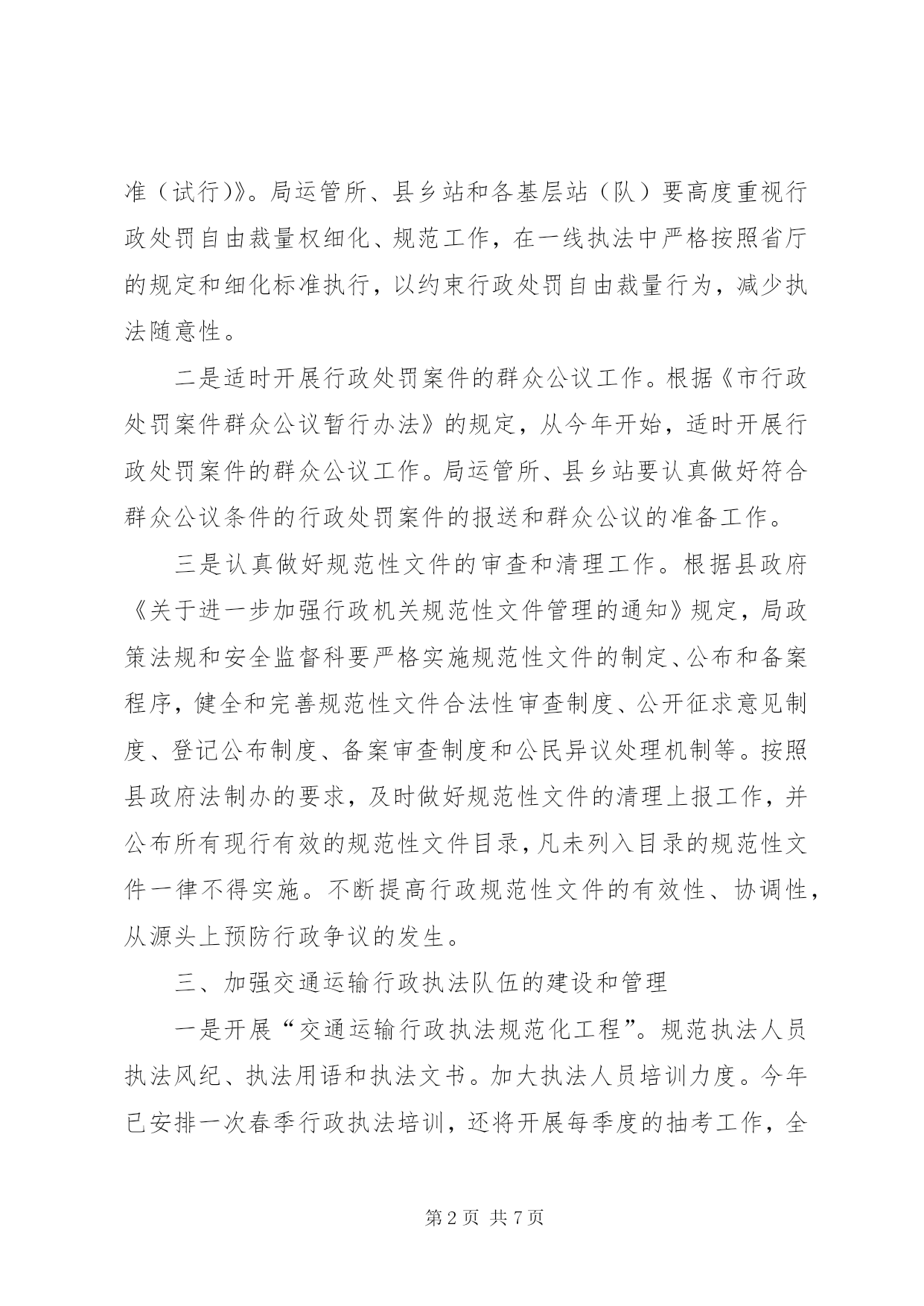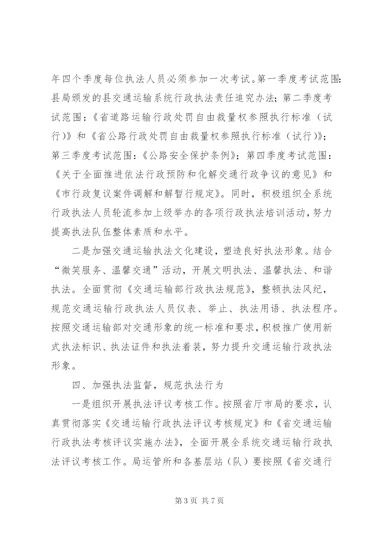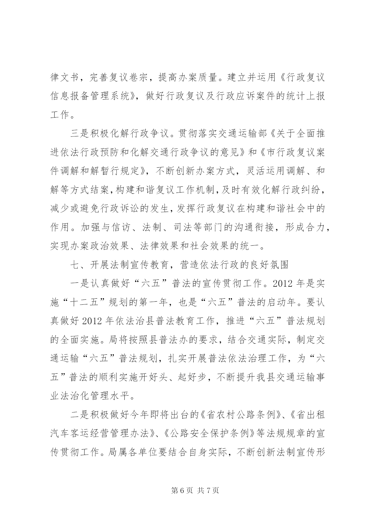 第PAGE\*Arabic\*MERGEFORMAT7页共NUMPAGES\*MERGEFORMAT7页交通局法制工作要点2012年,全县交通运输法制工作的指导思想和总体要求是:以党的十七届五中全会精神为指导,深入贯彻落实科学发展观,根据市交通运输局XX县区法制办的部署和要求,以建设法制交通为目标,全面推进交通运输依法行政工作,协助上级加强综合交通运输法规体系建设;加强行政执法监督,提高执法能力和水平;加强执法队伍建设,提高专业素质和整体功能,规范文明执法,有效监督管理,高效优质服务,为现代交通运输业科学发展提供可靠的法制保障。今年交通运输法制工作的主要任务是:一、深入推进交通运输系统依法行政工作认真贯彻落实国务院《全面推进依法行政实施纲要》和《县2012年依法治县普法教育工作意见》,局运管所、县乡站和各基层站(队)要全面总结往年依法行政工作经验,查找依法行政工作中存在的问题,提出解决问题的办法和措施,结合本单位的实际,制定2012年依法行政工作方案,明确组织领导、年度工作目标、工作步骤以及量化任务,层层分解,落实到所、落实到站(队)、落实到每位执法人员。二、科学构建综合交通运输法规体系一是进一步细化和规范交通行政处罚自由裁量权。认真贯彻执行省交通运输厅颁布的《省道路运输行政处罚自由裁量权参照执法标准(试行)》和《省公路行政处罚自由裁量权参照执行标准(试行)》。局运管所、县乡站和各基层站(队)要高度重视行政处罚自由裁量权细化、规范工作,在一线执法中严格按照省厅的规定和细化标准执行,以约束行政处罚自由裁量行为,减少执法随意性。二是适时开展行政处罚案件的群众公议工作。根据《市行政处罚案件群众公议暂行办法》的规定,从今年开始,适时开展行政处罚案件的群众公议工作。局运管所、县乡站要认真做好符合群众公议条件的行政处罚案件的报送和群众公议的准备工作。三是认真做好规范性文件的审查和清理工作。根据县政府《关于进一步加强行政机关规范性文件管理的通知》规定,局政策法规和安全监督科要严格实施规范性文件的制定、公布和备案程序,健全和完善规范性文件合法性审查制度、公开征求意见制度、登记公布制度、备案审查制度和公民异议处理机制等。按照县政府法制办的要求,及时做好规范性文件的清理上报工作,并公布所有现行有效的规范性文件目录,凡未列入目录的规范性文件一律不得实施。不断提高行政规范性文件的有效性、协调性,从源头上预防行政争议的发生。三、加强交通运输行政执法队伍的建设和管理一是开展“交通运输行政执法规范化工程”。规范执法人员执法风纪、执法用语和执法文书。加大执法人员培训力度。今年已安排一次春季行政执法培训,还将开展每季度的抽考工作,全年四个季度每位执法人员必须参加一次考试。第一季度考试范围:县局颁发的县交通运输系统行政执法责任追究办法;第二季度考试范围:《省道路运输行政处罚自由裁量权参照执行标准(试行)》和《省公路行政处罚自由裁量权参照执行标准(试行)》;第三季度考试范围:《公路安全保护条例》;第四季度考试范围:《关于全面推进依法行政预防和化解交通行政争议的意见》和《市行政复议案件调解和解暂行规定》。同时,积极组织全系统行政执法人员轮流参加上级举办的各项行政执法培训活动,努力提高执法队伍整体素质和水平。二是加强交通运输执法文化建设,塑造良好执法形象。结合“微笑服务、温馨交通”活动,开展文明执法、温馨执法、和谐执法。全面贯彻《交通运输部行政执法规范》,整顿执法风纪,规范交通运输行政执法人员仪表、举止、执法用语、执法程序。按照交通运输部对交通形象的统一标准和要求,积极推广使用新式执法标识、执法证件和执法着装,努力提升交通运输行政执法形象。四、加强执法监督,规范执法行为一是组织开展执法评议考核工作。按照省厅市局的要求,认真贯彻落实《交通运输行政执法评议考核规定》和《省交通运输行政执法考核评议实施办法》,全面开展全系统交通运输行政执法评议考核工作。局运管所和各基层站(队)要按照《省交通行政执法责任制实施意见》的规定,将执法责任分解到岗位,落实到人头。明确执法范围、执法权限和执法程序,按照权责统一的原则,将法定的执法权力和执法责任,具体分解到职能机构、执法岗位和执法人员。做到职权到岗,责任到人。实现执法权限法定化、执法责任明晰化、执法行为规范化、执法活动公开化、执法文书标准化。二是认真开展执法案卷评查活动,适时全面推广电子执法文书的应用。围绕县政府每年开展的案卷评查活动,积极开展自查。县局将采取抽查方式对一线执法案卷进行评查,并对处罚办所有案件实施监督,促进交通系统执法工作水平的提高。今年适时在全局推广使用电子执法文书。三是创新多种形式,加强执法监督检查。继续坚持每月暗访督查制度,加大执法检查、明查暗访力度,确保执法监督检查工作规范化、制度化、经