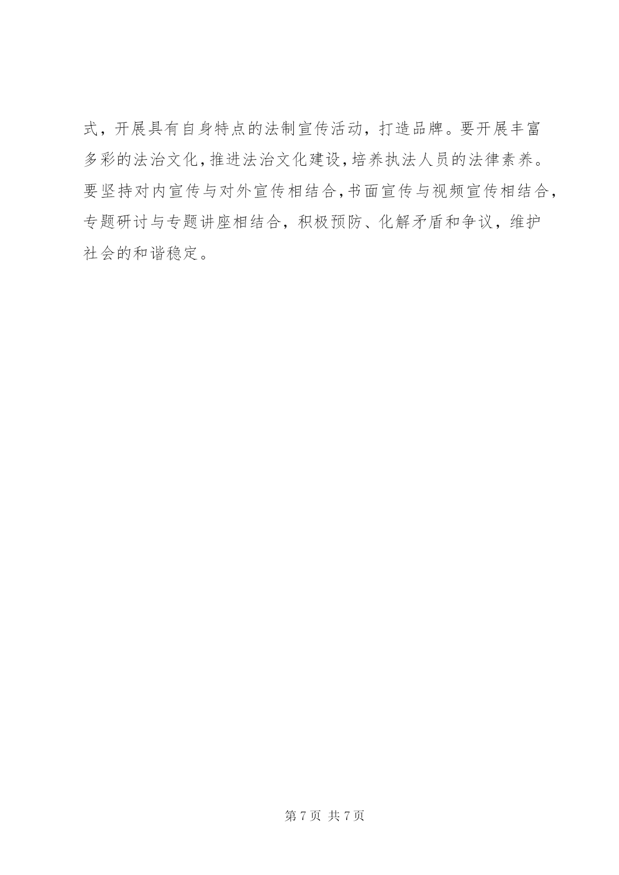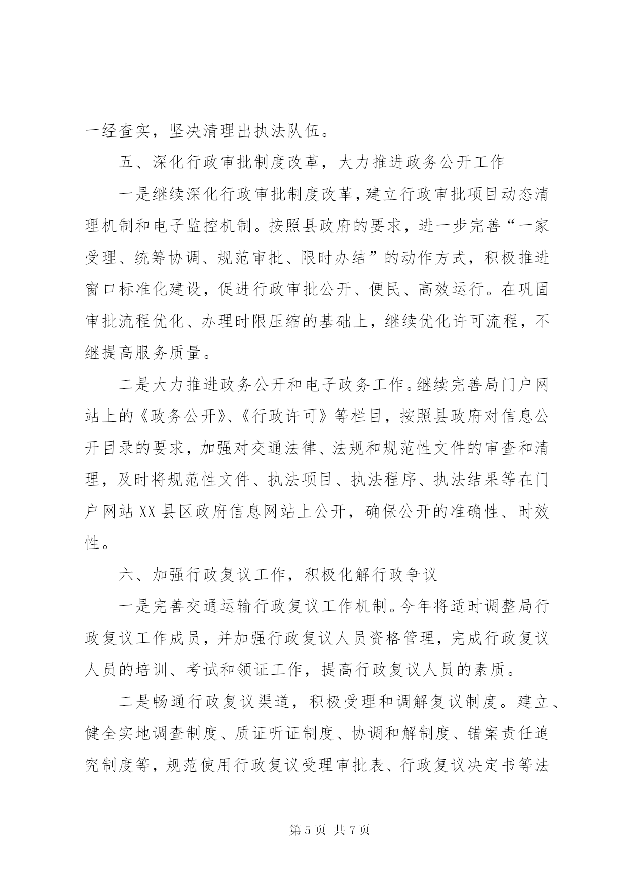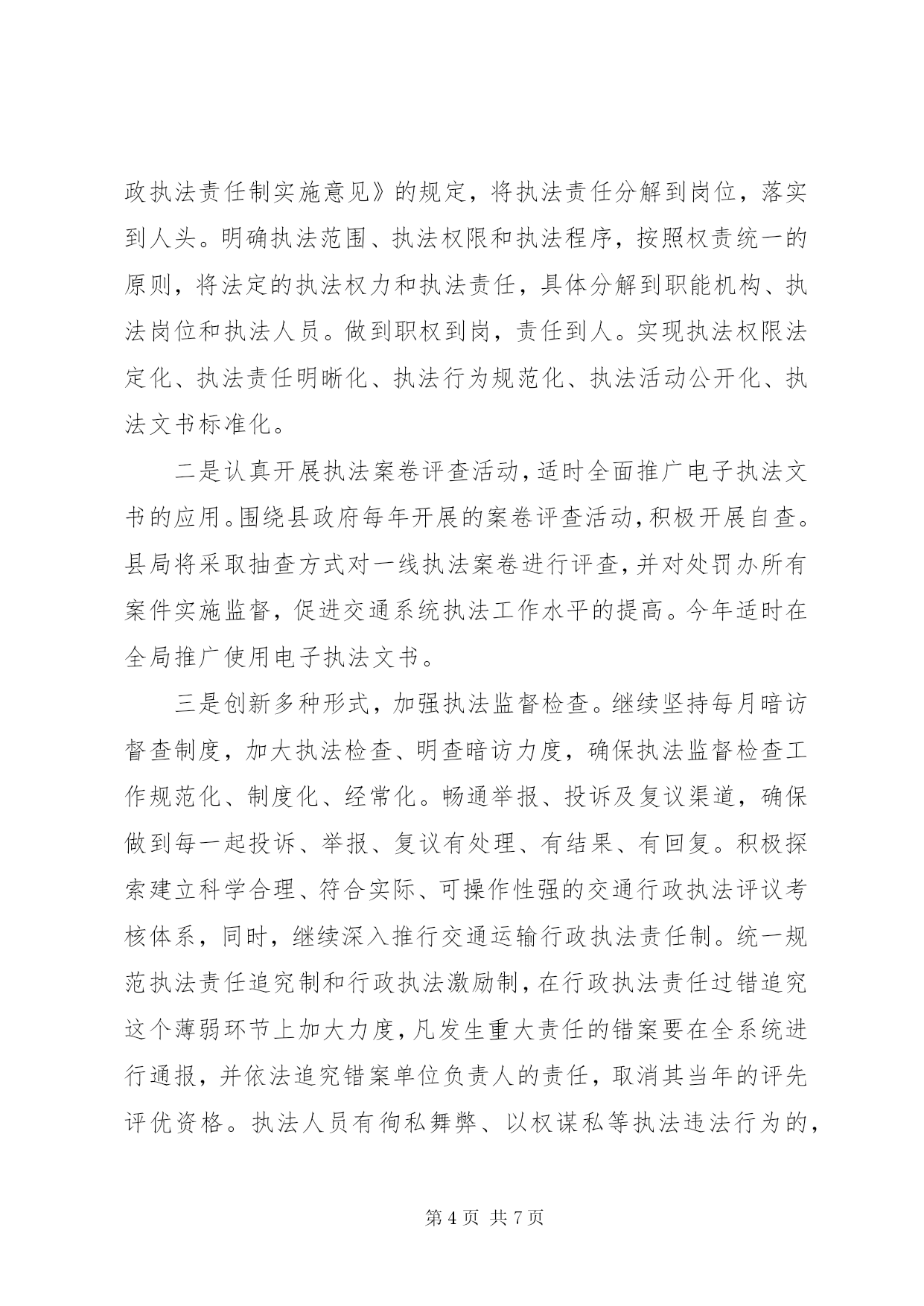 第PAGE\*Arabic\*MERGEFORMAT7页共NUMPAGES\*MERGEFORMAT7页交通局法制工作要点2012年,全县交通运输法制工作的指导思想和总体要求是:以党的十七届五中全会精神为指导,深入贯彻落实科学发展观,根据市交通运输局XX县区法制办的部署和要求,以建设法制交通为目标,全面推进交通运输依法行政工作,协助上级加强综合交通运输法规体系建设;加强行政执法监督,提高执法能力和水平;加强执法队伍建设,提高专业素质和整体功能,规范文明执法,有效监督管理,高效优质服务,为现代交通运输业科学发展提供可靠的法制保障。今年交通运输法制工作的主要任务是:一、深入推进交通运输系统依法行政工作认真贯彻落实国务院《全面推进依法行政实施纲要》和《县2012年依法治县普法教育工作意见》,局运管所、县乡站和各基层站(队)要全面总结往年依法行政工作经验,查找依法行政工作中存在的问题,提出解决问题的办法和措施,结合本单位的实际,制定2012年依法行政工作方案,明确组织领导、年度工作目标、工作步骤以及量化任务,层层分解,落实到所、落实到站(队)、落实到每位执法人员。二、科学构建综合交通运输法规体系一是进一步细化和规范交通行政处罚自由裁量权。认真贯彻执行省交通运输厅颁布的《省道路运输行政处罚自由裁量权参照执法标准(试行)》和《省公路行政处罚自由裁量权参照执行标准(试行)》。局运管所、县乡站和各基层站(队)要高度重视行政处罚自由裁量权细化、规范工作,在一线执法中严格按照省厅的规定和细化标准执行,以约束行政处罚自由裁量行为,减少执法随意性。二是适时开展行政处罚案件的群众公议工作。根据《市行政处罚案件群众公议暂行办法》的规定,从今年开始,适时开展行政处罚案件的群众公议工作。局运管所、县乡站要认真做好符合群众公议条件的行政处罚案件的报送和群众公议的准备工作。三是认真做好规范性文件的审查和清理工作。根据县政府《关于进一步加强行政机关规范性文件管理的通知》规定,局政策法规和安全监督科要严格实施规范性文件的制定、公布和备案程序,健全和完善规范性文件合法性审查制度、公开征求意见制度、登记公布制度、备案审查制度和公民异议处理机制等。按照县政府法制办的要求,及时做好规范性文件的清理上报工作,并公布所有现行有效的规范性文件目录,凡未列入目录的规范性文件一律不得实施。不断提高行政规范性文件的有效性、协调性,从源头上预防行政争议的发生。三、加强交通运输行政执法队伍的建设和管理一是开展“交通运输行政执法规范化工程”。规范执法人员执法风纪、执法用语和执法文书。加大执法人员培训力度。今年已安排一次春季行政执法培训,还将开展每季度的抽考工作,全年四个季度每位执法人员必须参加一次考试。第一季度考试范围:县局颁发的县交通运输系统行政执法责任追究办法;第二季度考试范围:《省道路运输行政处罚自由裁量权参照执行标准(试行)》和《省公路行政处罚自由裁量权参照执行标准(试行)》;第三季度考试范围:《公路安全保护条例》;第四季度考试范围:《关于全面推进依法行政预防和化解交通行政争议的意见》和《市行政复议案件调解和解暂行规定》。同时,积极组织全系统行政执法人员轮流参加上级举办的各项行政执法培训活动,努力提高执法队伍整体素质和水平。二是加强交通运输执法文化建设,塑造良好执法形象。结合“微笑服务、温馨交通”活动,开展文明执法、温馨执法、和谐执法。全面贯彻《交通运输部行政执法规范》,整顿执法风纪,规范交通运输行政执法人员仪表、举止、执法用语、执法程序。按照交通运输部对交通形象的统一标准和要求,积极推广使用新式执法标识、执法证件和执法着装,努力提升交通运输行政执法形象。四、加强执法监督,规范执法行为一是组织开展执法评议考核工作。按照省厅市局的要求,认真贯彻落实《交通运输行政执法评议考核规定》和《省交通运输行政执法考核评议实施办法》,全面开展全系统交通运输行政执法评议考核工作。局运管所和各基层站(队)要按照《省交通行政执法责任制实施意见》的规定,将执法责任分解到岗位,落实到人头。明确执法范围、执法权限和执法程序,按照权责统一的原则,将法定的执法权力和执法责任,具体分解到职能机构、执法岗位和执法人员。做到职权到岗,责任到人。实现执法权限法定化、执法责任明晰化、执法行为规范化、执法活动公开化、执法文书标准化。二是认真开展执法案卷评查活动,适时全面推广电子执法文书的应用。围绕县政府每年开展的案卷评查活动,积极开展自查。县局将采取抽查方式对一线执法案卷进行评查,并对处罚办所有案件实施监督,促进交通系统执法工作水平的提高。今年适时在全局推广使用电子执法文书。三是创新多种形式,加强执法监督检查。继续坚持每月暗访督查制度,加大执法检查、明查暗访力度,确保执法监督检查工作规范化、制度化、经
