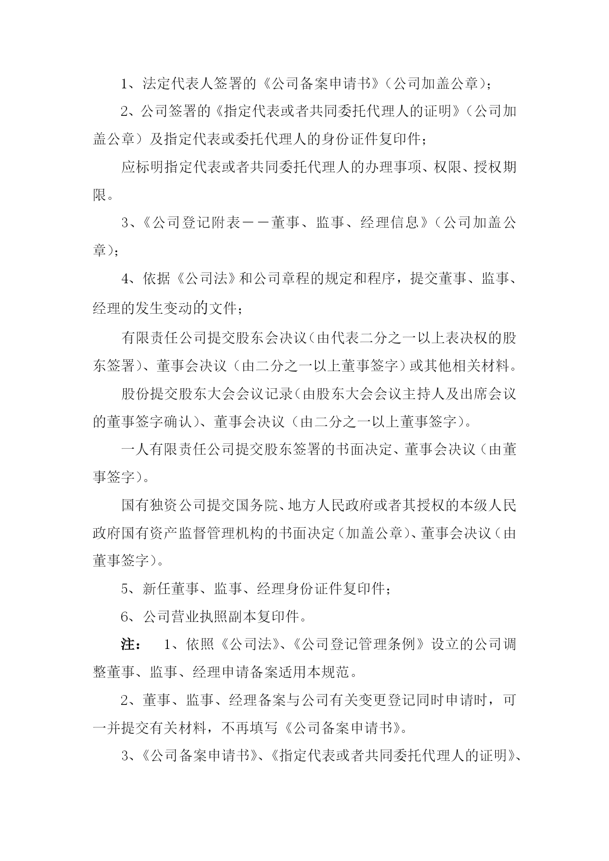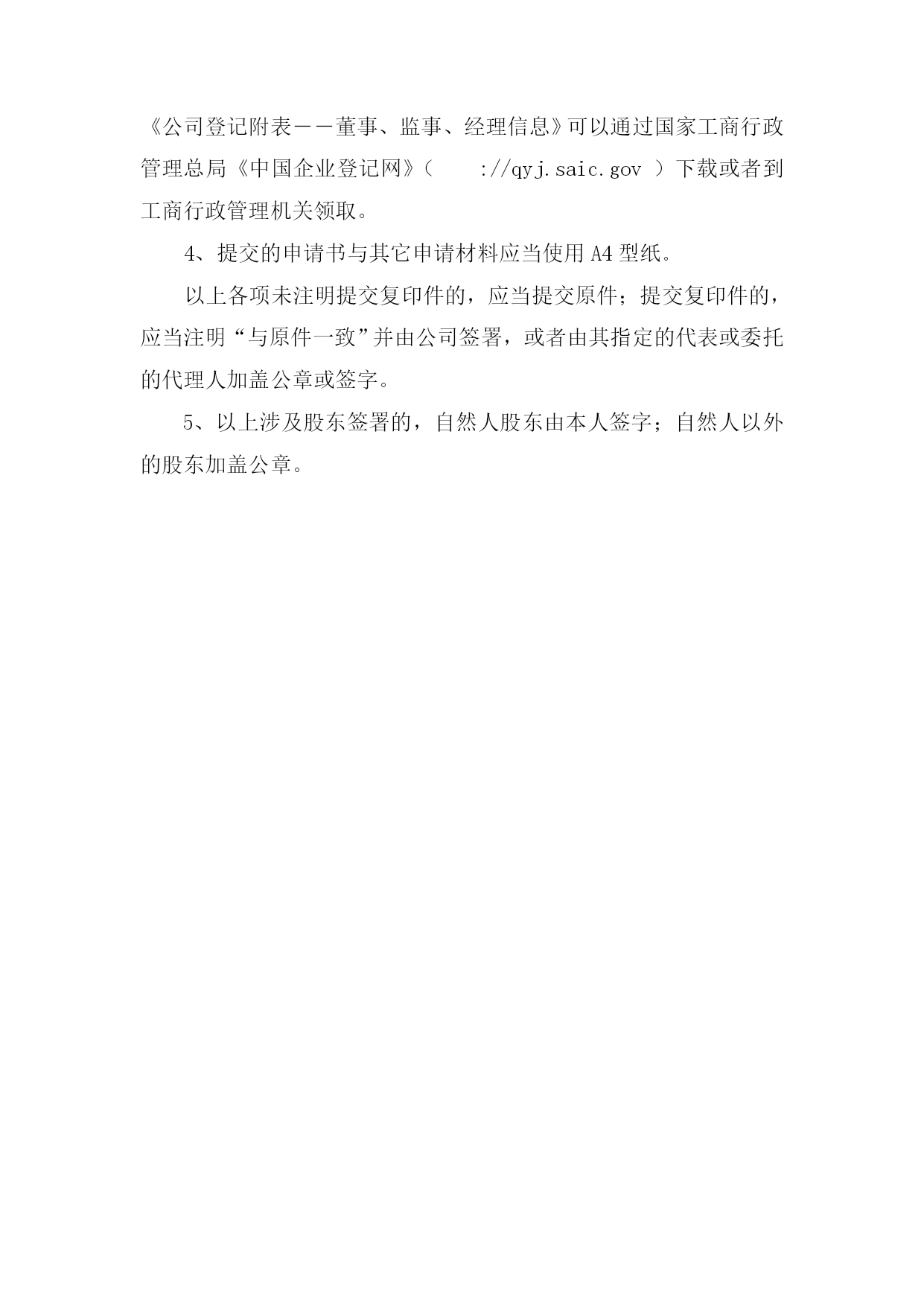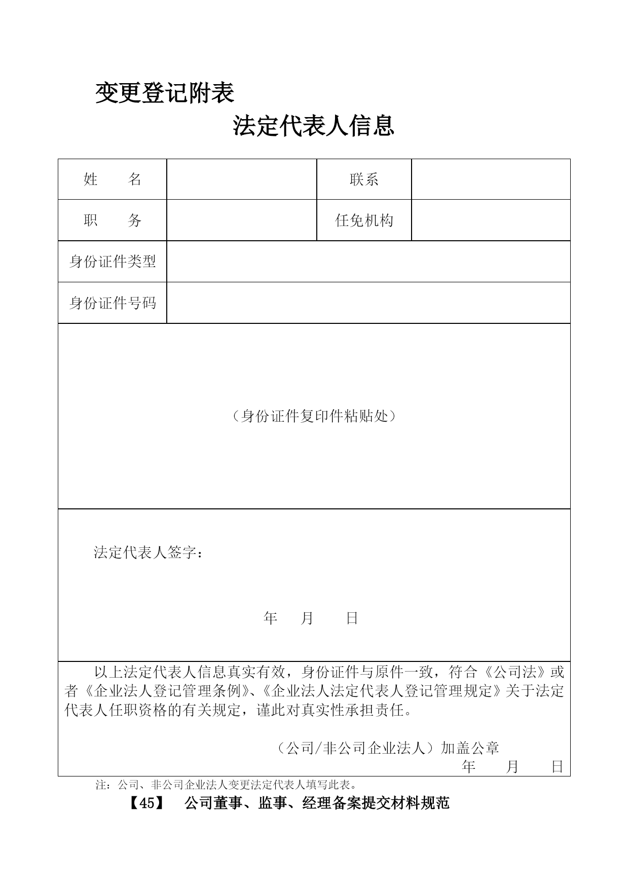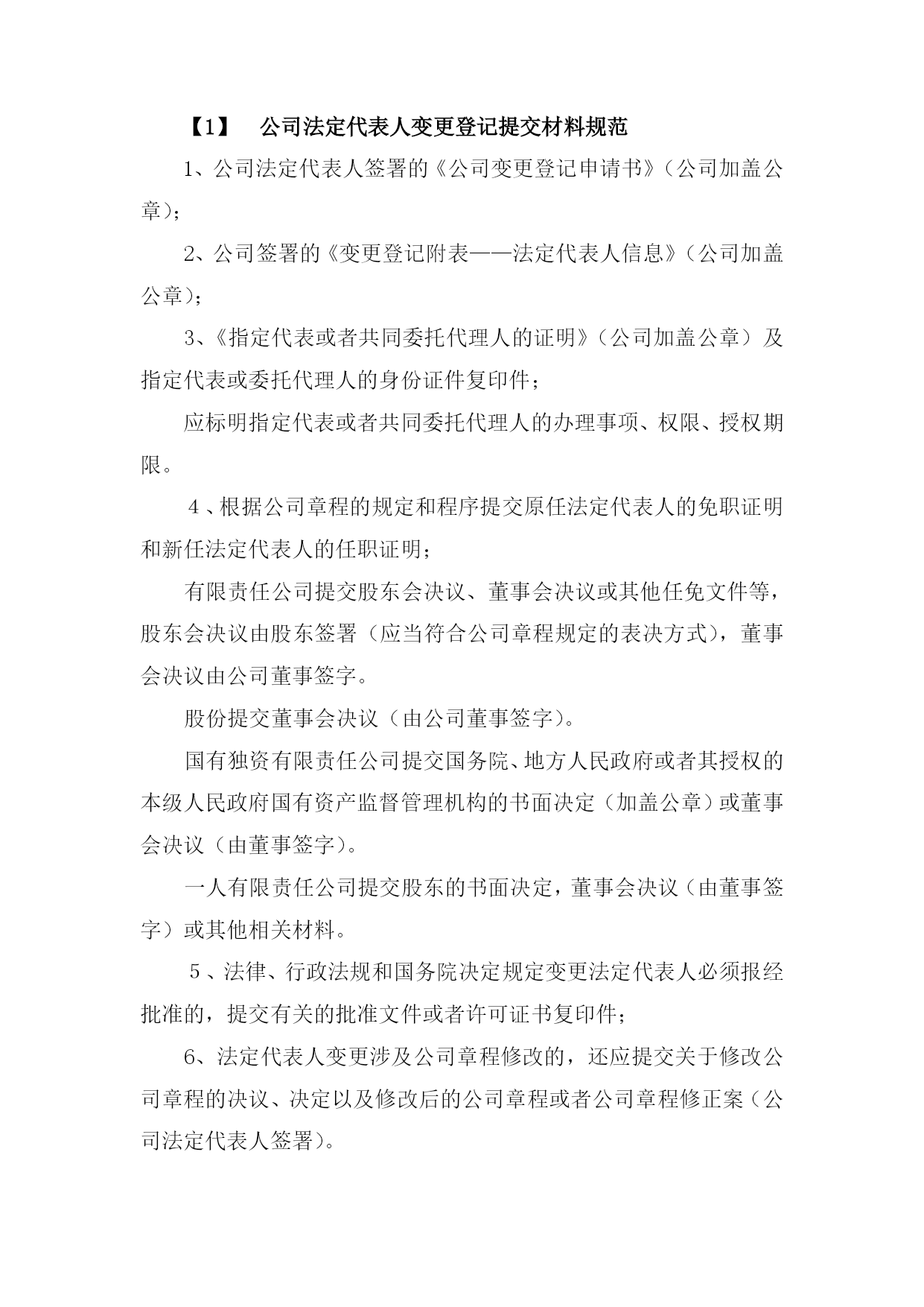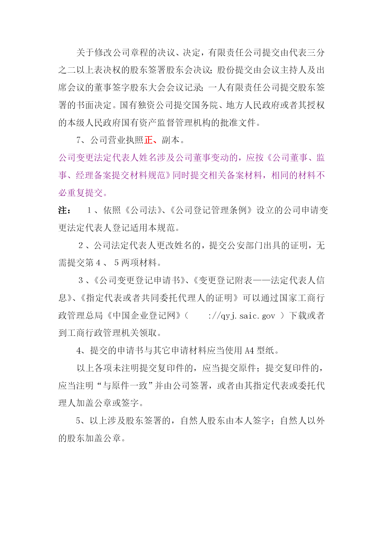 变更公司法定代表人优质资料(可以直接使用,可编辑优质资料,欢迎下载)【1】公司法定代表人变更登记提交材料规范1、公司法定代表人签署的《公司变更登记申请书》(公司加盖公章);2、公司签署的《变更登记附表——法定代表人信息》(公司加盖公章);3、《指定代表或者共同委托代理人的证明》(公司加盖公章)及指定代表或委托代理人的身份证件复印件;应标明指定代表或者共同委托代理人的办理事项、权限、授权期限。4、根据公司章程的规定和程序提交原任法定代表人的免职证明和新任法定代表人的任职证明;有限责任公司提交股东会决议、董事会决议或其他任免文件等,股东会决议由股东签署(应当符合公司章程规定的表决方式),董事会决议由公司董事签字。股份提交董事会决议(由公司董事签字)。国有独资有限责任公司提交国务院、地方人民政府或者其授权的本级人民政府国有资产监督管理机构的书面决定(加盖公章)或董事会决议(由董事签字)。一人有限责任公司提交股东的书面决定,董事会决议(由董事签字)或其他相关材料。5、法律、行政法规和国务院决定规定变更法定代表人必须报经批准的,提交有关的批准文件或者许可证书复印件;6、法定代表人变更涉及公司章程修改的,还应提交关于修改公司章程的决议、决定以及修改后的公司章程或者公司章程修正案(公司法定代表人签署)。关于修改公司章程的决议、决定,有限责任公司提交由代表三分之二以上表决权的股东签署股东会决议;股份提交由会议主持人及出席会议的董事签字股东大会会议记录;一人有限责任公司提交股东签署的书面决定。国有独资公司提交国务院、地方人民政府或者其授权的本级人民政府国有资产监督管理机构的批准文件。7、公司营业执照正、副本。公司变更法定代表人姓名涉及公司董事变动的,应按《公司董事、监事、经理备案提交材料规范》同时提交相关备案材料,相同的材料不必重复提交。注:1、依照《公司法》、《公司登记管理条例》设立的公司申请变更法定代表人登记适用本规范。2、公司法定代表人更改姓名的,提交公安部门出具的证明,无需提交第4、5两项材料。3、《公司变更登记申请书》、《变更登记附表——法定代表人信息》、《指定代表或者共同委托代理人的证明》可以通过国家工商行政管理总局《中国企业登记网》(://qyj.saic.gov)下载或者到工商行政管理机关领取。4、提交的申请书与其它申请材料应当使用A4型纸。以上各项未注明提交复印件的,应当提交原件;提交复印件的,应当注明“与原件一致”并由公司签署,或者由其指定代表或委托代理人加盖公章或签字。5、以上涉及股东签署的,自然人股东由本人签字;自然人以外的股东加盖公章。有限责任公司变更登记申请书注册号项目原登记事项申请变更登记事项名称住所邮政编码联系法定代表人姓名注册资本(万元)(万元)实收资本(万元)(万元)公司类型经营范围许可经营项目:一般经营项目:许可经营项目:一般经营项目:营业期限长期/年长期/年股东出资时间出资方式备案事项□董事□监事□经理□章程□章程修正案本公司依照《公司法》、《公司登记管理条例》申请变更登记,提交材料真实有效。谨此对真实性承担责任。公司盖章:法定代表人签字:年月日注:1、手工填写表格和签字请使用黑色或蓝黑色钢笔、毛笔或签字笔,请勿使用圆珠笔。2、原登记事项、申请变更登记事项均只填写申请变更的栏目。3、“股东”栏只填写股东名称或姓名,出资情况填写《有限责任公司变更登记附表――股东出资信息》。4、变更登记同时申请备案的无须提交《公司备案申请书》,请在“备案事项”栏的□中打√。申请变更法定代表人、注册资本、实收资本、股东出资方式或者同时申请董事、监事、经理备案的,应当分别提交《变更登记附表―法定代表人信息》、《有限责任公司变更登记附表――股东出资信息》、《公司变更登记附表―董事、监事、经理信息》。指定代表或者共同委托代理人的证明申请人:指定代表或者委托代理人:委托事项及权限:1、办理(企业名称)的□设立□变更□注销□备案□手续。2、同意□不同意□核对登记材料中的复印件并签署核对意见;3、同意□不同意□修改企业自备文件的错误;4、同意□不同意□修改有关表格的填写错误;5、同意□不同意□领取营业执照和有关文书。指定或者委托的有效期限:自年月日至年月日指定代表或委托代理人或者经办人信息签字:固定:移动:(指定代表或委托代理人、具体经办人身份证明复印件粘贴处)(申请人盖章或签字)年月日注:1、手工填写表格和签字请使用黑色或蓝黑色钢笔、毛笔或签字笔,请勿使用圆珠笔。2、设立登记,有限责任公司申请人为全体股东;国有独资公司申请人为国务院或地方人民政府国有资产监督管理机构;股份申请人为董事会;非公司企业