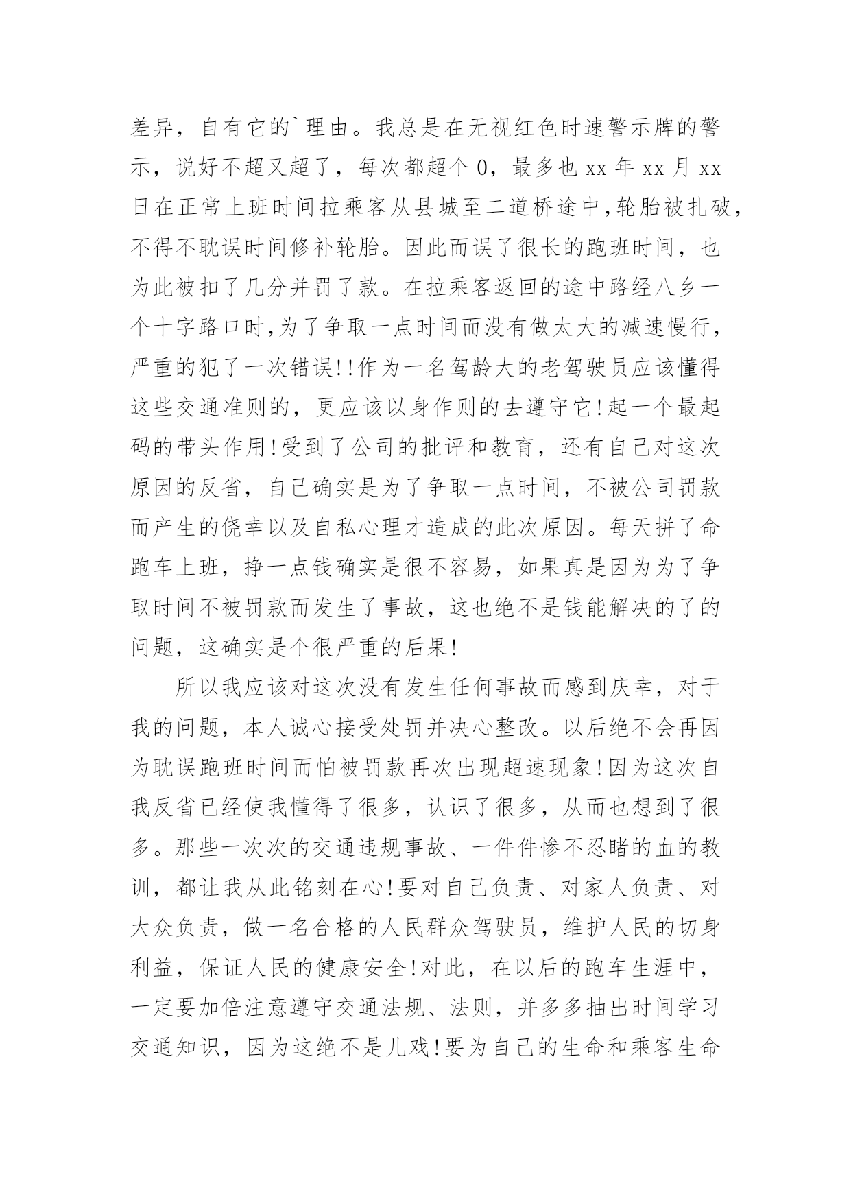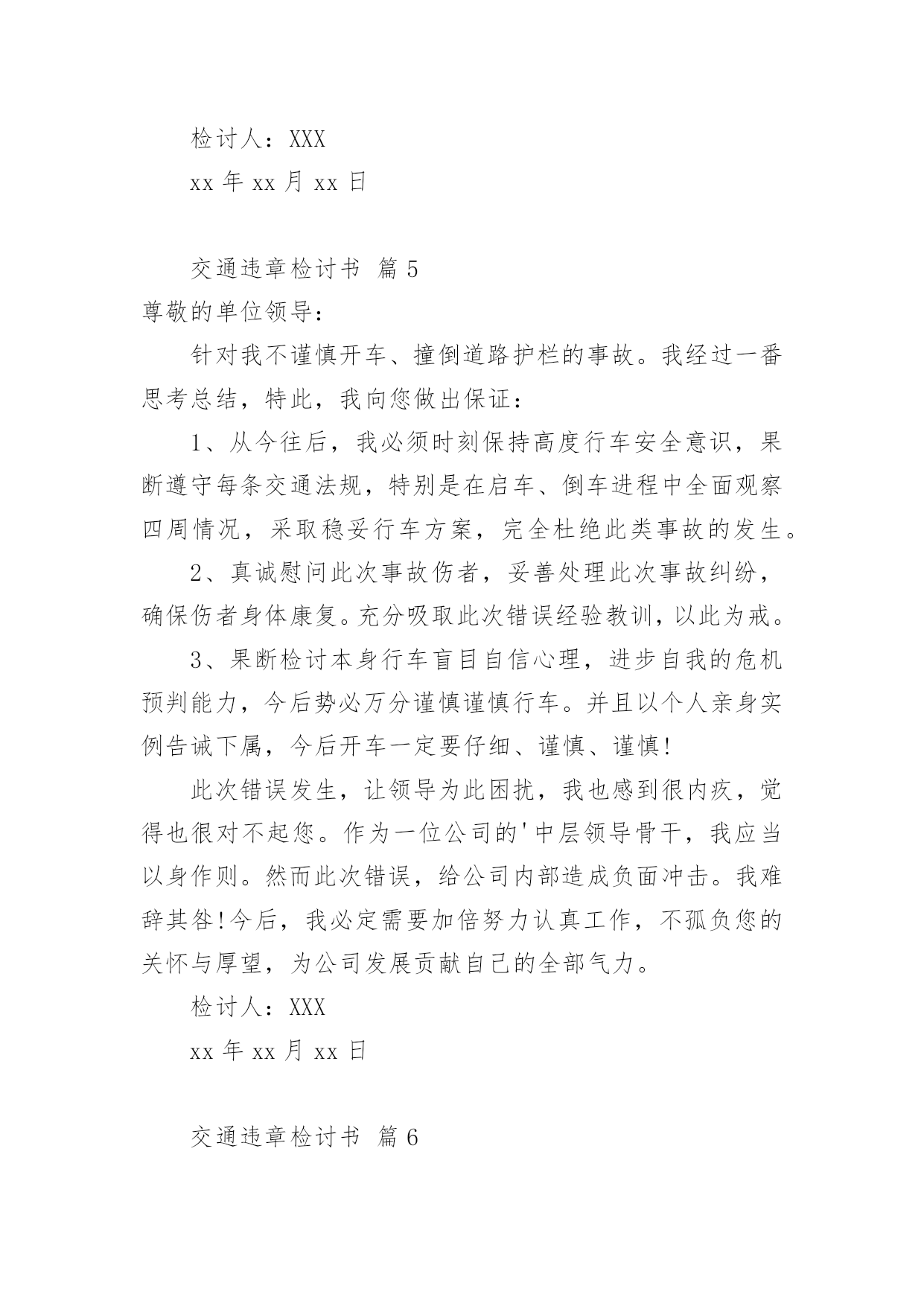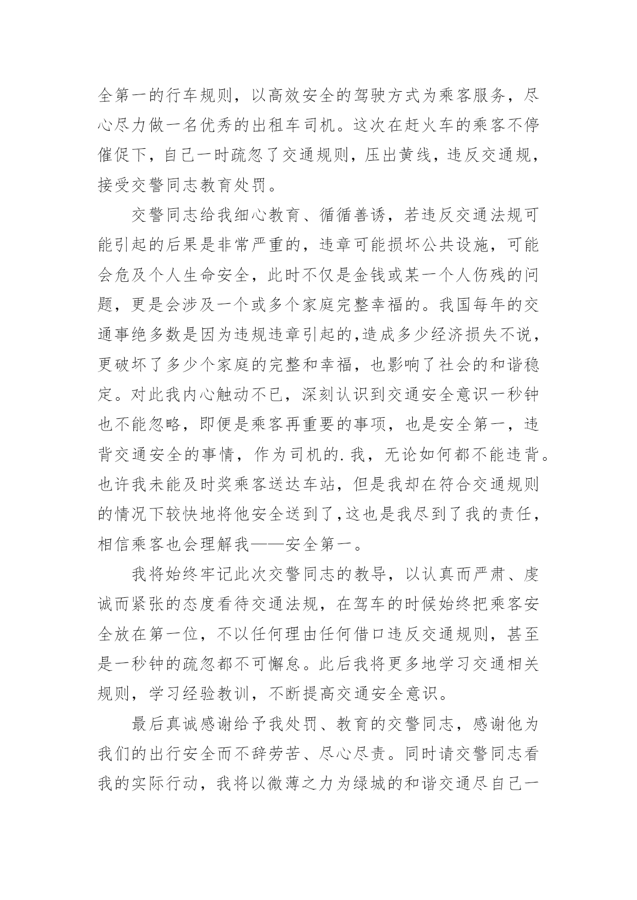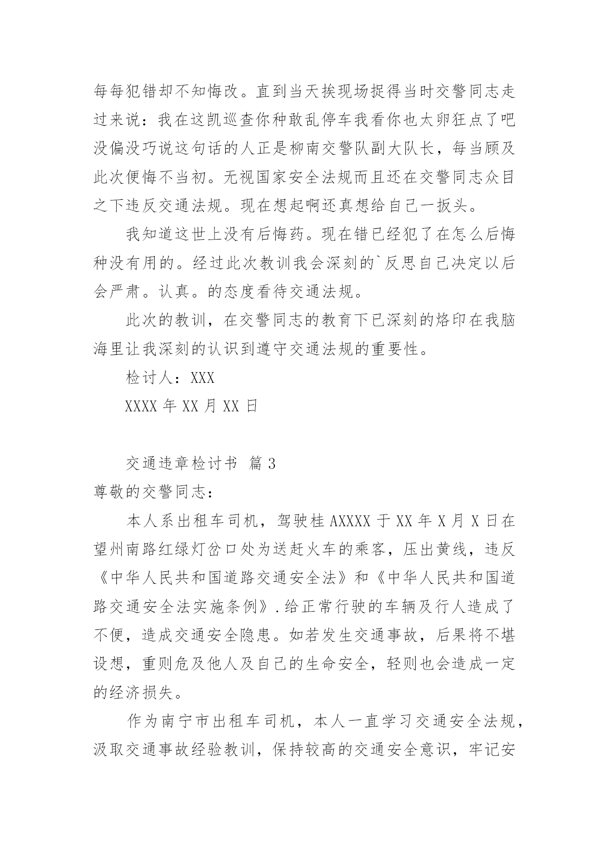 交通违章检讨书交通违章检讨书(精选20篇)在学习、工作、生活中犯错误以后,往往要写检讨书来自我悔悟,在写检讨书时要表明改错的决心。什么样的检讨书才是好的检讨书呢?以下是小编为大家整理的交通违章检讨书,仅供参考,希望能够帮助到大家。交通违章检讨书篇1尊敬的领导:写这份驾车时超速的检讨书的起由是因为鄙人开车技术不好,不好归不好,可在现在的国道线上,不好也能开个百八十码的。出于人性化考虑,在危险地段或者人群集中地方前都会限制一定的速度。今天我钱包在几天前落在我的包里,由于办事急需一些证件。本人驱车前往温州。乐清国道线这一段的电子监控我一般都比较熟悉,但俗话说的好,你防,但怎么也不防不住那些流动测速的!一个人坐在车上没有什么压力,所以开车比较放松,比较能发挥自己的水平。我很喜欢在最快的时间挂档。然后再尽可能的情况下全速前进。但此种状态下是在安全的前提下进行的。我不知道其他省市是什么样的,乐清给我的感觉就是时速在60-80kmh之间变来变去的频率太高了,我总是被玩耍,弄不清东西南北。经常把时速限制在60的地段当做80,可也奇怪,从未把时速限制在80的地段当60。不过,话又说回来,时速限制的差异,自有它的`理由。我总是在无视红色时速警示牌的警示,说好不超又超了,每次都超个0,最多也xx年xx月xx日在正常上班时间拉乘客从县城至二道桥途中,轮胎被扎破,不得不耽误时间修补轮胎。因此而误了很长的跑班时间,也为此被扣了几分并罚了款。在拉乘客返回的途中路经八乡一个十字路口时,为了争取一点时间而没有做太大的减速慢行,严重的犯了一次错误!!作为一名驾龄大的老驾驶员应该懂得这些交通准则的,更应该以身作则的去遵守它!起一个最起码的带头作用!受到了公司的批评和教育,还有自己对这次原因的反省,自己确实是为了争取一点时间,不被公司罚款而产生的侥幸以及自私心理才造成的此次原因。每天拼了命跑车上班,挣一点钱确实是很不容易,如果真是因为为了争取时间不被罚款而发生了事故,这也绝不是钱能解决的了的问题,这确实是个很严重的后果!所以我应该对这次没有发生任何事故而感到庆幸,对于我的问题,本人诚心接受处罚并决心整改。以后绝不会再因为耽误跑班时间而怕被罚款再次出现超速现象!因为这次自我反省已经使我懂得了很多,认识了很多,从而也想到了很多。那些一次次的交通违规事故、一件件惨不忍睹的血的教训,都让我从此铭刻在心!要对自己负责、对家人负责、对大众负责,做一名合格的人民群众驾驶员,维护人民的切身利益,保证人民的健康安全!对此,在以后的跑车生涯中,一定要加倍注意遵守交通法规、法则,并多多抽出时间学习交通知识,因为这绝不是儿戏!要为自己的生命和乘客生命的安全负责,超速是违法的行为,这严重危害人们的生命健康,这不利于社会的安定和谐,我很庆幸这件事被发现了,让我明白自己犯了一个多么严重的错误,我向领导保证,向大家保证,这件事绝对不会再发生!请领导相信,请大家放心!作为一名老驾驶员,一定要为自己和家人负责,更要为社会负责!在以后的行车期间,一定注意并加以改正!并认真学习新颁布的《中华人民共和国道路交通安全法》以及XX市交管部门颁布的各项规章制度,以此来提高自己的交通安全意识、安全驾驶理念和技能,为同行的新驾驶员起一个好的带头作用,让危险远离我们,愿平安伴随我们!为建设美丽和谐、幸福安康的察布查尔贡献自己行业的一份微薄之力!!检讨人:XXXxx年xx月xx日交通违章检讨书篇2尊敬的交警同志:由于本人驾车。乱停。乱靠违反了交通第xxx条法规给正常行驶的车辆及行人造成不便,虽然没发生什么交通事故。但也构成了严重的交通安全隐患。如果发生交通事故那后果将不堪设想。重则危及他人及自己的生命安全。轻则也会造成一定的经济损失影响了城市风貌。虽然这种行为不只一次。但我知道这种行为终有一天会挨捉。那是必然的结果一直都有预感。也许是侥幸心里作怪。每每犯错却不知悔改。直到当天挨现场捉得当时交警同志走过来说:我在这凯巡查你种敢乱停车我看你也太卵狂点了吧没偏没巧说这句话的人正是柳南交警队副大队长,每当顾及此次便悔不当初。无视国家安全法规而且还在交警同志众目之下违反交通法规。现在想起啊还真想给自己一扳头。我知道这世上没有后悔药。现在错已经犯了在怎么后悔种没有用的。经过此次教训我会深刻的`反思自己决定以后会严肃。认真。的态度看待交通法规。此次的教训,在交警同志的教育下已深刻的烙印在我脑海里让我深刻的认识到遵守交通法规的重要性。检讨人:XXXXXXX年XX月XX日交通违章检讨书篇3尊敬的交警同志:本人系出租车司机,驾驶桂AXXXX于XX年X月X日在望州南路红绿灯岔口处为送赶火车的乘客,压出黄线,违反《中华人民共和国道路交通安全法》和《中华人民共和国道路交通安全法实施条例》.给正常行驶的车辆及行人造成了不便,造成交通安全隐患。如