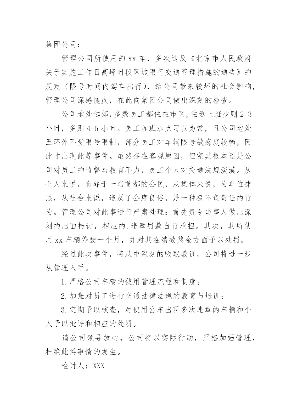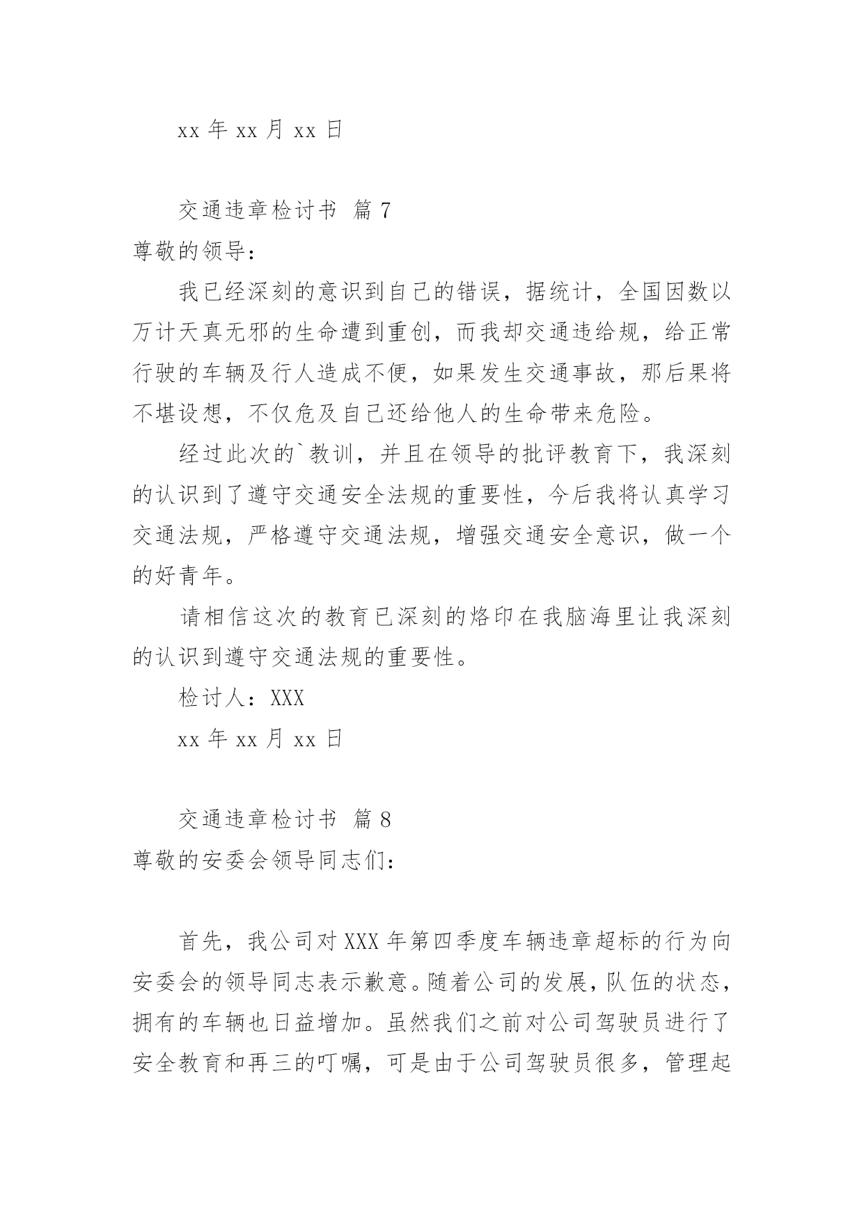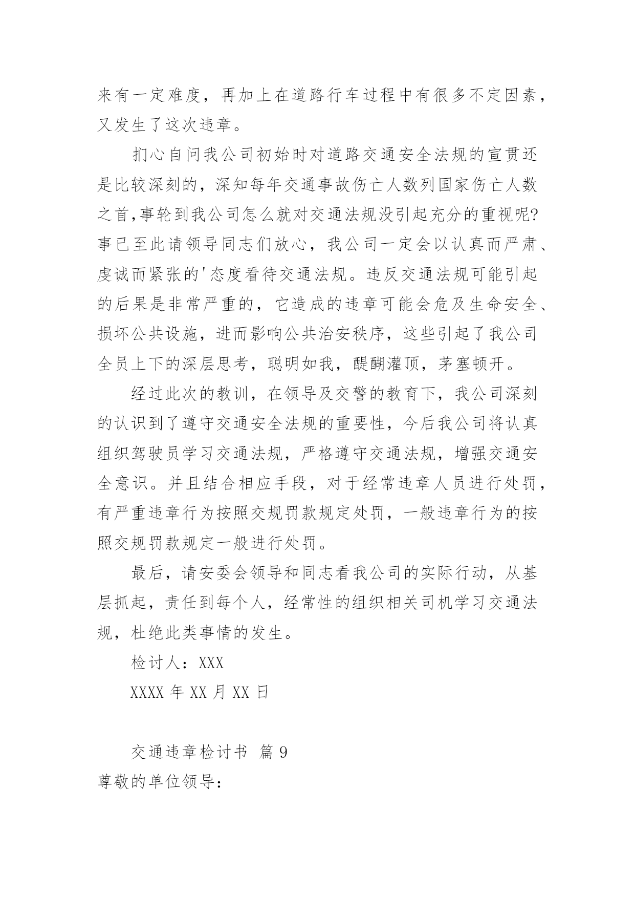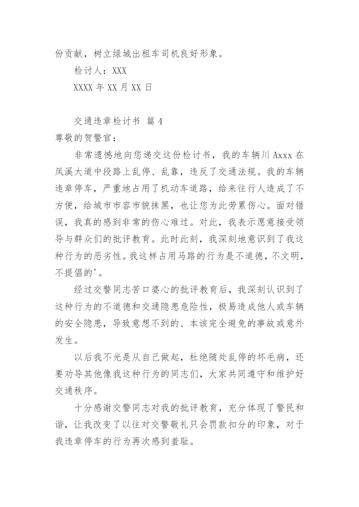 交通违章检讨书交通违章检讨书(精选20篇)在学习、工作、生活中犯错误以后,往往要写检讨书来自我悔悟,在写检讨书时要表明改错的决心。什么样的检讨书才是好的检讨书呢?以下是小编为大家整理的交通违章检讨书,仅供参考,希望能够帮助到大家。交通违章检讨书篇1尊敬的领导:写这份驾车时超速的检讨书的起由是因为鄙人开车技术不好,不好归不好,可在现在的国道线上,不好也能开个百八十码的。出于人性化考虑,在危险地段或者人群集中地方前都会限制一定的速度。今天我钱包在几天前落在我的包里,由于办事急需一些证件。本人驱车前往温州。乐清国道线这一段的电子监控我一般都比较熟悉,但俗话说的好,你防,但怎么也不防不住那些流动测速的!一个人坐在车上没有什么压力,所以开车比较放松,比较能发挥自己的水平。我很喜欢在最快的时间挂档。然后再尽可能的情况下全速前进。但此种状态下是在安全的前提下进行的。我不知道其他省市是什么样的,乐清给我的感觉就是时速在60-80kmh之间变来变去的频率太高了,我总是被玩耍,弄不清东西南北。经常把时速限制在60的地段当做80,可也奇怪,从未把时速限制在80的地段当60。不过,话又说回来,时速限制的差异,自有它的`理由。我总是在无视红色时速警示牌的警示,说好不超又超了,每次都超个0,最多也xx年xx月xx日在正常上班时间拉乘客从县城至二道桥途中,轮胎被扎破,不得不耽误时间修补轮胎。因此而误了很长的跑班时间,也为此被扣了几分并罚了款。在拉乘客返回的途中路经八乡一个十字路口时,为了争取一点时间而没有做太大的减速慢行,严重的犯了一次错误!!作为一名驾龄大的老驾驶员应该懂得这些交通准则的,更应该以身作则的去遵守它!起一个最起码的带头作用!受到了公司的批评和教育,还有自己对这次原因的反省,自己确实是为了争取一点时间,不被公司罚款而产生的侥幸以及自私心理才造成的此次原因。每天拼了命跑车上班,挣一点钱确实是很不容易,如果真是因为为了争取时间不被罚款而发生了事故,这也绝不是钱能解决的了的问题,这确实是个很严重的后果!所以我应该对这次没有发生任何事故而感到庆幸,对于我的问题,本人诚心接受处罚并决心整改。以后绝不会再因为耽误跑班时间而怕被罚款再次出现超速现象!因为这次自我反省已经使我懂得了很多,认识了很多,从而也想到了很多。那些一次次的交通违规事故、一件件惨不忍睹的血的教训,都让我从此铭刻在心!要对自己负责、对家人负责、对大众负责,做一名合格的人民群众驾驶员,维护人民的切身利益,保证人民的健康安全!对此,在以后的跑车生涯中,一定要加倍注意遵守交通法规、法则,并多多抽出时间学习交通知识,因为这绝不是儿戏!要为自己的生命和乘客生命的安全负责,超速是违法的行为,这严重危害人们的生命健康,这不利于社会的安定和谐,我很庆幸这件事被发现了,让我明白自己犯了一个多么严重的错误,我向领导保证,向大家保证,这件事绝对不会再发生!请领导相信,请大家放心!作为一名老驾驶员,一定要为自己和家人负责,更要为社会负责!在以后的行车期间,一定注意并加以改正!并认真学习新颁布的《中华人民共和国道路交通安全法》以及XX市交管部门颁布的各项规章制度,以此来提高自己的交通安全意识、安全驾驶理念和技能,为同行的新驾驶员起一个好的带头作用,让危险远离我们,愿平安伴随我们!为建设美丽和谐、幸福安康的察布查尔贡献自己行业的一份微薄之力!!检讨人:XXXxx年xx月xx日交通违章检讨书篇2尊敬的交警同志:由于本人驾车。乱停。乱靠违反了交通第xxx条法规给正常行驶的车辆及行人造成不便,虽然没发生什么交通事故。但也构成了严重的交通安全隐患。如果发生交通事故那后果将不堪设想。重则危及他人及自己的生命安全。轻则也会造成一定的经济损失影响了城市风貌。虽然这种行为不只一次。但我知道这种行为终有一天会挨捉。那是必然的结果一直都有预感。也许是侥幸心里作怪。每每犯错却不知悔改。直到当天挨现场捉得当时交警同志走过来说:我在这凯巡查你种敢乱停车我看你也太卵狂点了吧没偏没巧说这句话的人正是柳南交警队副大队长,每当顾及此次便悔不当初。无视国家安全法规而且还在交警同志众目之下违反交通法规。现在想起啊还真想给自己一扳头。我知道这世上没有后悔药。现在错已经犯了在怎么后悔种没有用的。经过此次教训我会深刻的`反思自己决定以后会严肃。认真。的态度看待交通法规。此次的教训,在交警同志的教育下已深刻的烙印在我脑海里让我深刻的认识到遵守交通法规的重要性。检讨人:XXXXXXX年XX月XX日交通违章检讨书篇3尊敬的交警同志:本人系出租车司机,驾驶桂AXXXX于XX年X月X日在望州南路红绿灯岔口处为送赶火车的乘客,压出黄线,违反《中华人民共和国道路交通安全法》和《中华人民共和国道路交通安全法实施条例》.给正常行驶的车辆及行人造成了不便,造成交通安全隐患。如