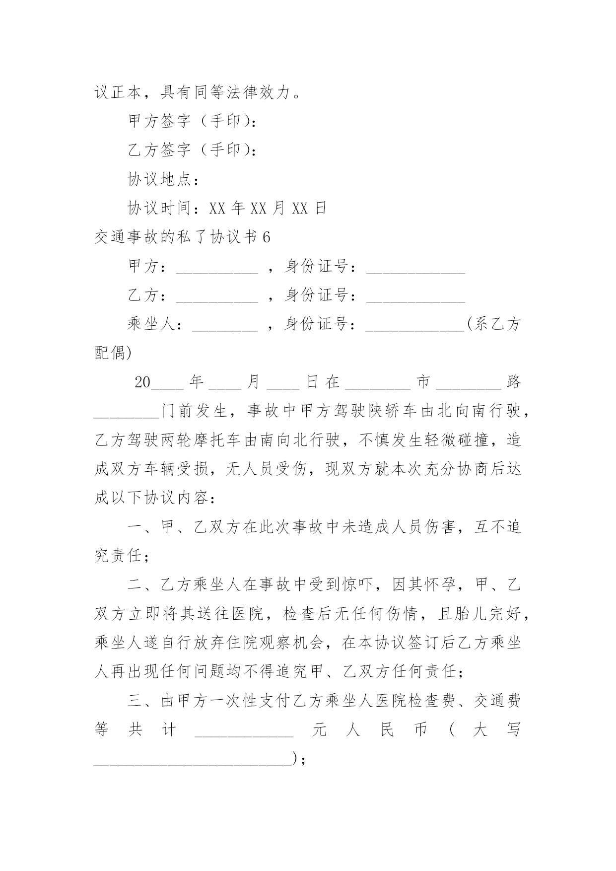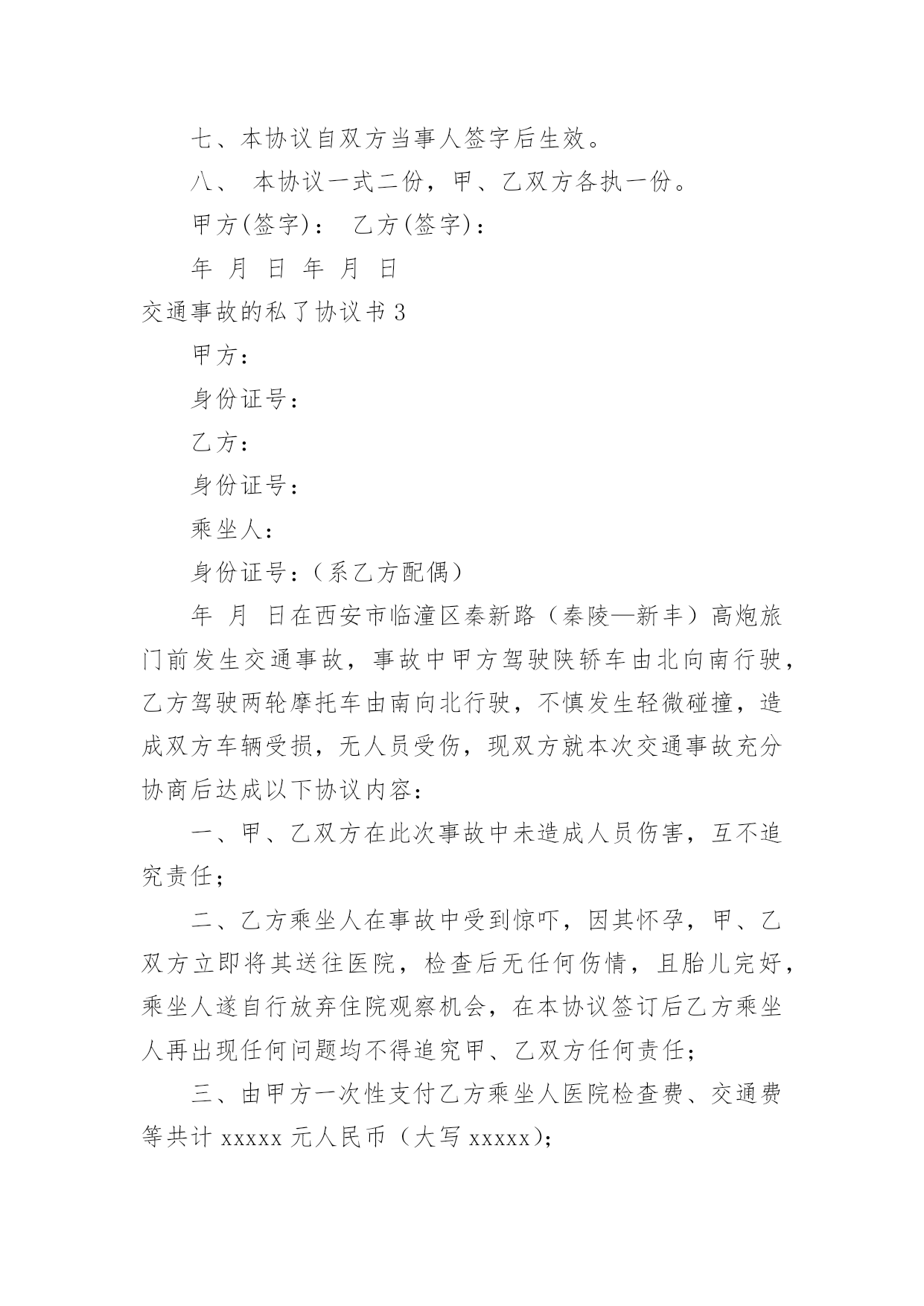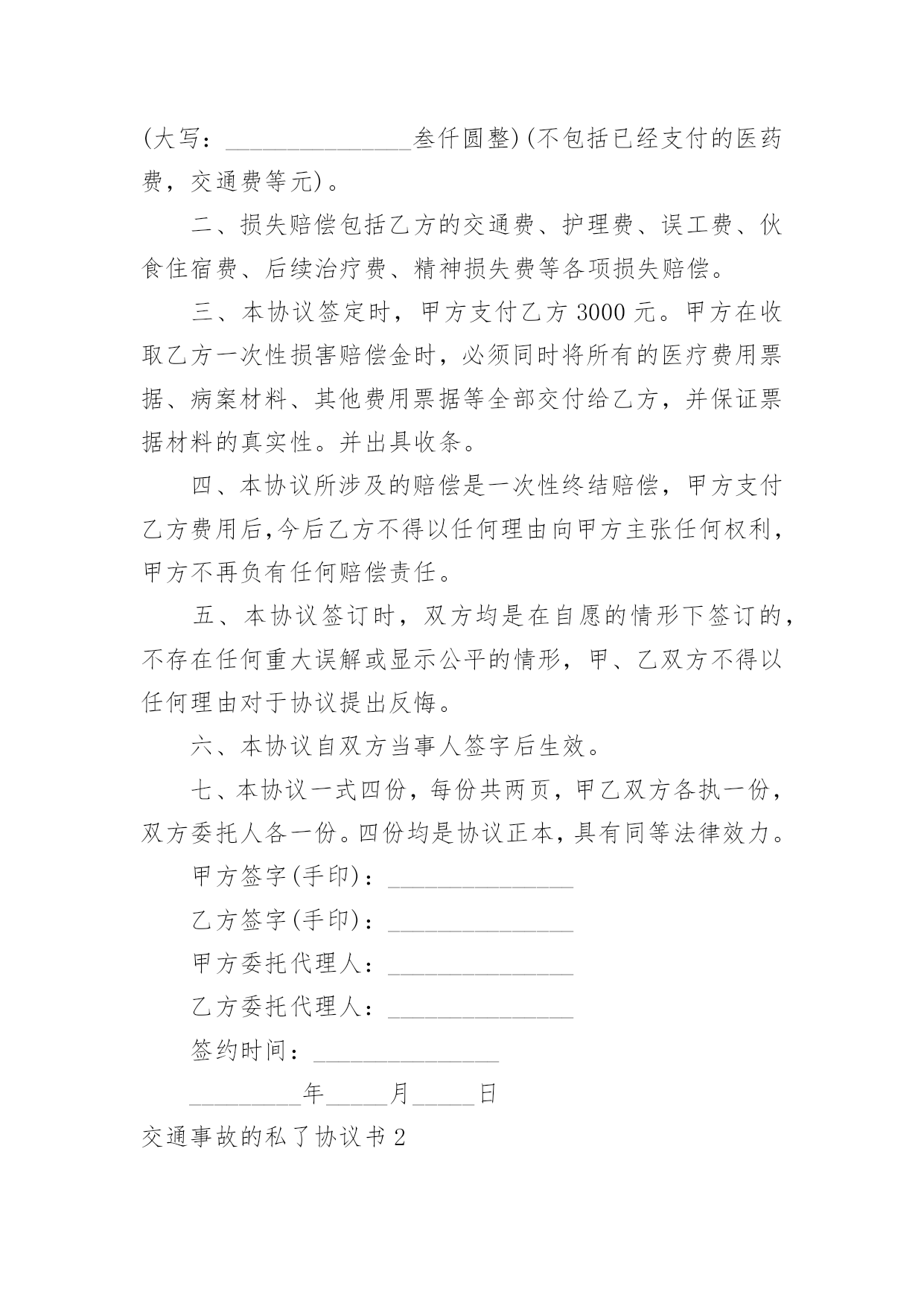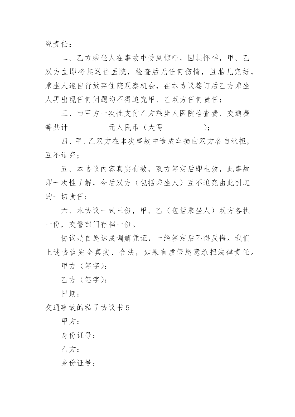交通事故的私了协议书交通事故的私了协议书在现实社会中,很多场合都离不了协议,签订协议是提高经济效益的手段。写协议需要注意哪些问题呢?以下是小编为大家收集的交通事故的私了协议书,欢迎大家借鉴与参考,希望对大家有所帮助。交通事故的私了协议书1甲方:_______________身份证号:_______________甲方委托代理人:_______________身份证号:_______________乙方:_______________身份证号:_______________乙方委托代理人:_______________身份证号:_________________________年_____月_____日_____时左右,甲方驾驶摩托车在哈拉木头与张家营子路段与乙方发生刮碰,事后,甲方及时送乙方去医院进行了ct,_____光机及b超检查,经诊断为软组织损伤,没有造成器官损伤及其他身体伤害。甲乙双方经平等协商,就乙方损失自愿达成一次性赔偿协议,现依据国家法律和相关规定,对具体的赔偿事项和双方权利义务明确如下,双方须谨遵恪守:一、甲方自愿赔偿给乙方各项损失共计3000元人民币(大写:_______________叁仟圆整)(不包括已经支付的医药费,交通费等元)。二、损失赔偿包括乙方的交通费、护理费、误工费、伙食住宿费、后续治疗费、精神损失费等各项损失赔偿。三、本协议签定时,甲方支付乙方3000元。甲方在收取乙方一次性损害赔偿金时,必须同时将所有的医疗费用票据、病案材料、其他费用票据等全部交付给乙方,并保证票据材料的真实性。并出具收条。四、本协议所涉及的赔偿是一次性终结赔偿,甲方支付乙方费用后,今后乙方不得以任何理由向甲方主张任何权利,甲方不再负有任何赔偿责任。五、本协议签订时,双方均是在自愿的情形下签订的,不存在任何重大误解或显示公平的情形,甲、乙双方不得以任何理由对于协议提出反悔。六、本协议自双方当事人签字后生效。七、本协议一式四份,每份共两页,甲乙双方各执一份,双方委托人各一份。四份均是协议正本,具有同等法律效力。甲方签字(手印):_______________乙方签字(手印):_______________甲方委托代理人:_______________乙方委托代理人:_______________签约时间:________________________年_____月_____日交通事故的私了协议书2甲方:***乙方:***对于***年**月**日发生的交通事故,经甲、乙双方充分协商一致达成如下协议:一、甲方自愿赔偿给乙方各项损失共计45000.00元人民币(包括已经支付的xxx0.00元)。二、损失赔偿包括乙方的交通费、护理费、误工费、伙食住宿费、被扶养人生活费、后续治疗费、精神损失费、残疾赔偿金等各项损失赔偿。三、本协议签定时,甲方支付乙方xxx00.00元,余款在乙方配合甲方向保险公司理赔后,支付给乙方。乙方的具体配合工作是指本协议第七条的约定。乙方不配合甲方工作的,甲方有权拒绝支付剩余款项。四、本协议所涉及的赔偿是一次性终结赔偿,甲方支付乙方费用后,今后乙方不得以任何理由向甲方主张任何权利,甲方不再负有任何赔偿责任。五、本协议签订时,双方均是在自愿的情形下签订的,不存在任何重大误解或显示公平的情形,甲、乙双方不得以任何理由对于协议提出反悔。六、在甲方赔偿乙方后,在甲方向保险公司理赔时,乙方应积极配合甲方和保险公司的工作,内容包括做伤残鉴定、提供所有票据等等,如果因为乙方不配合甲方的工作造成了甲方不能向保险公司理赔时,乙方应当返还相当于保险公司理赔给甲方的金额。七、本协议自双方当事人签字后生效。八、本协议一式二份,甲、乙双方各执一份。甲方(签字):乙方(签字):年月日年月日交通事故的私了协议书3甲方:身份证号:乙方:身份证号:乘坐人:身份证号:(系乙方配偶)年月日在西安市临潼区秦新路(秦陵—新丰)高炮旅门前发生交通事故,事故中甲方驾驶陕轿车由北向南行驶,乙方驾驶两轮摩托车由南向北行驶,不慎发生轻微碰撞,造成双方车辆受损,无人员受伤,现双方就本次交通事故充分协商后达成以下协议内容:一、甲、乙双方在此次事故中未造成人员伤害,互不追究责任;二、乙方乘坐人在事故中受到惊吓,因其怀孕,甲、乙双方立即将其送往医院,检查后无任何伤情,且胎儿完好,乘坐人遂自行放弃住院观察机会,在本协议签订后乙方乘坐人再出现任何问题均不得追究甲、乙双方任何责任;三、由甲方一次性支付乙方乘坐人医院检查费、交通费等共计xxxxx元人民币(大写xxxxx);四、甲、乙双方在本次事故中造成车损由双方各自承担,互不追究;五、本协议内容真实有效,双方签定后即生效,此事故即一次性了解,今后双方(包括乘坐人)互不追究由此引起的一切责任;六、本协议一式三份,甲、乙(包括