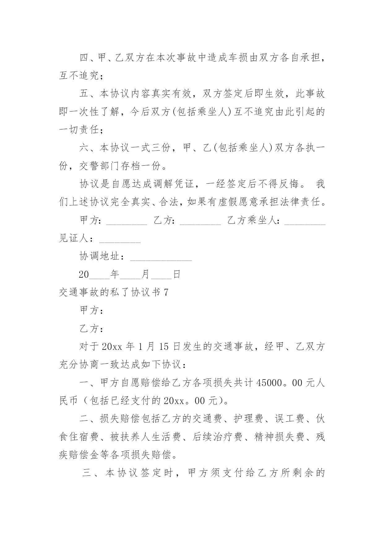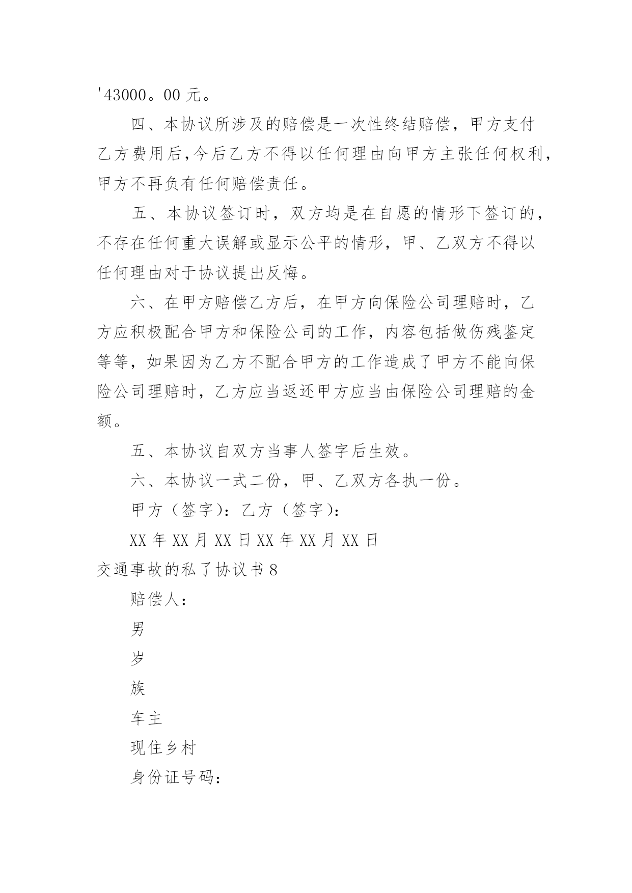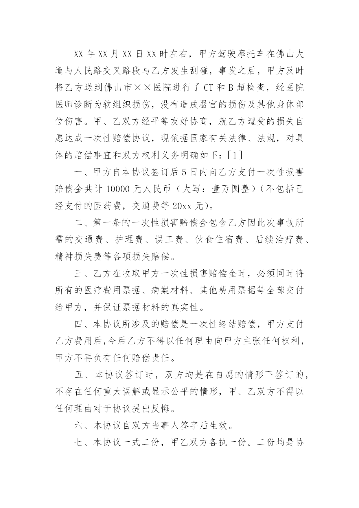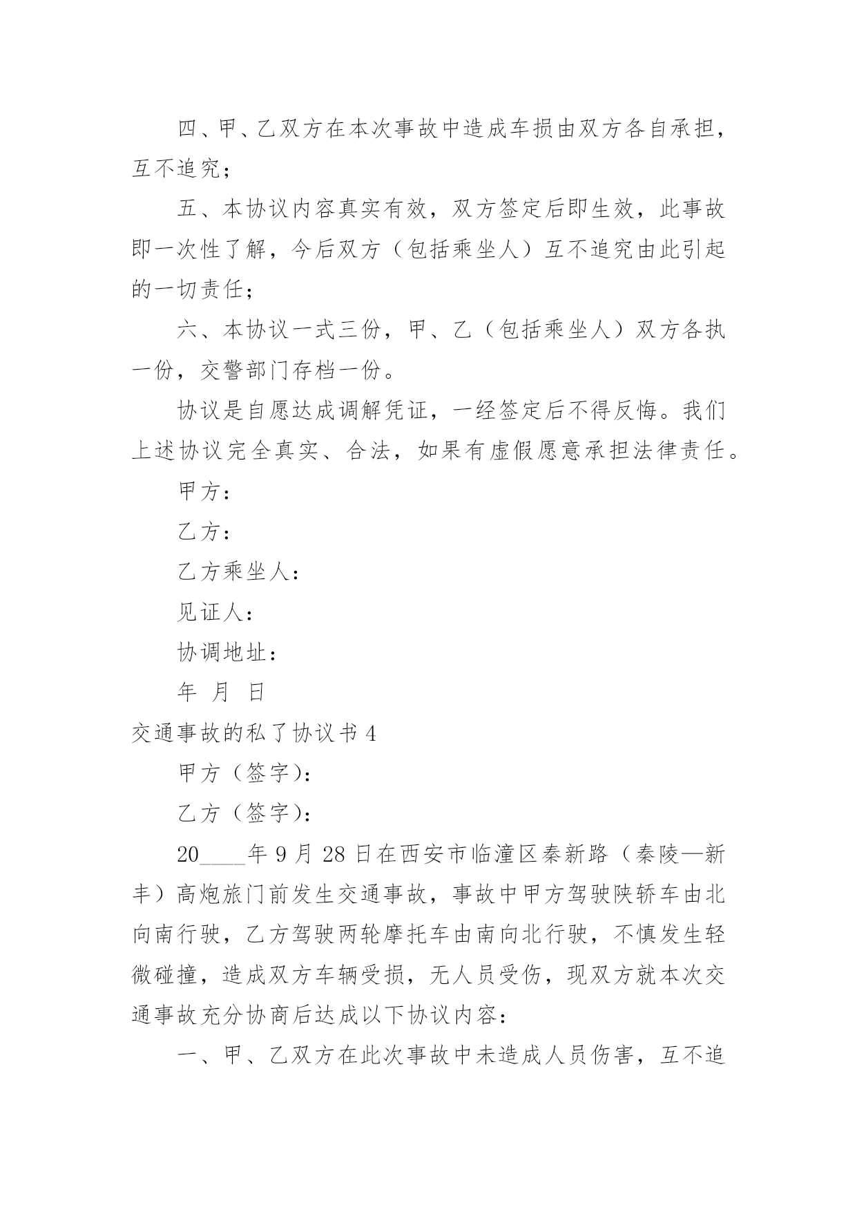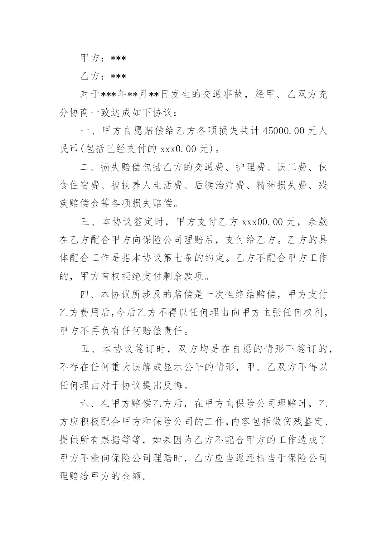 交通事故的私了协议书交通事故的私了协议书在现实社会中,很多场合都离不了协议,签订协议是提高经济效益的手段。写协议需要注意哪些问题呢?以下是小编为大家收集的交通事故的私了协议书,欢迎大家借鉴与参考,希望对大家有所帮助。交通事故的私了协议书1甲方:_______________身份证号:_______________甲方委托代理人:_______________身份证号:_______________乙方:_______________身份证号:_______________乙方委托代理人:_______________身份证号:_________________________年_____月_____日_____时左右,甲方驾驶摩托车在哈拉木头与张家营子路段与乙方发生刮碰,事后,甲方及时送乙方去医院进行了ct,_____光机及b超检查,经诊断为软组织损伤,没有造成器官损伤及其他身体伤害。甲乙双方经平等协商,就乙方损失自愿达成一次性赔偿协议,现依据国家法律和相关规定,对具体的赔偿事项和双方权利义务明确如下,双方须谨遵恪守:一、甲方自愿赔偿给乙方各项损失共计3000元人民币(大写:_______________叁仟圆整)(不包括已经支付的医药费,交通费等元)。二、损失赔偿包括乙方的交通费、护理费、误工费、伙食住宿费、后续治疗费、精神损失费等各项损失赔偿。三、本协议签定时,甲方支付乙方3000元。甲方在收取乙方一次性损害赔偿金时,必须同时将所有的医疗费用票据、病案材料、其他费用票据等全部交付给乙方,并保证票据材料的真实性。并出具收条。四、本协议所涉及的赔偿是一次性终结赔偿,甲方支付乙方费用后,今后乙方不得以任何理由向甲方主张任何权利,甲方不再负有任何赔偿责任。五、本协议签订时,双方均是在自愿的情形下签订的,不存在任何重大误解或显示公平的情形,甲、乙双方不得以任何理由对于协议提出反悔。六、本协议自双方当事人签字后生效。七、本协议一式四份,每份共两页,甲乙双方各执一份,双方委托人各一份。四份均是协议正本,具有同等法律效力。甲方签字(手印):_______________乙方签字(手印):_______________甲方委托代理人:_______________乙方委托代理人:_______________签约时间:________________________年_____月_____日交通事故的私了协议书2甲方:***乙方:***对于***年**月**日发生的交通事故,经甲、乙双方充分协商一致达成如下协议:一、甲方自愿赔偿给乙方各项损失共计45000.00元人民币(包括已经支付的xxx0.00元)。二、损失赔偿包括乙方的交通费、护理费、误工费、伙食住宿费、被扶养人生活费、后续治疗费、精神损失费、残疾赔偿金等各项损失赔偿。三、本协议签定时,甲方支付乙方xxx00.00元,余款在乙方配合甲方向保险公司理赔后,支付给乙方。乙方的具体配合工作是指本协议第七条的约定。乙方不配合甲方工作的,甲方有权拒绝支付剩余款项。四、本协议所涉及的赔偿是一次性终结赔偿,甲方支付乙方费用后,今后乙方不得以任何理由向甲方主张任何权利,甲方不再负有任何赔偿责任。五、本协议签订时,双方均是在自愿的情形下签订的,不存在任何重大误解或显示公平的情形,甲、乙双方不得以任何理由对于协议提出反悔。六、在甲方赔偿乙方后,在甲方向保险公司理赔时,乙方应积极配合甲方和保险公司的工作,内容包括做伤残鉴定、提供所有票据等等,如果因为乙方不配合甲方的工作造成了甲方不能向保险公司理赔时,乙方应当返还相当于保险公司理赔给甲方的金额。七、本协议自双方当事人签字后生效。八、本协议一式二份,甲、乙双方各执一份。甲方(签字):乙方(签字):年月日年月日交通事故的私了协议书3甲方:身份证号:乙方:身份证号:乘坐人:身份证号:(系乙方配偶)年月日在西安市临潼区秦新路(秦陵—新丰)高炮旅门前发生交通事故,事故中甲方驾驶陕轿车由北向南行驶,乙方驾驶两轮摩托车由南向北行驶,不慎发生轻微碰撞,造成双方车辆受损,无人员受伤,现双方就本次交通事故充分协商后达成以下协议内容:一、甲、乙双方在此次事故中未造成人员伤害,互不追究责任;二、乙方乘坐人在事故中受到惊吓,因其怀孕,甲、乙双方立即将其送往医院,检查后无任何伤情,且胎儿完好,乘坐人遂自行放弃住院观察机会,在本协议签订后乙方乘坐人再出现任何问题均不得追究甲、乙双方任何责任;三、由甲方一次性支付乙方乘坐人医院检查费、交通费等共计xxxxx元人民币(大写xxxxx);四、甲、乙双方在本次事故中造成车损由双方各自承担,互不追究;五、本协议内容真实有效,双方签定后即生效,此事故即一次性了解,今后双方(包括乘坐人)互不追究由此引起的一切责任;六、本协议一式三份,甲、乙(包括
