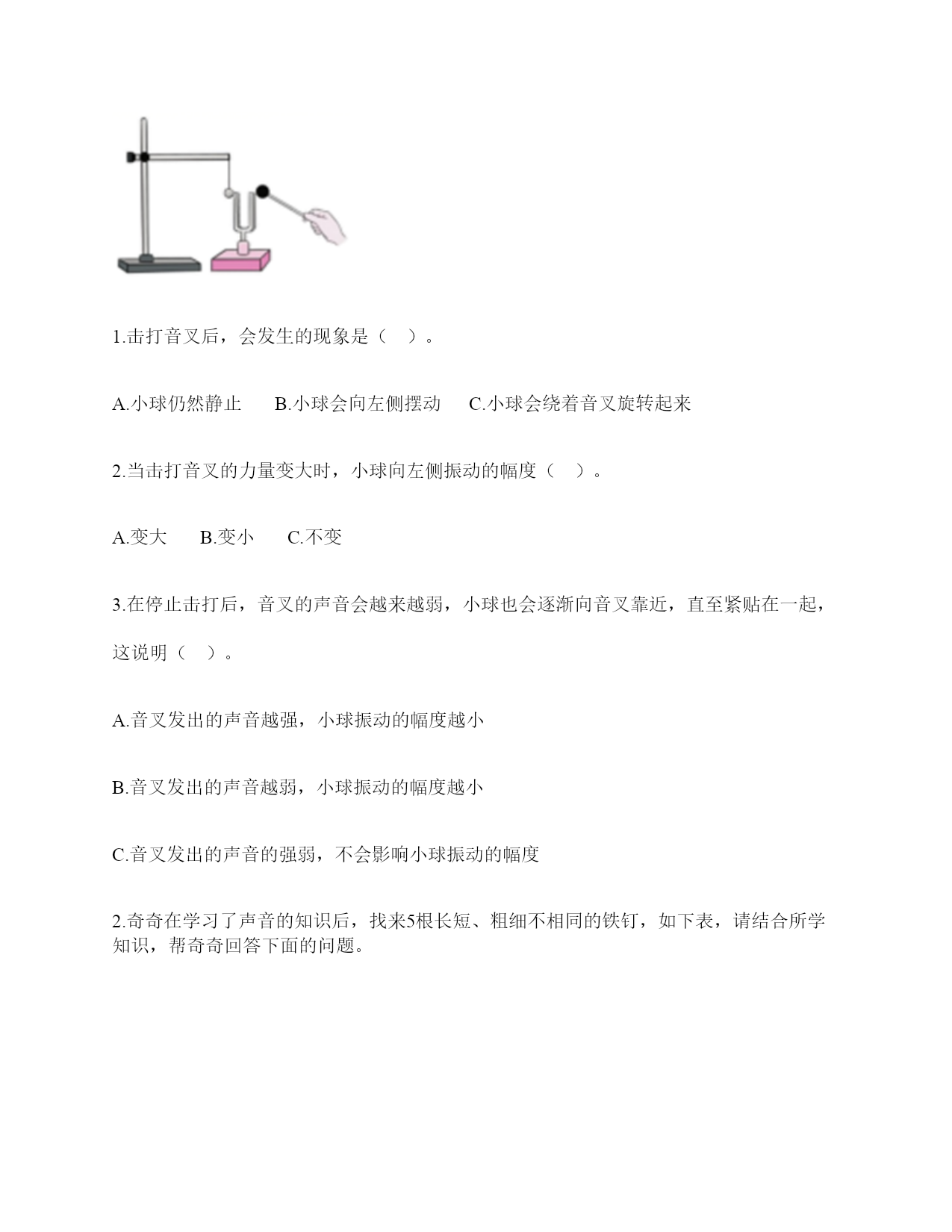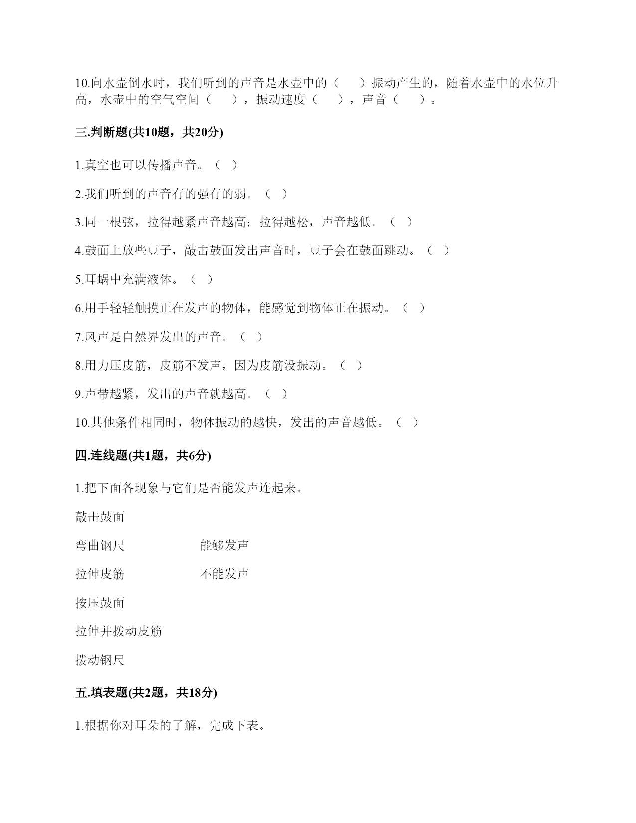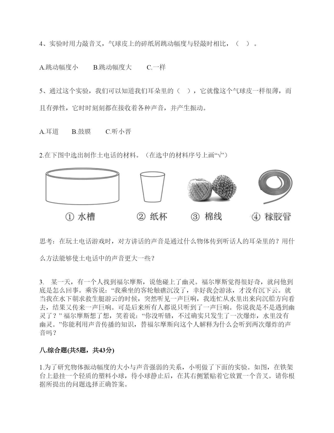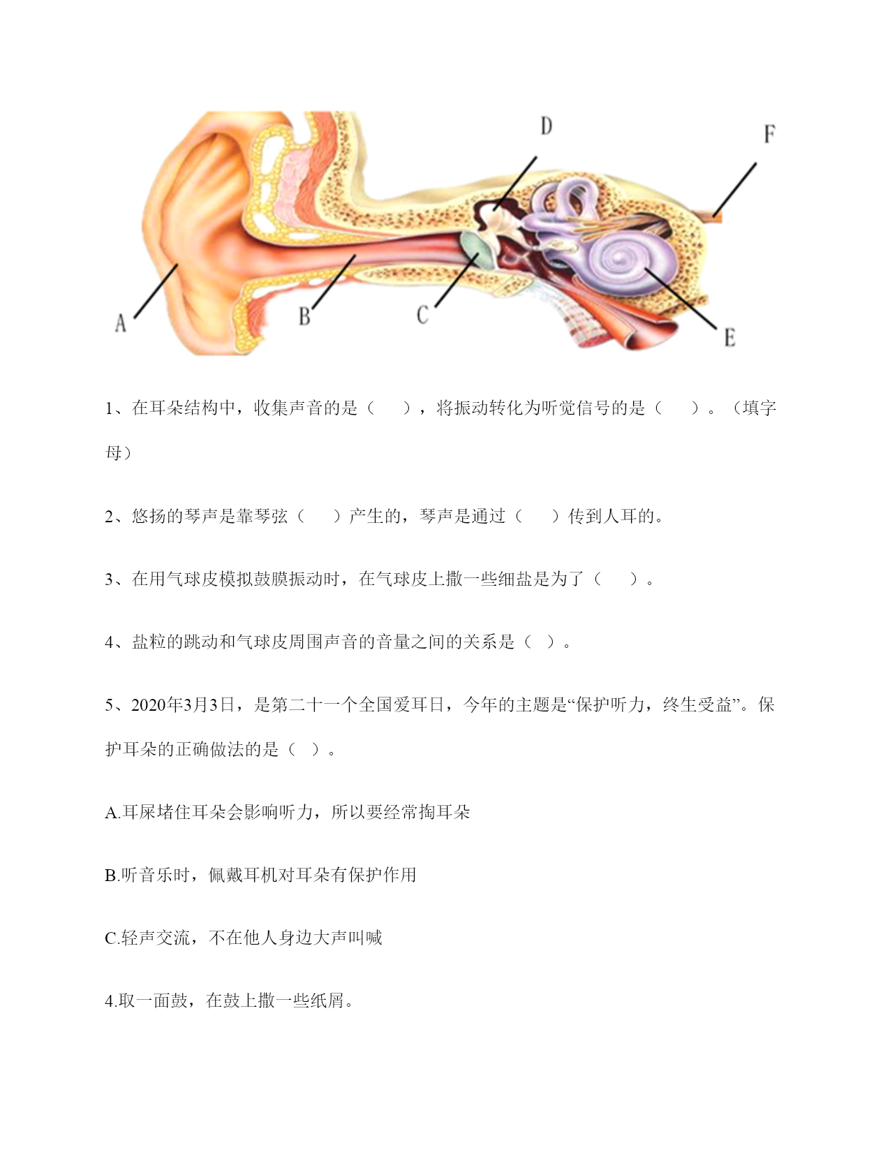 小学科学《声音》综合练习题一.选择题(共10题,共20分)1.在《风桥夜泊》中有这样的诗句:“姑苏城外寒山寺,夜半钟声到客船。”钟声是通过()传播到船舱内诗人的耳中的。A.传声B.导电C.通风2.古琴是我国历史悠久的乐器,由7根长短相同、粗细不同的弦组成。小雅弹古琴时,要使它发出的声音更响一些,可以()。A.弹更粗的琴弦B.弹得更用力一些C.轻轻地弹3.电视机的声音太小了,用遥控器把声音调大了一些。在这个过程中,电视机的()。A.声音强弱发生了变化B.声音高低发生了变化C.声音音色发生了变化4.想要研究“物体发出声音的高低与物体粗细的关系”,应该选用的实验材料是()。A.B.C.5.在我们耳朵里,时时刻刻都在接收各种声音并产生振动的结构是()。A.鼓膜B.听小骨C.听觉神经6.声音传播的特点有()。A.不能在液体中传播B.能在各种物体中传播C.只能在空气中传播7.歌手唱到高音时,声带振动的速度()。A.慢B.快C.不快也不慢8.下列现象中,说明声音能在液体中传播的是()。A.鱼被岸上的脚步声吓走B.游客听到瀑布倾泻而下的声音C.海边的人听到海浪拍击岩石的声音9.下面几种做法中,()不能发出声音。A.敲击鼓面B.弹奏钢琴C.按压皮筋10.流星落在地球上会产生巨大的声音,但它落在月球上,即使宇航员就在附近也听不到声音,这是因为()。A.撞击声太小,人耳无法听到B.月球表面没有空气,声音无法传播C.月球受到撞击时不产生振动二.填空题(共10题,共44分)1.当我们发声时,声带变(),并快速振动,产生()。2.图中的喇叭在“唱歌”,纸屑在上下跳动。这个现象说明喇叭发声时在不停地()。3.声音的()可以用音高来描述,音高是由物体振动的()决定的。振动越快,发出的声音就();振动越慢,发出的声音就()。单位:赫兹(HZ),它表示物体一秒钟振动的()。4.吹竖笛的时候是()在振动。5.声音的产生是由()引起的。6.用不同的力拨动钢尺、()等,都可以说明物体振动幅度大小和声音强弱的关系。7.外界的声音引起()的振动,()将振动传达到(),并刺激()产生信号,()接收到信号,我们就听到了声音。8.()是传播声音的重要物质,在真空的环境中不能传播声音。9.一个物体,如音叉、钢尺等,在力的作用下,能不断重复地做往返运动,这个物体就是一个()物体。10.向水壶倒水时,我们听到的声音是水壶中的()振动产生的,随着水壶中的水位升高,水壶中的空气空间(),振动速度(),声音()。三.判断题(共10题,共20分)1.真空也可以传播声音。()2.我们听到的声音有的强有的弱。()3.同一根弦,拉得越紧声音越高;拉得越松,声音越低。()4.鼓面上放些豆子,敲击鼓面发出声音时,豆子会在鼓面跳动。()5.耳蜗中充满液体。()6.用手轻轻触摸正在发声的物体,能感觉到物体正在振动。()7.风声是自然界发出的声音。()8.用力压皮筋,皮筋不发声,因为皮筋没振动。()9.声带越紧,发出的声音就越高。()10.其他条件相同时,物体振动的越快,发出的声音越低。()四.连线题(共1题,共6分)1.把下面各现象与它们是否能发声连起来。敲击鼓面弯曲钢尺能够发声拉伸皮筋不能发声按压鼓面拉伸并拨动皮筋拨动钢尺五.填表题(共2题,共18分)1.根据你对耳朵的了解,完成下表。2.探究尺子发出声音的音高变化实验记录表。六.简答题(共5题,共26分)1.用手拍桌子时,我们可以听到声音,却看不到桌子的振动,你能想一个好方法让我们感受桌子的振动吗?2.抽出玻璃罩内的空气,闹钟的声音有什么变化?怎样解释我们看到的现象?声音的传播与空气有关系吗?3.向水壶中倒水,随着水越到越多,听到的声音高低不同,倒的水越多,声音越高,其科学原理是什么?4.我们通常用哪些词来描述听到的声音?5.宇航员在太空中工作时,需要借助电子通信设备才能进行沟通,为什么?七.材料题(共3题,共24分)1.下图是乐用橡皮筋将一块绷紧的气球皮扎在杯口上,并在气球皮上撒一些碎纸屑,然后在杯子的上方敲击音叉观察实验现象,根据实验装置图完成下列问题。1、这是模拟()的装置。A.物体振动产生声音B.耳朵鼓膜振动C.液体溶解2、实验中敲击普叉发出的声音通过()传到气球皮上。A.音叉B.空气C.杯子3、实验时用力敲击音叉,观察到气球皮上的碎纸屑()。A.被音叉吸引B.不动C.在气球皮上跳动4、实验时用力敲音叉,气球皮上的碎纸屑跳动幅度与轻敲时相比,()。A.跳动幅度小B.跳动幅度大C.一样5、通过这个实验,我们可以知道我们耳朵里的(),它就像这个气球皮一样很薄,而且有弹性,它时时刻刻都在接收着各种声音,