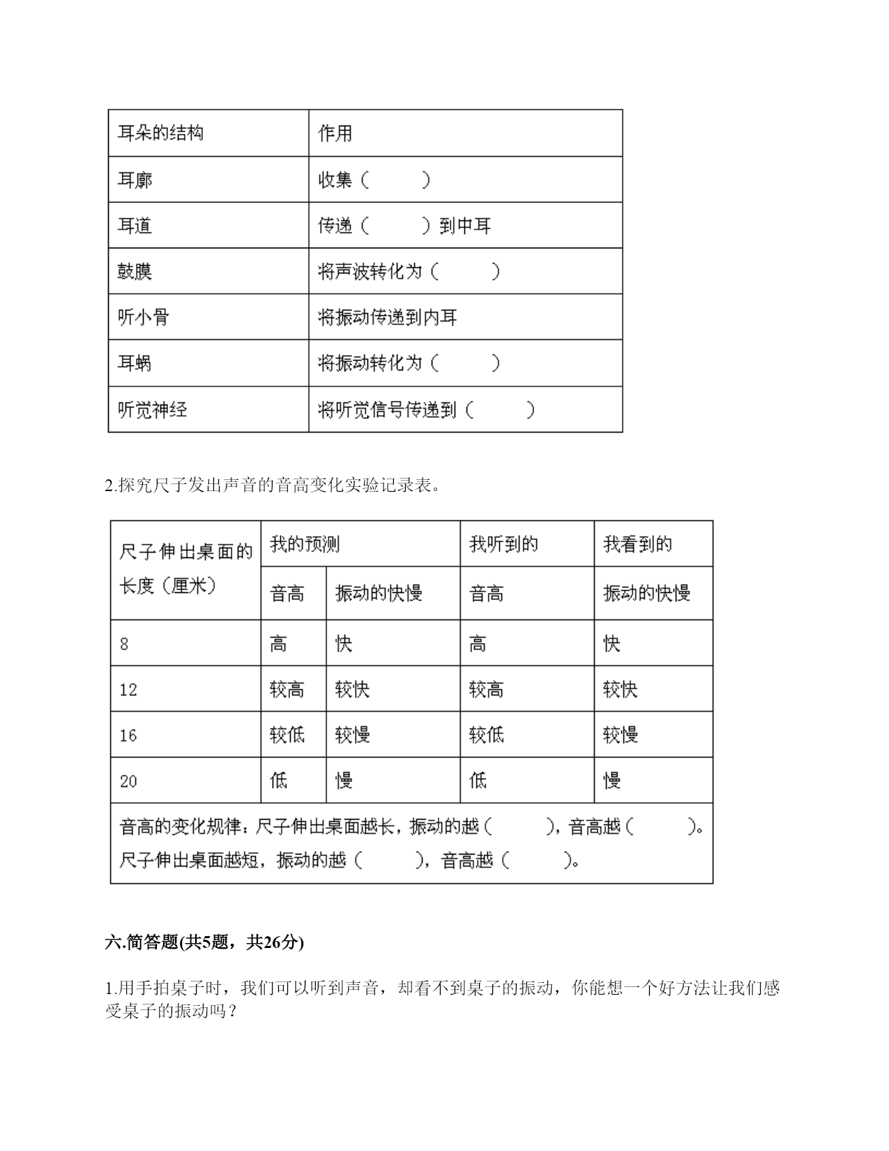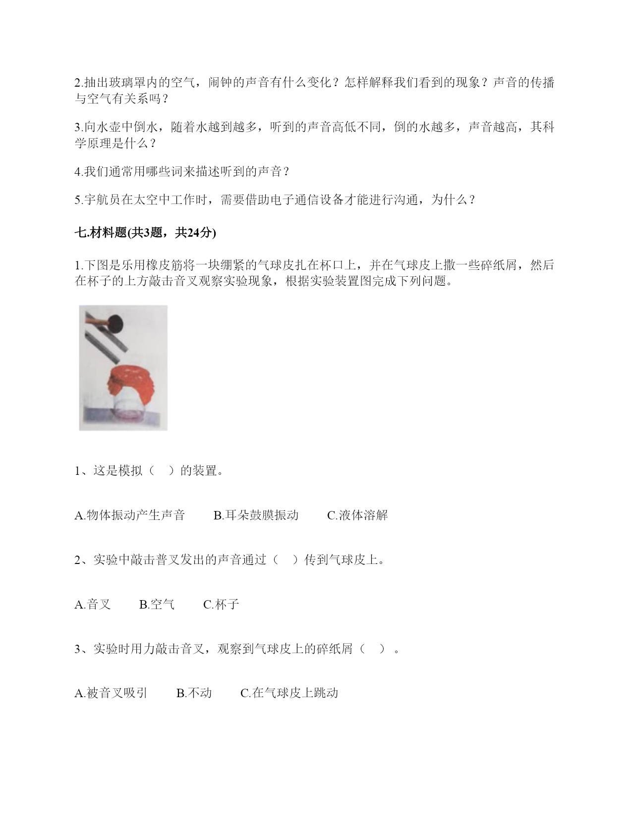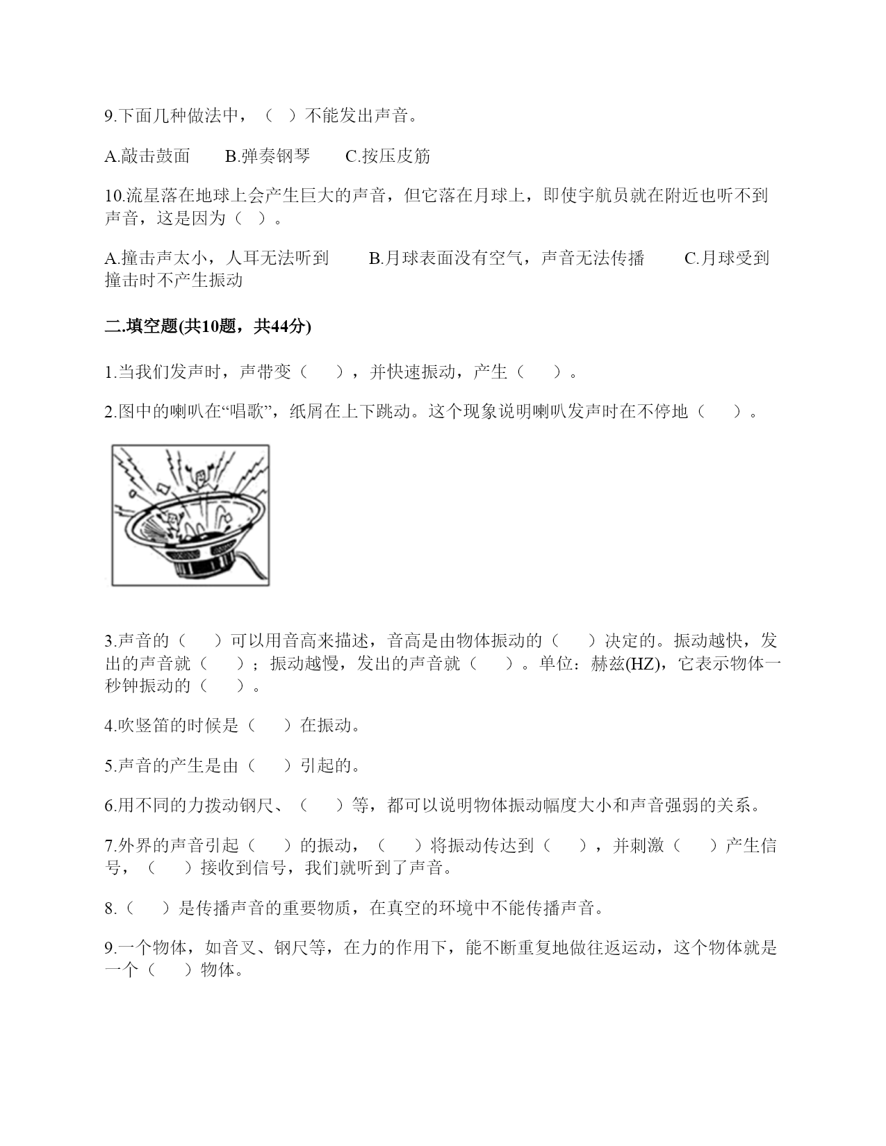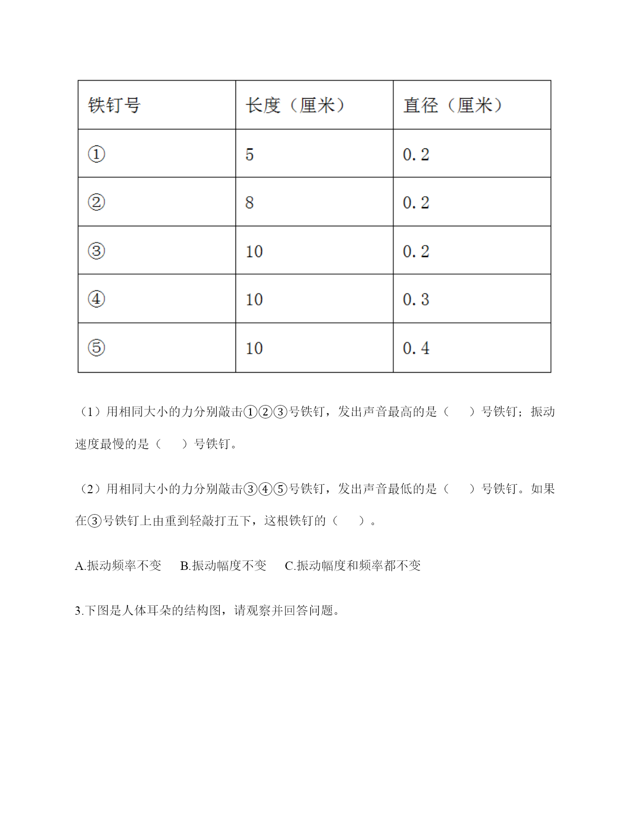 小学科学《声音》综合练习题一.选择题(共10题,共20分)1.在《风桥夜泊》中有这样的诗句:“姑苏城外寒山寺,夜半钟声到客船。”钟声是通过()传播到船舱内诗人的耳中的。A.传声B.导电C.通风2.古琴是我国历史悠久的乐器,由7根长短相同、粗细不同的弦组成。小雅弹古琴时,要使它发出的声音更响一些,可以()。A.弹更粗的琴弦B.弹得更用力一些C.轻轻地弹3.电视机的声音太小了,用遥控器把声音调大了一些。在这个过程中,电视机的()。A.声音强弱发生了变化B.声音高低发生了变化C.声音音色发生了变化4.想要研究“物体发出声音的高低与物体粗细的关系”,应该选用的实验材料是()。A.B.C.5.在我们耳朵里,时时刻刻都在接收各种声音并产生振动的结构是()。A.鼓膜B.听小骨C.听觉神经6.声音传播的特点有()。A.不能在液体中传播B.能在各种物体中传播C.只能在空气中传播7.歌手唱到高音时,声带振动的速度()。A.慢B.快C.不快也不慢8.下列现象中,说明声音能在液体中传播的是()。A.鱼被岸上的脚步声吓走B.游客听到瀑布倾泻而下的声音C.海边的人听到海浪拍击岩石的声音9.下面几种做法中,()不能发出声音。A.敲击鼓面B.弹奏钢琴C.按压皮筋10.流星落在地球上会产生巨大的声音,但它落在月球上,即使宇航员就在附近也听不到声音,这是因为()。A.撞击声太小,人耳无法听到B.月球表面没有空气,声音无法传播C.月球受到撞击时不产生振动二.填空题(共10题,共44分)1.当我们发声时,声带变(),并快速振动,产生()。2.图中的喇叭在“唱歌”,纸屑在上下跳动。这个现象说明喇叭发声时在不停地()。3.声音的()可以用音高来描述,音高是由物体振动的()决定的。振动越快,发出的声音就();振动越慢,发出的声音就()。单位:赫兹(HZ),它表示物体一秒钟振动的()。4.吹竖笛的时候是()在振动。5.声音的产生是由()引起的。6.用不同的力拨动钢尺、()等,都可以说明物体振动幅度大小和声音强弱的关系。7.外界的声音引起()的振动,()将振动传达到(),并刺激()产生信号,()接收到信号,我们就听到了声音。8.()是传播声音的重要物质,在真空的环境中不能传播声音。9.一个物体,如音叉、钢尺等,在力的作用下,能不断重复地做往返运动,这个物体就是一个()物体。10.向水壶倒水时,我们听到的声音是水壶中的()振动产生的,随着水壶中的水位升高,水壶中的空气空间(),振动速度(),声音()。三.判断题(共10题,共20分)1.真空也可以传播声音。()2.我们听到的声音有的强有的弱。()3.同一根弦,拉得越紧声音越高;拉得越松,声音越低。()4.鼓面上放些豆子,敲击鼓面发出声音时,豆子会在鼓面跳动。()5.耳蜗中充满液体。()6.用手轻轻触摸正在发声的物体,能感觉到物体正在振动。()7.风声是自然界发出的声音。()8.用力压皮筋,皮筋不发声,因为皮筋没振动。()9.声带越紧,发出的声音就越高。()10.其他条件相同时,物体振动的越快,发出的声音越低。()四.连线题(共1题,共6分)1.把下面各现象与它们是否能发声连起来。敲击鼓面弯曲钢尺能够发声拉伸皮筋不能发声按压鼓面拉伸并拨动皮筋拨动钢尺五.填表题(共2题,共18分)1.根据你对耳朵的了解,完成下表。2.探究尺子发出声音的音高变化实验记录表。六.简答题(共5题,共26分)1.用手拍桌子时,我们可以听到声音,却看不到桌子的振动,你能想一个好方法让我们感受桌子的振动吗?2.抽出玻璃罩内的空气,闹钟的声音有什么变化?怎样解释我们看到的现象?声音的传播与空气有关系吗?3.向水壶中倒水,随着水越到越多,听到的声音高低不同,倒的水越多,声音越高,其科学原理是什么?4.我们通常用哪些词来描述听到的声音?5.宇航员在太空中工作时,需要借助电子通信设备才能进行沟通,为什么?七.材料题(共3题,共24分)1.下图是乐用橡皮筋将一块绷紧的气球皮扎在杯口上,并在气球皮上撒一些碎纸屑,然后在杯子的上方敲击音叉观察实验现象,根据实验装置图完成下列问题。1、这是模拟()的装置。A.物体振动产生声音B.耳朵鼓膜振动C.液体溶解2、实验中敲击普叉发出的声音通过()传到气球皮上。A.音叉B.空气C.杯子3、实验时用力敲击音叉,观察到气球皮上的碎纸屑()。A.被音叉吸引B.不动C.在气球皮上跳动4、实验时用力敲音叉,气球皮上的碎纸屑跳动幅度与轻敲时相比,()。A.跳动幅度小B.跳动幅度大C.一样5、通过这个实验,我们可以知道我们耳朵里的(),它就像这个气球皮一样很薄,而且有弹性,它时时刻刻都在接收着各种声音,