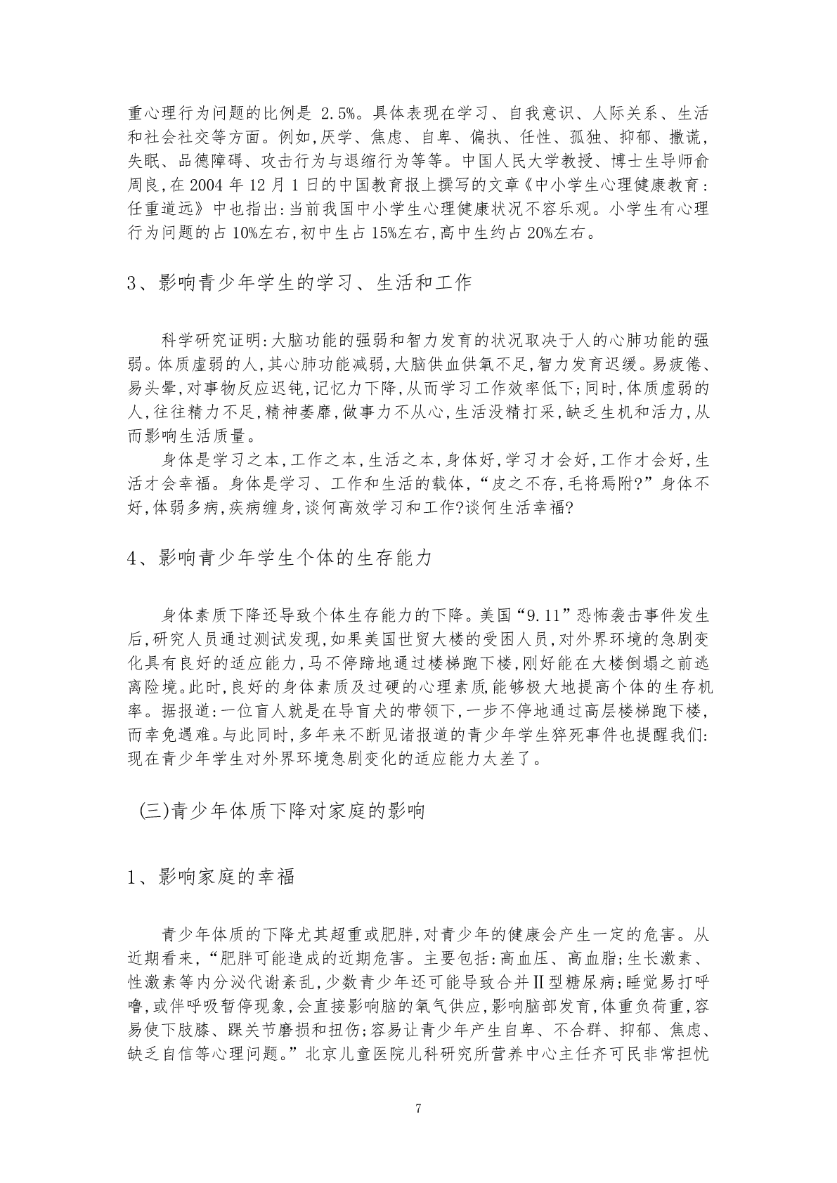 青少年体质下降:运动与健康一、青少年健康与体质情况的现状令人担忧.......................................................................1(一)肺功能指标维持低水平............................................................................................1(二)超重和肥胖现象严重................................................................................................1(三)近视发生率继续增加...........................................................................................2(四)速度、力量素质增长趋于停滞...........................................................................3(五)耐力素质低谷徘徊、柔韧素质成绩向好...........................................................4(六)血压调节机能不良比较普遍...............................................................................4二、体质与健康对个人、家庭、社会的影响.......................................................................5(一)体质与健康的概念....................................................................................................51.体质的概念............................................................................................................52.健康的概念............................................................................................................5(二)青少年体质下降对个人的影响................................................................................61、影响青少年学生的身体健康.............................................................................62、影响青少年学生的心理健康.............................................................................63、影响青少年学生的学习、生活和工作.............................................................74、影响青少年学生个体的生存能力.....................................................................7(三)青少年体质下降对家庭的影响................................................................................71、影响家庭的幸福.................................................................................................72、影响家庭的未来.................................................................................................8(四)青少年体质下降对社会的影响...............................................................................