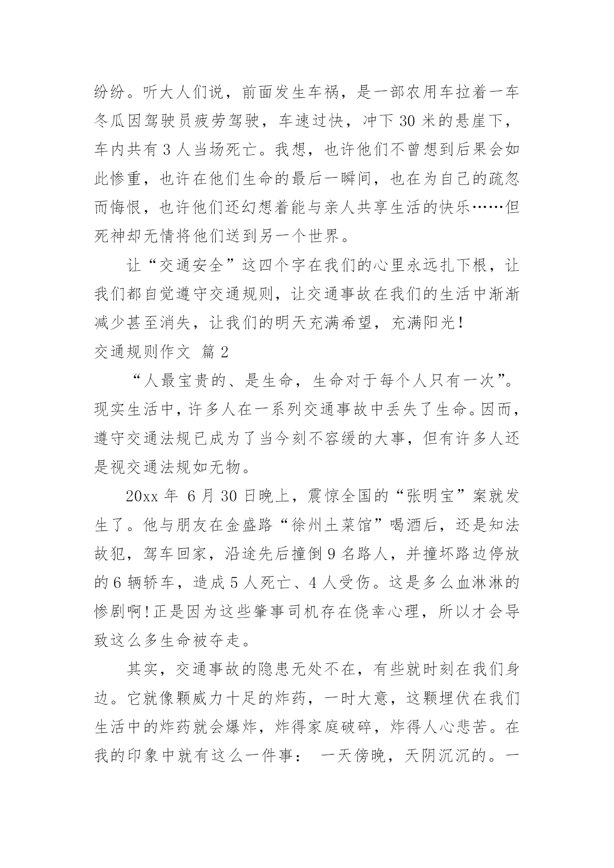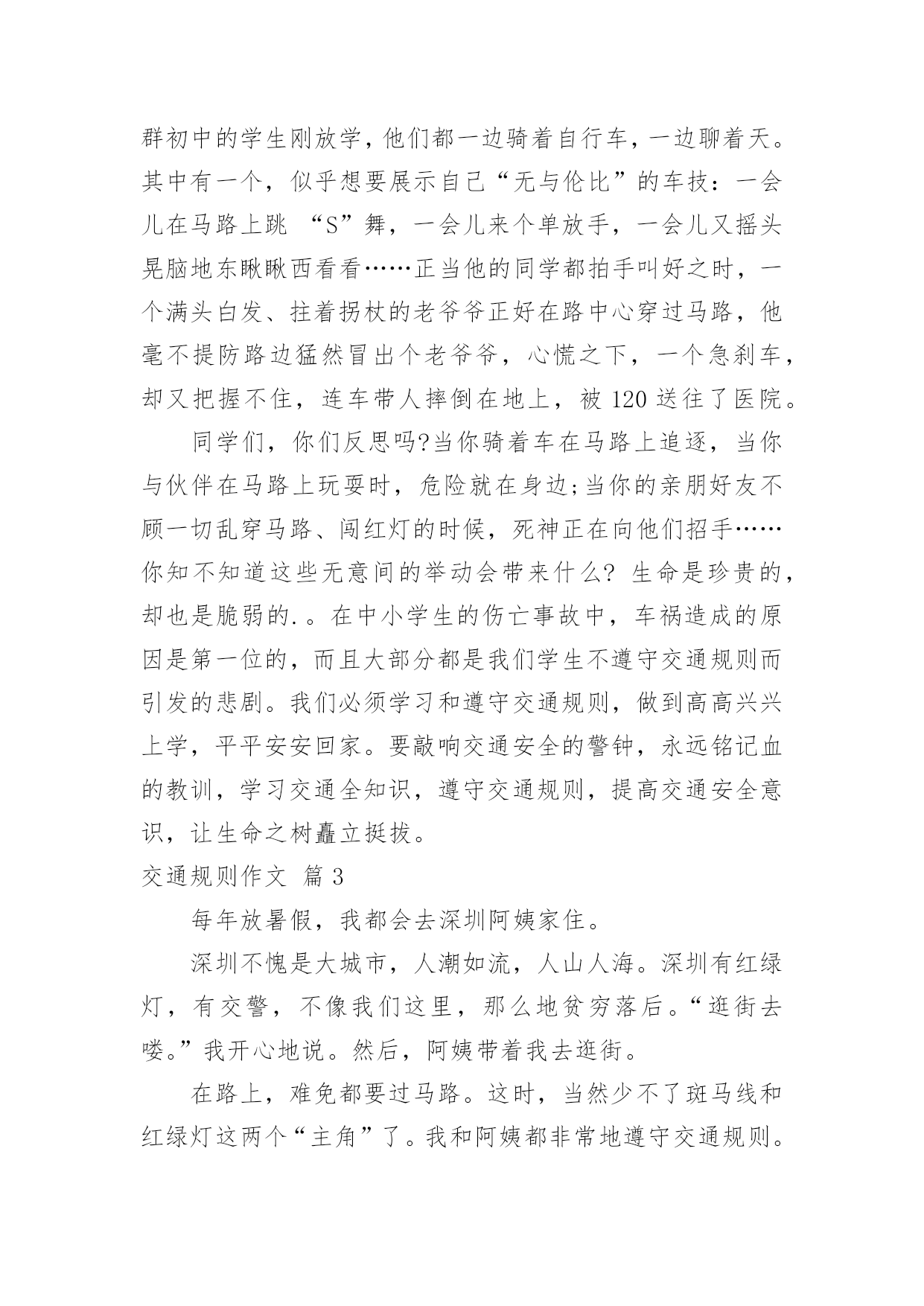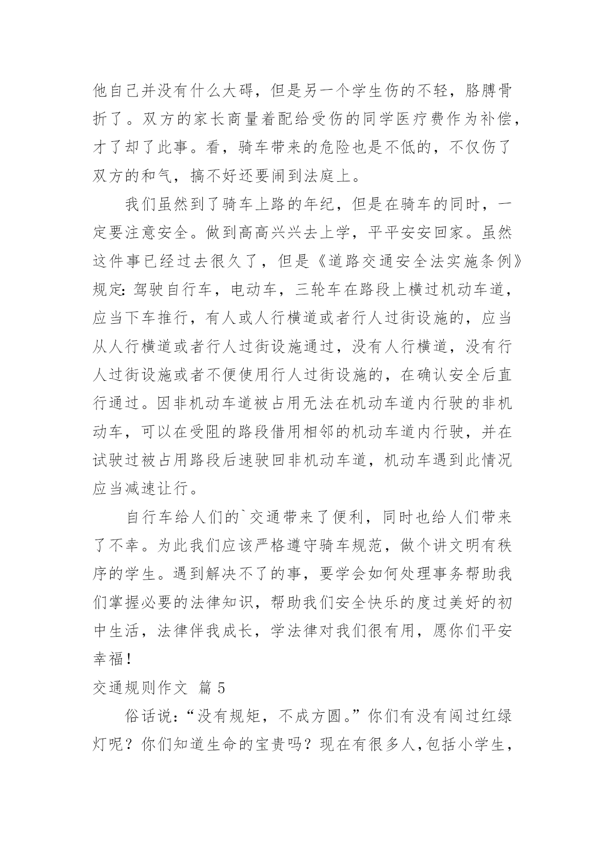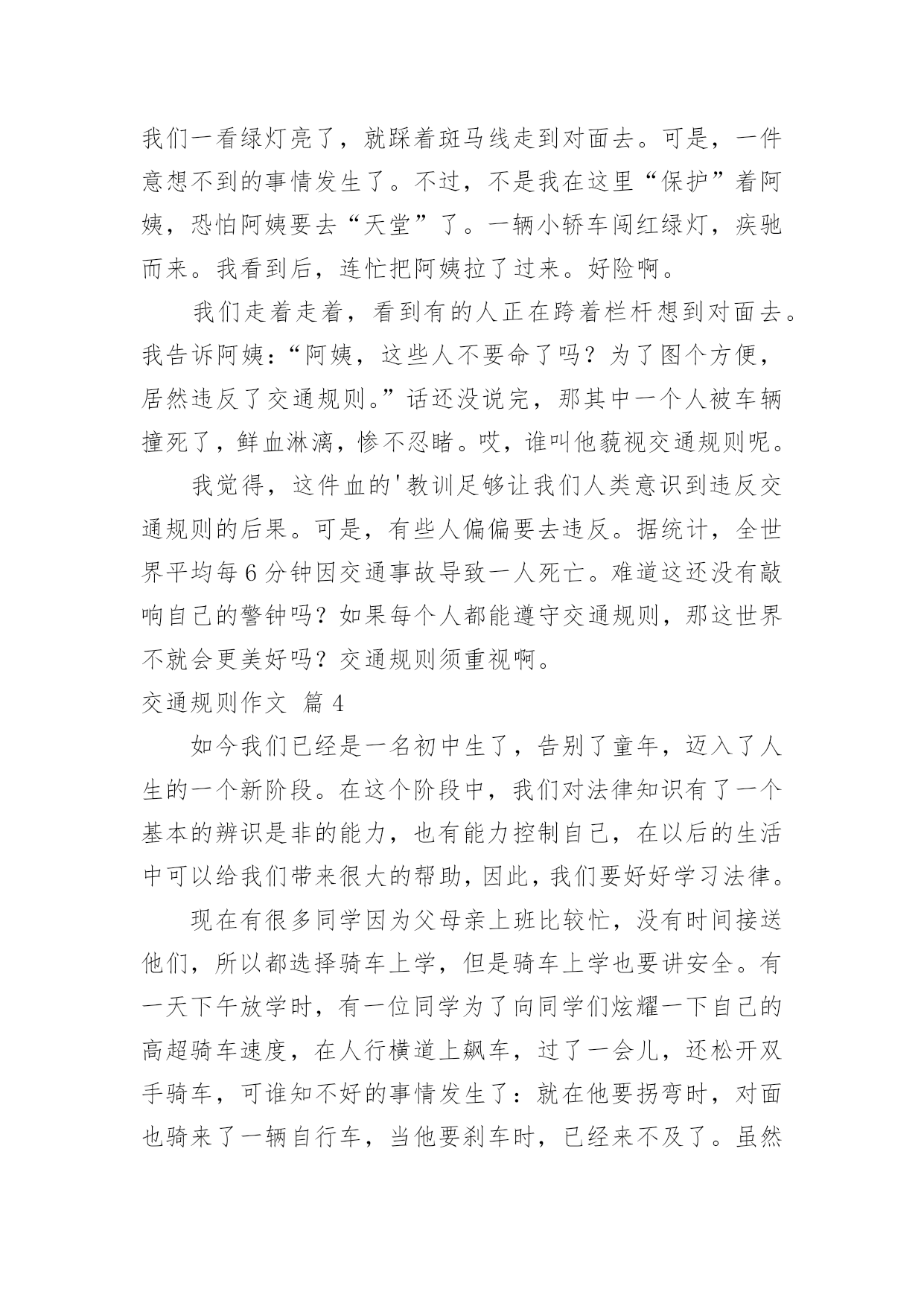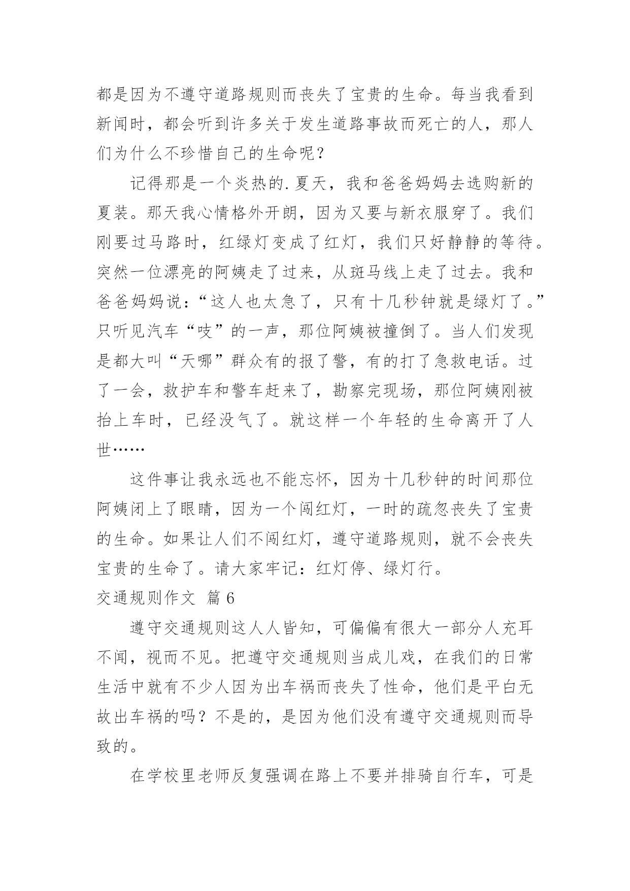 交通规则作文【精选】交通规则作文汇编6篇在日常学习、工作抑或是生活中,大家最不陌生的就是作文了吧,作文根据体裁的不同可以分为记叙文、说明文、应用文、议论文。你知道作文怎样写才规范吗?下面是小编精心整理的交通规则作文7篇,仅供参考,大家一起来看看吧。交通规则作文篇1上帝是公平的也是吝啬的,他只赐予每个人一次生命,所以我们必须珍惜。生活中交通与我们的关系非常密切,它就象我们的朋友,日日夜夜都守在我们的身边,教育我们,劝诫我们。随着社会的飞速发展,生活,工作节奏越来越快,汽车成了人们的主要交通工具,它给我们带来了前所未有的方便,在大家感叹社会的进步,享受生活得同时,它也给我们带来灾难。一个个鲜活的生命消失在飞驰的车轮下,一个个幸福美满的'家庭转眼破碎不堪。特别是那些还没有踏上社会的小学生,也遇到这样的灾难,亲人哀伤的呼唤,留不住小生命。我们能做些什么呢?普及交通安全教育,把交通事故降到最低,这是时代的呼唤!记得去年暑假的一天,我们一家去白水洋旅途中被堵车了,我们下车顺着大路往前走。一路上每间隔十米,就能看见一个路标“十里坡,请慢行”。路上熙熙囔囔的行人议论纷纷。听大人们说,前面发生车祸,是一部农用车拉着一车冬瓜因驾驶员疲劳驾驶,车速过快,冲下30米的悬崖下,车内共有3人当场死亡。我想,也许他们不曾想到后果会如此惨重,也许在他们生命的最后一瞬间,也在为自己的疏忽而悔恨,也许他们还幻想着能与亲人共享生活的快乐……但死神却无情将他们送到另一个世界。让“交通安全”这四个字在我们的心里永远扎下根,让我们都自觉遵守交通规则,让交通事故在我们的生活中渐渐减少甚至消失,让我们的明天充满希望,充满阳光!交通规则作文篇2“人最宝贵的、是生命,生命对于每个人只有一次”。现实生活中,许多人在一系列交通事故中丢失了生命。因而,遵守交通法规已成为了当今刻不容缓的大事,但有许多人还是视交通法规如无物。20xx年6月30日晚上,震惊全国的“张明宝”案就发生了。他与朋友在金盛路“徐州土菜馆”喝酒后,还是知法故犯,驾车回家,沿途先后撞倒9名路人,并撞坏路边停放的6辆轿车,造成5人死亡、4人受伤。这是多么血淋淋的惨剧啊!正是因为这些肇事司机存在侥幸心理,所以才会导致这么多生命被夺走。其实,交通事故的隐患无处不在,有些就时刻在我们身边。它就像颗威力十足的炸药,一时大意,这颗埋伏在我们生活中的炸药就会爆炸,炸得家庭破碎,炸得人心悲苦。在我的印象中就有这么一件事:一天傍晚,天阴沉沉的。一群初中的学生刚放学,他们都一边骑着自行车,一边聊着天。其中有一个,似乎想要展示自己“无与伦比”的车技:一会儿在马路上跳“S”舞,一会儿来个单放手,一会儿又摇头晃脑地东瞅瞅西看看……正当他的同学都拍手叫好之时,一个满头白发、拄着拐杖的老爷爷正好在路中心穿过马路,他毫不提防路边猛然冒出个老爷爷,心慌之下,一个急刹车,却又把握不住,连车带人摔倒在地上,被120送往了医院。同学们,你们反思吗?当你骑着车在马路上追逐,当你与伙伴在马路上玩耍时,危险就在身边;当你的亲朋好友不顾一切乱穿马路、闯红灯的时候,死神正在向他们招手……你知不知道这些无意间的举动会带来什么?生命是珍贵的,却也是脆弱的.。在中小学生的伤亡事故中,车祸造成的原因是第一位的,而且大部分都是我们学生不遵守交通规则而引发的悲剧。我们必须学习和遵守交通规则,做到高高兴兴上学,平平安安回家。要敲响交通安全的警钟,永远铭记血的教训,学习交通全知识,遵守交通规则,提高交通安全意识,让生命之树矗立挺拔。交通规则作文篇3每年放暑假,我都会去深圳阿姨家住。深圳不愧是大城市,人潮如流,人山人海。深圳有红绿灯,有交警,不像我们这里,那么地贫穷落后。“逛街去喽。”我开心地说。然后,阿姨带着我去逛街。在路上,难免都要过马路。这时,当然少不了斑马线和红绿灯这两个“主角”了。我和阿姨都非常地遵守交通规则。我们一看绿灯亮了,就踩着斑马线走到对面去。可是,一件意想不到的事情发生了。不过,不是我在这里“保护”着阿姨,恐怕阿姨要去“天堂”了。一辆小轿车闯红绿灯,疾驰而来。我看到后,连忙把阿姨拉了过来。好险啊。我们走着走着,看到有的人正在跨着栏杆想到对面去。我告诉阿姨:“阿姨,这些人不要命了吗?为了图个方便,居然违反了交通规则。”话还没说完,那其中一个人被车辆撞死了,鲜血淋漓,惨不忍睹。哎,谁叫他藐视交通规则呢。我觉得,这件血的'教训足够让我们人类意识到违反交通规则的后果。可是,有些人偏偏要去违反。据统计,全世界平均每6分钟因交通事故导致一人死亡。难道这还没有敲响自己的警钟吗?如果每个人都能遵守交通规则,那这世界不就会更美好吗?交通规则须重视啊。交通规则作文篇4如今我们已经是一名初中生了,告别了童年,迈入了人生的一个新阶段。在这个阶段中,我们对法律知识有了一个基本的辨识是非