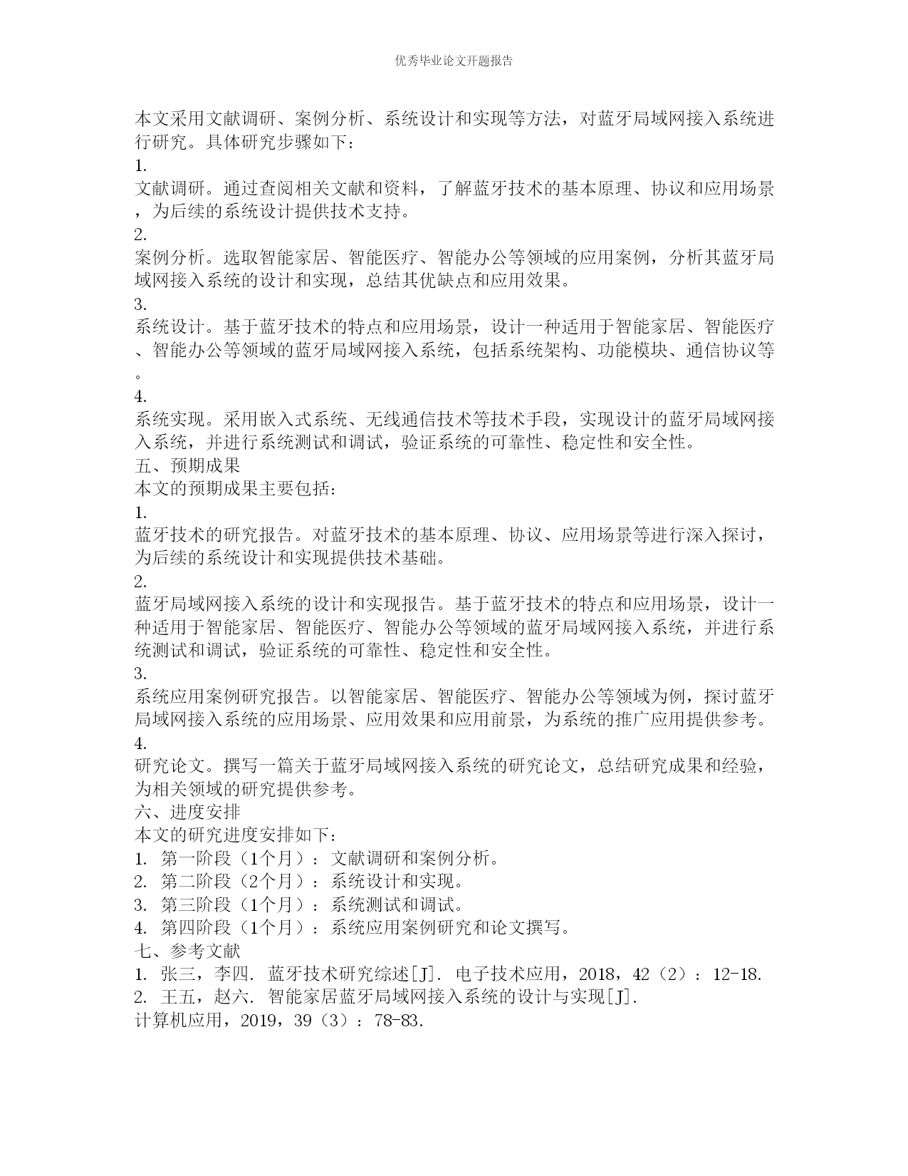 优秀毕业论文开题报告蓝牙局域网接入系统的研究的开题报告一、选题背景随着物联网技术的发展,人们对于智能家居、智能办公、智能医疗等领域的需求越来越高。而实现这些智能化场景的关键在于设备间的互联和数据的传输。传统的有线网络在布线、维护、扩展等方面存在较大的局限性,而无线网络则能够更好地解决这些问题。而蓝牙技术作为一种低功耗、低成本、近场高速传输的无线通信技术,在智能家居、智能医疗、智能办公等领域中得到了广泛的应用。因此,本文选择蓝牙局域网接入系统作为研究对象,旨在解决蓝牙局域网接入系统在智能家居、智能医疗、智能办公等领域中的应用问题,提高其可靠性、稳定性和安全性,为智能化场景的实现提供技术支持。二、研究内容本文的研究内容主要包括以下几个方面:1.蓝牙技术的研究。本文将对蓝牙技术的基本原理、协议、应用场景等进行深入探讨,为后续的系统设计和实现提供技术基础。2.蓝牙局域网接入系统的设计。本文将基于蓝牙技术的特点和应用场景,设计一种适用于智能家居、智能医疗、智能办公等领域的蓝牙局域网接入系统,包括系统架构、功能模块、通信协议等。3.蓝牙局域网接入系统的实现。本文将采用嵌入式系统、无线通信技术等技术手段,实现设计的蓝牙局域网接入系统,并进行系统测试和调试,验证系统的可靠性、稳定性和安全性。4.系统应用案例的研究。本文将以智能家居、智能医疗、智能办公等领域为例,探讨蓝牙局域网接入系统的应用场景、应用效果和应用前景,为系统的推广应用提供参考。三、研究意义1.提高蓝牙局域网接入系统的可靠性和稳定性。通过对系统的设计和实现,可以优化系统的架构、功能模块和通信协议,提高系统的可靠性和稳定性,保证系统的正常运行。2.提高蓝牙局域网接入系统的安全性。通过对系统的安全性进行研究和改进,可以有效地防范系统被黑客攻击、数据泄露等安全问题,保障系统的安全性和稳定性。3.推动蓝牙技术在智能化场景中的应用。通过研究蓝牙局域网接入系统的应用场景和应用效果,可以推动蓝牙技术在智能家居、智能医疗、智能办公等领域的应用,促进智能化场景的发展。四、研究方法本文采用文献调研、案例分析、系统设计和实现等方法,对蓝牙局域网接入系统进行研究。具体研究步骤如下:1.文献调研。通过查阅相关文献和资料,了解蓝牙技术的基本原理、协议和应用场景,为后续的系统设计提供技术支持。2.案例分析。选取智能家居、智能医疗、智能办公等领域的应用案例,分析其蓝牙局域网接入系统的设计和实现,总结其优缺点和应用效果。3.系统设计。基于蓝牙技术的特点和应用场景,设计一种适用于智能家居、智能医疗、智能办公等领域的蓝牙局域网接入系统,包括系统架构、功能模块、通信协议等。4.系统实现。采用嵌入式系统、无线通信技术等技术手段,实现设计的蓝牙局域网接入系统,并进行系统测试和调试,验证系统的可靠性、稳定性和安全性。五、预期成果本文的预期成果主要包括:1.蓝牙技术的研究报告。对蓝牙技术的基本原理、协议、应用场景等进行深入探讨,为后续的系统设计和实现提供技术基础。2.蓝牙局域网接入系统的设计和实现报告。基于蓝牙技术的特点和应用场景,设计一种适用于智能家居、智能医疗、智能办公等领域的蓝牙局域网接入系统,并进行系统测试和调试,验证系统的可靠性、稳定性和安全性。3.系统应用案例研究报告。以智能家居、智能医疗、智能办公等领域为例,探讨蓝牙局域网接入系统的应用场景、应用效果和应用前景,为系统的推广应用提供参考。4.研究论文。撰写一篇关于蓝牙局域网接入系统的研究论文,总结研究成果和经验,为相关领域的研究提供参考。六、进度安排本文的研究进度安排如下:1.第一阶段(1个月):文献调研和案例分析。2.第二阶段(2个月):系统设计和实现。3.第三阶段(1个月):系统测试和调试。4.第四阶段(1个月):系统应用案例研究和论文撰写。七、参考文献1.张三,李四.蓝牙技术研究综述[J].电子技术应用,2018,42(2):12-18.2.王五,赵六.智能家居蓝牙局域网接入系统的设计与实现[J].计算机应用,2019,39(3):78-83.3.钱七,孙八.蓝牙技术在智能医疗中的应用研究[J].医药电子技术,2017,31(5):26-30.4.李九,周十.蓝牙技术在智能办公中的应用研究[J].信息技术与标准化,2016,22(2):45-50.