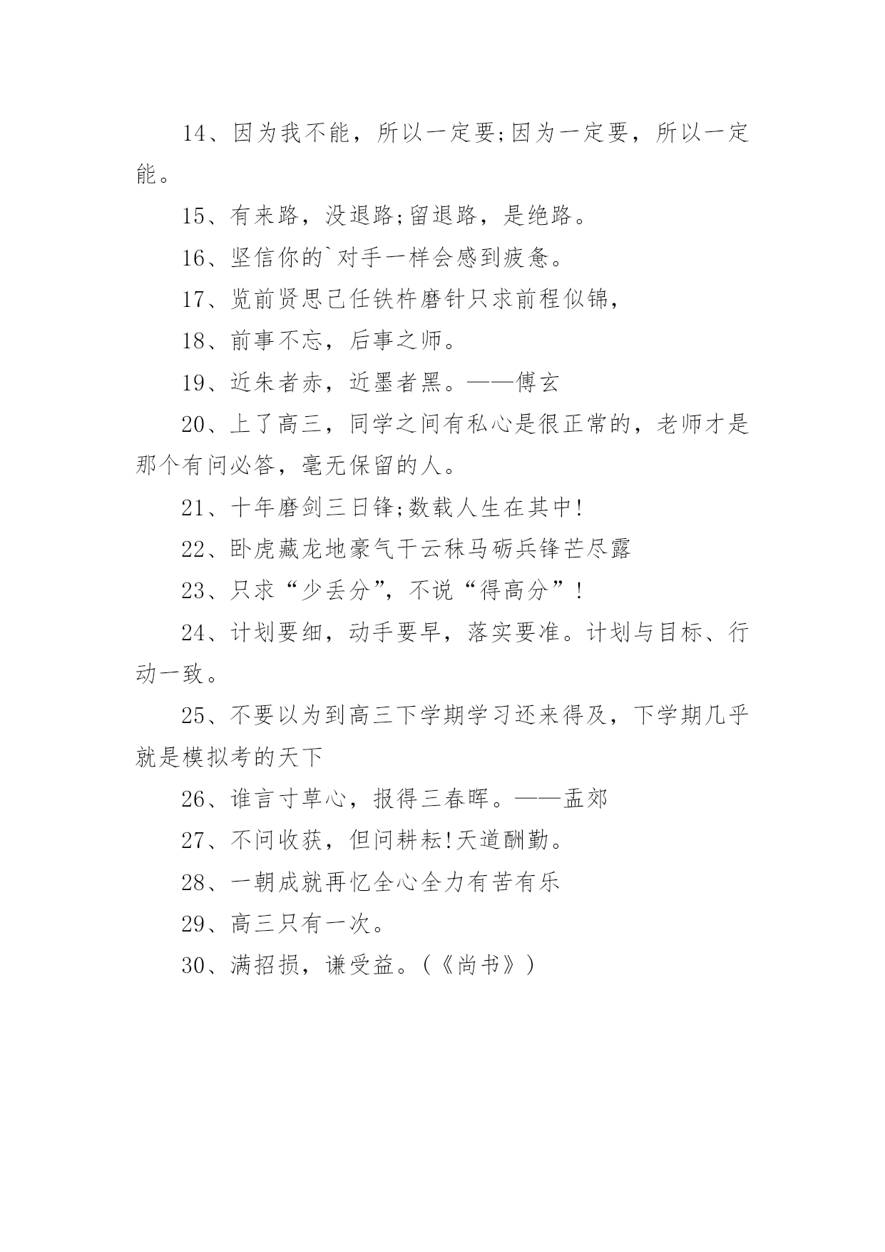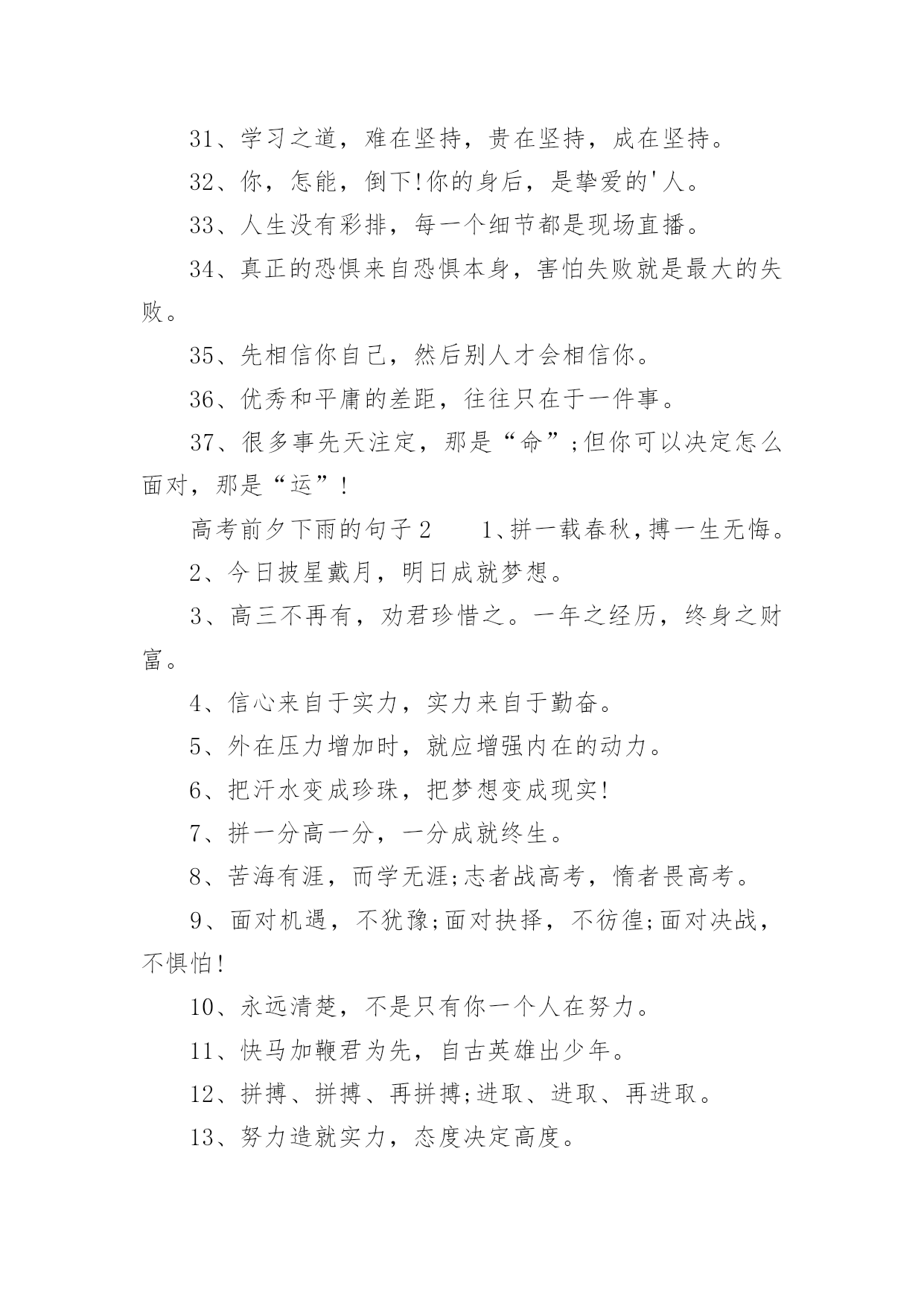 高考前夕下雨的句子高考前夕下雨的句子在学习、工作乃至生活中,许多人都接触过一些比较经典的句子吧,句子由词或词组部分和语调所表示的语气部分组成。那什么样的句子才是经典的呢?以下是小编为大家整理的高考前夕下雨的句子,欢迎大家借鉴与参考,希望对大家有所帮助。高考前夕下雨的句子11、当全世界都说在放弃时,告诉自己再试一次。2、每一块美玉都离不开雕琢,每一个成功都离不开磨练。3、看淡一切,从头开始。4、只有不努力的学生,没有读不了书的学生。5、不想一辈子为别人提鞋,就努力学习。6、站在新起点,迎接新挑战,创造新成绩。7、模拟的成绩一定不要成为包袱,成为阴影。8、努力不一定成功,不努力一定会失败。9、自信,是无尽智慧的凝聚。平淡,是乐成路上的驿站。10、人生能有几回博,此时不博何时博。11、没有目标就没有方向,每一个学习阶段都应该给自己树立一个目标。12、拧成一股绳,搏尽一份力,狠下一条心,共圆一个梦。13、书山有路勤为径,学海无涯苦作舟。14、每天多一点点努力,不为别的,只为未来能多一点点选择。15、贵在坚持、难在坚持、成在坚持。16、静下来,铸我实力;拼上去,亮我风采。17、天道酬勤,恒者能胜,只有勤奋,才能胜利,现在我们能做的就是努力!18、努力吧,飞向属于自己的明天!19、人活着要呼吸。呼者,出一口气;吸者,争一口气。20、默认自己无能,无疑是给失败制造机会。21、你有多努力的现在,就有多不惧未来。22、不要轻言放弃,否则对不起自己!23、从风雨中寻找快乐,在挫折中保持坚韧。24、努力优秀,为再见的时候。25、我们不努力,他们怎么办?26、在高考的道路上,惟有坚持不懈,奋发向上的人,才能登上胜利的巅峰。27、最可怕的敌人,就是没有坚定的信念。28、暗自伤心,不如立即行动。29、只有不断地坚持,才能在生活中获得你想要的那部分成功。30、即使爬到最高的山上,一次也只能脚踏实地地迈一步。31、学习之道,难在坚持,贵在坚持,成在坚持。32、你,怎能,倒下!你的身后,是挚爱的'人。33、人生没有彩排,每一个细节都是现场直播。34、真正的恐惧来自恐惧本身,害怕失败就是最大的失败。35、先相信你自己,然后别人才会相信你。36、优秀和平庸的差距,往往只在于一件事。37、很多事先天注定,那是“命”;但你可以决定怎么面对,那是“运”!高考前夕下雨的句子21、拼一载春秋,搏一生无悔。2、今日披星戴月,明日成就梦想。3、高三不再有,劝君珍惜之。一年之经历,终身之财富。4、信心来自于实力,实力来自于勤奋。5、外在压力增加时,就应增强内在的动力。6、把汗水变成珍珠,把梦想变成现实!7、拼一分高一分,一分成就终生。8、苦海有涯,而学无涯;志者战高考,惰者畏高考。9、面对机遇,不犹豫;面对抉择,不彷徨;面对决战,不惧怕!10、永远清楚,不是只有你一个人在努力。11、快马加鞭君为先,自古英雄出少年。12、拼搏、拼搏、再拼搏;进取、进取、再进取。13、努力造就实力,态度决定高度。14、因为我不能,所以一定要;因为一定要,所以一定能。15、有来路,没退路;留退路,是绝路。16、坚信你的`对手一样会感到疲惫。17、览前贤思己任铁杵磨针只求前程似锦,18、前事不忘,后事之师。19、近朱者赤,近墨者黑。——傅玄20、上了高三,同学之间有私心是很正常的,老师才是那个有问必答,毫无保留的人。21、十年磨剑三日锋;数载人生在其中!22、卧虎藏龙地豪气干云秣马砺兵锋芒尽露23、只求“少丢分”,不说“得高分”!24、计划要细,动手要早,落实要准。计划与目标、行动一致。25、不要以为到高三下学期学习还来得及,下学期几乎就是模拟考的天下26、谁言寸草心,报得三春晖。——盂郊27、不问收获,但问耕耘!天道酬勤。28、一朝成就再忆全心全力有苦有乐29、高三只有一次。30、满招损,谦受益。(《尚书》)