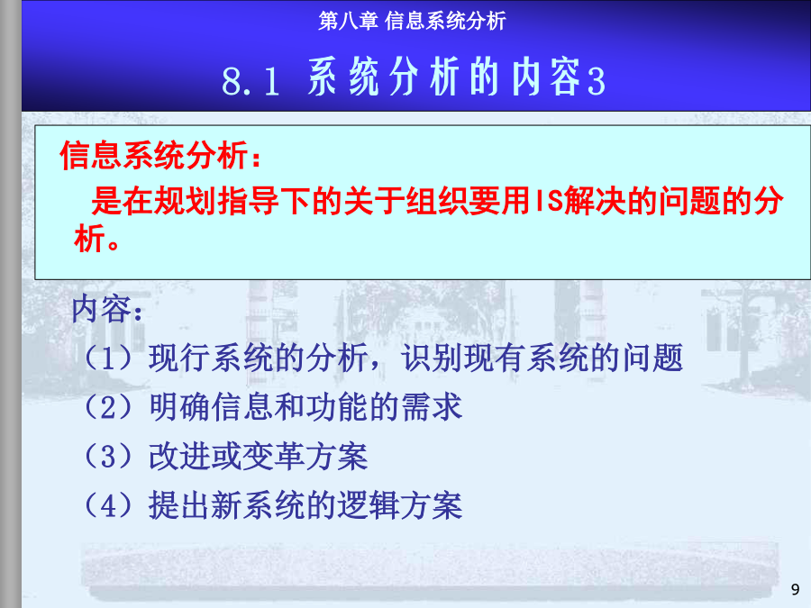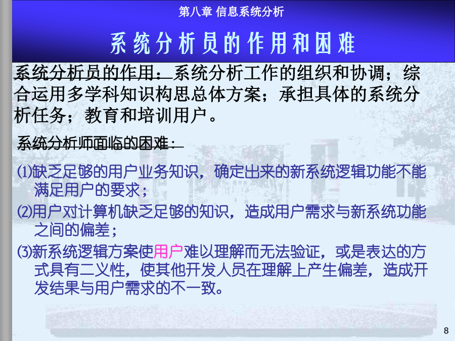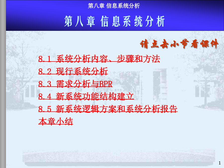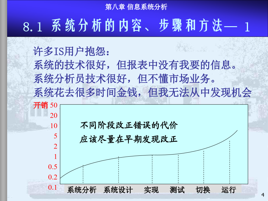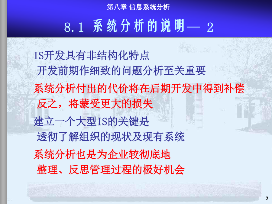 8.1系统分析内容、步骤和方法8.2现行系统分析8.3需求分析与BPR8.4新系统功能结构建立8.5新系统逻辑方案和系统分析报告本章小结系统分析是MIS项目开发的第一阶段,是最重要的环节。系统分析的目的是回答“做什么”的问题。(1)系统分析的任务在充分认识原信息系统的基础上,通过详细调查、问题识别、可行性分析、系统化分析,最后提出新系统的逻辑方案(完成新系统的逻辑方案设计,或称逻辑模型设计),为系统设计提供依据。系统设计的依据是系统分析的结果——系统分析报告或新系统逻辑方案,因此系统分析的质量直接影响系统开发的效果。实践的经验和教训表明必须有专门的系统分析员来沟通用户和设计者,使二者易于交流和准确表达系统,这是MIS开发成功的关键。许多IS用户抱怨:系统的技术很好,但报表中没有我要的信息。系统分析员技术很好,但不懂市场业务。系统花去很多时间金钱,但我无法从中发现机会IS开发具有非结构化特点开发前期作细致的问题分析至关重要系统分析付出的代价将在后期开发中得到补偿反之,将蒙受更大的损失建立一个大型IS的关键是透彻了解组织的现状及现有系统系统分析也是为企业较彻底地整理、反思管理过程的极好机会系统分析工程师系统分析员的能力模型和知识结构是:了解计算机技术;管理业务、决策知识;交流的概念和技巧。具体分两方面能力:人际关系方面的技能:如较强的语言表达能力,较强的理解和归纳能力,以及宣传教育和培训用户的能力等;技术方面的技能:强调运筹分析、系统分析、计算机方面的技术。系统分析员的作用:系统分析工作的组织和协调;综合运用多学科知识构思总体方案;承担具体的系统分析任务;教育和培训用户。内容:(1)现行系统的分析,识别现有系统的问题(2)明确信息和功能的需求(3)改进或变革方案(4)提出新系统的逻辑方案整体效益原则:分析是着眼于整体系统而非个别子系统。长远效益原则:对目前和长远均有利的方案是最优方案,对目前不利但对长远有利的方案是次优方案,对目前有利但对长远不利的方案是较差的方案(可持续发展的观点)。外部条件和内部条件相结合的原则。定量分析和定性分析相结合的原则(系统分析的要素很多,能定量描述的用图表、数据去表达)。8.1系统分析的内容、步骤和方法—4系统分析的具体步骤不同的人员和工作在粗细上会有很大的差别用户一般无法识别系统分析的结果是否恰当步骤图是建议的较规范的系统分析步骤在实际中系统分析的各步骤存在循环反复模型驱动分析方法,Model-DrivenAnalysisApproaches结构化分析,StructuredAnalysis—业务流程图TFD、数据流程图,DataFlowDiagram信息工程方法,InformationEngineering—实体关系图,EntityRelationshipdiagram面向对象方法,Object-orientedAnalysis递进分析方法,AcceleratedAnalysisApproaches探索原型,DiscoveryPrototyping快速架构分析,RapidArchitectureAnalysis—逆向工程,ReverseEngineering8.2现行系统分析现状描述、分析存在问题、原因、解决途径调查必须由人去完成(任何先进的方法都没有提供工具可以代替人工完成系统调查);系统调查不仅是不可缺省的开发步骤,同时,也不会有现成的调查结果;调查的时间长短、工作量大小、调查工作细致与否直接关系到系统分析的质量。回顾:调查原则的进一步说明调查准备(理论上的、知识上的);决定调查项目(目标、功能、范围、业务);详细调查(逐项调查,方式,方法);书写调查报告(提出问题、分析问题、解决问题)。面谈问卷调查会阅读资料实地考察访谈跟班作业。。。直接参加业务实践是了解当前系统的最好方法,但要受到条件的限制。调查方法2-开调查会根据系统特点设计调查表,用其向有关单位和个人征求意见和设计数据。适用于:需要向许多单位进行调查,而调查的信息量又不大的情况,调查表的设计要抓住中心,提问要简单、直接。调查表的样式:开放式:1.你目前获得哪些数据报告,如何使用?2.这些数据报告有哪些问题?如有请解释。封闭式:1.你认为返工的订单频繁吗?Yes/No2.折扣的实行使客户订单增加吗?A肯定增加B增加C不知道D不增加E肯定不增加标题、问卷说明、被调查者基本情况、调查主题内容、结束语确定标题应简明扼要,易于引起回答者的兴趣。旨在向被调查者说明调查的目的和意义。有些问卷还有填表须知、交表时间、地点及其他事项说明等。指被调查者的一些主要特征主要是以提问的形式提供给被调查者,这部分