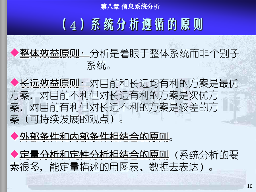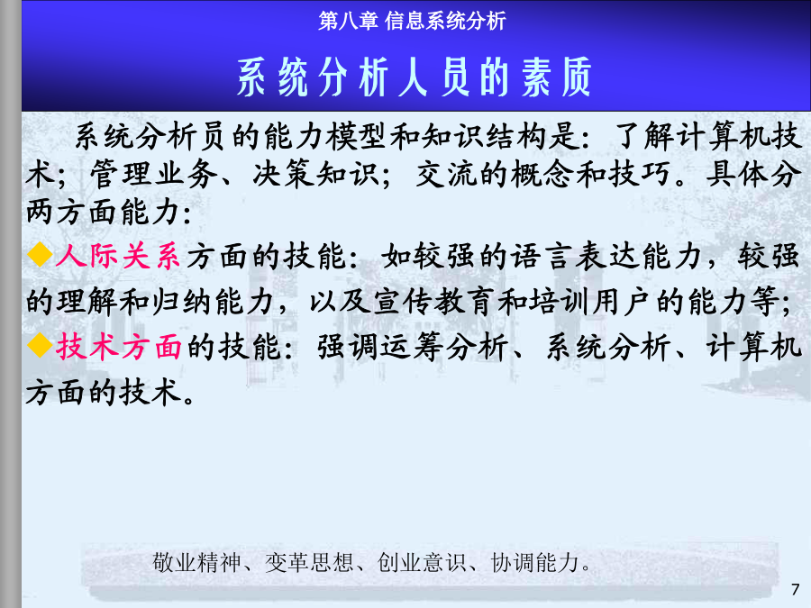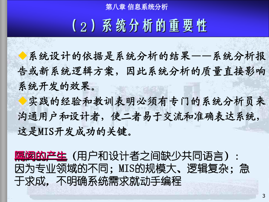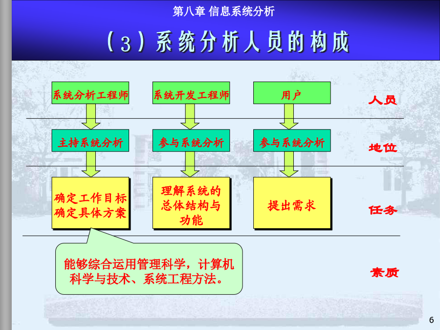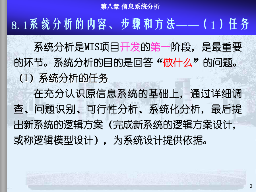 8.1系统分析内容、步骤和方法8.2现行系统分析8.3需求分析与BPR8.4新系统功能结构建立8.5新系统逻辑方案和系统分析报告本章小结系统分析是MIS项目开发的第一阶段,是最重要的环节。系统分析的目的是回答“做什么”的问题。(1)系统分析的任务在充分认识原信息系统的基础上,通过详细调查、问题识别、可行性分析、系统化分析,最后提出新系统的逻辑方案(完成新系统的逻辑方案设计,或称逻辑模型设计),为系统设计提供依据。系统设计的依据是系统分析的结果——系统分析报告或新系统逻辑方案,因此系统分析的质量直接影响系统开发的效果。实践的经验和教训表明必须有专门的系统分析员来沟通用户和设计者,使二者易于交流和准确表达系统,这是MIS开发成功的关键。许多IS用户抱怨:系统的技术很好,但报表中没有我要的信息。系统分析员技术很好,但不懂市场业务。系统花去很多时间金钱,但我无法从中发现机会IS开发具有非结构化特点开发前期作细致的问题分析至关重要系统分析付出的代价将在后期开发中得到补偿反之,将蒙受更大的损失建立一个大型IS的关键是透彻了解组织的现状及现有系统系统分析也是为企业较彻底地整理、反思管理过程的极好机会系统分析工程师系统分析员的能力模型和知识结构是:了解计算机技术;管理业务、决策知识;交流的概念和技巧。具体分两方面能力:人际关系方面的技能:如较强的语言表达能力,较强的理解和归纳能力,以及宣传教育和培训用户的能力等;技术方面的技能:强调运筹分析、系统分析、计算机方面的技术。系统分析员的作用:系统分析工作的组织和协调;综合运用多学科知识构思总体方案;承担具体的系统分析任务;教育和培训用户。内容:(1)现行系统的分析,识别现有系统的问题(2)明确信息和功能的需求(3)改进或变革方案(4)提出新系统的逻辑方案整体效益原则:分析是着眼于整体系统而非个别子系统。长远效益原则:对目前和长远均有利的方案是最优方案,对目前不利但对长远有利的方案是次优方案,对目前有利但对长远不利的方案是较差的方案(可持续发展的观点)。外部条件和内部条件相结合的原则。定量分析和定性分析相结合的原则(系统分析的要素很多,能定量描述的用图表、数据去表达)。8.1系统分析的内容、步骤和方法—4系统分析的具体步骤不同的人员和工作在粗细上会有很大的差别用户一般无法识别系统分析的结果是否恰当步骤图是建议的较规范的系统分析步骤在实际中系统分析的各步骤存在循环反复模型驱动分析方法,Model-DrivenAnalysisApproaches结构化分析,StructuredAnalysis—业务流程图TFD、数据流程图,DataFlowDiagram信息工程方法,InformationEngineering—实体关系图,EntityRelationshipdiagram面向对象方法,Object-orientedAnalysis递进分析方法,AcceleratedAnalysisApproaches探索原型,DiscoveryPrototyping快速架构分析,RapidArchitectureAnalysis—逆向工程,ReverseEngineering8.2现行系统分析现状描述、分析存在问题、原因、解决途径调查必须由人去完成(任何先进的方法都没有提供工具可以代替人工完成系统调查);系统调查不仅是不可缺省的开发步骤,同时,也不会有现成的调查结果;调查的时间长短、工作量大小、调查工作细致与否直接关系到系统分析的质量。回顾:调查原则的进一步说明调查准备(理论上的、知识上的);决定调查项目(目标、功能、范围、业务);详细调查(逐项调查,方式,方法);书写调查报告(提出问题、分析问题、解决问题)。面谈问卷调查会阅读资料实地考察访谈跟班作业。。。直接参加业务实践是了解当前系统的最好方法,但要受到条件的限制。调查方法2-开调查会根据系统特点设计调查表,用其向有关单位和个人征求意见和设计数据。适用于:需要向许多单位进行调查,而调查的信息量又不大的情况,调查表的设计要抓住中心,提问要简单、直接。调查表的样式:开放式:1.你目前获得哪些数据报告,如何使用?2.这些数据报告有哪些问题?如有请解释。封闭式:1.你认为返工的订单频繁吗?Yes/No2.折扣的实行使客户订单增加吗?A肯定增加B增加C不知道D不增加E肯定不增加标题、问卷说明、被调查者基本情况、调查主题内容、结束语确定标题应简明扼要,易于引起回答者的兴趣。旨在向被调查者说明调查的目的和意义。有些问卷还有填表须知、交表时间、地点及其他事项说明等。指被调查者的一些主要特征主要是以提问的形式提供给被调查者,这部分