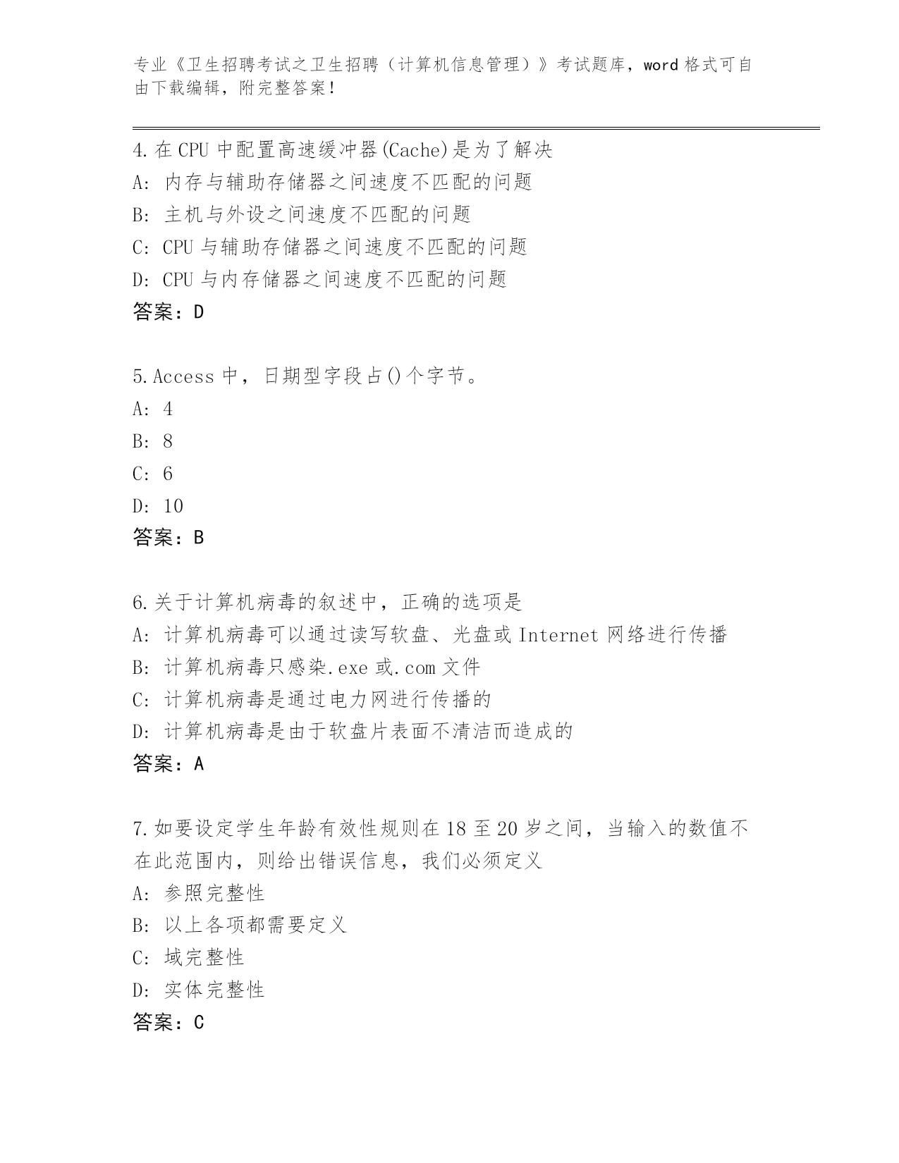 内部使用江西省永新县《卫生招聘考试之卫生招聘(计算机信息管理)》资格考试通关秘籍题库附答案【精练】