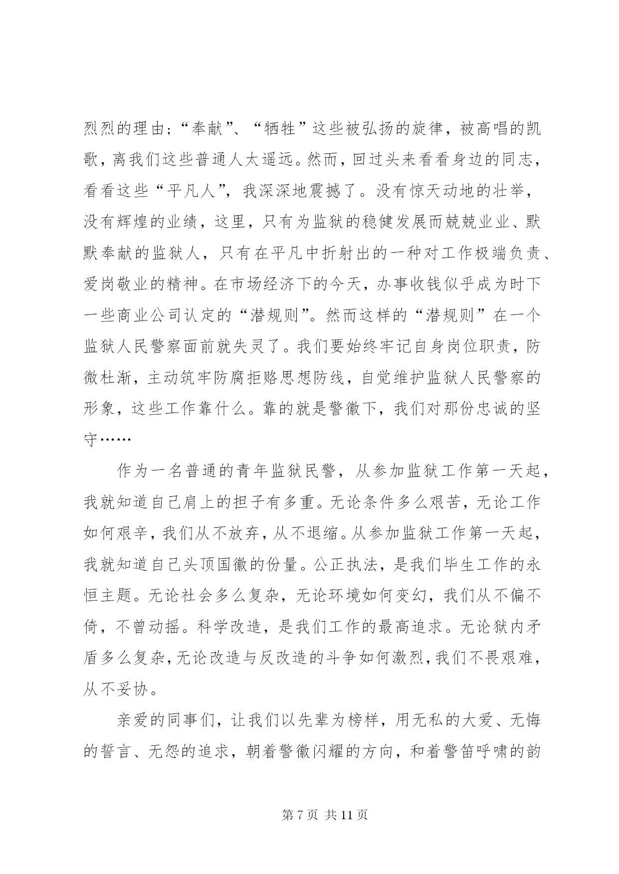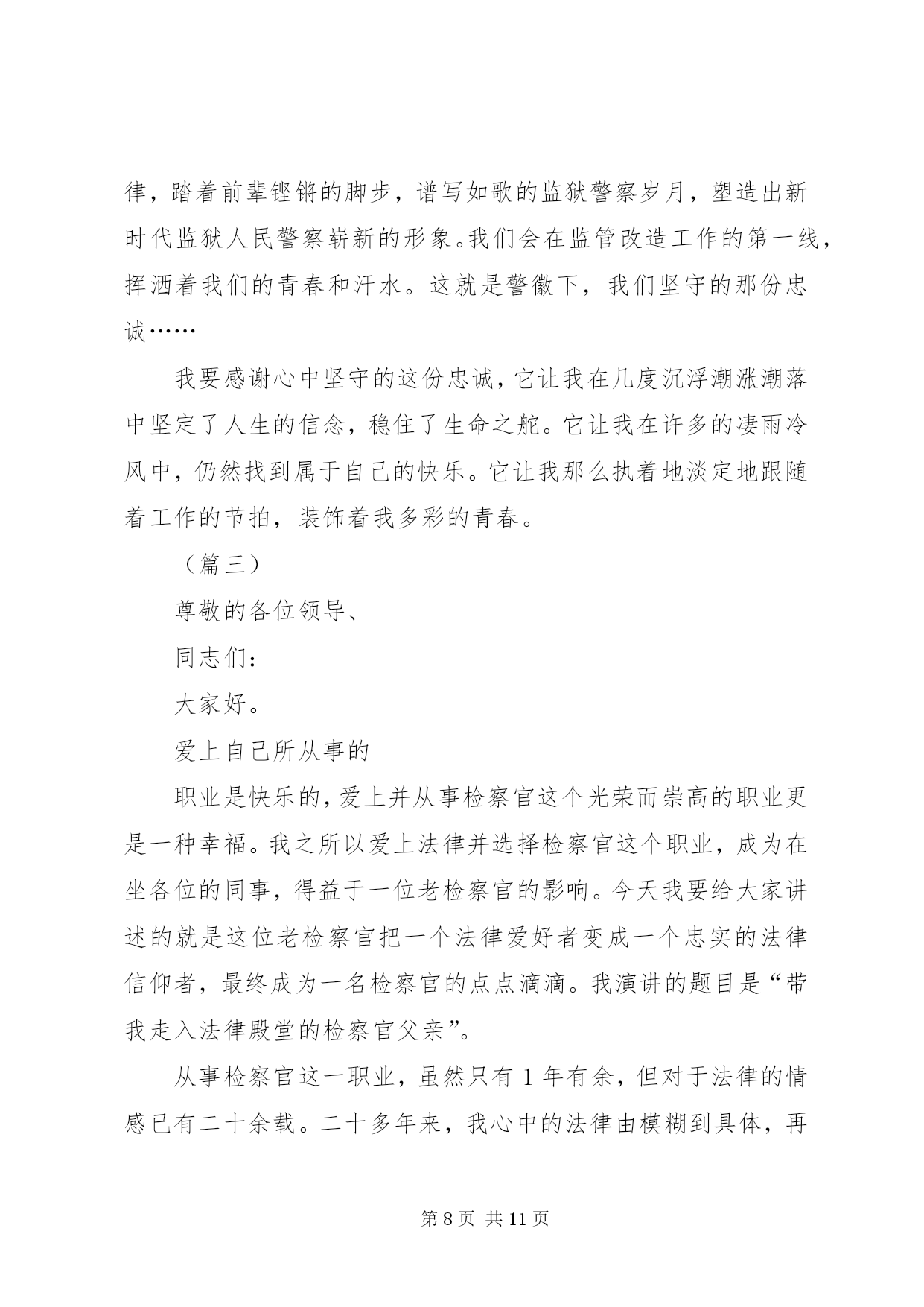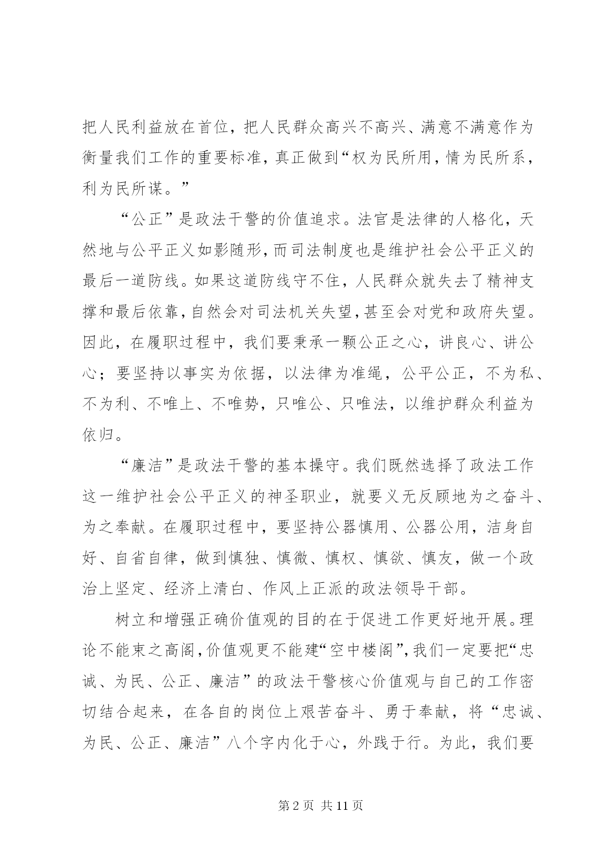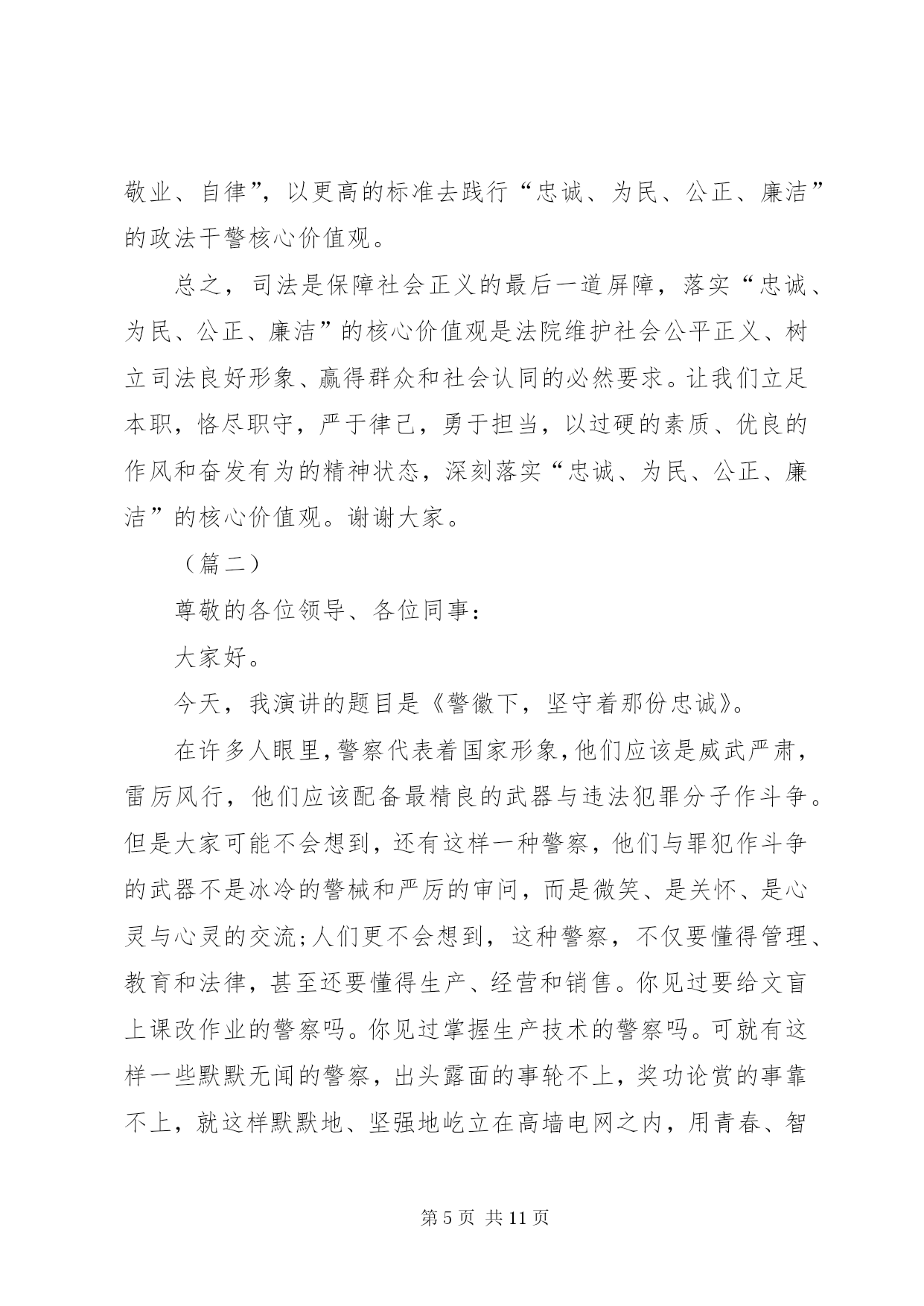 第PAGE\*Arabic\*MERGEFORMAT11页共NUMPAGES\*MERGEFORMAT11页XX年司法干警演讲稿范文(篇一)尊敬的各位领导、同事:大家好。很荣幸能够站在这里,作为一名法官,作为政法干警中的一员,参加我院组织的“忠诚、为民、公正、廉洁”主题演讲比赛。今天,我演讲的题目是《做好本职工作,深刻践行“忠诚、为民、公正、廉洁”的价值观》。今天能有机会站在这里,与大家交流我的职业情怀和感悟,是一种幸运。“忠诚、为民、公正、廉洁”,这八个字是政法干警的核心价值观,是党和人民对政法队伍的基本要求,也是广大政法干警必须自觉坚持的共同价值取向。首先,我想谈一下我个人对“忠诚、为民、公正、廉洁”政法干警核心价值观的理解。“忠诚”是政法干警的政治本色。政法队伍要履行好确保国家安全和社会政治稳定的首要政治要务,第一位的就是要保持忠诚,始终做到忠于国家,忠于人民,忠于法律。作为一名法官,忠于法律更是责无旁贷,因为法律是法官的唯一上司,正如马克思名言:“法官是法律世界的国王,除了法律就没有别的上司”。“为民”是政法干警的宗旨理念。“司法为民”是我们每一个法官应坚持的基本宗旨,因为政法干警的根本使命就是维护人民合法权益,保障人民安居乐业。在履职过程中,我们必须始终把人民利益放在首位,把人民群众高兴不高兴、满意不满意作为衡量我们工作的重要标准,真正做到“权为民所用,情为民所系,利为民所谋。”“公正”是政法干警的价值追求。法官是法律的人格化,天然地与公平正义如影随形,而司法制度也是维护社会公平正义的最后一道防线。如果这道防线守不住,人民群众就失去了精神支撑和最后依靠,自然会对司法机关失望,甚至会对党和政府失望。因此,在履职过程中,我们要秉承一颗公正之心,讲良心、讲公心;要坚持以事实为依据,以法律为准绳,公平公正,不为私、不为利、不唯上、不唯势,只唯公、只唯法,以维护群众利益为依归。“廉洁”是政法干警的基本操守。我们既然选择了政法工作这一维护社会公平正义的神圣职业,就要义无反顾地为之奋斗、为之奉献。在履职过程中,要坚持公器慎用、公器公用,洁身自好、自省自律,做到慎独、慎微、慎权、慎欲、慎友,做一个政治上坚定、经济上清白、作风上正派的政法领导干部。树立和增强正确价值观的目的在于促进工作更好地开展。理论不能束之高阁,价值观更不能建“空中楼阁”,我们一定要把“忠诚、为民、公正、廉洁”的政法干警核心价值观与自己的工作密切结合起来,在各自的岗位上艰苦奋斗、勇于奉献,将“忠诚、为民、公正、廉洁”八个字内化于心,外践于行。为此,我们要做到做好以下几点:一、提高道德修养,完善自身品格。“万事德为先”,法官的道德素质是司法廉洁的第一道防线。没有法官内在的优秀道德品质,即使最完善的制度也难以保证公正、廉洁司法。对于法官来说,其权威不仅来源于国家权力,更重要的是来源于其本人让人信服的公正品质和廉洁形象。作为一名法官,我们要常怀敬畏之心,正确对待权力;要常怀感恩之心,正确对待得失;要常怀平等之心,正确对待群众。既要自重,磨炼出良好的政治素质、业务素质和良好的道德品行;也要自省,经常反思自己,检查自己,使自己的言行符合党和人民的利益;还要自警,按照党纪国法的规定约束自己,按照法官职业道德要求约束自己,按照社会公德要求约束自己。当然,自我修养的提高不是一蹴而就、一朝一夕的事,而是一个不断坚定理想信念、陶冶情操、完善自我的过程,需要我们深深扎根司法实践当中,用心灵的汗水勤奋浇灌。二、提高司法能力,做好本职工作。良好的司法能力是法官高质高效做好本职工作的重要保证。法官要处理的是纷繁复杂、千变万化的社会生活中的各种法律关系,要经常学习才能增强能力,要经常学习才能与时俱进。因此,在履职过程中,我们要本着“干什么学什么、缺什么补什么”的原则,加强对新理论成果、新政策法规的学习,加快知识更新,优化知识结构,丰富知识储备,学深学透业务知识,真正以较高的综合素质和专业素质赢得工作的主动权,争当本职工作的行家里手。只有这样,我们才能真正落实司法为民之宗旨,更加科学、更加有效地维护人民群众的合法权益。三、自觉接受监督,增强廉政意识。由于工作特性使然,法官个人所掌握的审判执行权,比一般行政人员权力更大、风险更大。同时,随着人民法院的审判执行任务越来越重,司法权面临的腐蚀也越来越复杂。“绝对的权力导致绝对的腐败”,任何人都难有终身的免疫力,只有在有效的监督之下行使权力,才有可能保持清正廉洁。唯物辩证法也告诉我们:量变会引起质变,量的积累会引起质的飞跃。可见,一个人不接受提醒、不接受监督、不防微杜渐,就会陷入“温水煮青蛙”的误区,慢慢迷茫、慢慢麻醉,小错变大错,最后导致腐败。因此,法官必须自觉地、经常地接受监督,做到时刻保持清醒头脑、不断克服自身不足、不断增强
