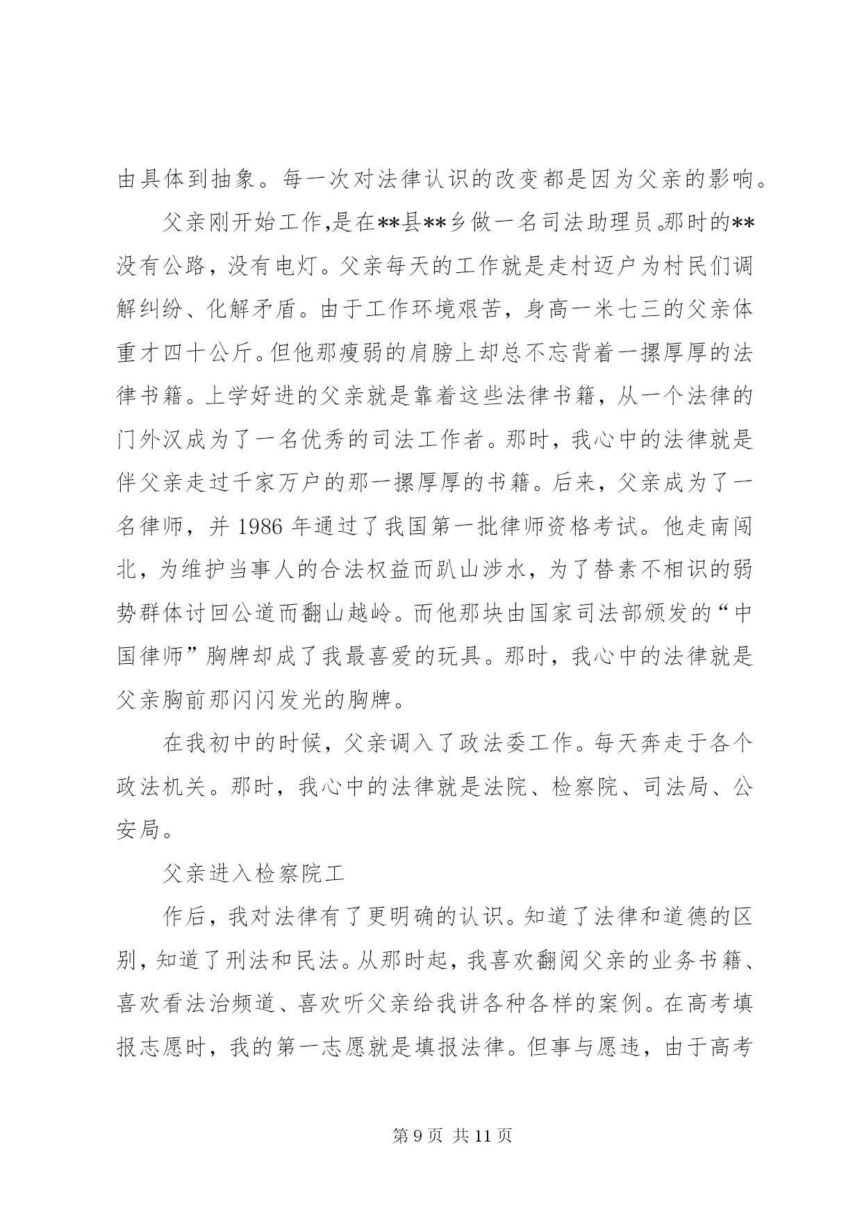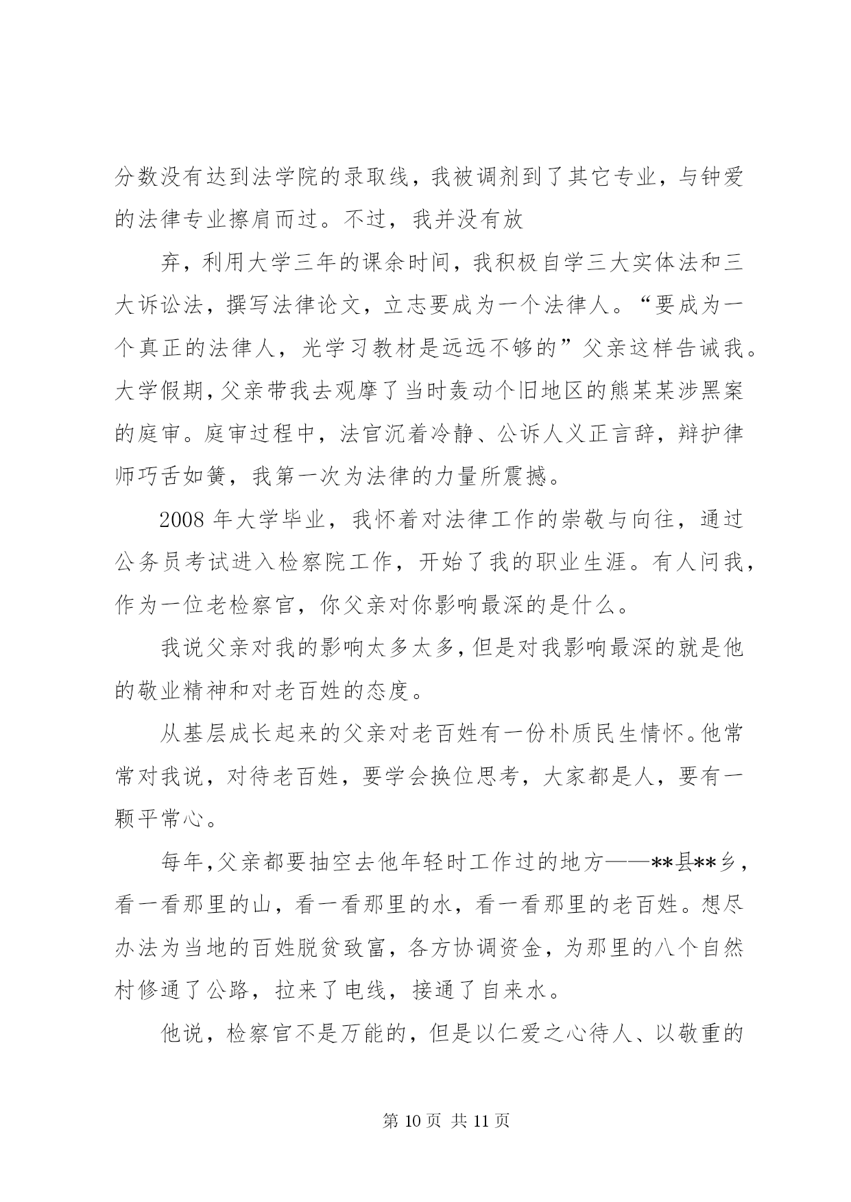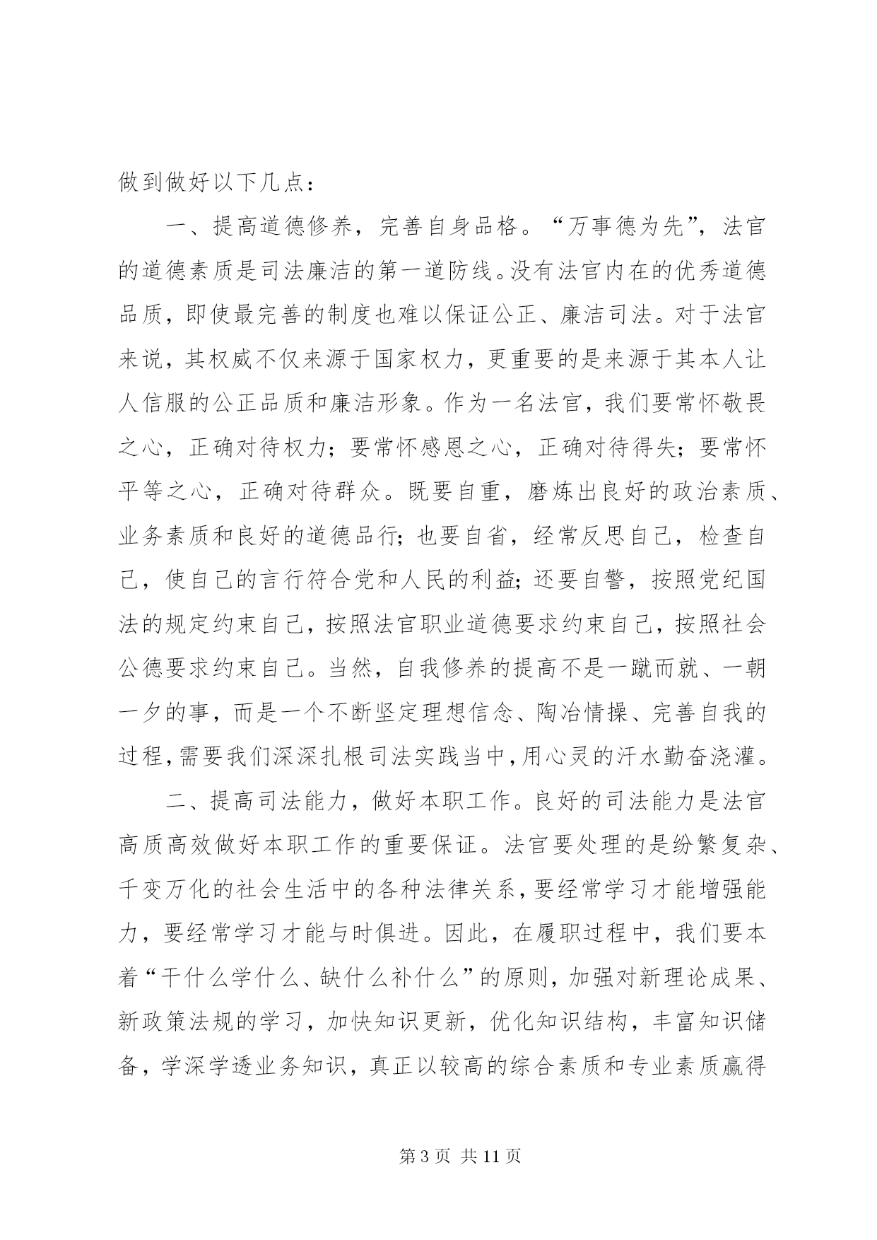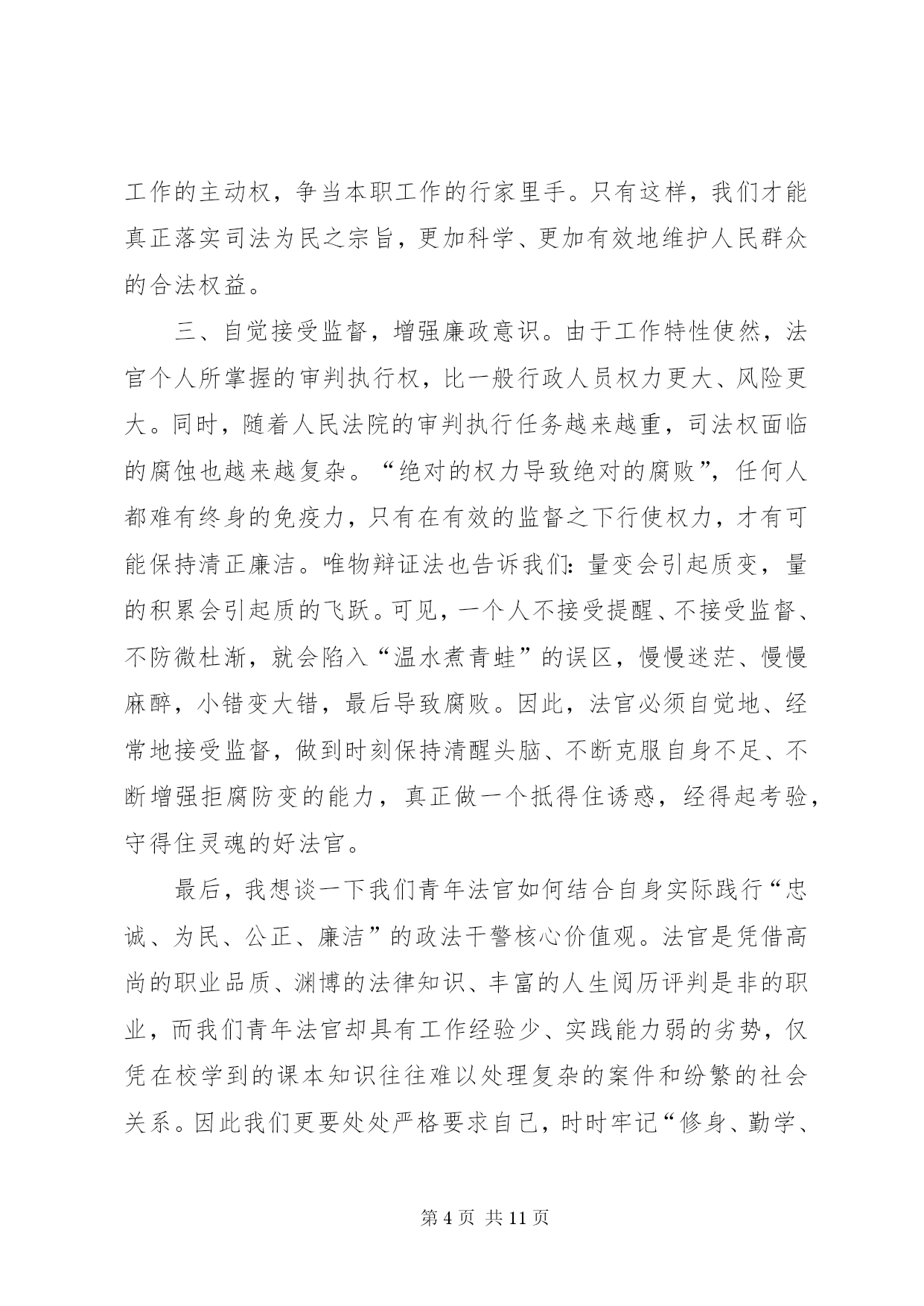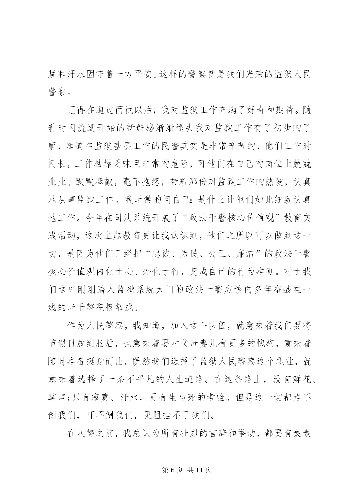 第PAGE\*Arabic\*MERGEFORMAT11页共NUMPAGES\*MERGEFORMAT11页XX年司法干警演讲稿范文(篇一)尊敬的各位领导、同事:大家好。很荣幸能够站在这里,作为一名法官,作为政法干警中的一员,参加我院组织的“忠诚、为民、公正、廉洁”主题演讲比赛。今天,我演讲的题目是《做好本职工作,深刻践行“忠诚、为民、公正、廉洁”的价值观》。今天能有机会站在这里,与大家交流我的职业情怀和感悟,是一种幸运。“忠诚、为民、公正、廉洁”,这八个字是政法干警的核心价值观,是党和人民对政法队伍的基本要求,也是广大政法干警必须自觉坚持的共同价值取向。首先,我想谈一下我个人对“忠诚、为民、公正、廉洁”政法干警核心价值观的理解。“忠诚”是政法干警的政治本色。政法队伍要履行好确保国家安全和社会政治稳定的首要政治要务,第一位的就是要保持忠诚,始终做到忠于国家,忠于人民,忠于法律。作为一名法官,忠于法律更是责无旁贷,因为法律是法官的唯一上司,正如马克思名言:“法官是法律世界的国王,除了法律就没有别的上司”。“为民”是政法干警的宗旨理念。“司法为民”是我们每一个法官应坚持的基本宗旨,因为政法干警的根本使命就是维护人民合法权益,保障人民安居乐业。在履职过程中,我们必须始终把人民利益放在首位,把人民群众高兴不高兴、满意不满意作为衡量我们工作的重要标准,真正做到“权为民所用,情为民所系,利为民所谋。”“公正”是政法干警的价值追求。法官是法律的人格化,天然地与公平正义如影随形,而司法制度也是维护社会公平正义的最后一道防线。如果这道防线守不住,人民群众就失去了精神支撑和最后依靠,自然会对司法机关失望,甚至会对党和政府失望。因此,在履职过程中,我们要秉承一颗公正之心,讲良心、讲公心;要坚持以事实为依据,以法律为准绳,公平公正,不为私、不为利、不唯上、不唯势,只唯公、只唯法,以维护群众利益为依归。“廉洁”是政法干警的基本操守。我们既然选择了政法工作这一维护社会公平正义的神圣职业,就要义无反顾地为之奋斗、为之奉献。在履职过程中,要坚持公器慎用、公器公用,洁身自好、自省自律,做到慎独、慎微、慎权、慎欲、慎友,做一个政治上坚定、经济上清白、作风上正派的政法领导干部。树立和增强正确价值观的目的在于促进工作更好地开展。理论不能束之高阁,价值观更不能建“空中楼阁”,我们一定要把“忠诚、为民、公正、廉洁”的政法干警核心价值观与自己的工作密切结合起来,在各自的岗位上艰苦奋斗、勇于奉献,将“忠诚、为民、公正、廉洁”八个字内化于心,外践于行。为此,我们要做到做好以下几点:一、提高道德修养,完善自身品格。“万事德为先”,法官的道德素质是司法廉洁的第一道防线。没有法官内在的优秀道德品质,即使最完善的制度也难以保证公正、廉洁司法。对于法官来说,其权威不仅来源于国家权力,更重要的是来源于其本人让人信服的公正品质和廉洁形象。作为一名法官,我们要常怀敬畏之心,正确对待权力;要常怀感恩之心,正确对待得失;要常怀平等之心,正确对待群众。既要自重,磨炼出良好的政治素质、业务素质和良好的道德品行;也要自省,经常反思自己,检查自己,使自己的言行符合党和人民的利益;还要自警,按照党纪国法的规定约束自己,按照法官职业道德要求约束自己,按照社会公德要求约束自己。当然,自我修养的提高不是一蹴而就、一朝一夕的事,而是一个不断坚定理想信念、陶冶情操、完善自我的过程,需要我们深深扎根司法实践当中,用心灵的汗水勤奋浇灌。二、提高司法能力,做好本职工作。良好的司法能力是法官高质高效做好本职工作的重要保证。法官要处理的是纷繁复杂、千变万化的社会生活中的各种法律关系,要经常学习才能增强能力,要经常学习才能与时俱进。因此,在履职过程中,我们要本着“干什么学什么、缺什么补什么”的原则,加强对新理论成果、新政策法规的学习,加快知识更新,优化知识结构,丰富知识储备,学深学透业务知识,真正以较高的综合素质和专业素质赢得工作的主动权,争当本职工作的行家里手。只有这样,我们才能真正落实司法为民之宗旨,更加科学、更加有效地维护人民群众的合法权益。三、自觉接受监督,增强廉政意识。由于工作特性使然,法官个人所掌握的审判执行权,比一般行政人员权力更大、风险更大。同时,随着人民法院的审判执行任务越来越重,司法权面临的腐蚀也越来越复杂。“绝对的权力导致绝对的腐败”,任何人都难有终身的免疫力,只有在有效的监督之下行使权力,才有可能保持清正廉洁。唯物辩证法也告诉我们:量变会引起质变,量的积累会引起质的飞跃。可见,一个人不接受提醒、不接受监督、不防微杜渐,就会陷入“温水煮青蛙”的误区,慢慢迷茫、慢慢麻醉,小错变大错,最后导致腐败。因此,法官必须自觉地、经常地接受监督,做到时刻保持清醒头脑、不断克服自身不足、不断增强