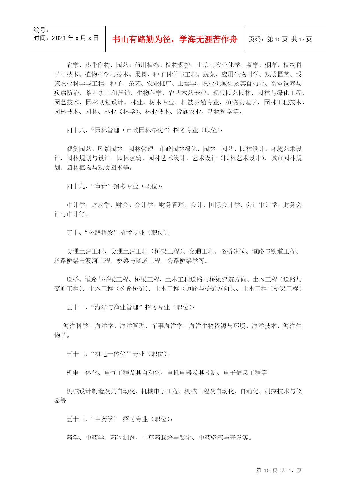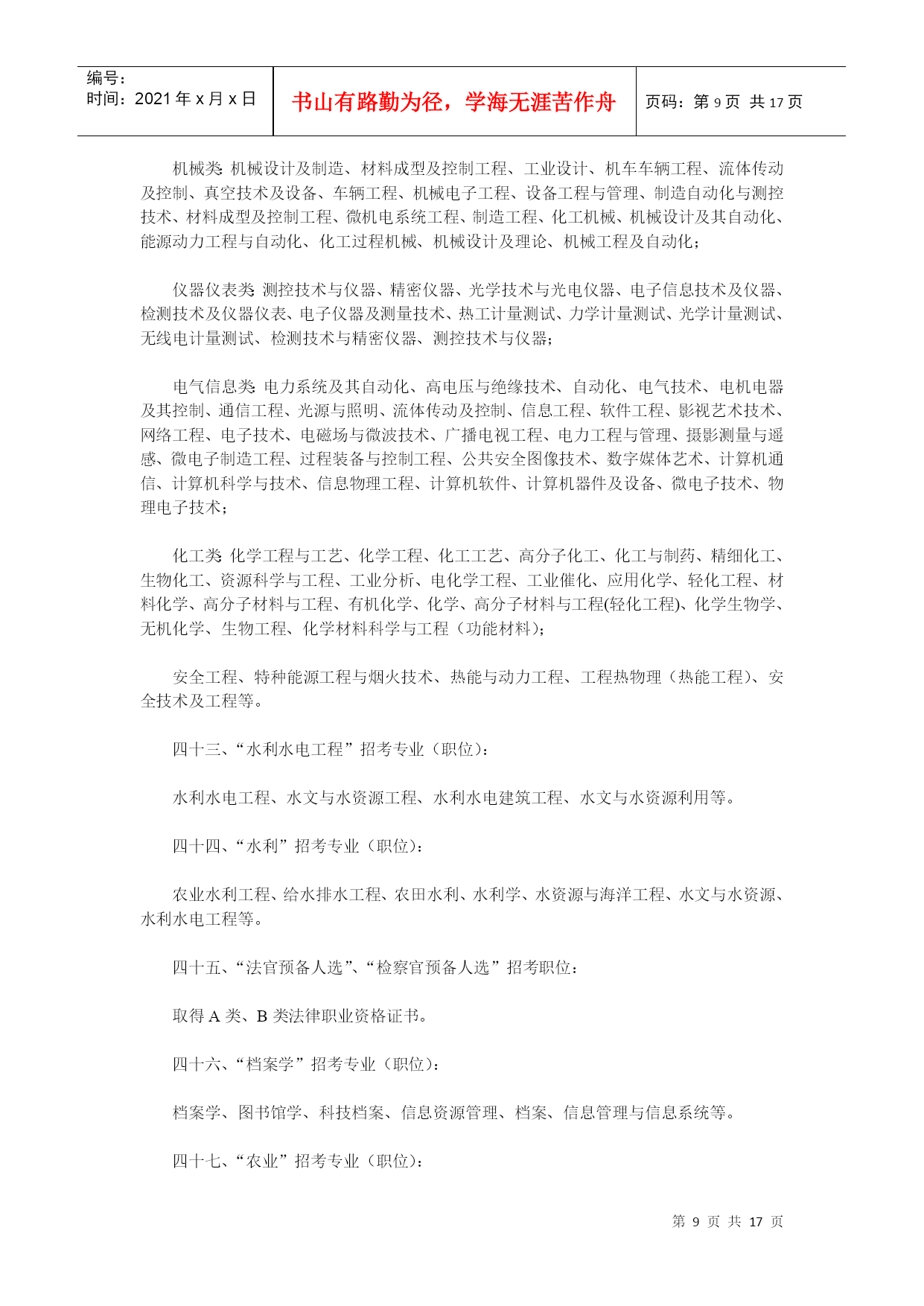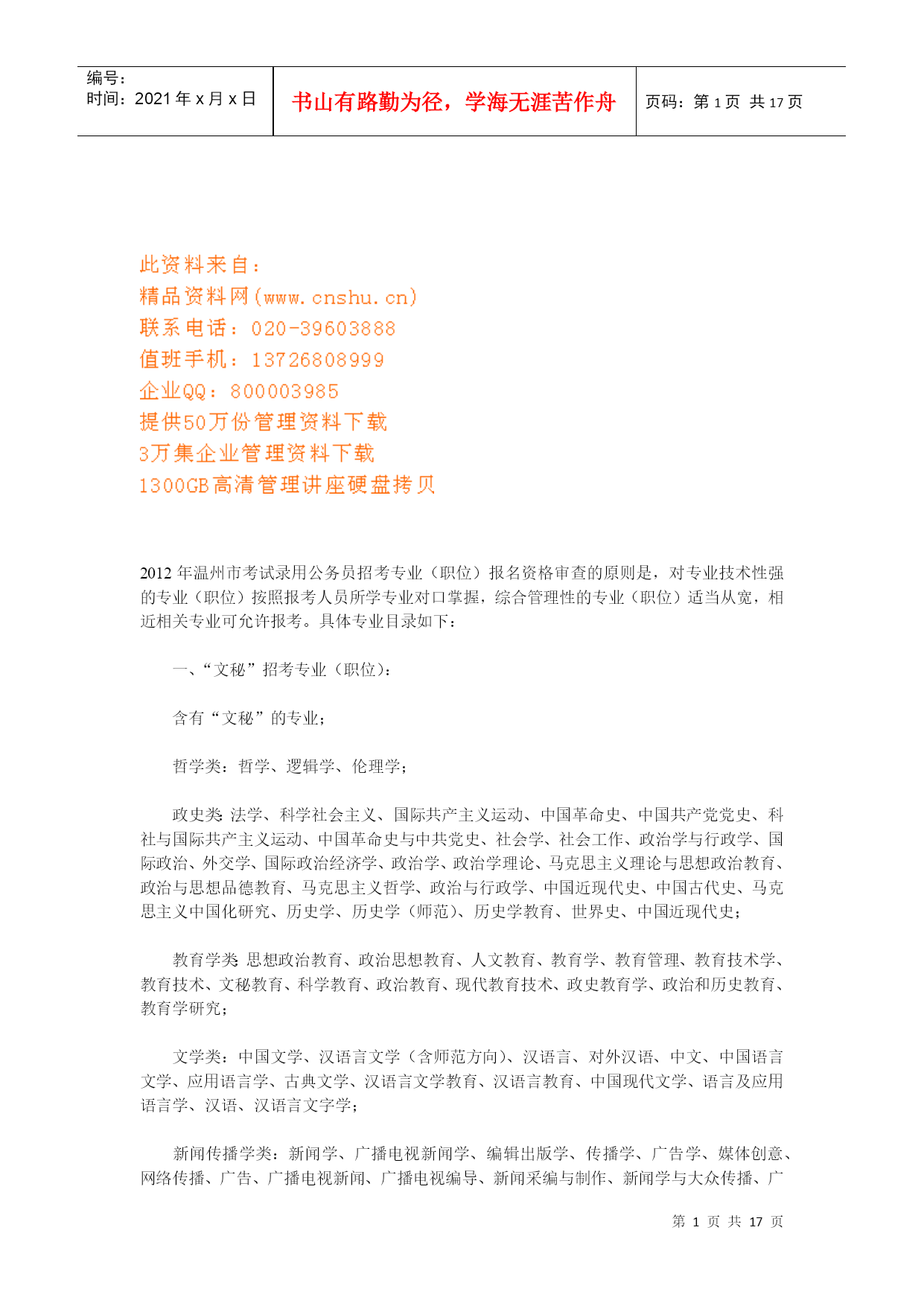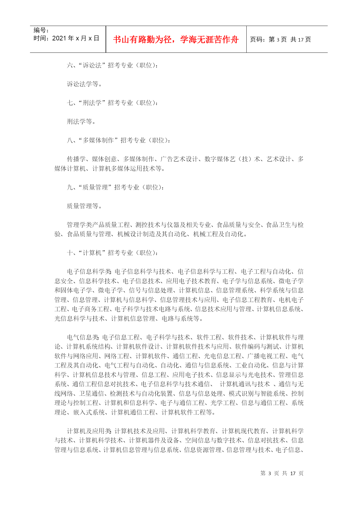 编号:时间:2021年x月x日书山有路勤为径,学海无涯苦作舟页码:第PAGE17页共NUMPAGES17页第PAGE\*MERGEFORMAT17页共NUMPAGES\*MERGEFORMAT17页2012年温州市考试录用公务员招考专业(职位)报名资格审查的原则是,对专业技术性强的专业(职位)按照报考人员所学专业对口掌握,综合管理性的专业(职位)适当从宽,相近相关专业可允许报考。具体专业目录如下:一、“文秘”招考专业(职位):含有“文秘”的专业;哲学类:哲学、逻辑学、伦理学;政史类:法学、科学社会主义、国际共产主义运动、中国革命史、中国共产党党史、科社与国际共产主义运动、中国革命史与中共党史、社会学、社会工作、政治学与行政学、国际政治、外交学、国际政治经济学、政治学、政治学理论、马克思主义理论与思想政治教育、政治与思想品德教育、马克思主义哲学、政治与行政学、中国近现代史、中国古代史、马克思主义中国化研究、历史学、历史学(师范)、历史学教育、世界史、中国近现代史;教育学类:思想政治教育、政治思想教育、人文教育、教育学、教育管理、教育技术学、教育技术、文秘教育、科学教育、政治教育、现代教育技术、政史教育学、政治和历史教育、教育学研究;文学类:中国文学、汉语言文学(含师范方向)、汉语言、对外汉语、中文、中国语言文学、应用语言学、古典文学、汉语言文学教育、汉语言教育、中国现代文学、语言及应用语言学、汉语、汉语言文字学;新闻传播学类:新闻学、广播电视新闻学、编辑出版学、传播学、广告学、媒体创意、网络传播、广告、广播电视新闻、广播电视编导、新闻采编与制作、新闻学与大众传播、广告艺术设计、戏剧影视文学专业、新闻传播、传媒策划与管理(新闻)、广告与广告管理、播音与主持艺术、文化与传播、新闻传播学;历史学类:历史学、世界历史、民族学;管理学类:人力资源管理、劳动社会保障、管理科学、管理学、管理科学与工程、公共政策学、公共关系学、行政管理、行政管理学、机关管理与办公自动化、工商管理、工商企业管理、公共事业管理、公共管理、党政管理、社会工作与管理、社会管理、社会工作;文秘、文秘档案、秘书学、涉外文秘、中英文秘、文秘英语、法律文秘、经济秘书、现代文员、文秘与办公自动化等。马克思主义基本理论、政治理论、中国哲学、中国古代文学、秘书、涉外秘书、现代文秘、行政文秘、商务秘书、行政管理(电子管理)、古代文学二、“中文”招考专业(职位):汉语言文学、中国文学、中国现代文学、中国现当代文学、汉语言文学教育、汉语言教育、汉语言、对外汉语、新闻、新闻学、中国语言文学、广播电视新闻、古典文学、中国古代文学,比较文学与世界文学、汉语言文学师范专业、广播电视编导、语言学及应用语言学等。三、“新闻”招考专业(职位):新闻学、广播电视新闻学、编辑出版学、传播学、媒体创意、新闻广告、广告学、广播电视编导、新闻采编与制作、新闻学与大众传播、新闻传播学类。四、“法律”招考专业(职位):法学类:法学;法律各相关专业(含经济法、经济法学、国际经济法、行政法、民事诉讼法、民商法、民商法学、刑法学、宪法与行政法、知识产权法等专业法)、法律学、法律、法律事务、法律文秘、律师、法律教育、法理、司法助理、法律硕士、法硕(法学)等;其他专业的人员,取得中华人民共和国律师资格证书或A类、B类法律职业资格证书的,可以报考。五、“法学”招考专业(职位):法学类等。六、“诉讼法”招考专业(职位):诉讼法学等。七、“刑法学”招考专业(职位):刑法学等。八、“多媒体制作”招考专业(职位):传播学、媒体创意、多媒体制作、广告艺术设计、数字媒体艺(技)术、艺术设计、多媒体计算机、计算机多媒体运用技术等。九、“质量管理”招考专业(职位):质量管理等。管理学类产品质量工程、测控技术与仪器及相关专业、食品质量与安全、食品卫生与检验、食品质量与管理、机械设计制造及其自动化、机械工程及自动化。十、“计算机”招考专业(职位):电子信息科学类:电子信息科学与技术、电子信息科学与工程、电子工程与自动化、信息安全、信息科学技术、电子信息技术、应用电子技术教育、电子学与信息系统、微电子学和固体电子学、微电子学、信号与信息处理、计算机信息、信息管理系统、科学系统与信息管理、信息管理、计算机与信息科学、信息管理技术与应用、电子信息工程教育、电机电子工程、电子商务工程、电子科学与技术电路与系统、信息技术应用与管理、计算机信息系统、光信息科学与技术、计算机信息管理、电路与系统等。电气信息类:电子信息工程、电子科学与技术、软件工程、软件技术、计算机软件与理论、计算机系统