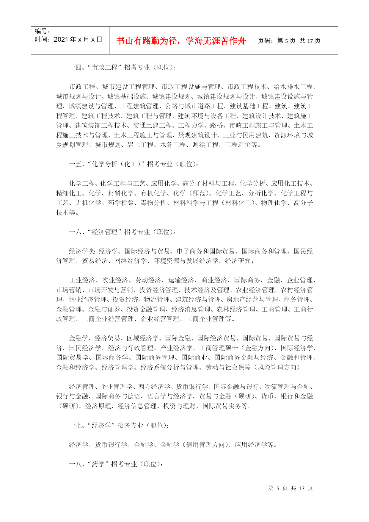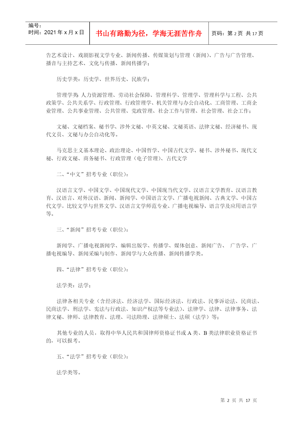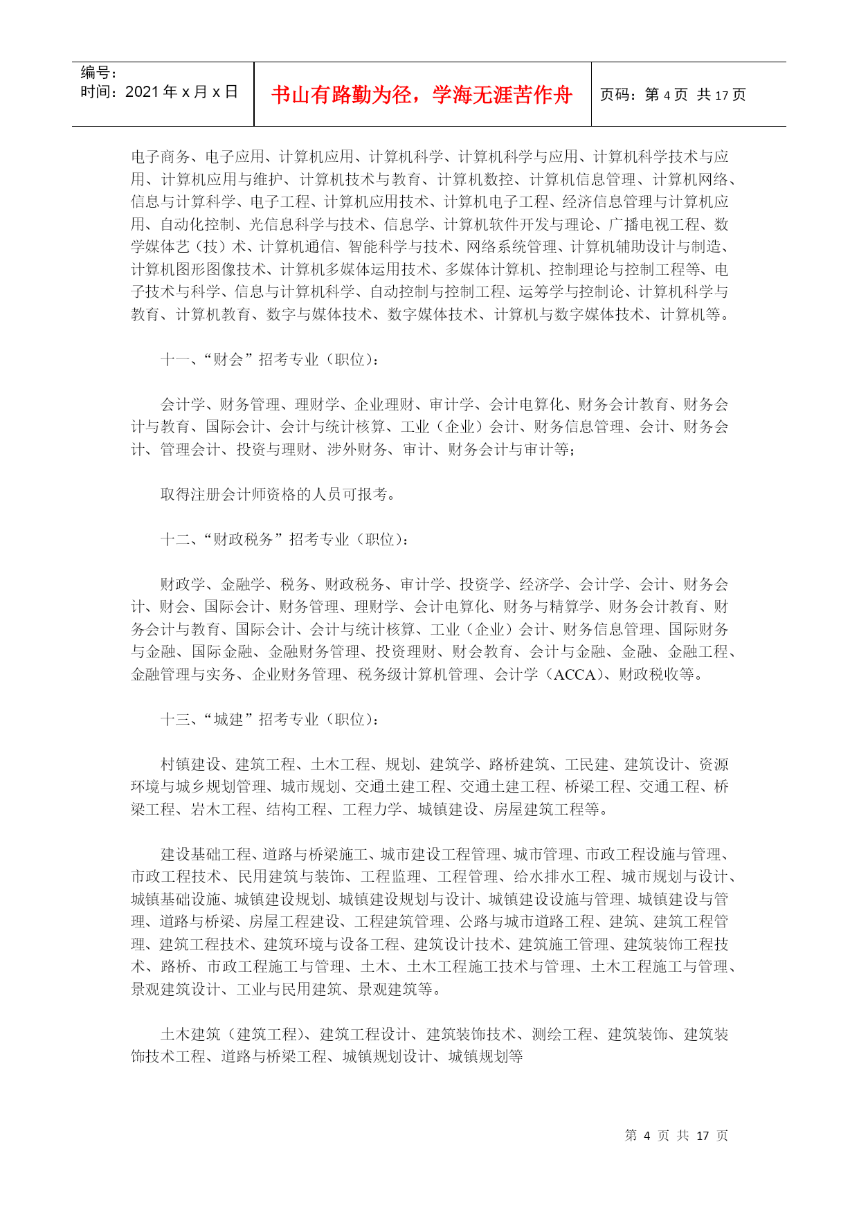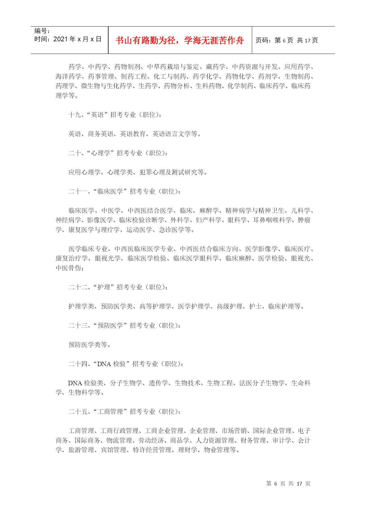 编号:时间:2021年x月x日书山有路勤为径,学海无涯苦作舟页码:第PAGE17页共NUMPAGES17页第PAGE\*MERGEFORMAT17页共NUMPAGES\*MERGEFORMAT17页2012年温州市考试录用公务员招考专业(职位)报名资格审查的原则是,对专业技术性强的专业(职位)按照报考人员所学专业对口掌握,综合管理性的专业(职位)适当从宽,相近相关专业可允许报考。具体专业目录如下:一、“文秘”招考专业(职位):含有“文秘”的专业;哲学类:哲学、逻辑学、伦理学;政史类:法学、科学社会主义、国际共产主义运动、中国革命史、中国共产党党史、科社与国际共产主义运动、中国革命史与中共党史、社会学、社会工作、政治学与行政学、国际政治、外交学、国际政治经济学、政治学、政治学理论、马克思主义理论与思想政治教育、政治与思想品德教育、马克思主义哲学、政治与行政学、中国近现代史、中国古代史、马克思主义中国化研究、历史学、历史学(师范)、历史学教育、世界史、中国近现代史;教育学类:思想政治教育、政治思想教育、人文教育、教育学、教育管理、教育技术学、教育技术、文秘教育、科学教育、政治教育、现代教育技术、政史教育学、政治和历史教育、教育学研究;文学类:中国文学、汉语言文学(含师范方向)、汉语言、对外汉语、中文、中国语言文学、应用语言学、古典文学、汉语言文学教育、汉语言教育、中国现代文学、语言及应用语言学、汉语、汉语言文字学;新闻传播学类:新闻学、广播电视新闻学、编辑出版学、传播学、广告学、媒体创意、网络传播、广告、广播电视新闻、广播电视编导、新闻采编与制作、新闻学与大众传播、广告艺术设计、戏剧影视文学专业、新闻传播、传媒策划与管理(新闻)、广告与广告管理、播音与主持艺术、文化与传播、新闻传播学;历史学类:历史学、世界历史、民族学;管理学类:人力资源管理、劳动社会保障、管理科学、管理学、管理科学与工程、公共政策学、公共关系学、行政管理、行政管理学、机关管理与办公自动化、工商管理、工商企业管理、公共事业管理、公共管理、党政管理、社会工作与管理、社会管理、社会工作;文秘、文秘档案、秘书学、涉外文秘、中英文秘、文秘英语、法律文秘、经济秘书、现代文员、文秘与办公自动化等。马克思主义基本理论、政治理论、中国哲学、中国古代文学、秘书、涉外秘书、现代文秘、行政文秘、商务秘书、行政管理(电子管理)、古代文学二、“中文”招考专业(职位):汉语言文学、中国文学、中国现代文学、中国现当代文学、汉语言文学教育、汉语言教育、汉语言、对外汉语、新闻、新闻学、中国语言文学、广播电视新闻、古典文学、中国古代文学,比较文学与世界文学、汉语言文学师范专业、广播电视编导、语言学及应用语言学等。三、“新闻”招考专业(职位):新闻学、广播电视新闻学、编辑出版学、传播学、媒体创意、新闻广告、广告学、广播电视编导、新闻采编与制作、新闻学与大众传播、新闻传播学类。四、“法律”招考专业(职位):法学类:法学;法律各相关专业(含经济法、经济法学、国际经济法、行政法、民事诉讼法、民商法、民商法学、刑法学、宪法与行政法、知识产权法等专业法)、法律学、法律、法律事务、法律文秘、律师、法律教育、法理、司法助理、法律硕士、法硕(法学)等;其他专业的人员,取得中华人民共和国律师资格证书或A类、B类法律职业资格证书的,可以报考。五、“法学”招考专业(职位):法学类等。六、“诉讼法”招考专业(职位):诉讼法学等。七、“刑法学”招考专业(职位):刑法学等。八、“多媒体制作”招考专业(职位):传播学、媒体创意、多媒体制作、广告艺术设计、数字媒体艺(技)术、艺术设计、多媒体计算机、计算机多媒体运用技术等。九、“质量管理”招考专业(职位):质量管理等。管理学类产品质量工程、测控技术与仪器及相关专业、食品质量与安全、食品卫生与检验、食品质量与管理、机械设计制造及其自动化、机械工程及自动化。十、“计算机”招考专业(职位):电子信息科学类:电子信息科学与技术、电子信息科学与工程、电子工程与自动化、信息安全、信息科学技术、电子信息技术、应用电子技术教育、电子学与信息系统、微电子学和固体电子学、微电子学、信号与信息处理、计算机信息、信息管理系统、科学系统与信息管理、信息管理、计算机与信息科学、信息管理技术与应用、电子信息工程教育、电机电子工程、电子商务工程、电子科学与技术电路与系统、信息技术应用与管理、计算机信息系统、光信息科学与技术、计算机信息管理、电路与系统等。电气信息类:电子信息工程、电子科学与技术、软件工程、软件技术、计算机软件与理论、计算机系统