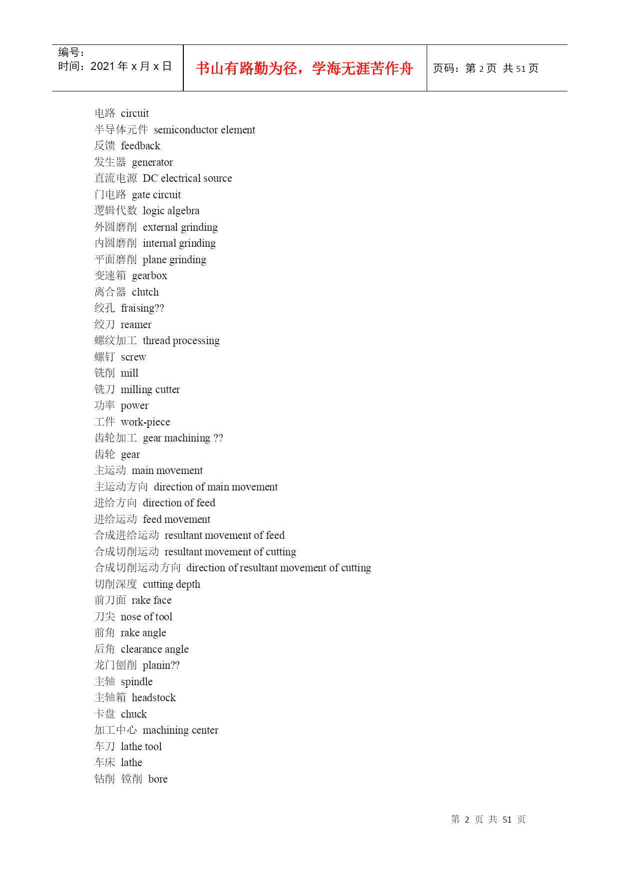 编号:时间:2021年x月x日书山有路勤为径,学海无涯苦作舟页码:第PAGE51页共NUMPAGES51页第PAGE\*MERGEFORMAT51页共NUMPAGES\*MERGEFORMAT51页金属切削metalcutting机床machinetool金属工艺学technologyofmetals刀具cutter摩擦friction联结link传动drive/transmission轴shaft弹性elasticity频率特性frequencycharacteristic误差error响应response定位allocation机床夹具jig动力学dynamics运动学kinematics静力学statics分析力学analysismechanics拉伸pulling压缩hitting剪切shear扭转twist弯曲应力bendingstress强度intensity三相交流电three-phaseAC磁路magneticcircles变压器transformer异步电动机asynchronousmotor几何形状geometrical精度precision正弦形的sinusoid交流电路ACcircuit机械加工余量machiningallowance变形力deformingforce变形deformation应力stress硬度rigidity热处理heattreatment退火anneal正火normalizing脱碳decarbonization渗碳carbonization电路circuit半导体元件semiconductorelement反馈feedback发生器generator直流电源DCelectricalsource门电路gatecircuit逻辑代数logicalgebra外圆磨削externalgrinding内圆磨削internalgrinding平面磨削planegrinding变速箱gearbox离合器clutch绞孔fraising??绞刀reamer螺纹加工threadprocessing螺钉screw铣削mill铣刀millingcutter功率power工件work-piece齿轮加工gearmachining??齿轮gear主运动mainmovement主运动方向directionofmainmovement进给方向directionoffeed进给运动feedmovement合成进给运动resultantmovementoffeed合成切削运动resultantmovementofcutting合成切削运动方向directionofresultantmovementofcutting切削深度cuttingdepth前刀面rakeface刀尖noseoftool前角rakeangle后角clearanceangle龙门刨削planin??主轴spindle主轴箱headstock卡盘chuck加工中心machiningcenter车刀lathetool车床lathe钻削镗削bore车削turning磨床grinder基准benchmark钳工locksmith锻forge压模stamping焊weld拉床broachingmachine拉孔broaching装配assembling铸造found流体动力学fluiddynamics流体力学fluidmechanics加工machining液压hydraulicpressure切线tangent机电一体化mechanotronics??mechanical-electricalintegration气压airpressurepneumaticpressure稳定性stability介质medium液压驱动泵fluidclutch液压泵hydraulicpump阀门valve失效invalidation强度intensity载荷load应力stress安全系数saftyfactor可靠性reliability螺纹thread螺旋helix键spline??销pin滚动轴承rollingbearing滑动轴承slidingbearing弹簧spring制动器arresterbrake十字结联轴节crosshead联轴器coupling链chain皮带strap精加工finishmachining粗加工roughmachining变速箱体gearboxcasing腐蚀rust氧化oxidation磨损wear耐用度durability随机信号randomsignal离散信号discretesignal超声传感器ultrasonicsensor集成电路integratecircuit挡板orifice